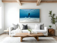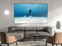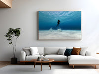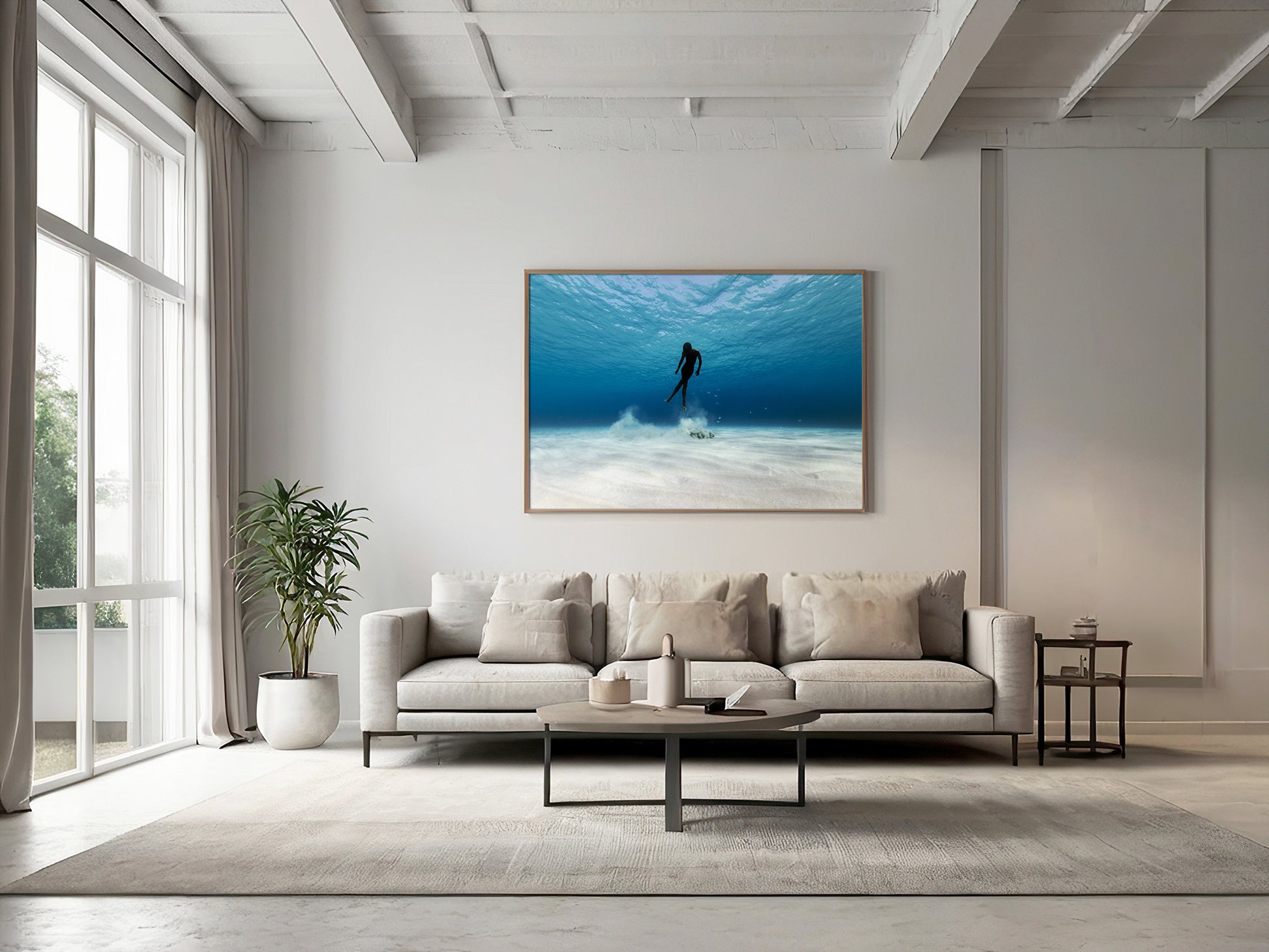 El agua es cristalina, lo que permite una vista fascinante de las ondas iluminadas por el sol sobre el fondo arenoso. La escena transmite libertad y serenidad, con el vasto y ondulante azul que rodea a la buceadora. La iluminación enfatiza el gradiente de azules, creando una transición de ensueño desde la luz cercana a la superficie hasta los tonos más oscuros de las aguas profundas en la distancia. Se pueden ver pequeñas y delicadas burbujas o partículas suspendidas en el agua, realzando la sensación de profundidad y claridad.