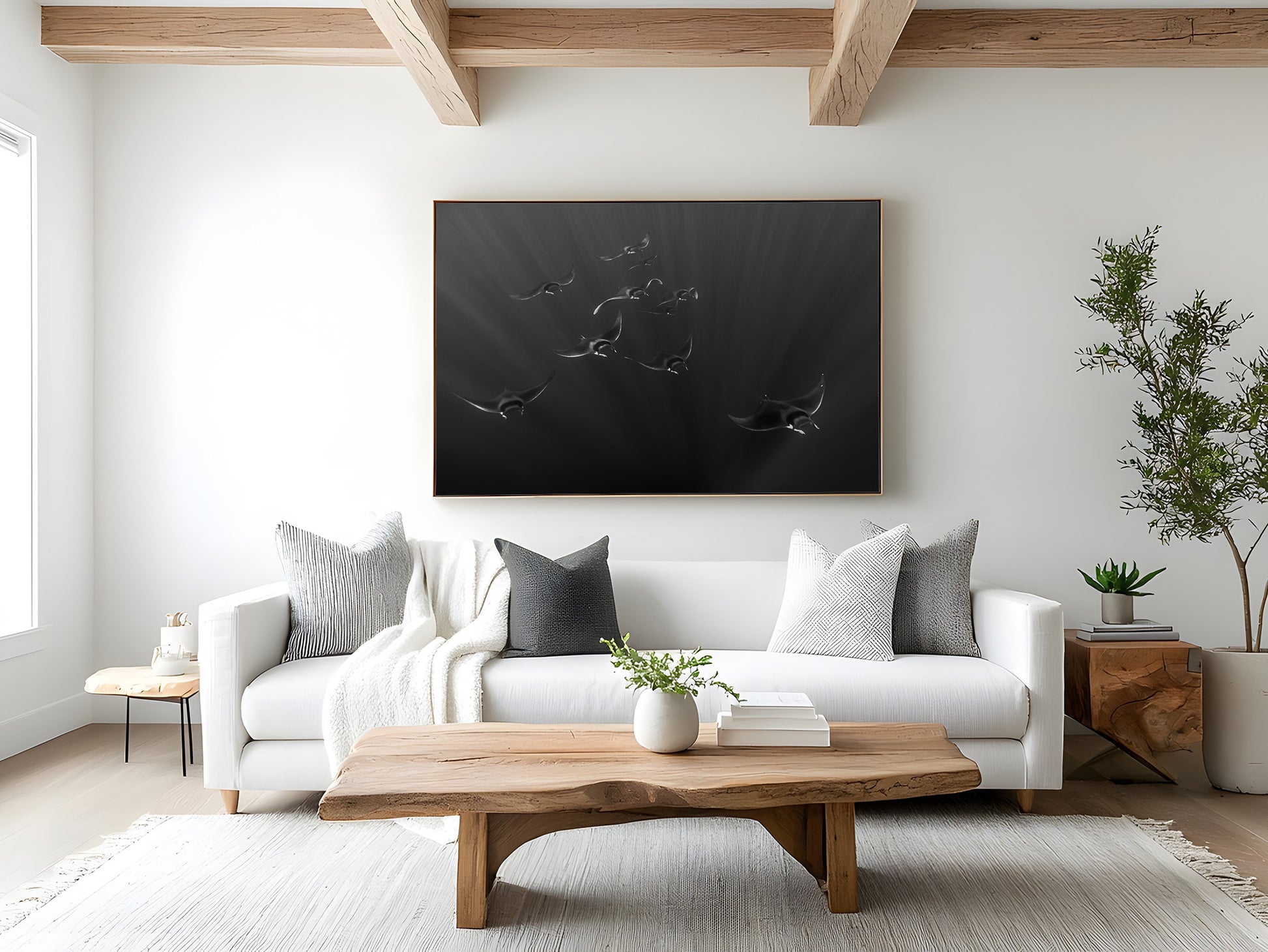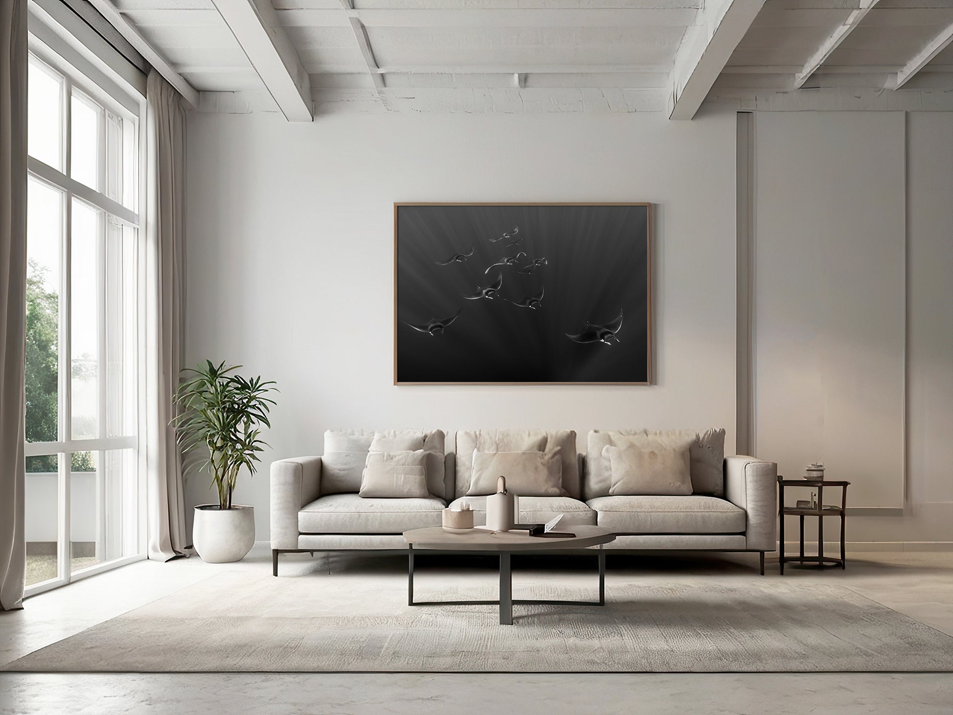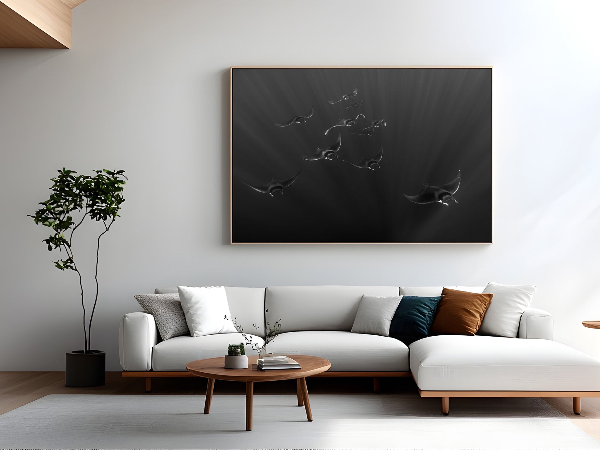 Una fascinante fotografía submarina en blanco y negro que captura una elegante formación de rayas mobula en el mar Mediterráneo. Las rayas se deslizan con fluidez por las profundidades, sus siluetas iluminadas por suaves rayos de luz que se filtran desde arriba. La imagen irradia armonía y elegancia mientras las mobulas se mueven al unísono, desplegando sus alas como bailarinas celestiales. El minimalismo de la composición realza la belleza etérea de la vida marina, creando un cuadro submarino atemporal y evocador.