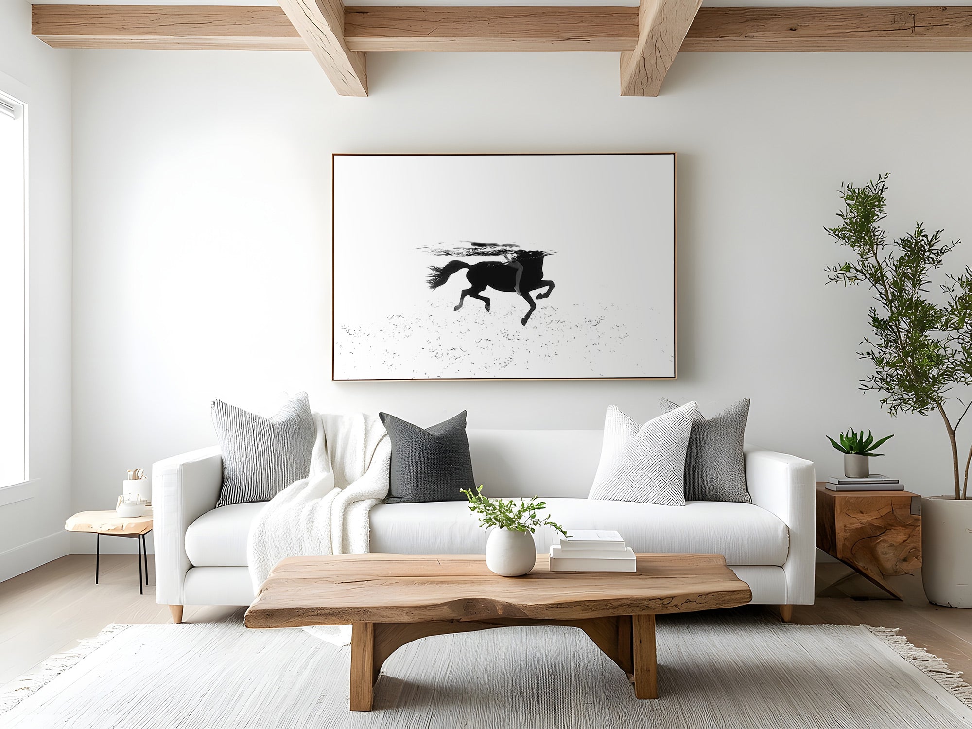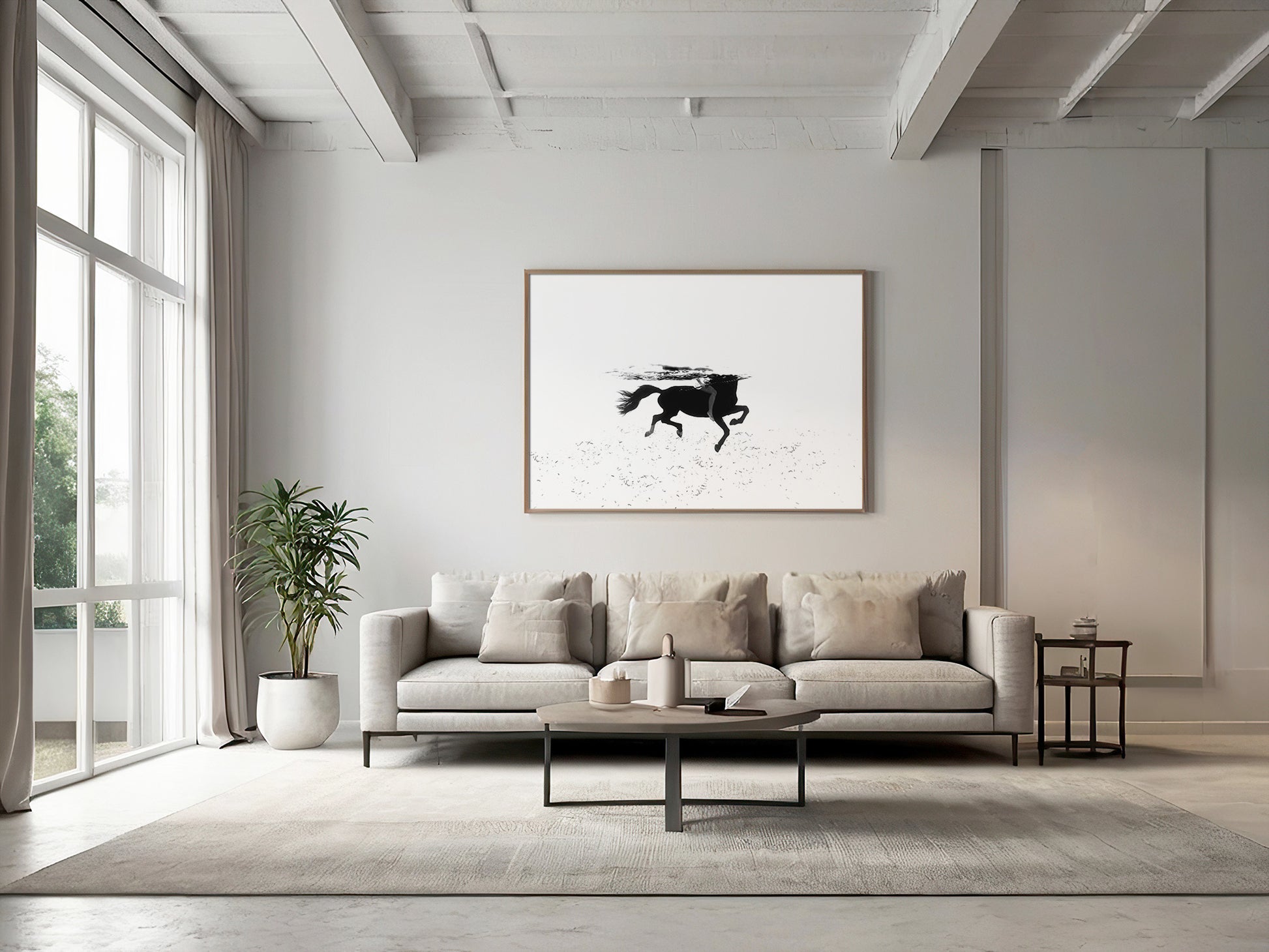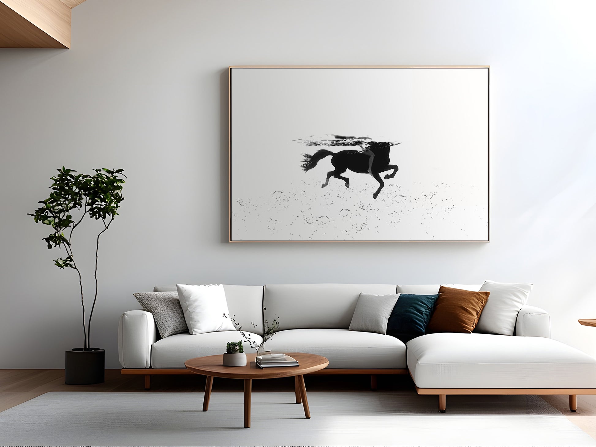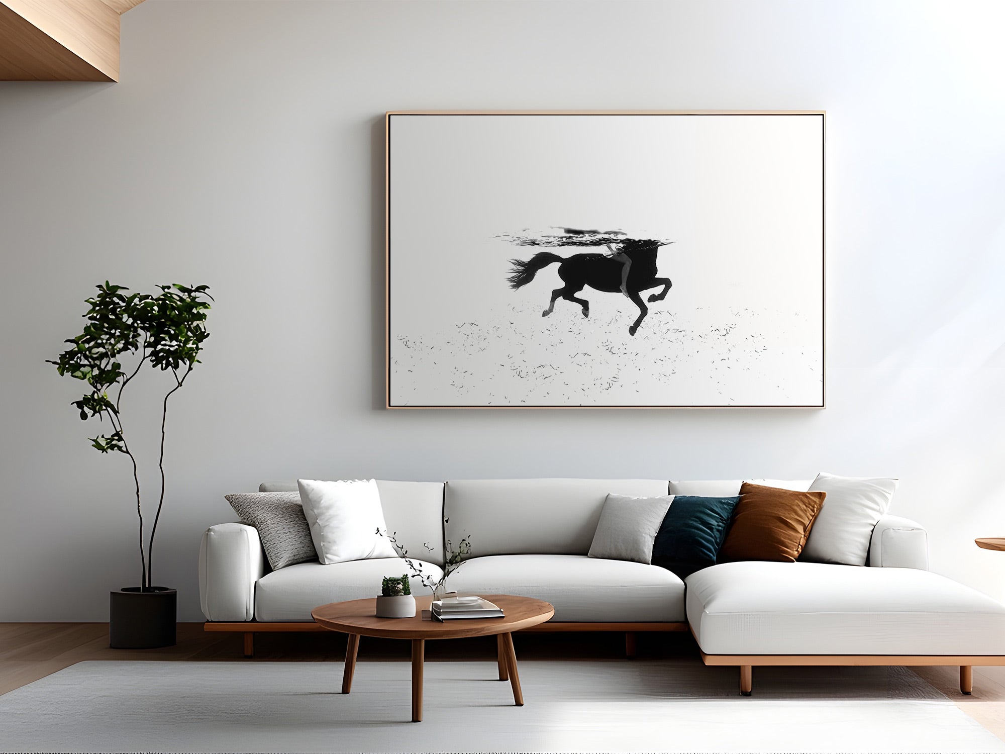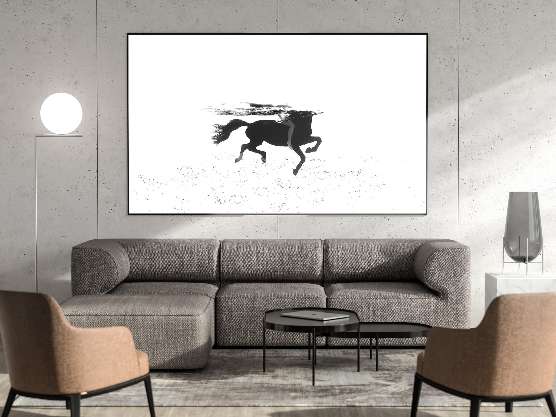 Una impactante composición submarina muestra un caballo negro nadando, con sus poderosas patas en movimiento y su crin ondeando al ritmo de la corriente. Una mujer con un vestido vaporoso se aferra con gracia a su lomo, sus siluetas se recortan contra la brillante luz, casi sobrenatural, que se proyecta sobre la superficie. La escena irradia serenidad y fuerza, capturada bajo el mar Mediterráneo. Los nítidos tonos monocromáticos amplifican la elegancia surrealista del momento, fusionando la belleza natural con la abstracción artística.
