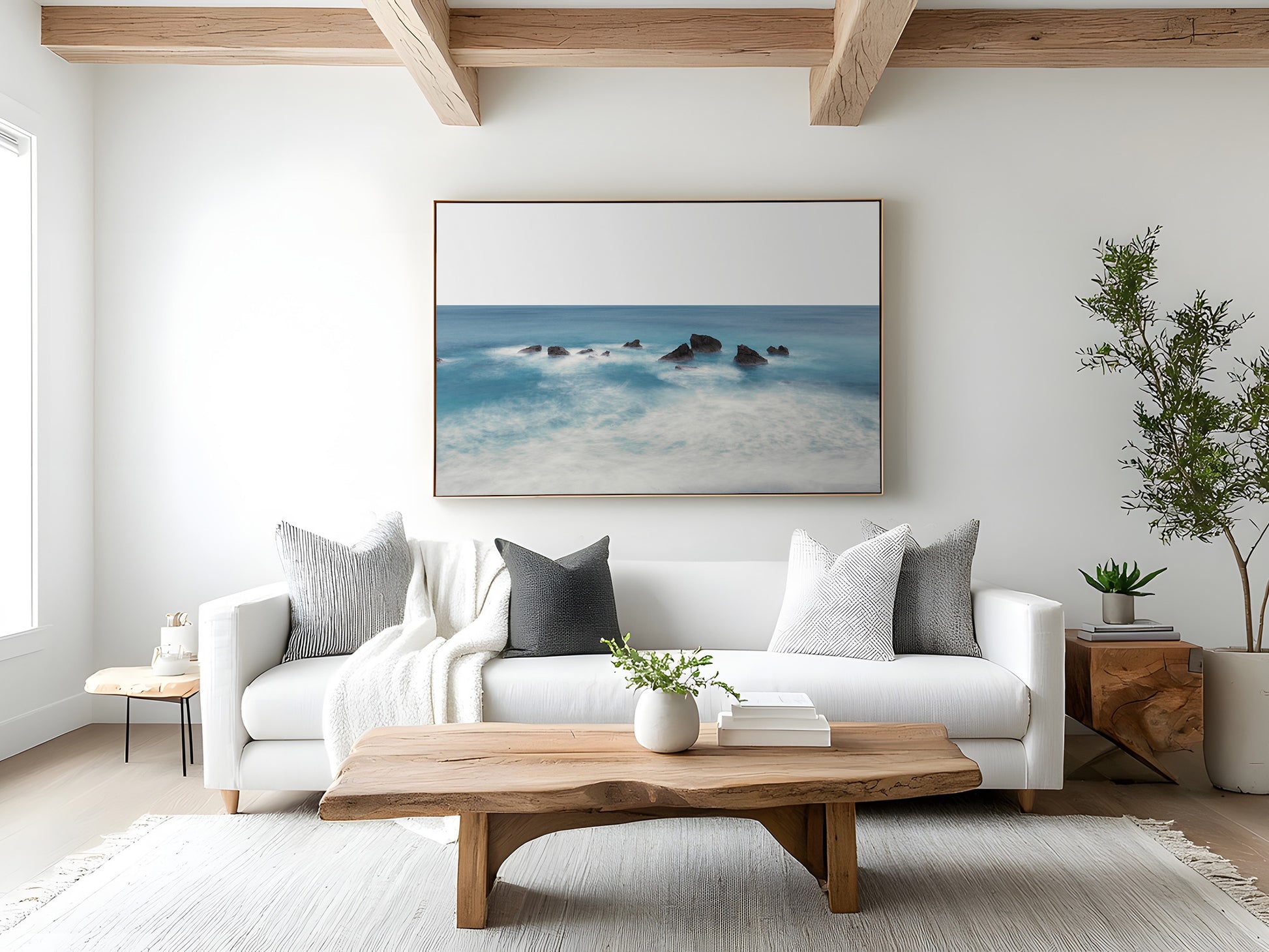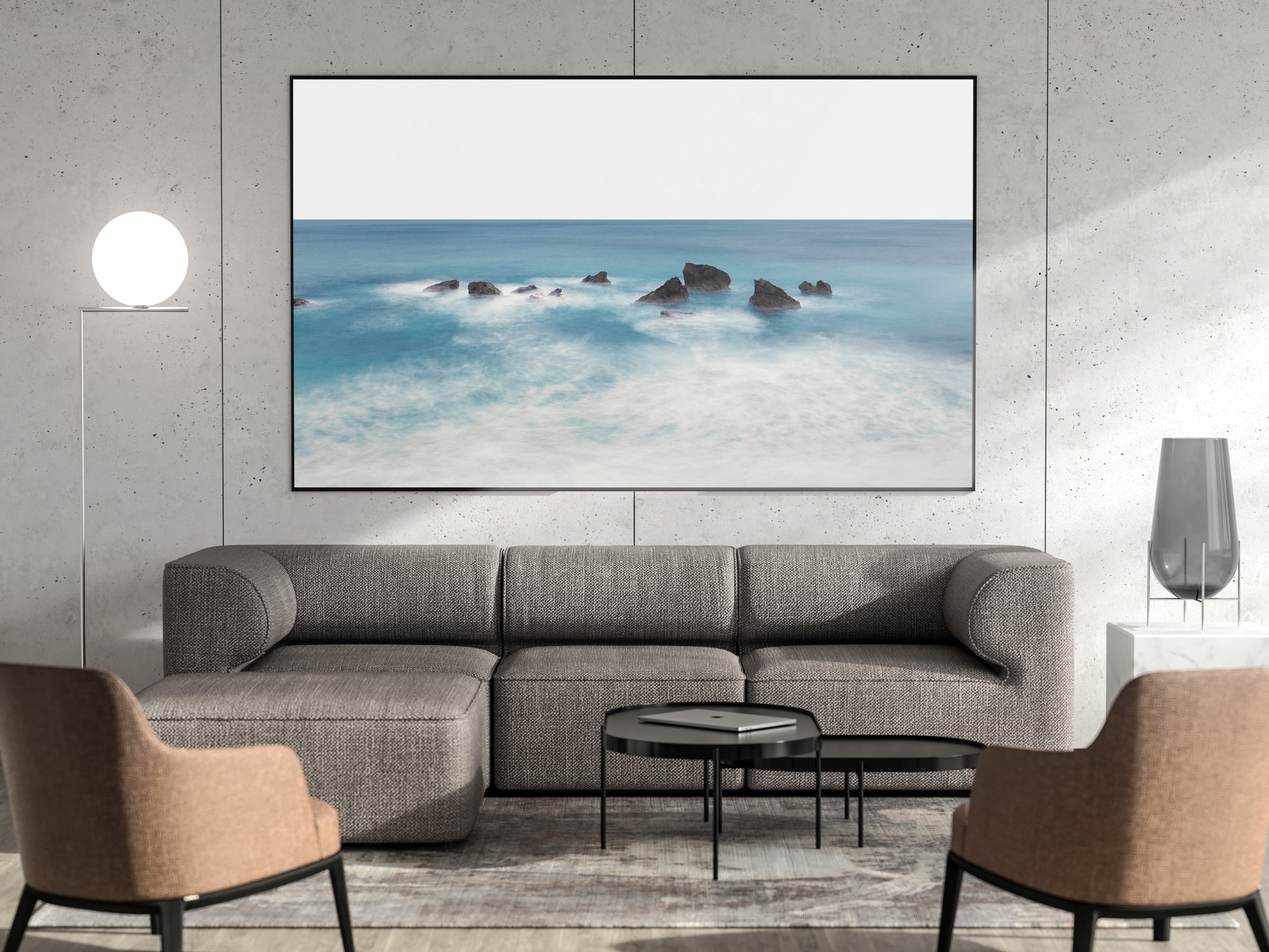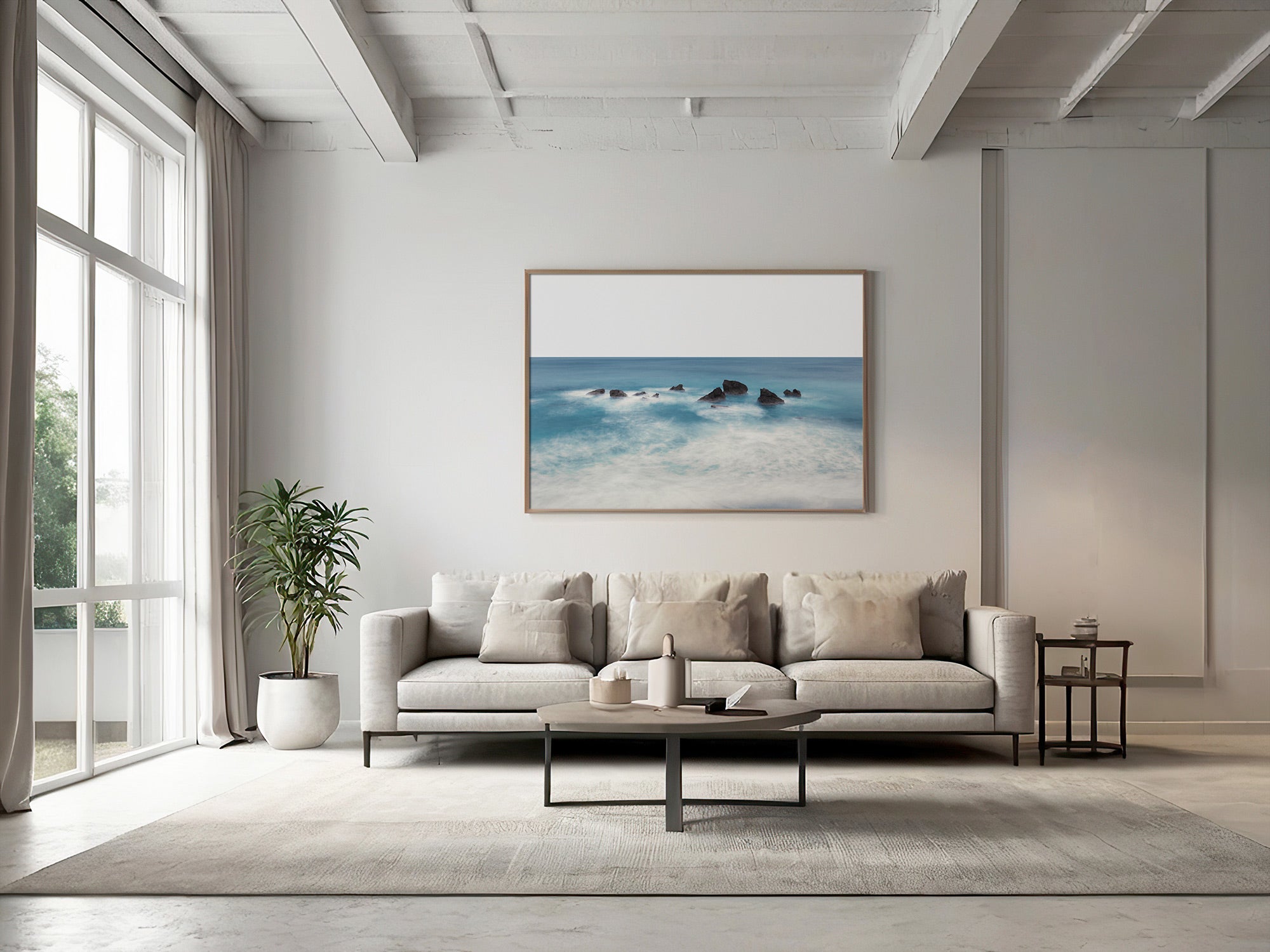 La fotografía transmite la tranquilidad y la fuerza del mar, equilibrando el sutil movimiento del agua con la quietud de las rocas. Los suaves gradientes de azul que se difuminan en el horizonte crean una sensación de inmensidad, mientras que las rocas sirven de ancla, anclando la composición en la belleza austera y minimalista de la costa mediterránea en invierno.