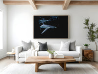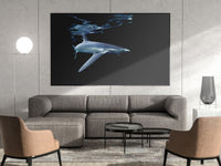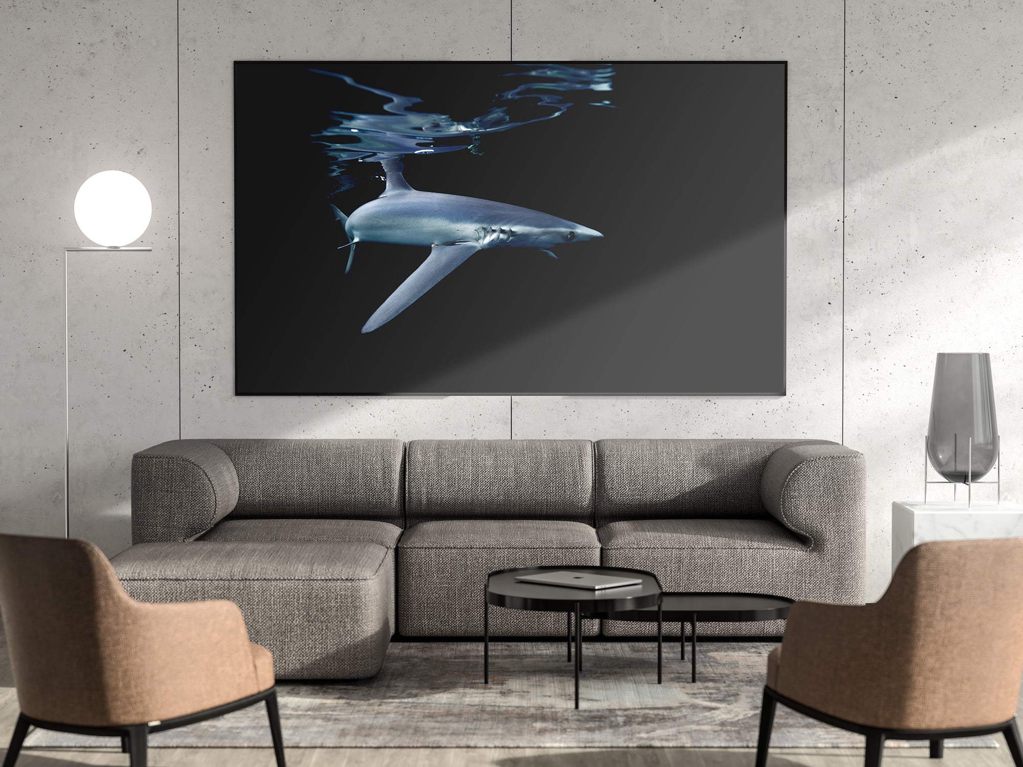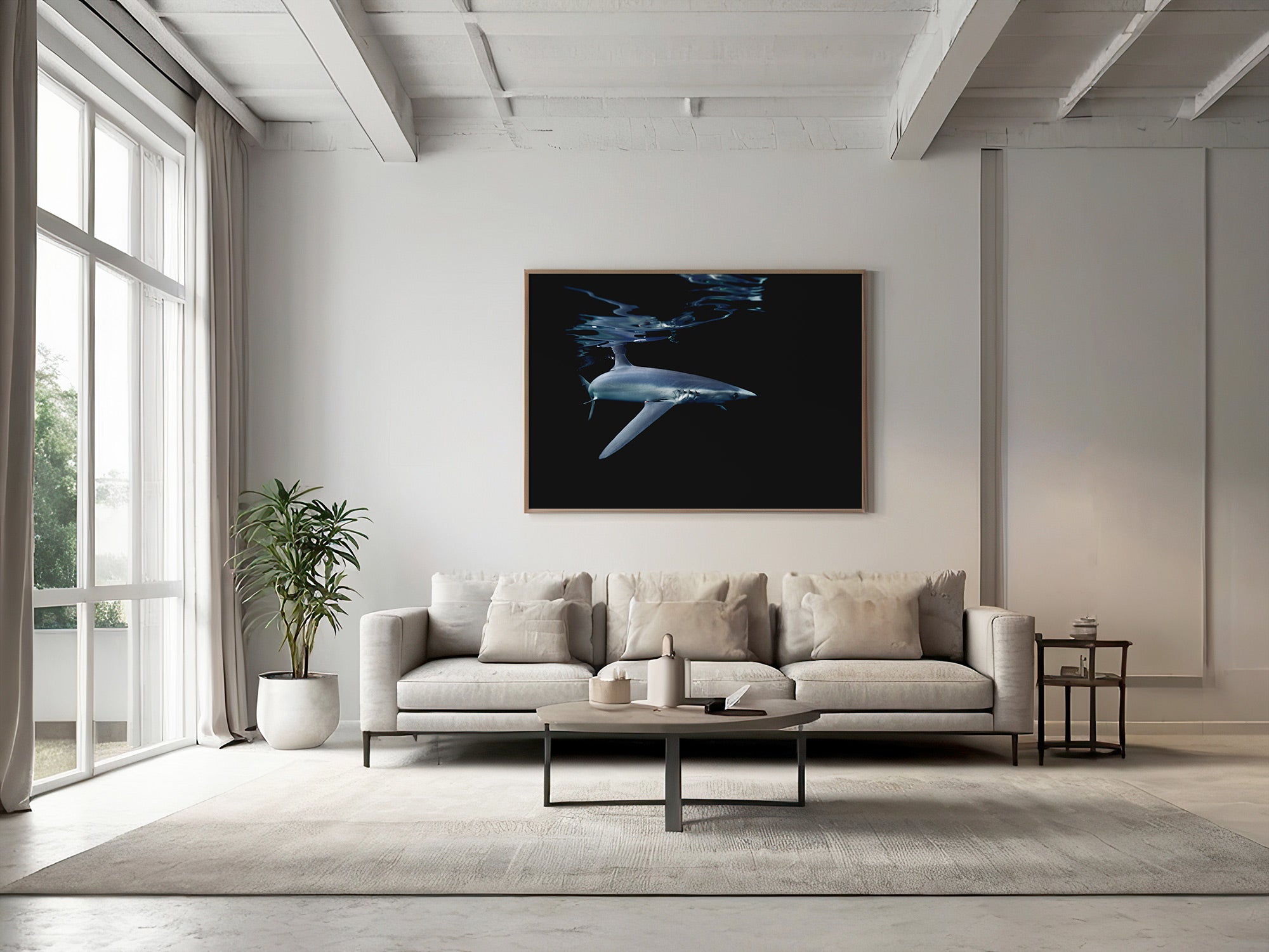 Un elegante tiburón azul se desliza bajo la superficie en las oscuras aguas del Mar de Cortés. Su cuerpo estilizado, una silueta de perfecta estilización, se ilumina tenuemente por la luz ambiental. La superficie refleja patrones distorsionados, creando un surrealista juego de luces y sombras. La misteriosa negrura que rodea al tiburón acentúa su grácil e imponente presencia. Una escena de quietud y poder silencioso en el mundo submarino de Baja California.