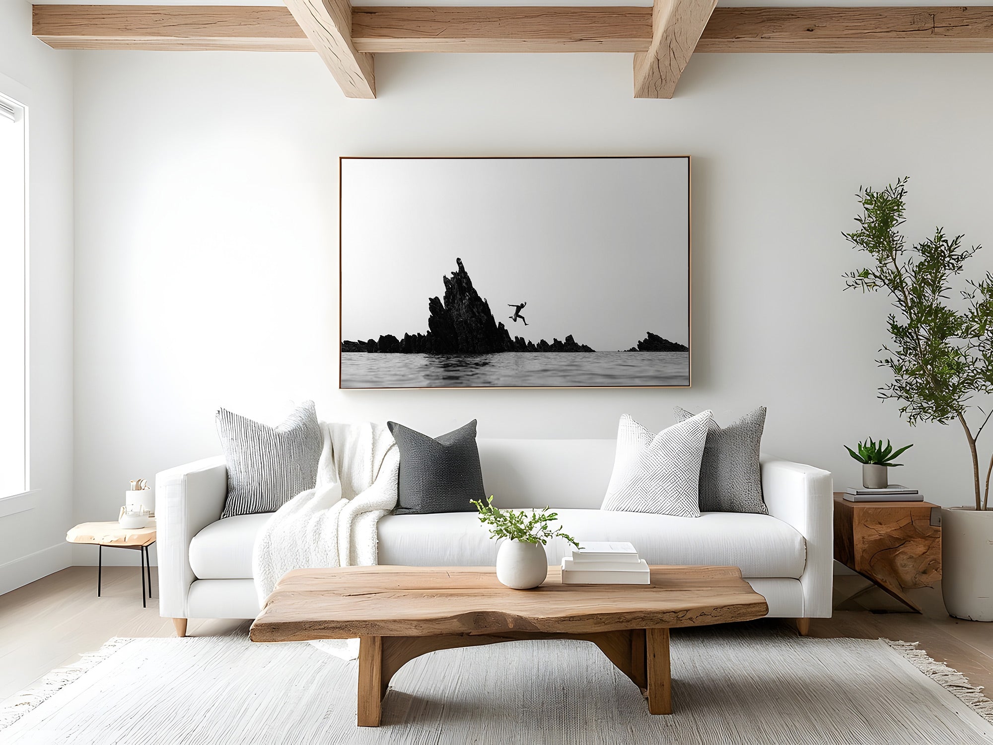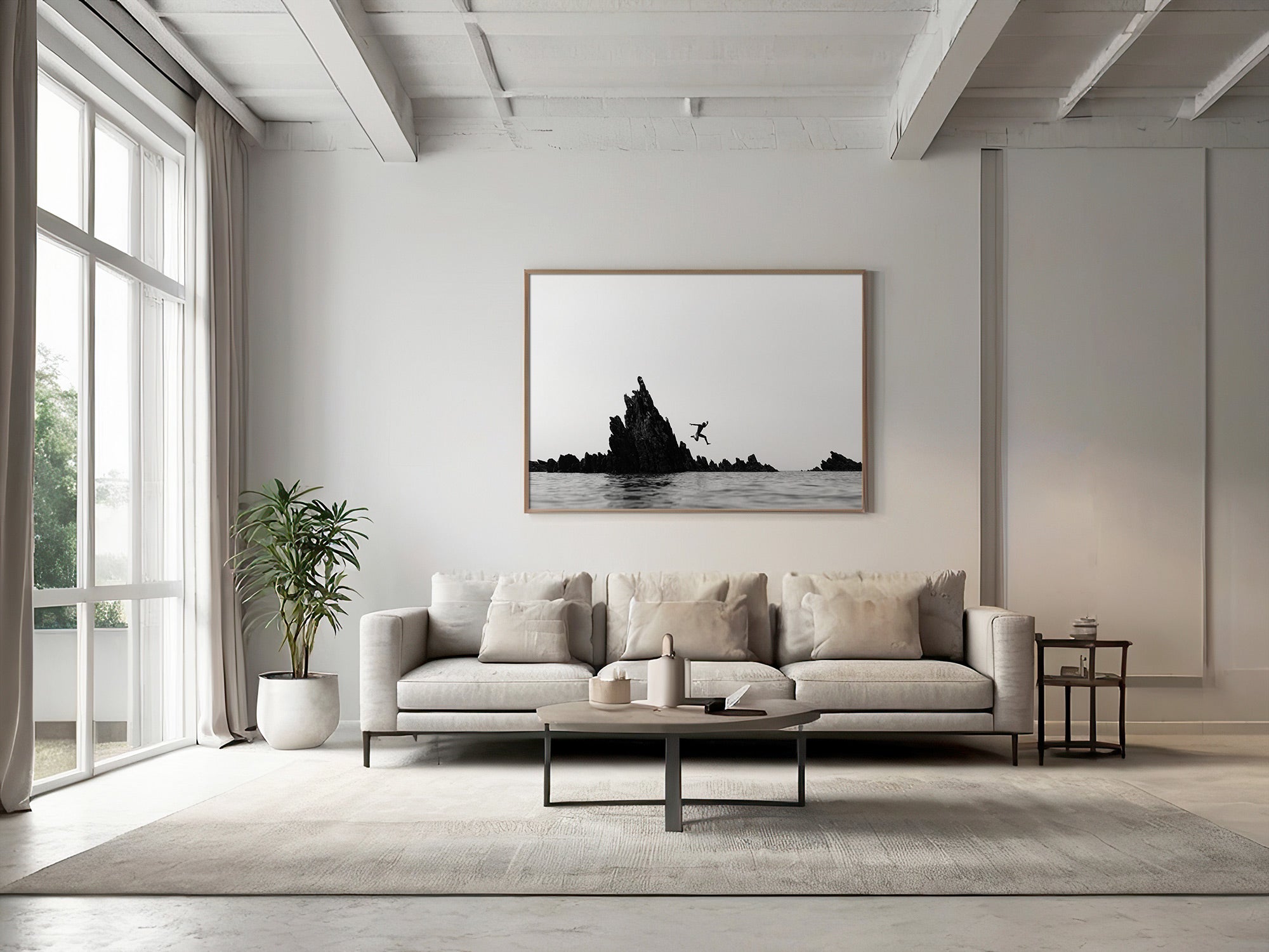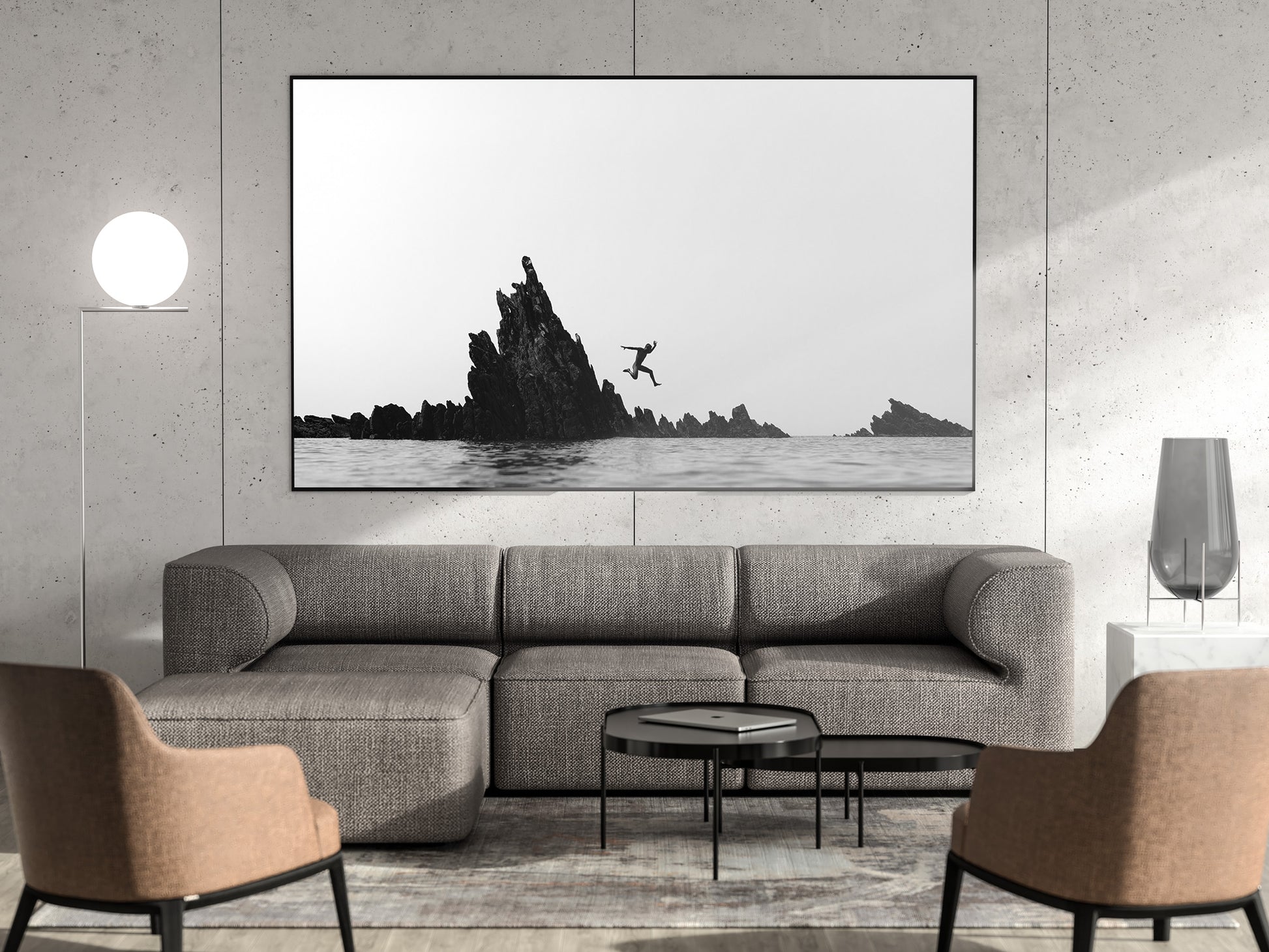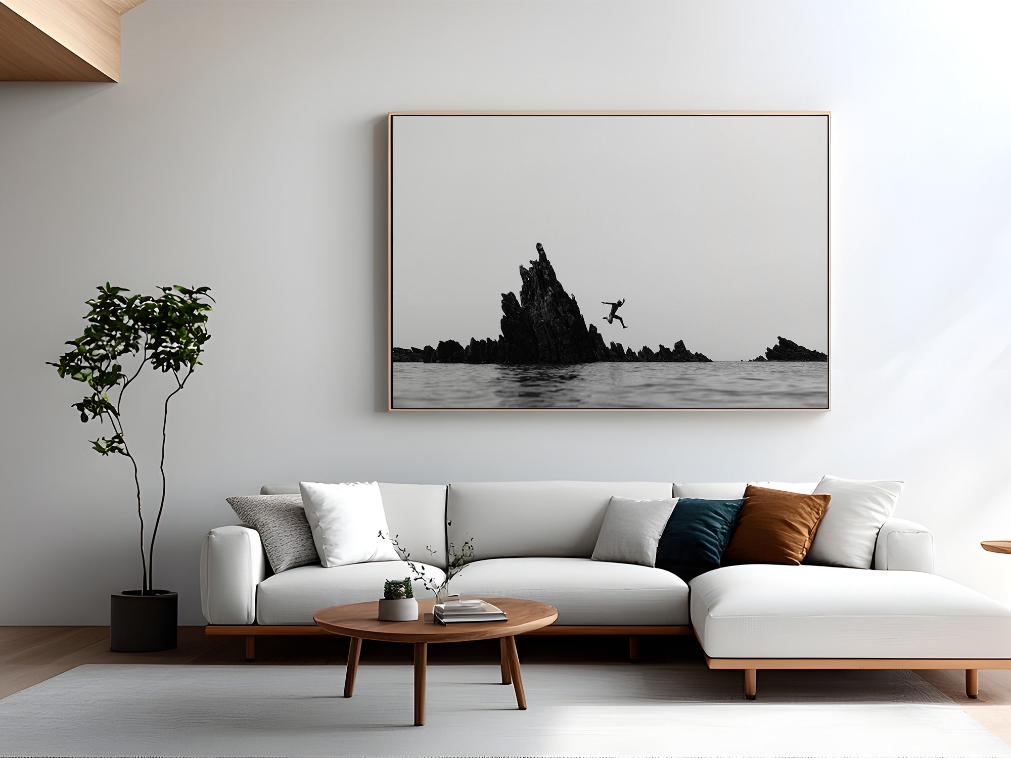 En esta fotografía en blanco y negro, una figura solitaria salta desde una formación rocosa escarpada que se alza imponente sobre la tranquila superficie del mar Mediterráneo. La composición minimalista captura un fugaz instante de euforia y libertad, mientras la persona, recortada contra un cielo despejado, se congela en el aire formando un elegante arco. Las rocas oscuras y afiladas contrastan marcadamente con el fondo más claro, aportando intensidad a la escena. El agua debajo se ve suave y reflectante, aportando una serenidad que contrasta con el dinamismo del salto. La imagen irradia un espíritu aventurero y puro, que encapsula una conexión espontánea con la naturaleza.