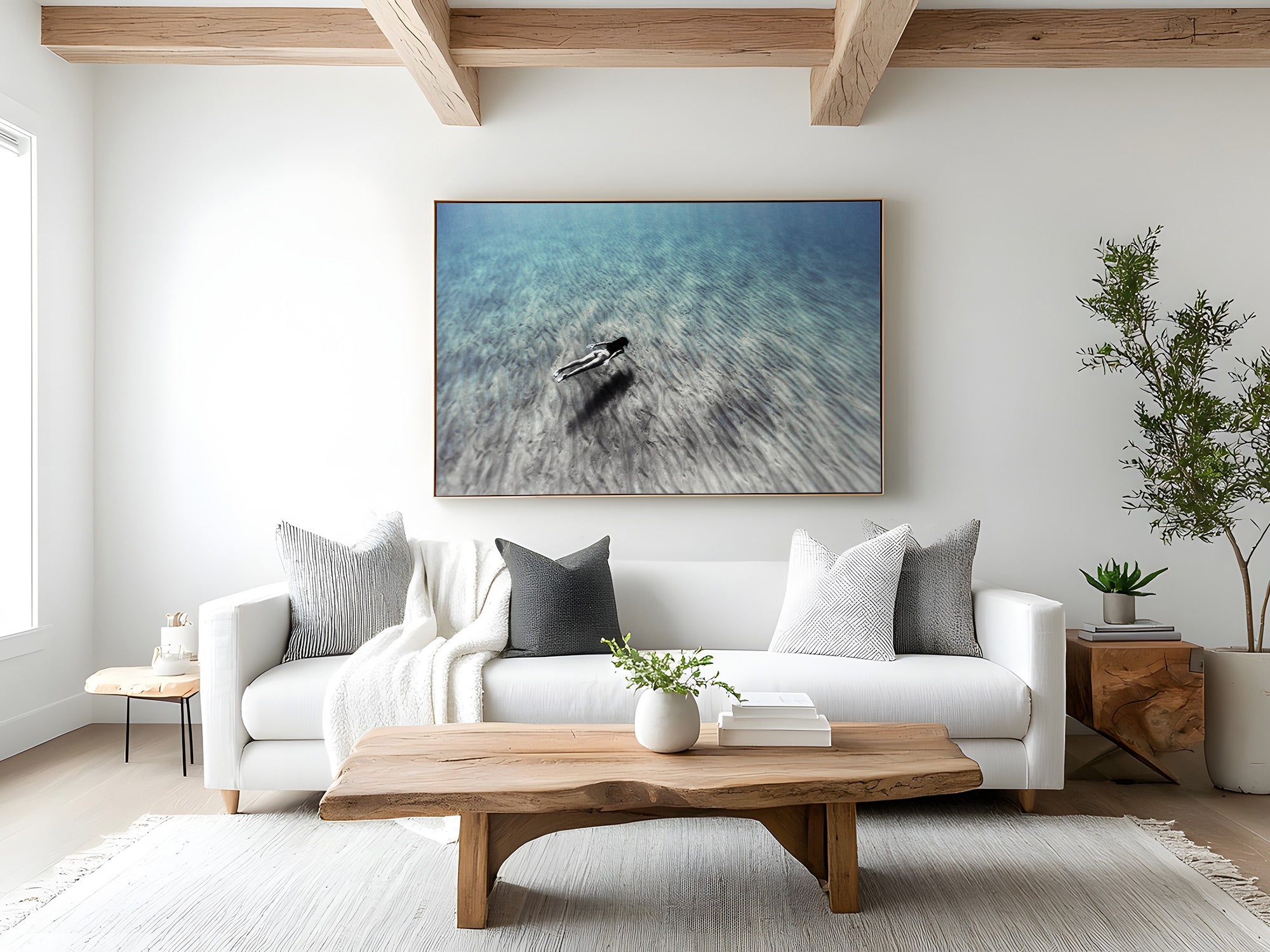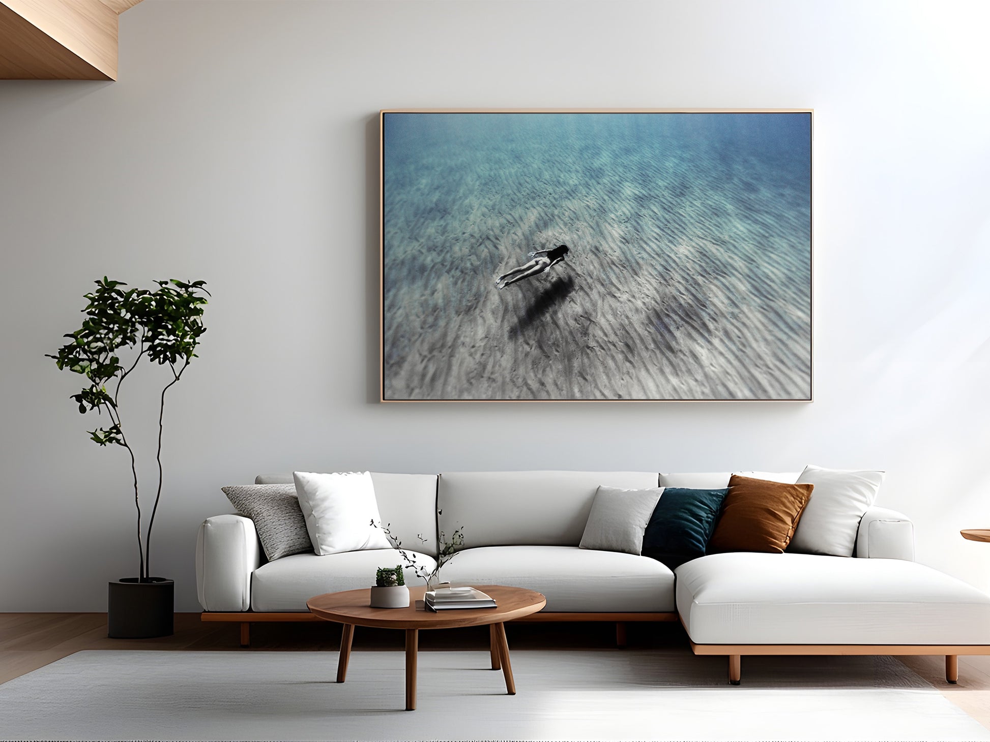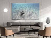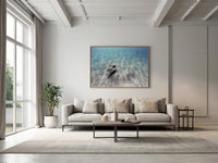 Esta cautivadora fotografía submarina muestra a una apneísta moviéndose con soltura y sin aletas por el ondulado fondo marino cerca de una playa de Menorca, en el Mediterráneo. La figura, recortada contra la arena texturizada, parece ingrávida y serena, representando la libertad y la conexión con la naturaleza. La sutil gradación de azules y verdes en el agua captura la claridad y profundidad propias del Mediterráneo, con la luz danzando tenuemente sobre la arena para resaltar las suaves ondulaciones creadas por las corrientes. La composición, minimalista y serena, celebra la armonía de la figura humana con el entorno submarino.