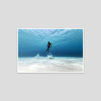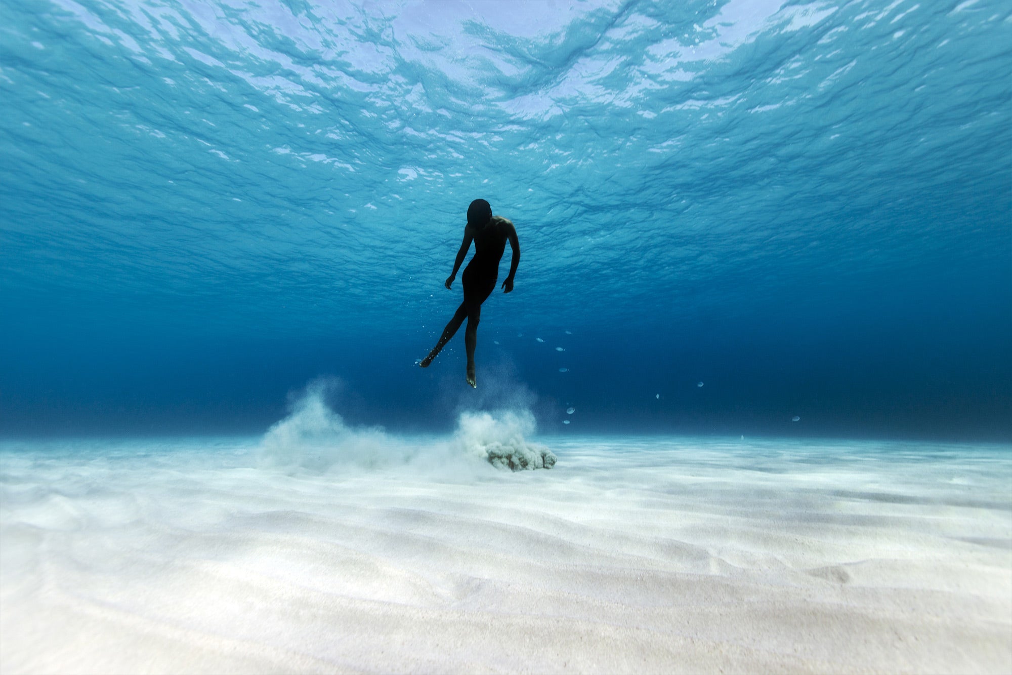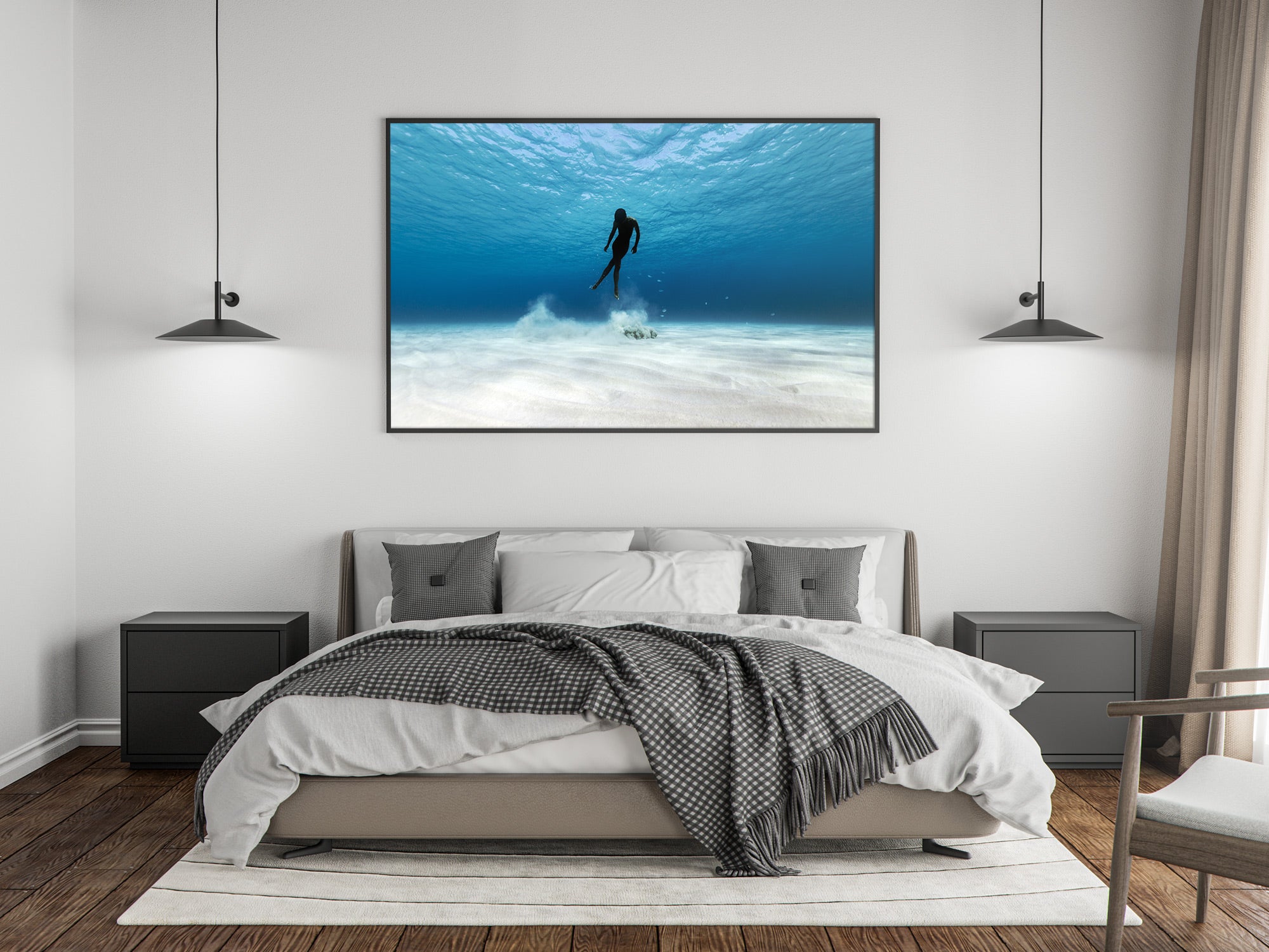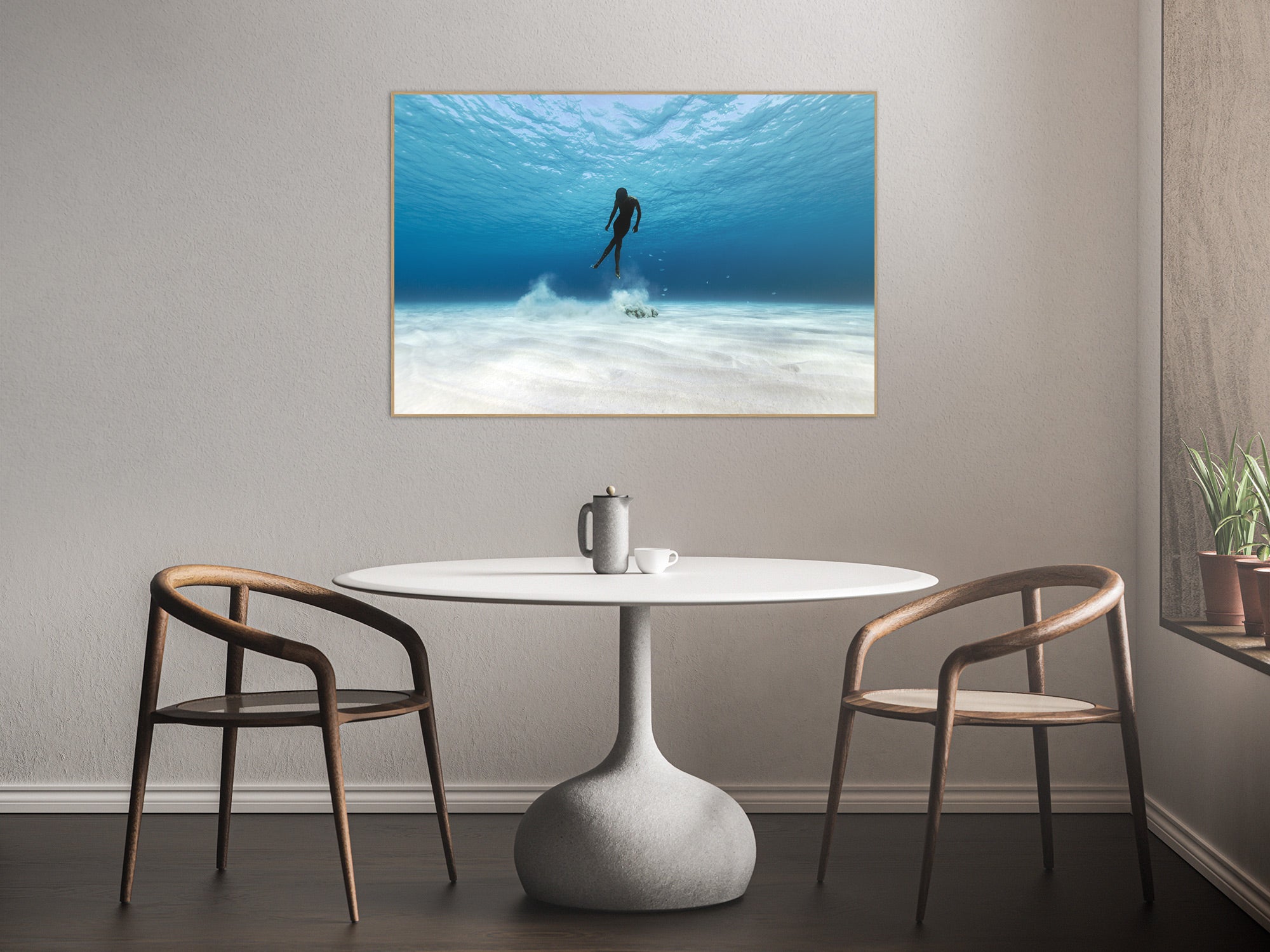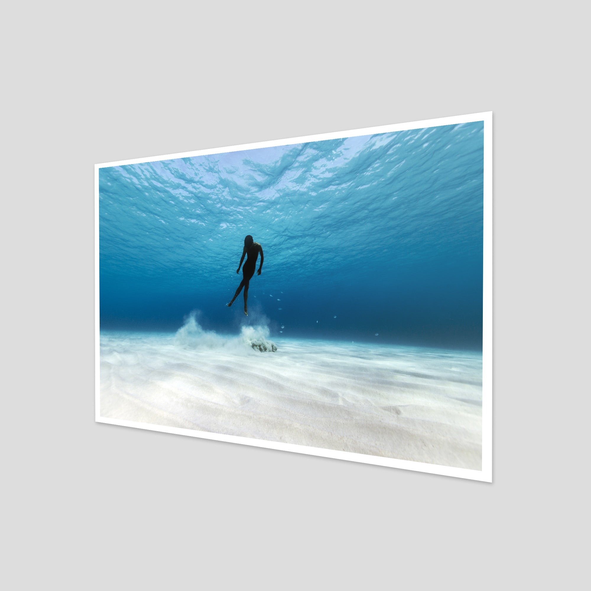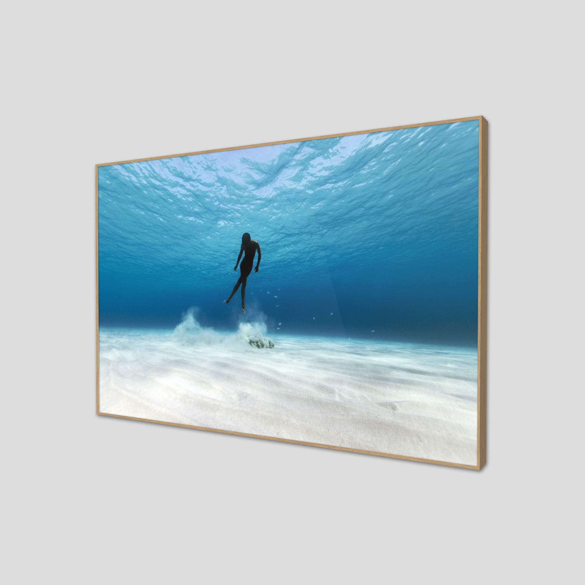 L'eau est cristalline, offrant une vue fascinante sur les ondulations ensoleillées du fond sablonneux. La scène évoque à la fois liberté et sérénité, avec le vaste bleu ondulant qui entoure la plongeuse. L'éclairage accentue le dégradé de bleus, créant une transition onirique entre la lumière proche de la surface et les nuances plus sombres des profondeurs au loin. De fines bulles ou particules sont visibles en suspension dans l'eau, renforçant la sensation de profondeur et de clarté.