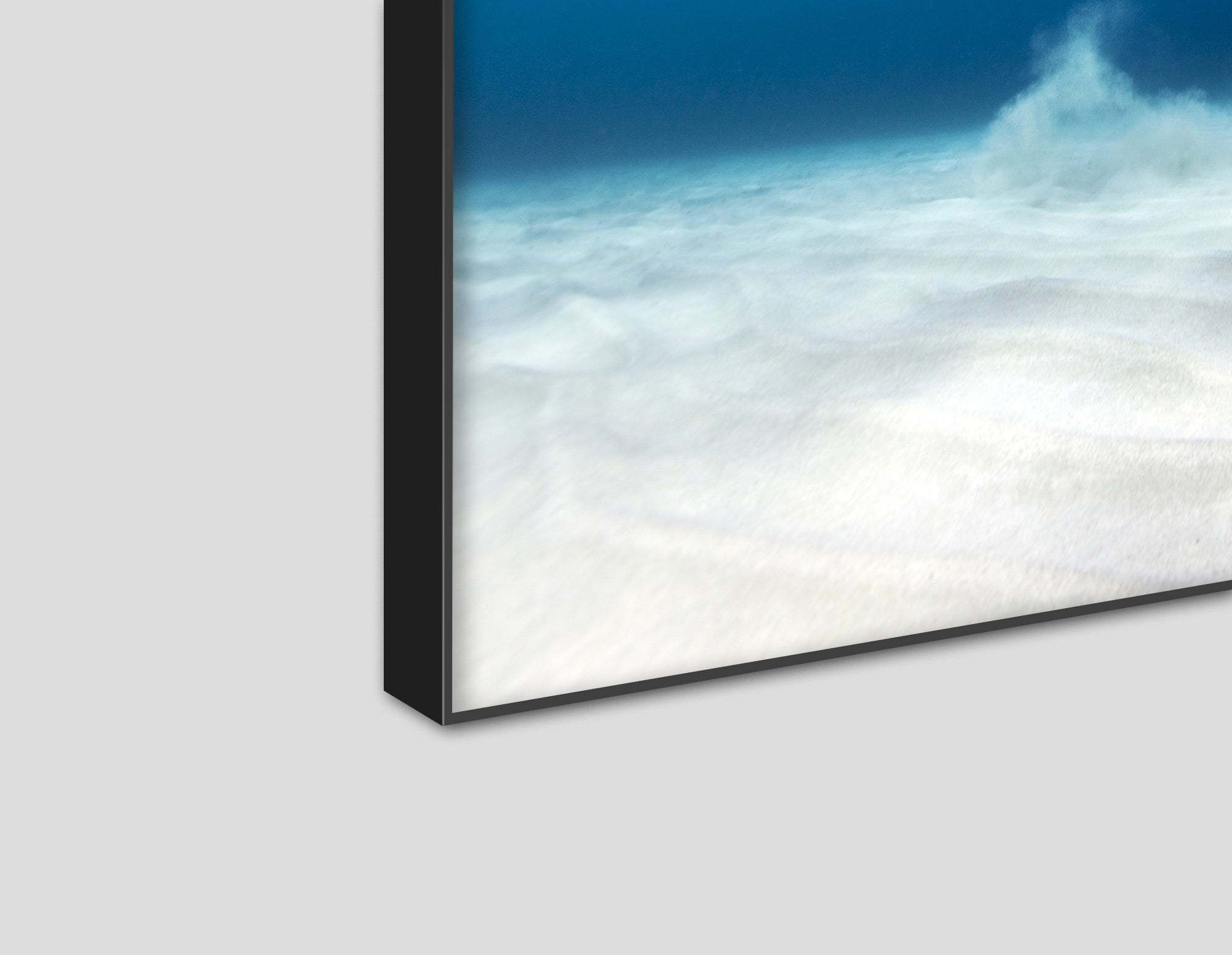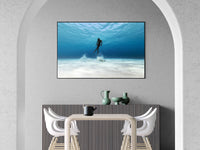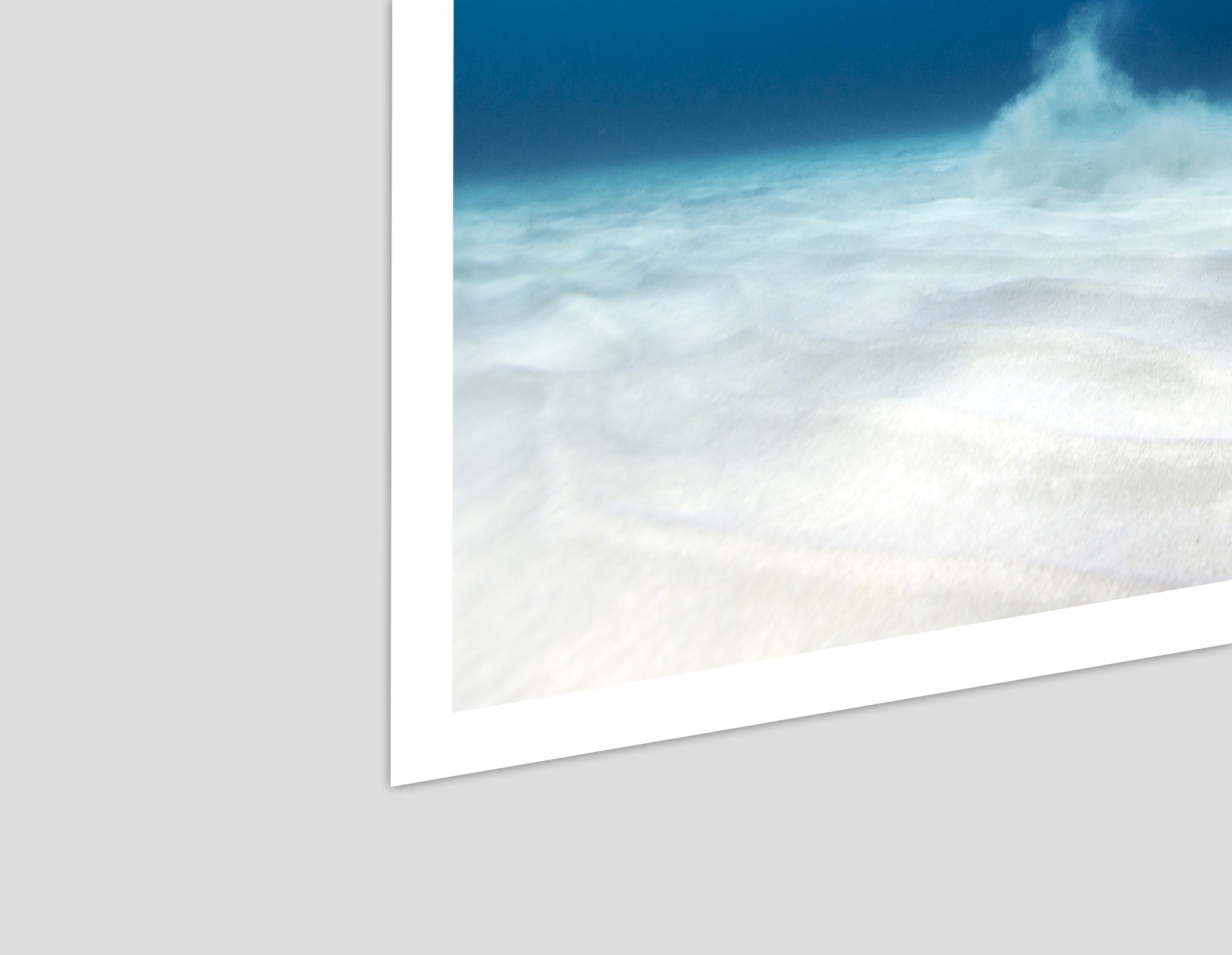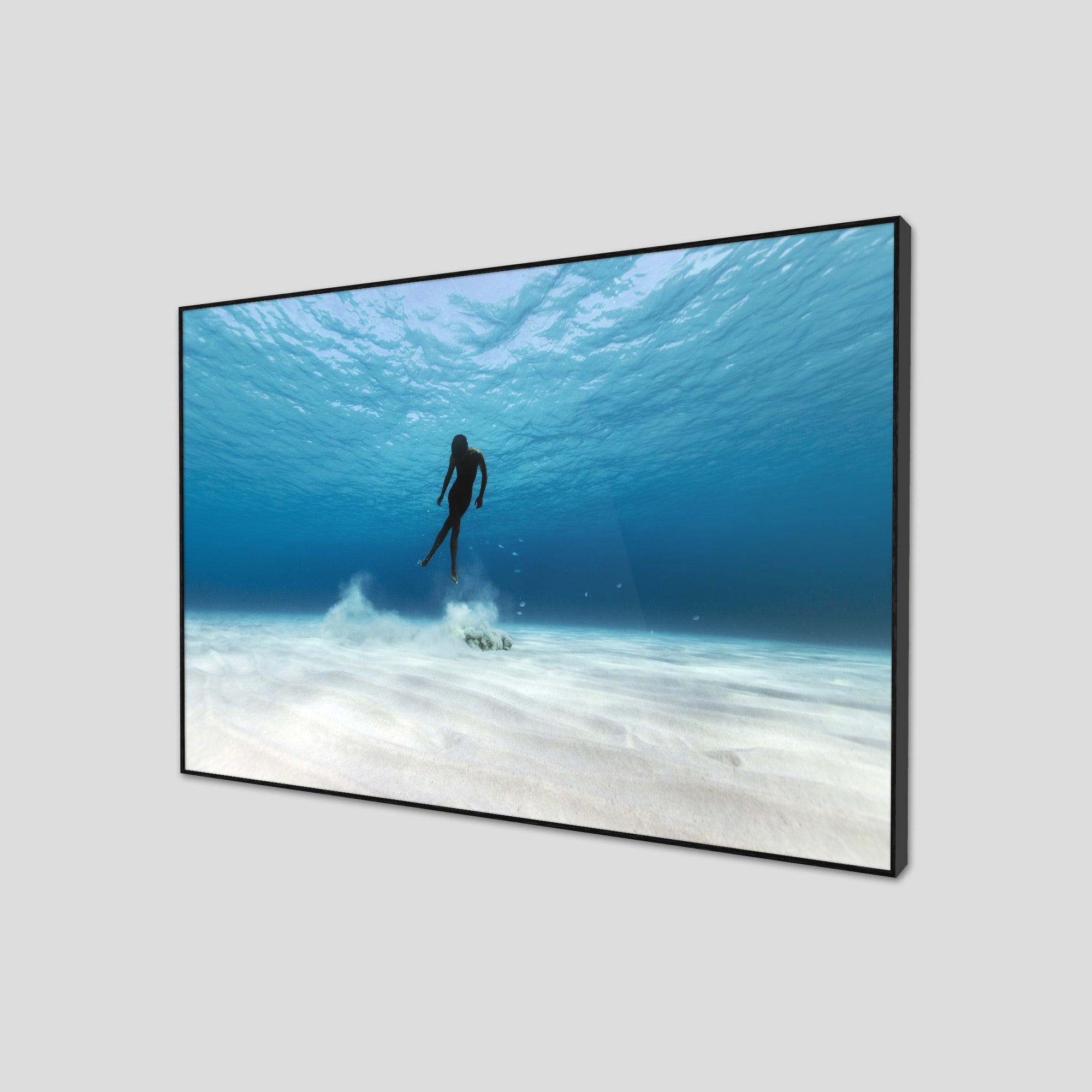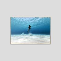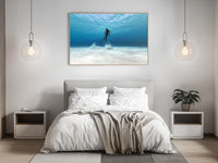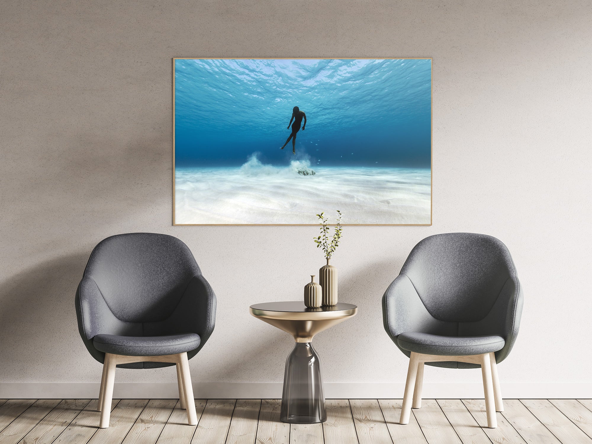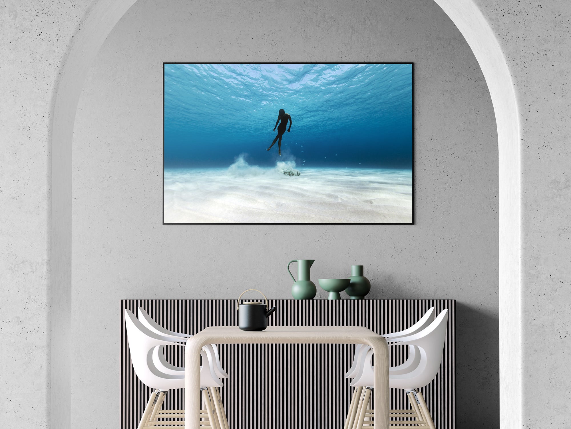 L'eau est cristalline, offrant une vue fascinante sur les ondulations ensoleillées du fond sablonneux. La scène évoque à la fois liberté et sérénité, avec le vaste bleu ondulant qui entoure la plongeuse. L'éclairage accentue le dégradé de bleus, créant une transition onirique entre la lumière proche de la surface et les nuances plus sombres des profondeurs au loin. De fines bulles ou particules sont visibles en suspension dans l'eau, renforçant la sensation de profondeur et de clarté.