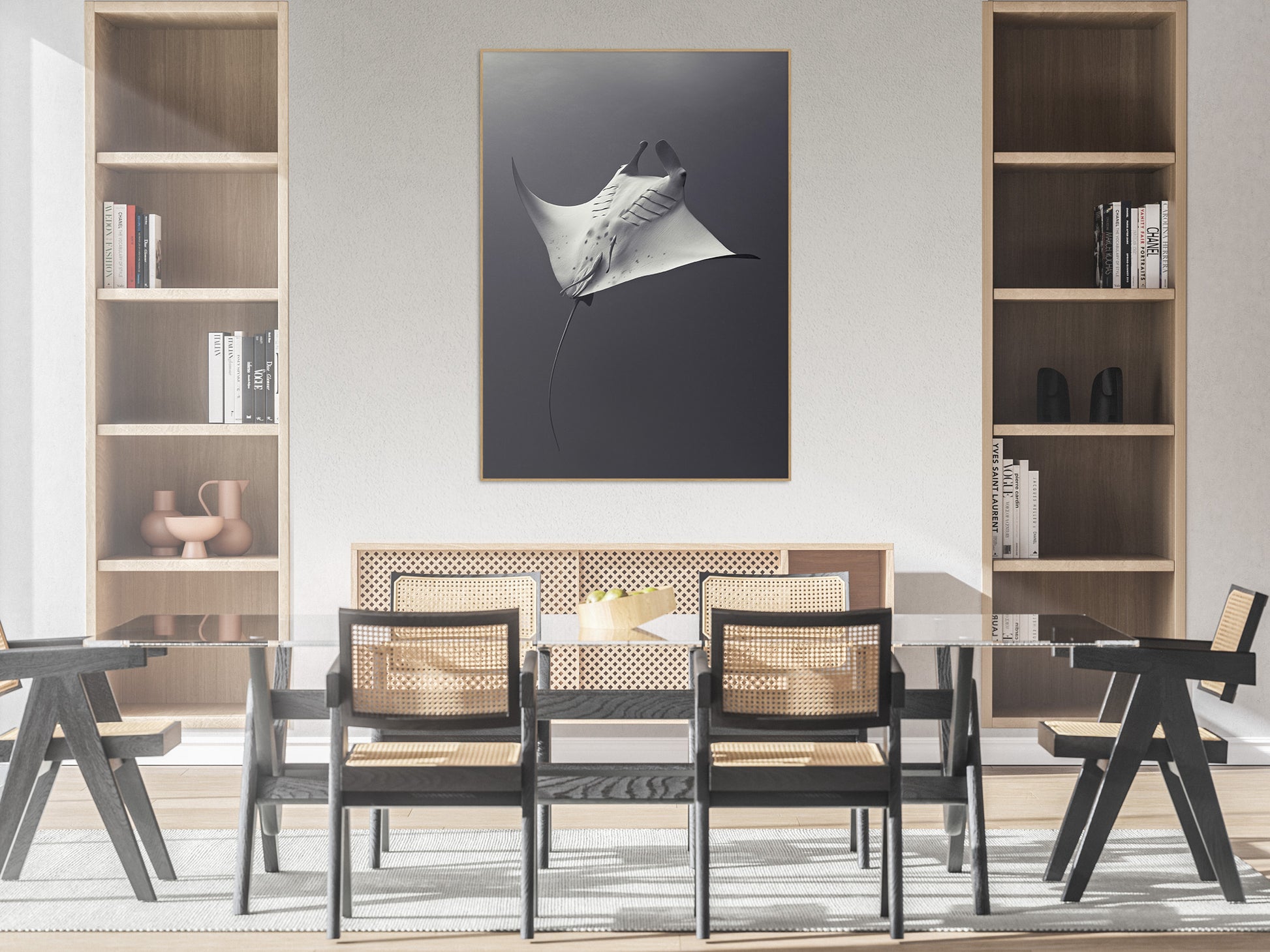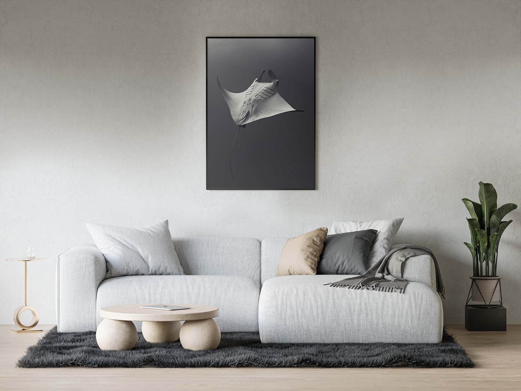 The image shows a graceful manta ray gliding through the ocean, its wide, wing-like fins spread open as it moves through the deep water. The light from above subtly highlights its smooth, pale body, which contrasts with the darker water surrounding it. The manta's elegant form and long tail create a sense of fluidity and freedom as it effortlessly navigates the vast, tranquil underwater world.