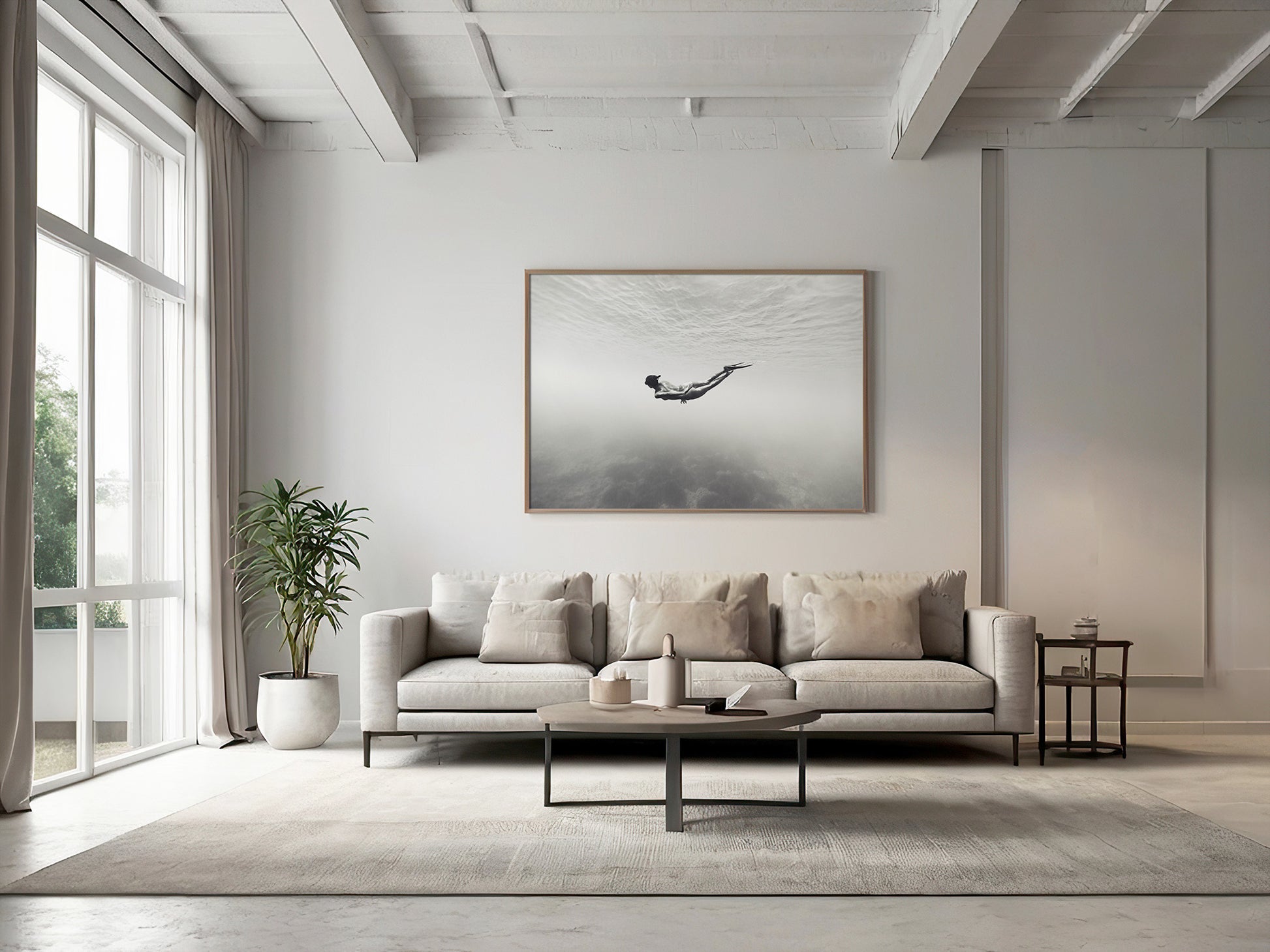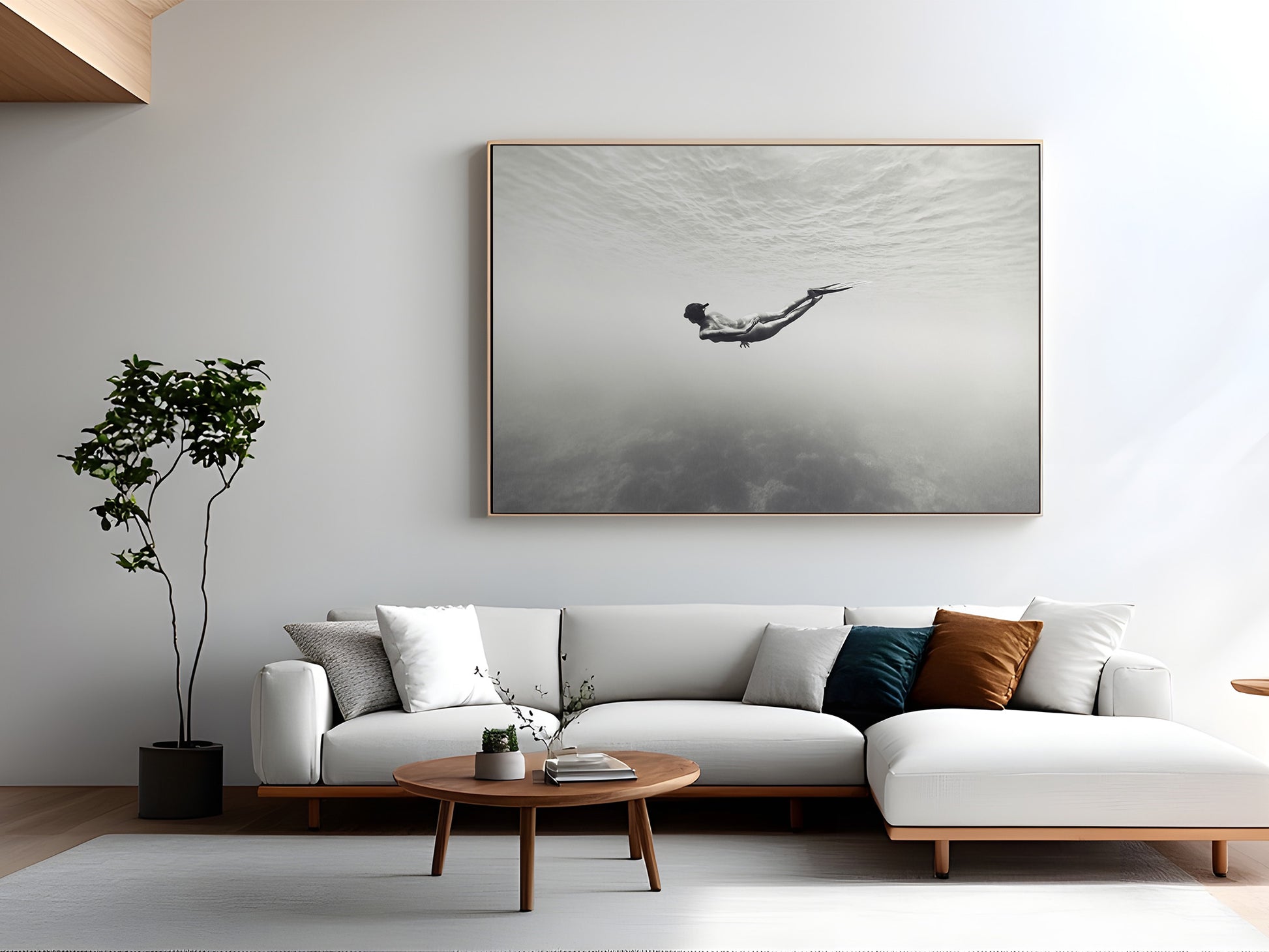 Freediving in this natural state, she surrenders to the quiet and the calm, allowing the ocean to carry her. Each breath held is a moment of trust, a dance with the deep, where simplicity and freedom take center stage, and nothing exists except her and the vast, endless blue.