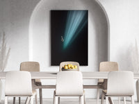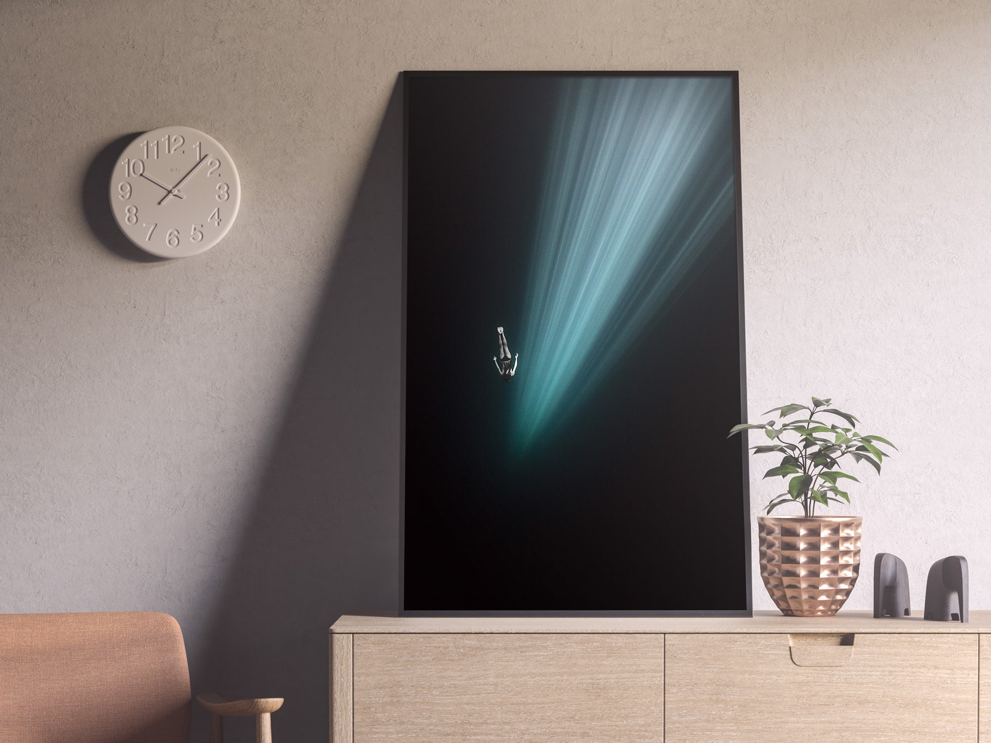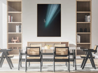 A woman descends gracefully in a deep underwater cave within a cenote in Mexico, surrounded by a vast darkness that envelops her completely. Sun rays penetrate the surface far above, creating a dramatic, ethereal effect as they cascade down in beams of light that illuminate her silhouette. The natural spotlight effect from the rays enhances the sense of depth, making the cavern appear almost infinite. She is freediving without fins, her body streamlined and poised, embodying tranquility and freedom in this surreal, otherworldly environment.