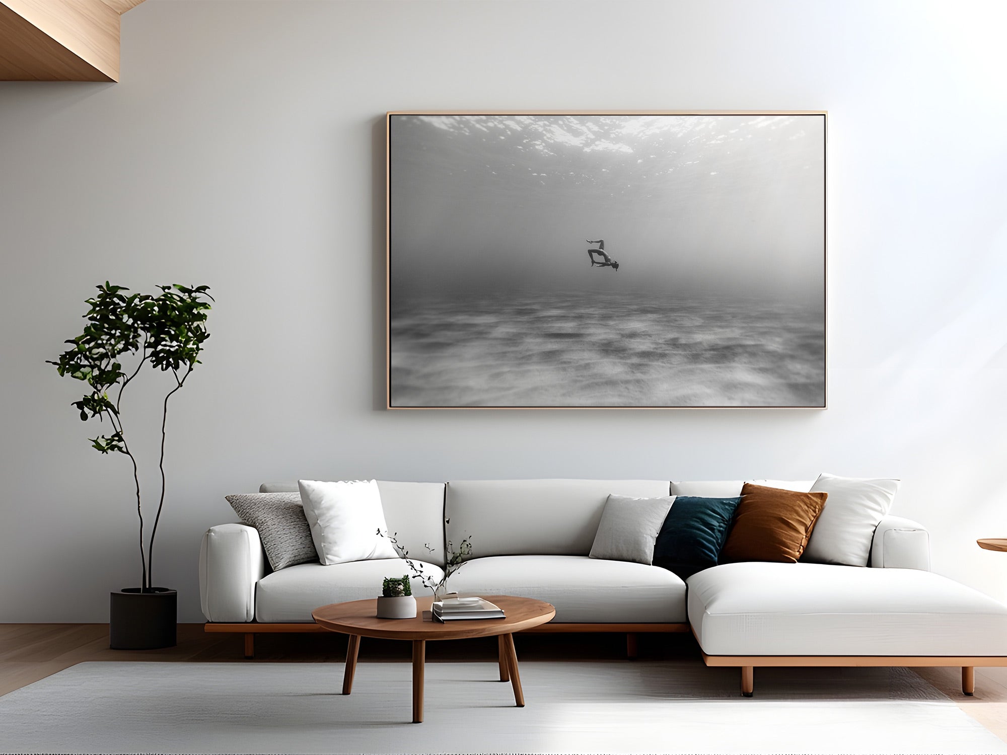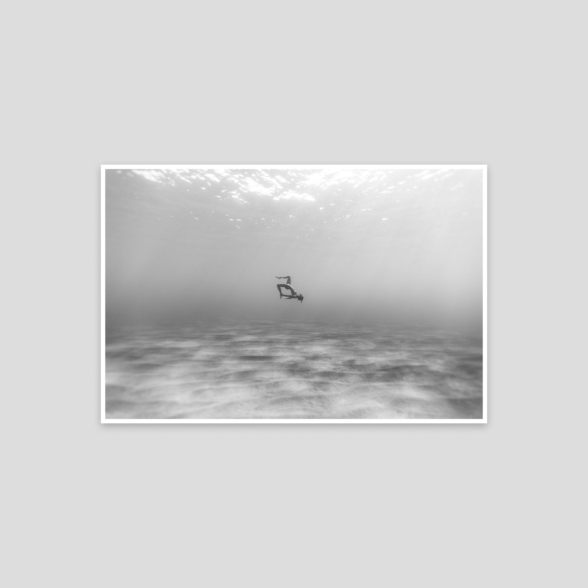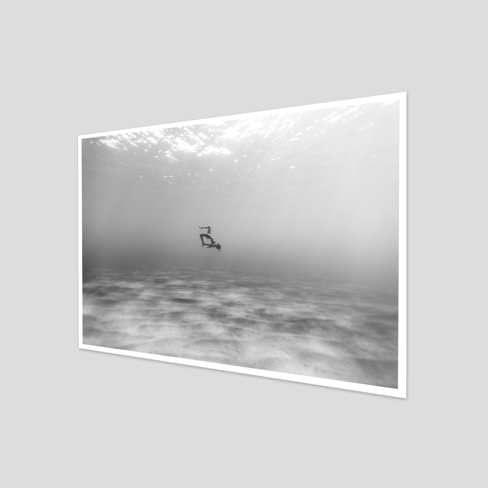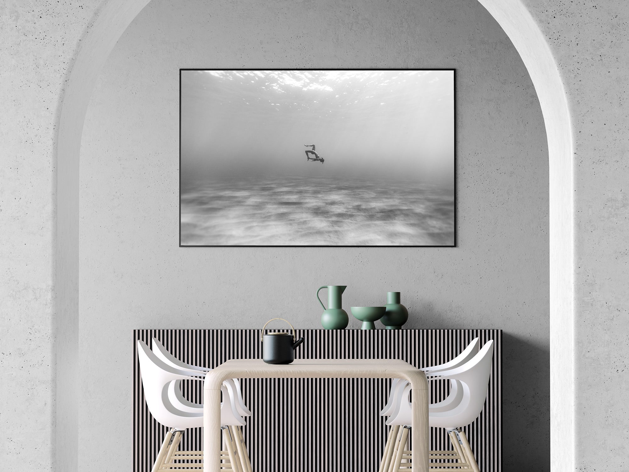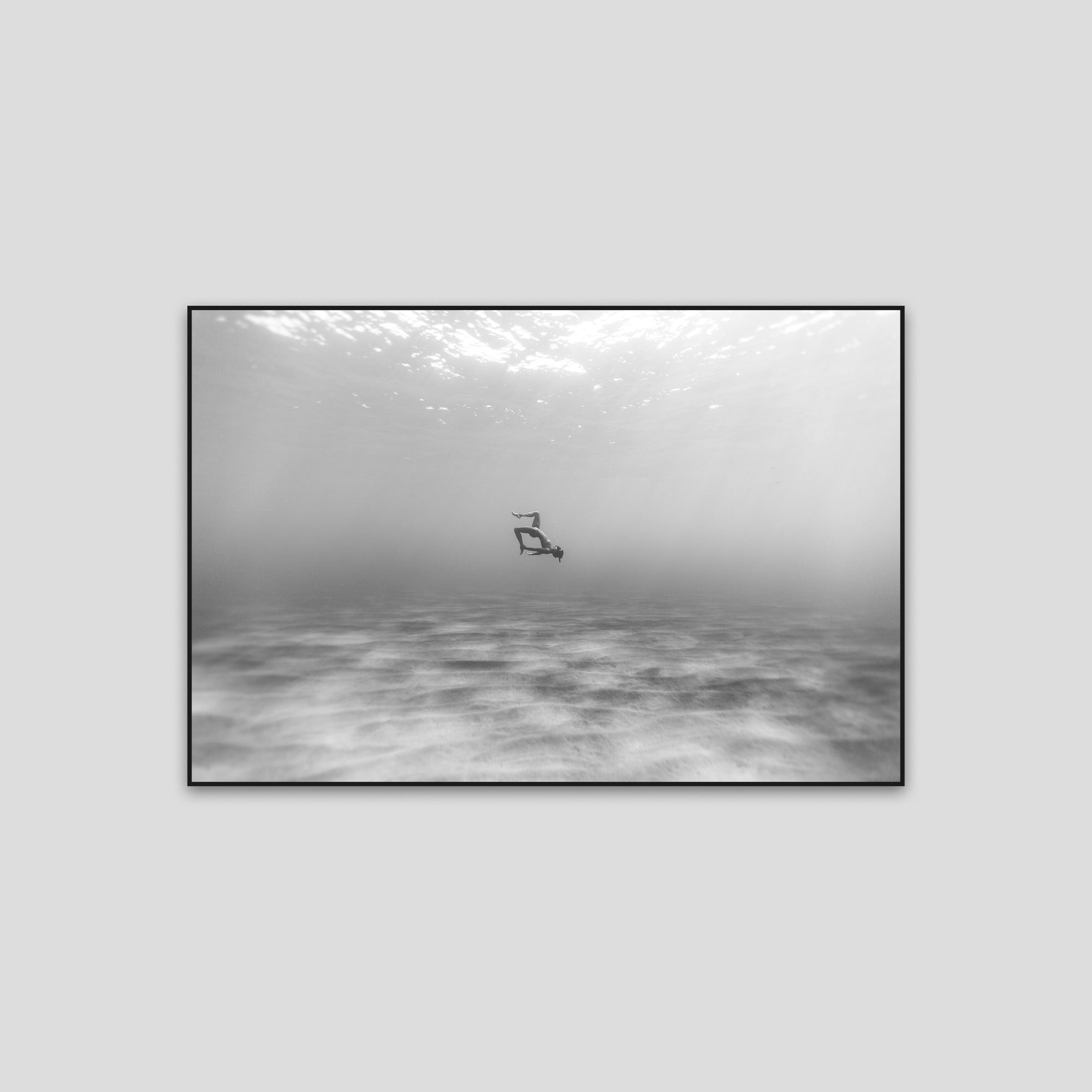 Beneath the calm waters of the Mediterranean, a lone figure drifts in silence, suspended between light and depth. Sunrays filter from above, illuminating the vast seabed in soft gradients of shadow and light. A moment of weightlessness that reflects the ocean’s serenity and infinite expanse.