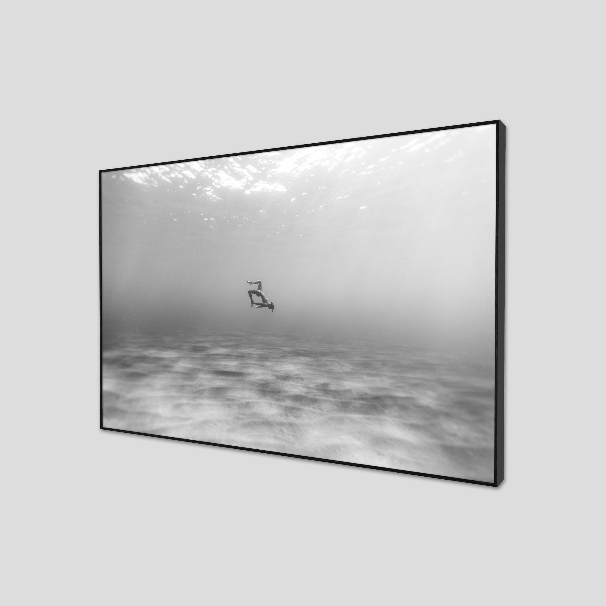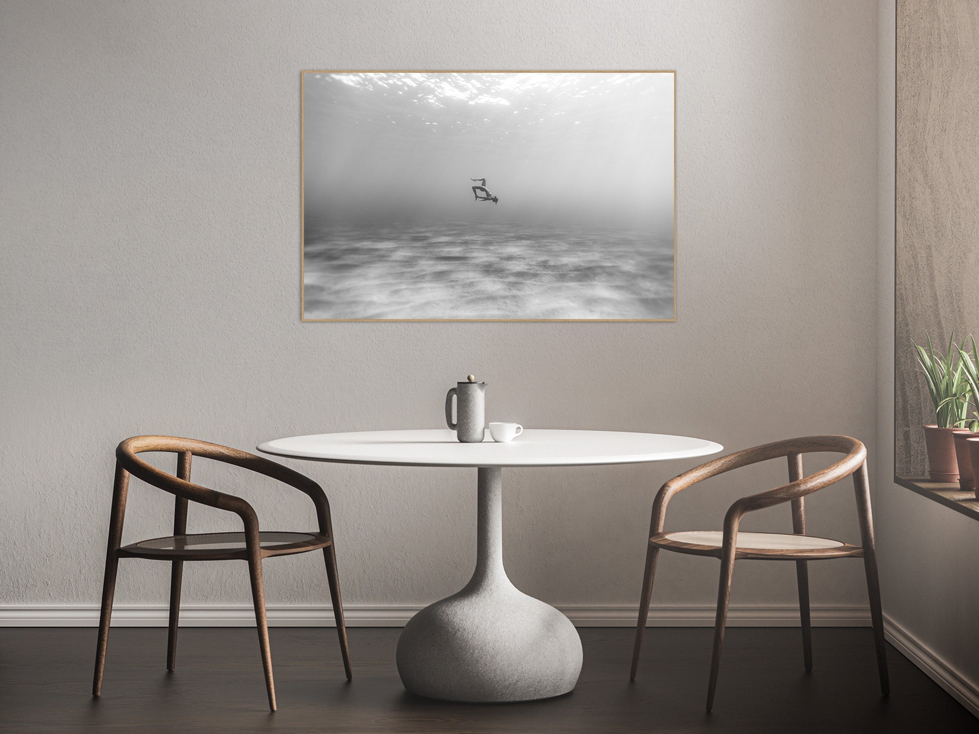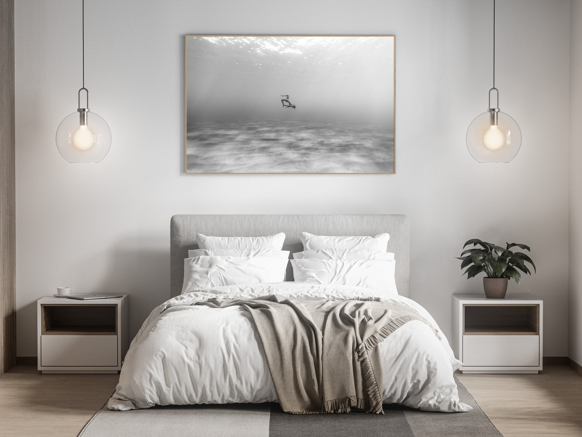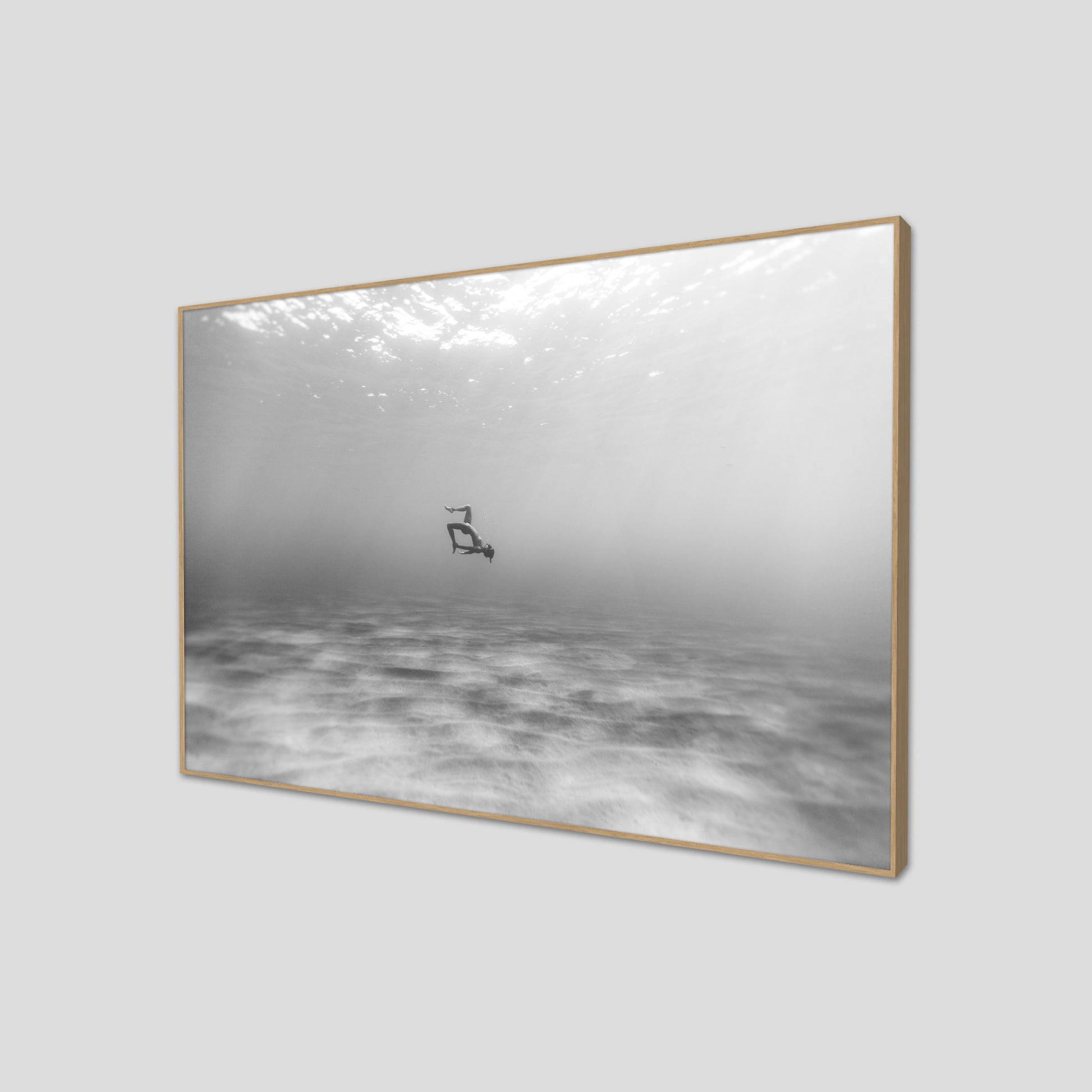 Beneath the calm waters of the Mediterranean, a lone figure drifts in silence, suspended between light and depth. Sunrays filter from above, illuminating the vast seabed in soft gradients of shadow and light. A moment of weightlessness that reflects the ocean’s serenity and infinite expanse.