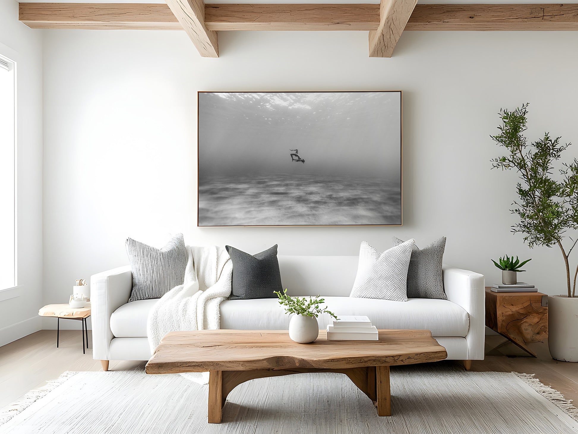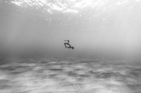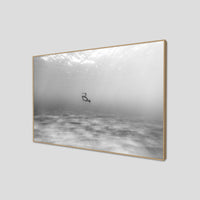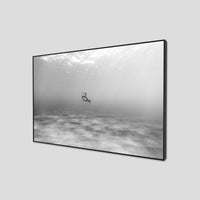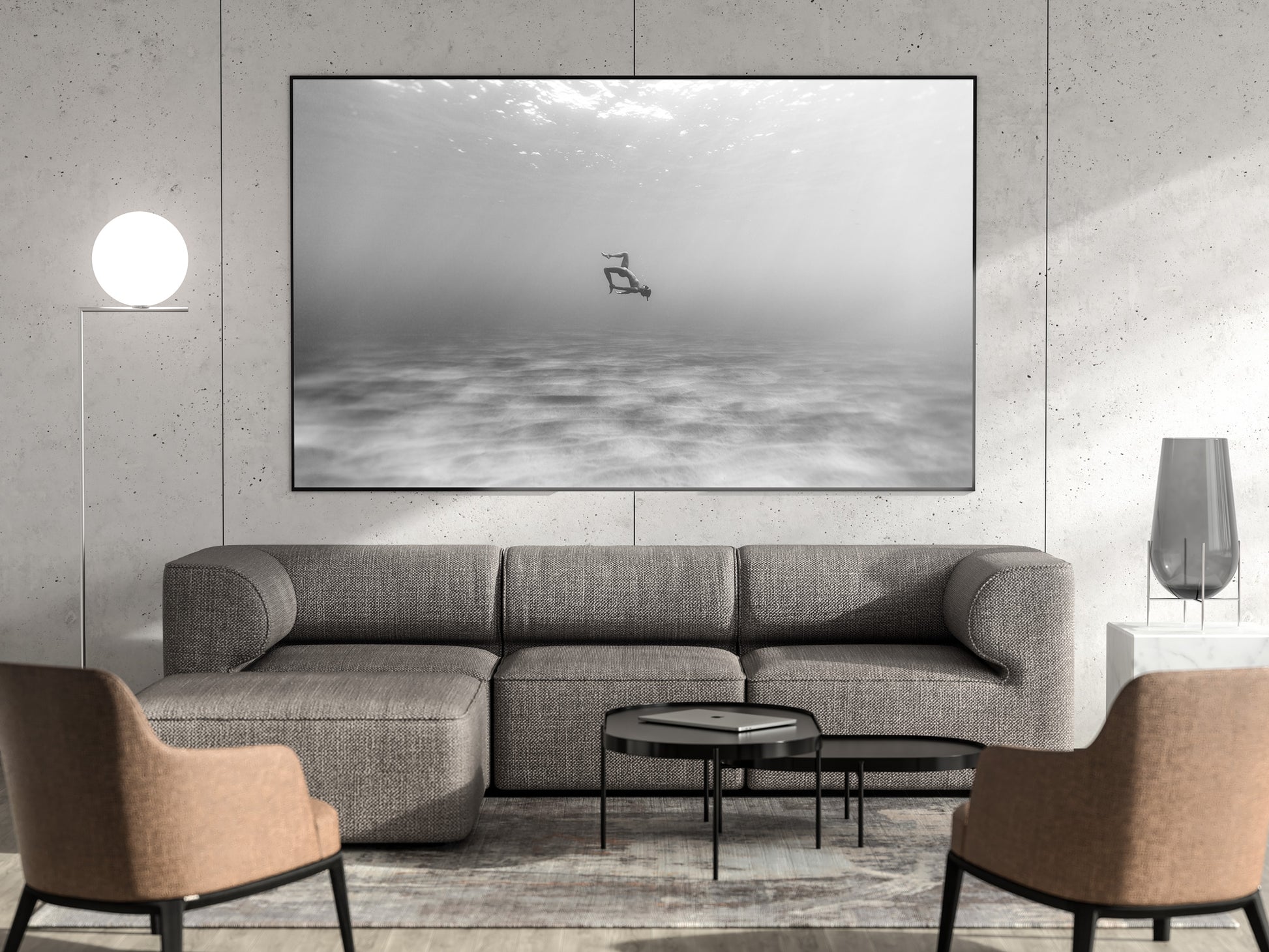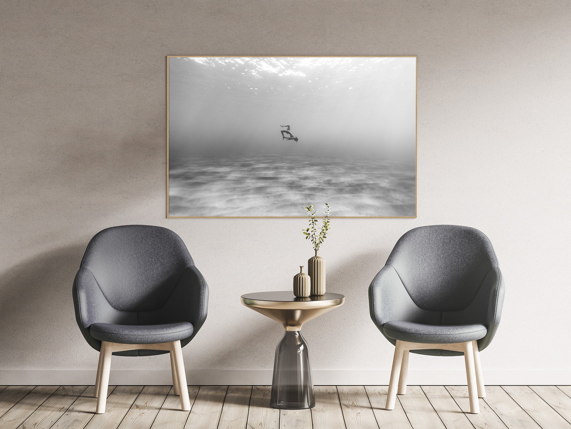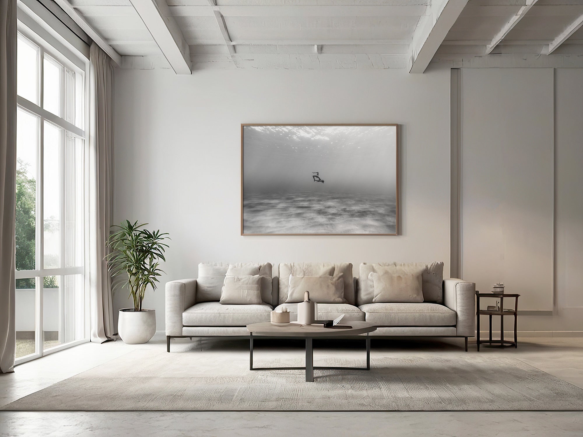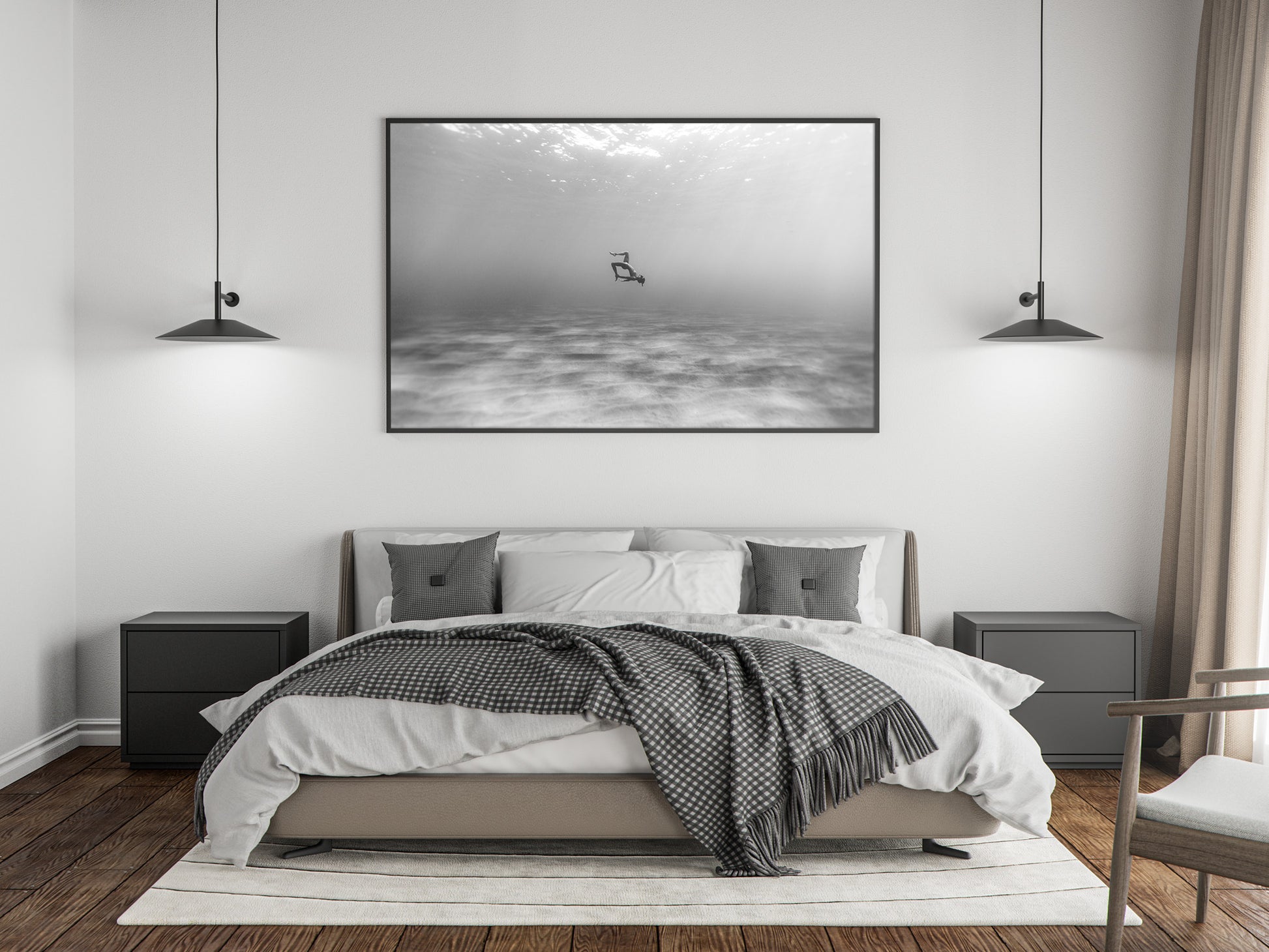 Beneath the calm waters of the Mediterranean, a lone figure drifts in silence, suspended between light and depth. Sunrays filter from above, illuminating the vast seabed in soft gradients of shadow and light. A moment of weightlessness that reflects the ocean’s serenity and infinite expanse.