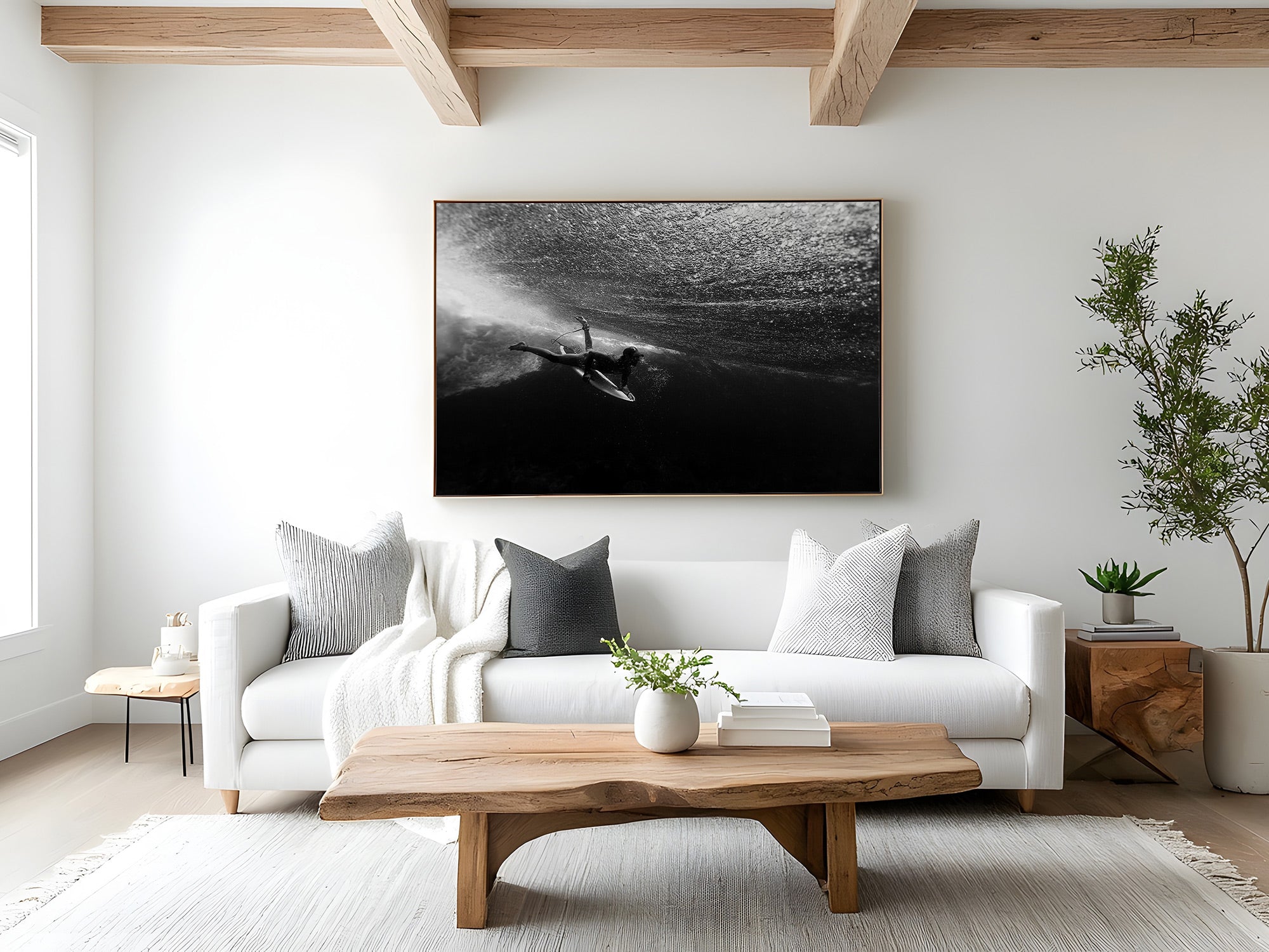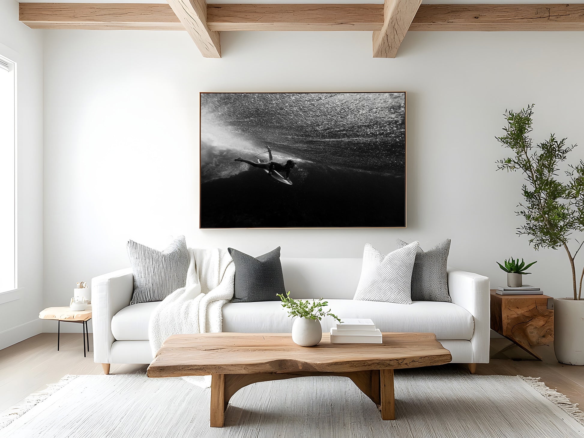 This black-and-white photograph captures an underwater view of a surfer diving beneath a wave, surrounded by the dynamic texture and light patterns created by the water. The surfer, equipped with a leash connected to their ankle and holding a surfboard close to their body, is oriented diagonally as they navigate under the turbulent surface. The wave above forms a frothy ceiling of bubbles and ripples, with patches of light filtering through, casting a dramatic contrast against the dark depths below. This interplay of light, shadow, and movement gives the image a powerful sense of immersion, highlighting the raw energy of the Mediterranean Sea off the coast of Menorca.