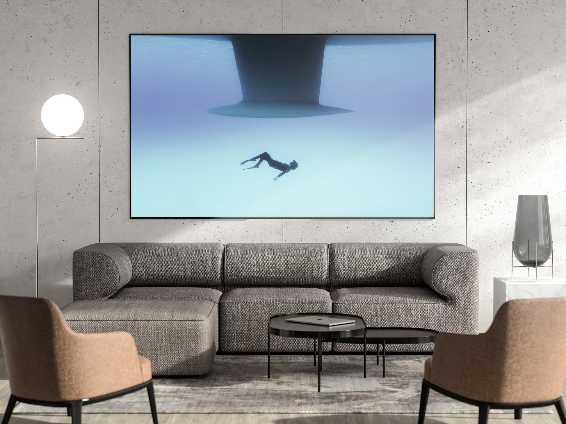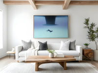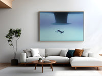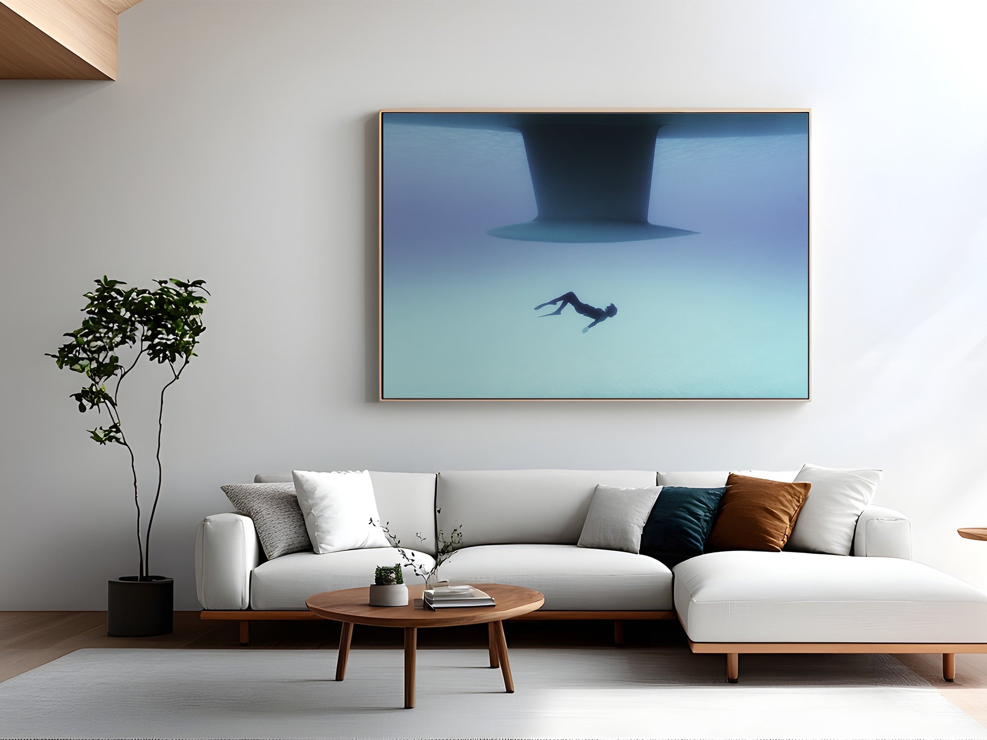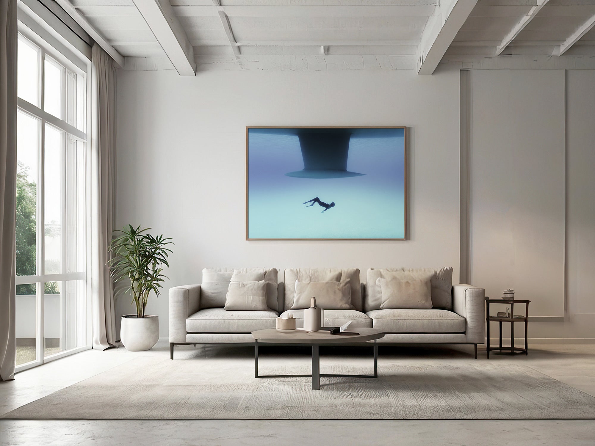 This serene underwater photograph captures a woman, floating effortlessly below the keel of a sailboat in the calm, blue waters of the Mediterranean Sea near Menorca. The woman, wearing a wetsuit and fins, lies suspended in a peaceful, horizontal pose beneath the vast hull, suggesting a moment of tranquility and harmony with the sea. The keel's wide, smooth structure looms above her, casting a shadow that contrasts with the soft gradient of light surrounding them, from a deeper blue at the top to a pale, almost ethereal light near the sandy ocean floor. The muted colors enhance the feeling of isolation, creating a composition that feels vast yet intimate, evoking the mystique of deep-sea exploration and the human connection to the marine environment.