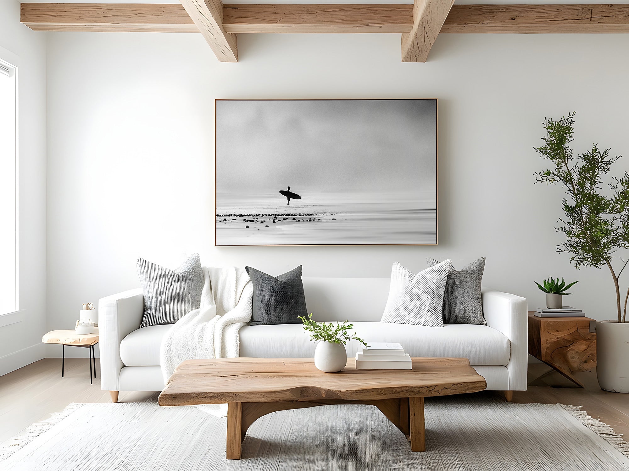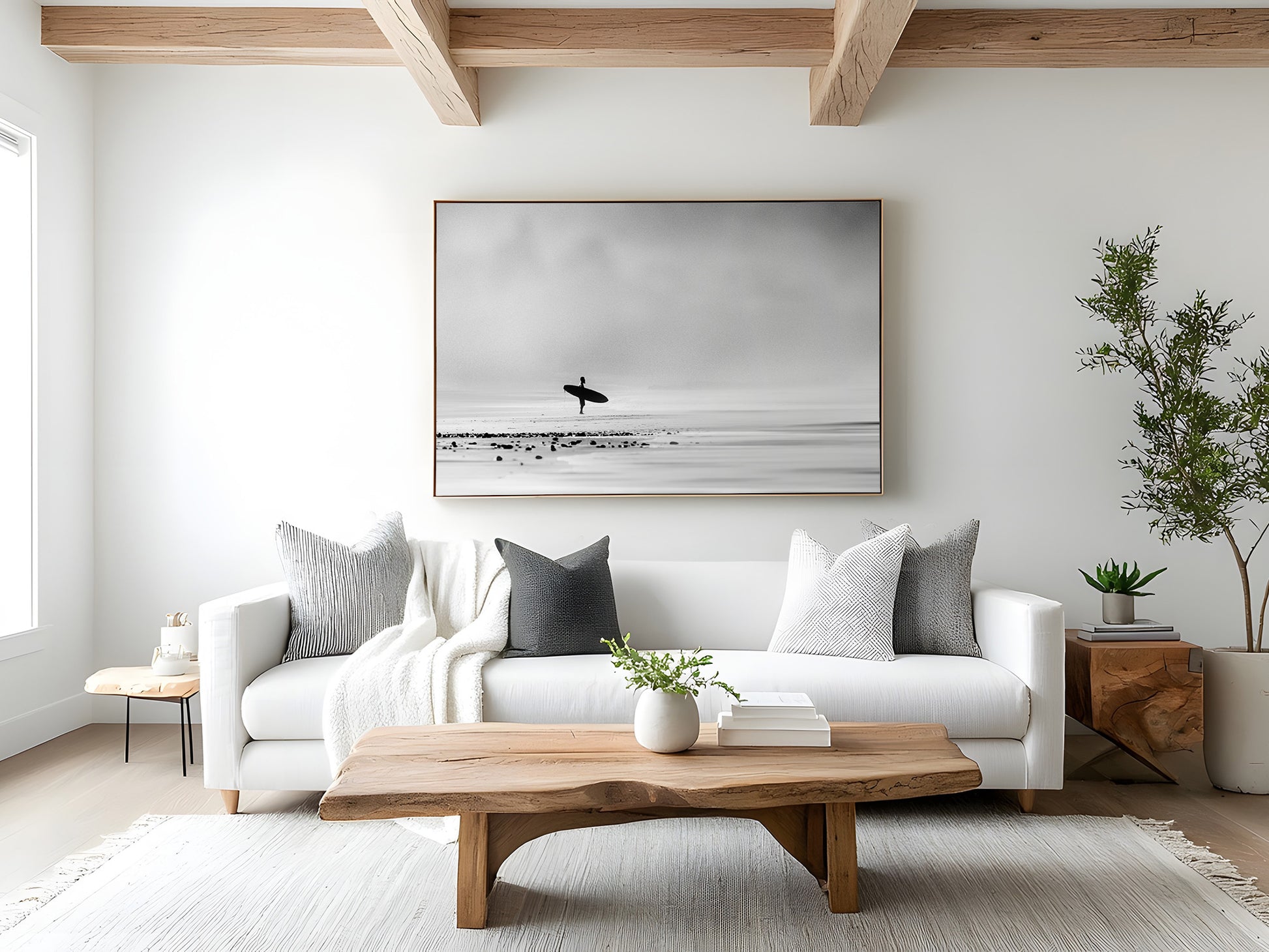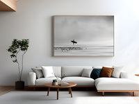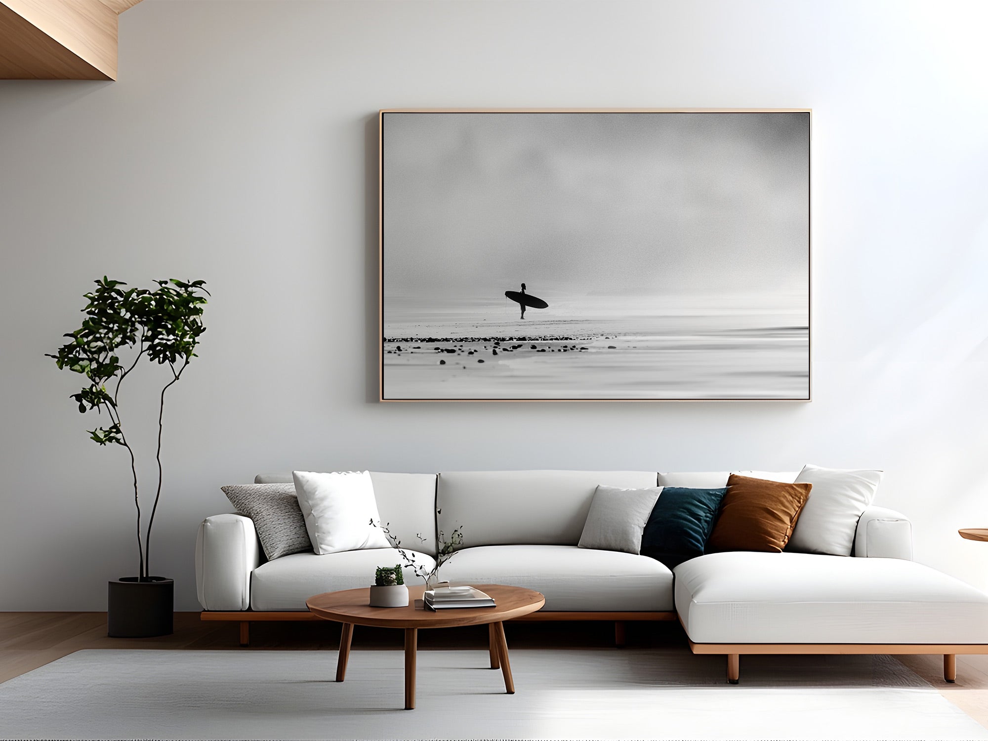 This image presents a minimalist yet evocative scene on a beach in Costa Rica. A lone surfer stands ankle-deep in shallow water, holding their longboard vertically, its dark silhouette cutting through the soft, ethereal haze that envelops the shore. The entire scene is rendered in a high-contrast black and white, giving it a timeless, almost dreamlike quality. The sky and ocean blur together in a misty gradient, creating an expansive sense of space and solitude, while the scattered stones in the foreground add texture and ground the viewer in the sandy landscape. This composition captures a moment of quiet anticipation before the surfer ventures into the waves, embodying a peaceful connection to the natural world and the allure of the open ocean.