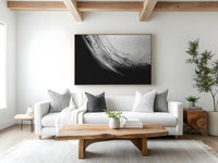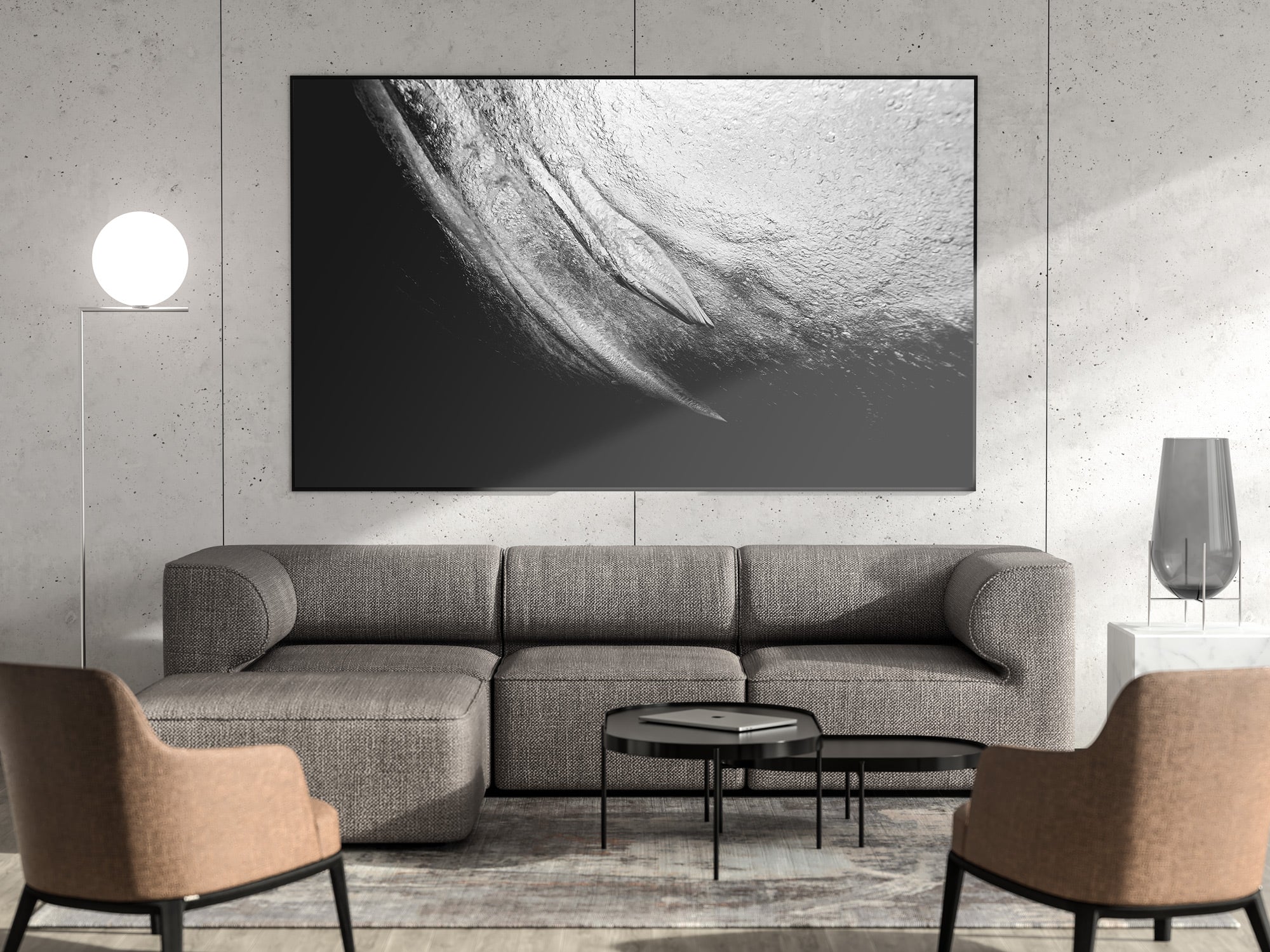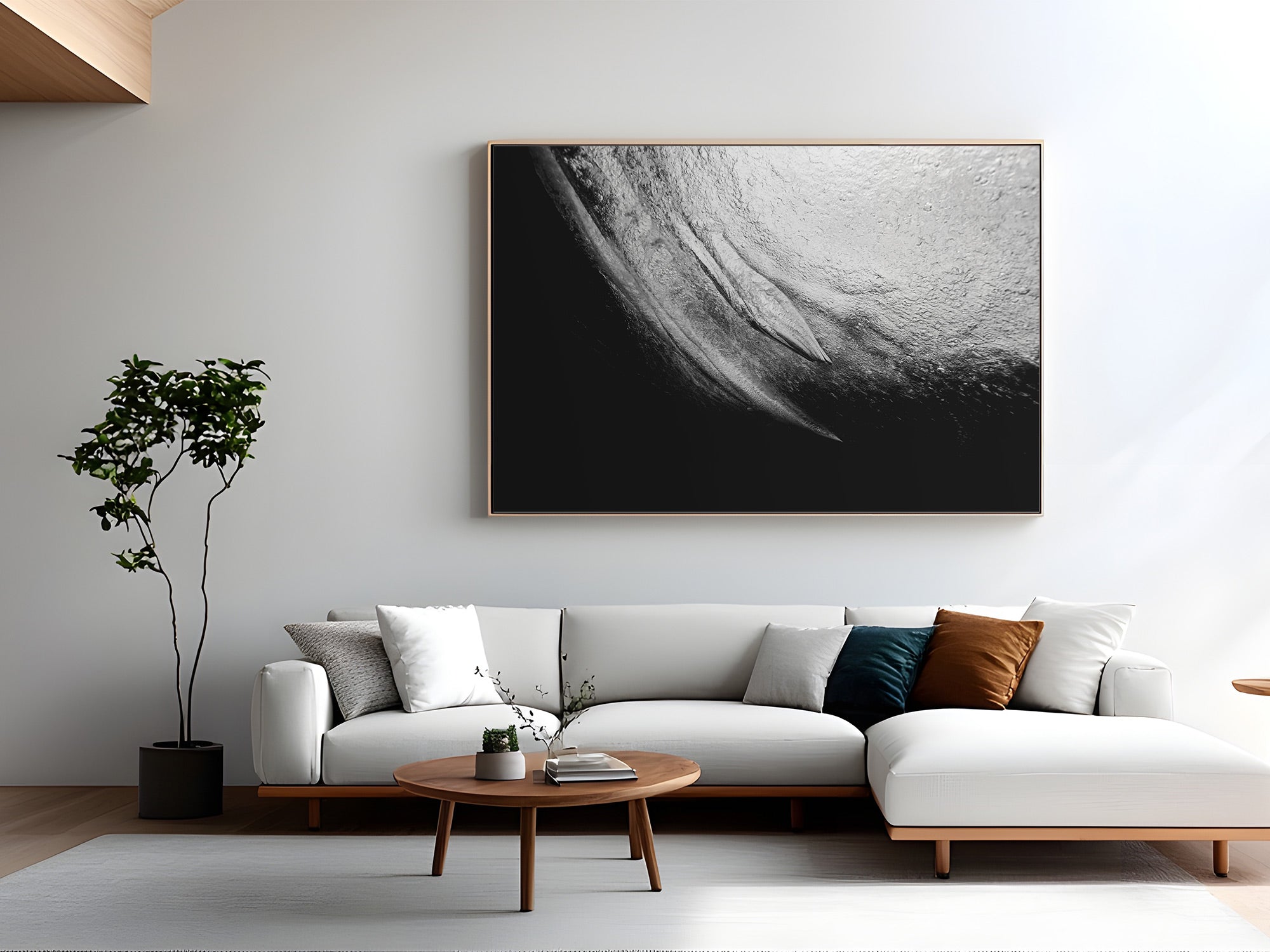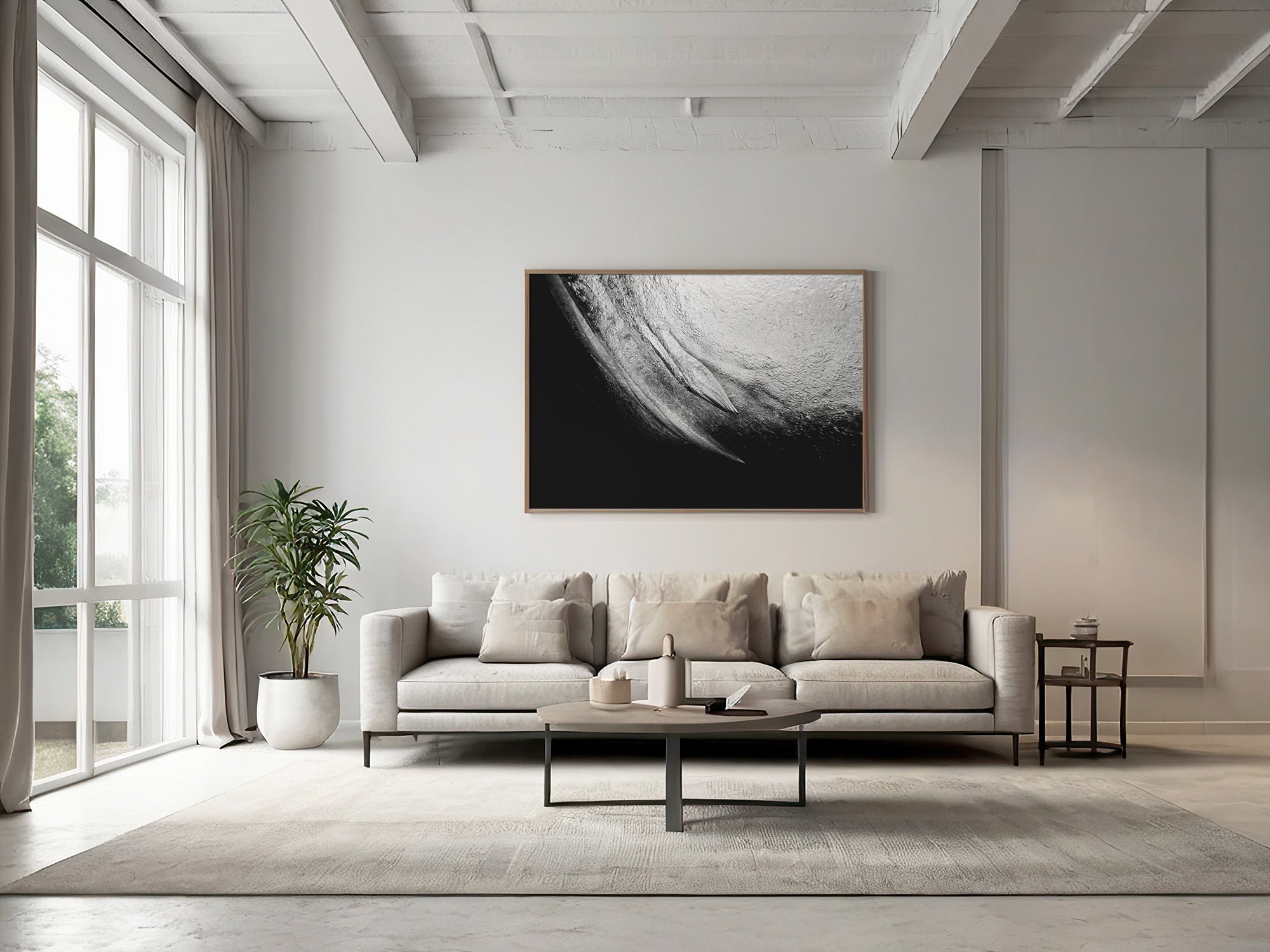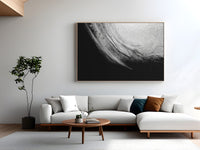 A captivating monochromatic perspective from beneath the waves in the Mediterranean Sea. This underwater view captures the raw, textured underbelly of a surf wave, frozen in motion, with intricate details of bubbles and ripples sculpted by natural forces. The stark contrast between the wave's illuminated textures and the abyssal darkness of the ocean below creates a dramatic and surreal aesthetic. This moment reveals the unseen elegance of the ocean, offering a unique vantage point of nature's power and artistry.
