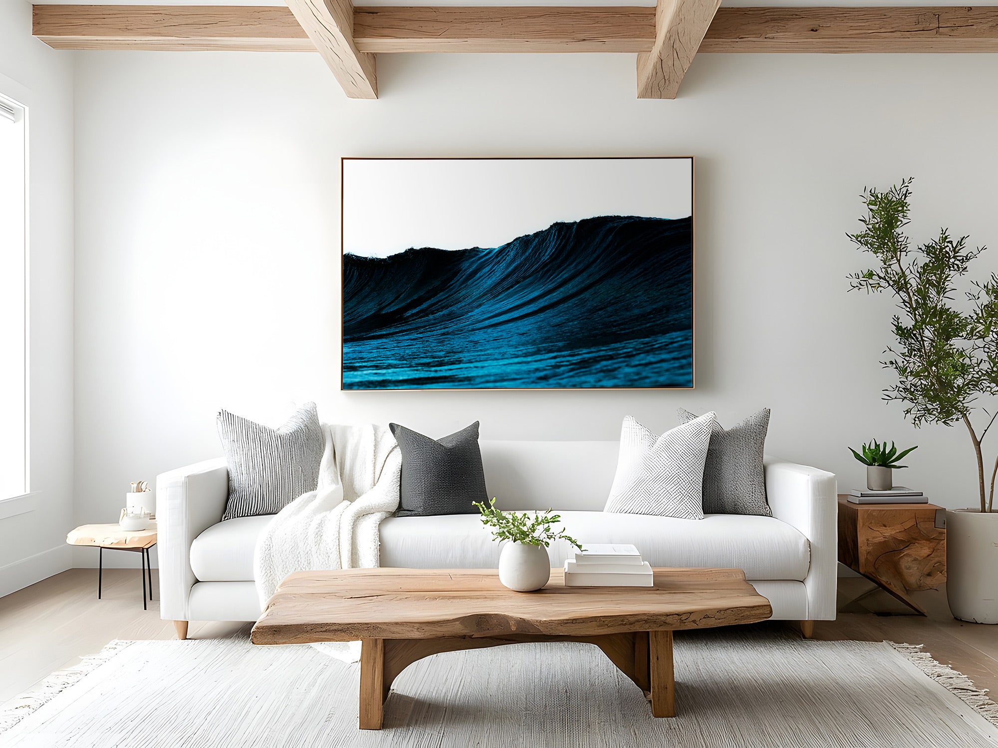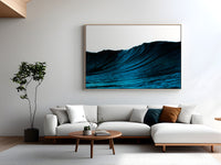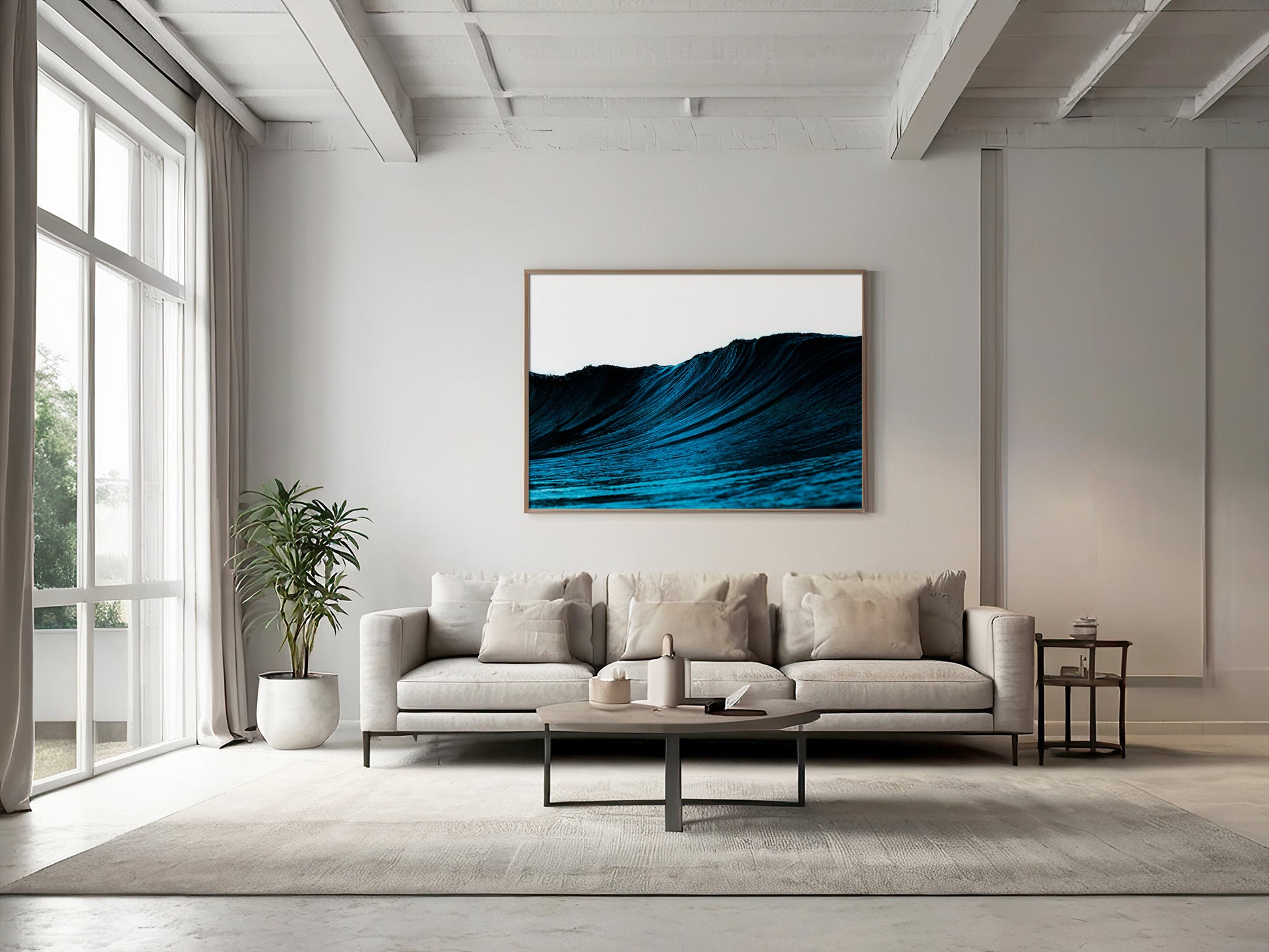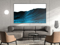 In this captivating seascape, a powerful wave captured off the coast of Menorca, Spain, rises majestically against the stark white background of the sky. The wave's surface is a rich, deep blue, its textured curves and contours accentuated by the low lighting, which adds a dramatic contrast to the image. The scene captures the untamed energy of the Mediterranean Sea, with the wave seemingly frozen in motion as it crests. The simplicity of the composition, with the wave set against a blank sky, emphasizes the form and intensity of the water, celebrating the raw beauty and dynamism of the ocean.