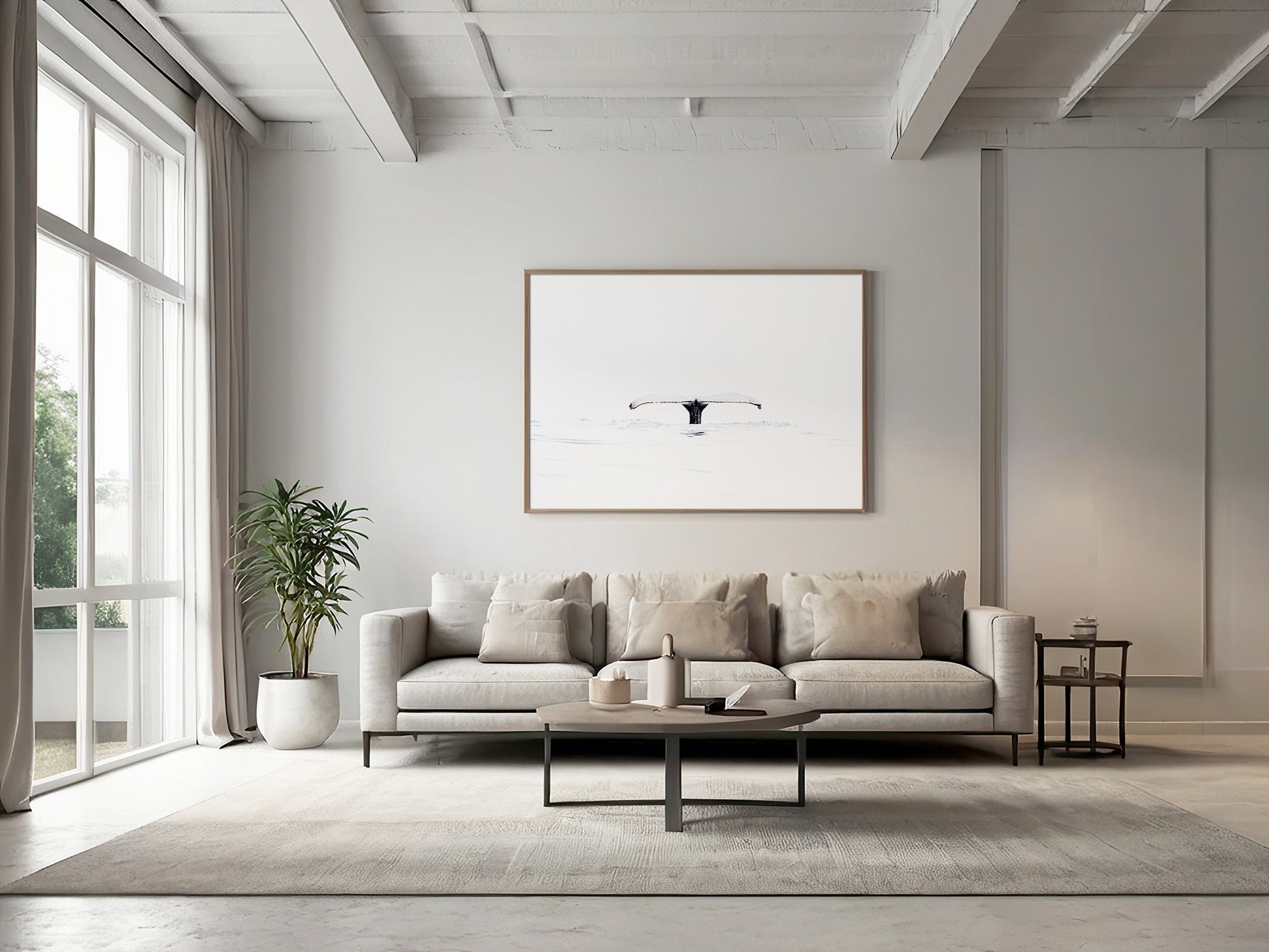 The whale’s tail, dark and textured, is highlighted by a thin outline where water drips from its edges, enhancing the sense of movement and life. The stark contrast between the black of the tail and the soft whites of the water and sky adds a sense of calm, drawing the viewer’s eye directly to the subject.