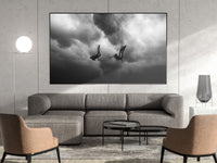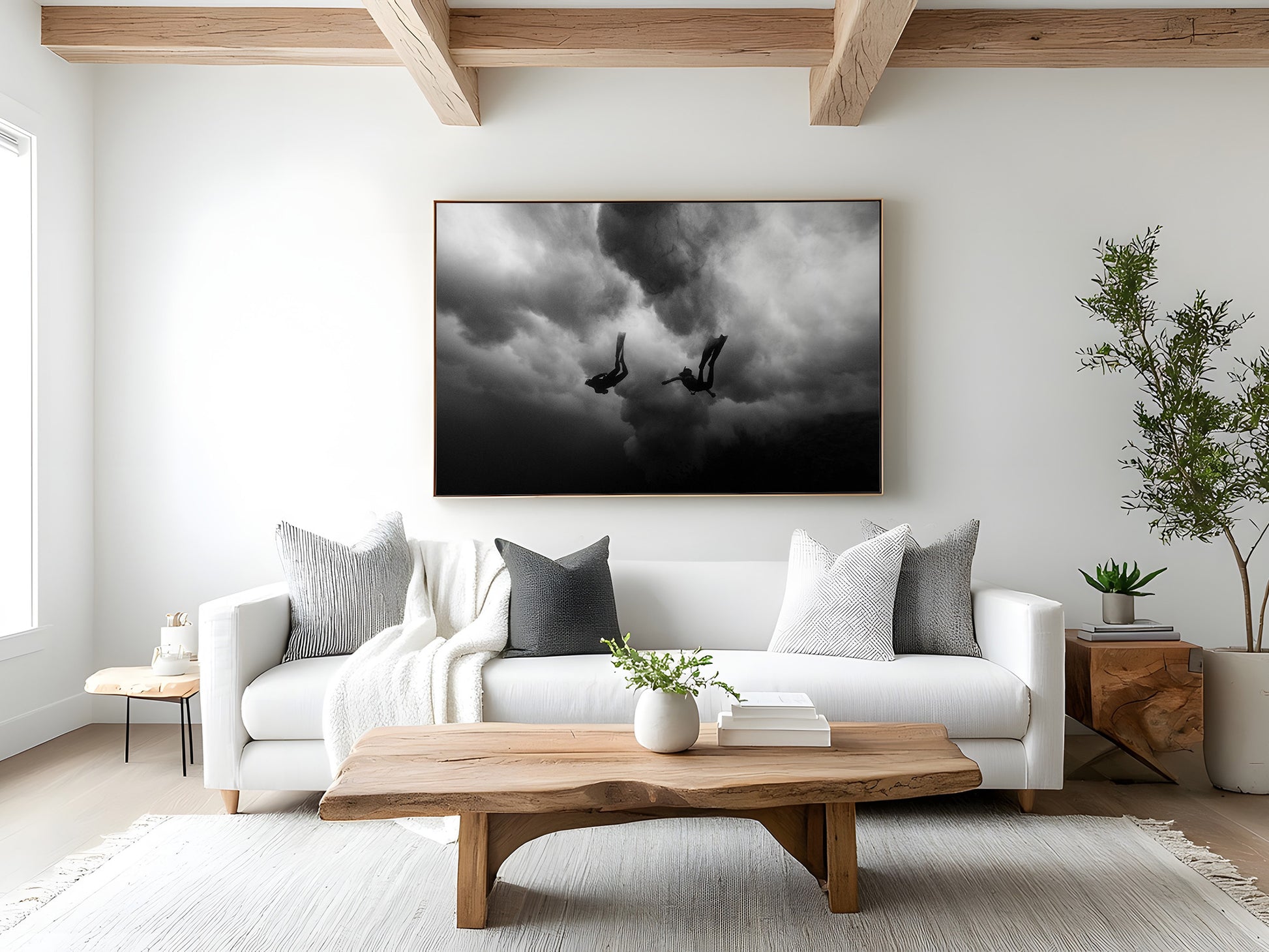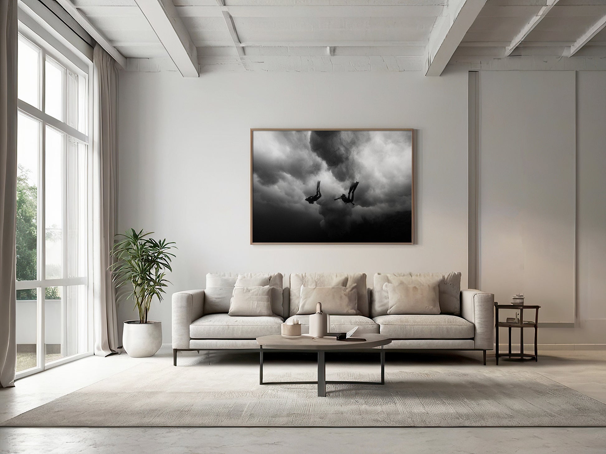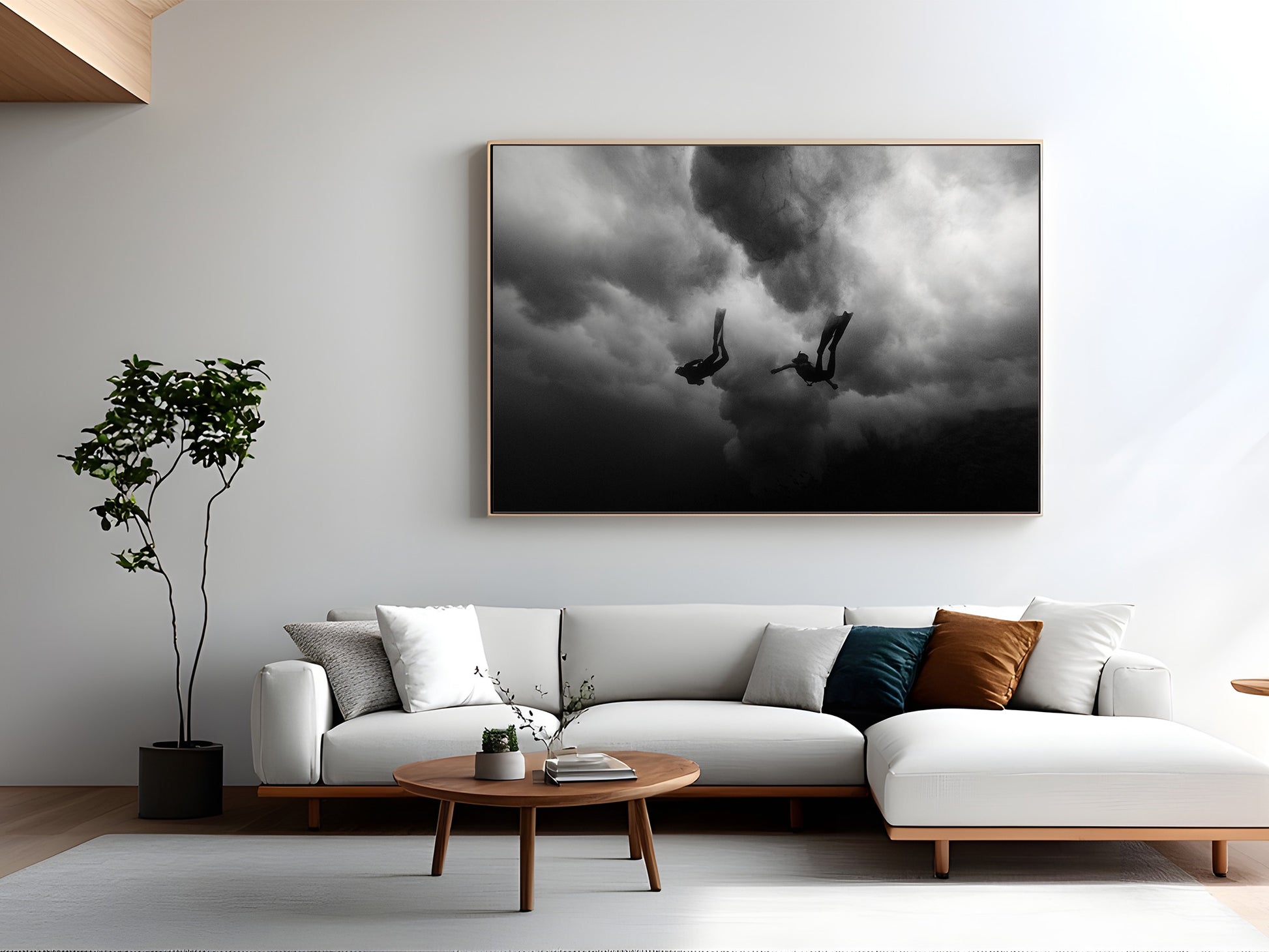 Two freedivers glide gracefully beneath the tumultuous surface of the Mediterranean Sea, their silhouettes framed by the swirling chaos of underwater turbulence. This striking black-and-white image, captured along the rugged northern coast of Menorca, reveals the raw power of the ocean colliding with steep cliffs. The interplay of shadow and light, along with the dramatic cloud-like waves, creates an ethereal and timeless underwater scene.