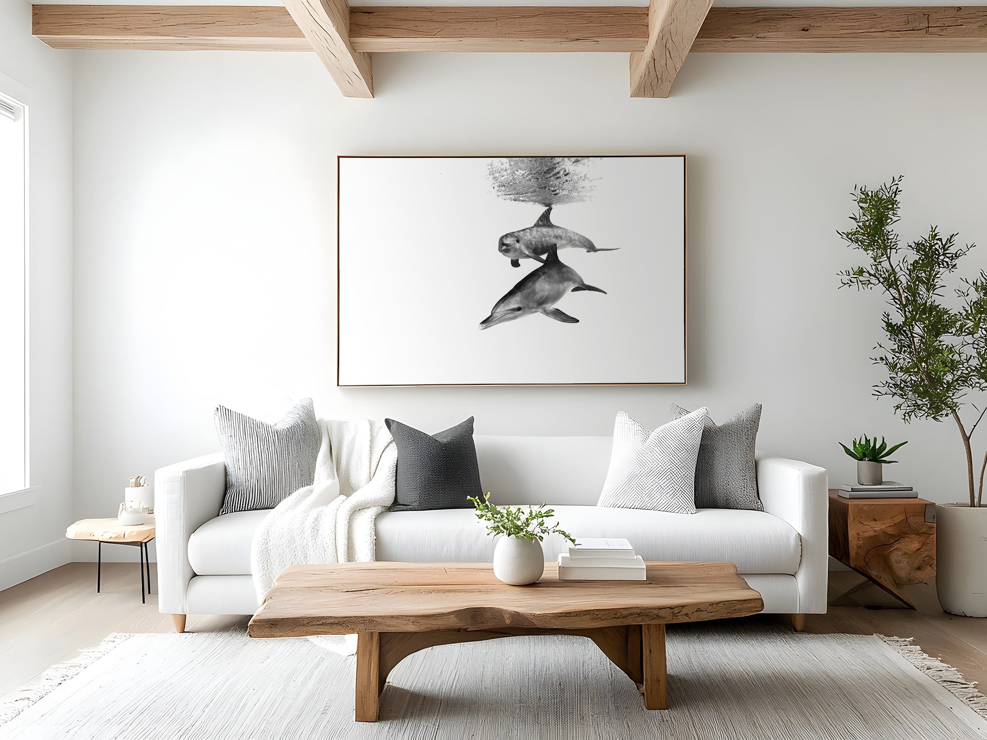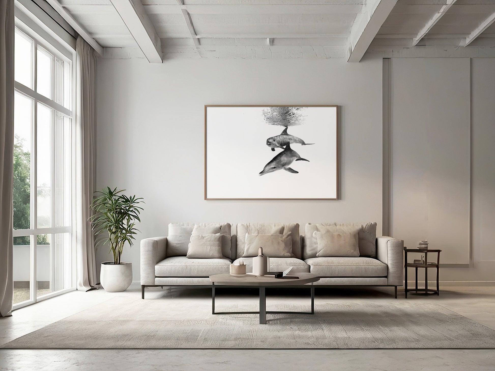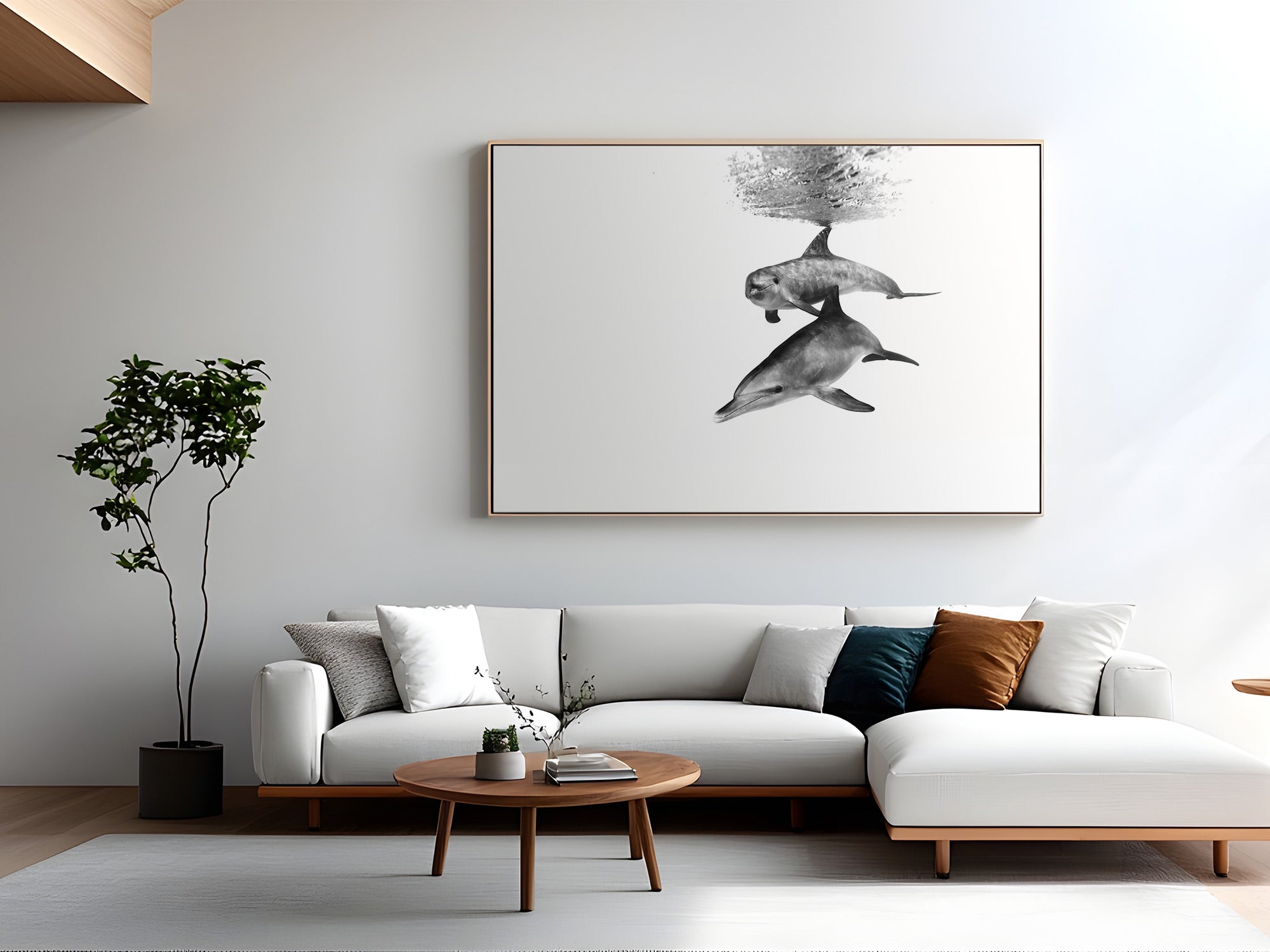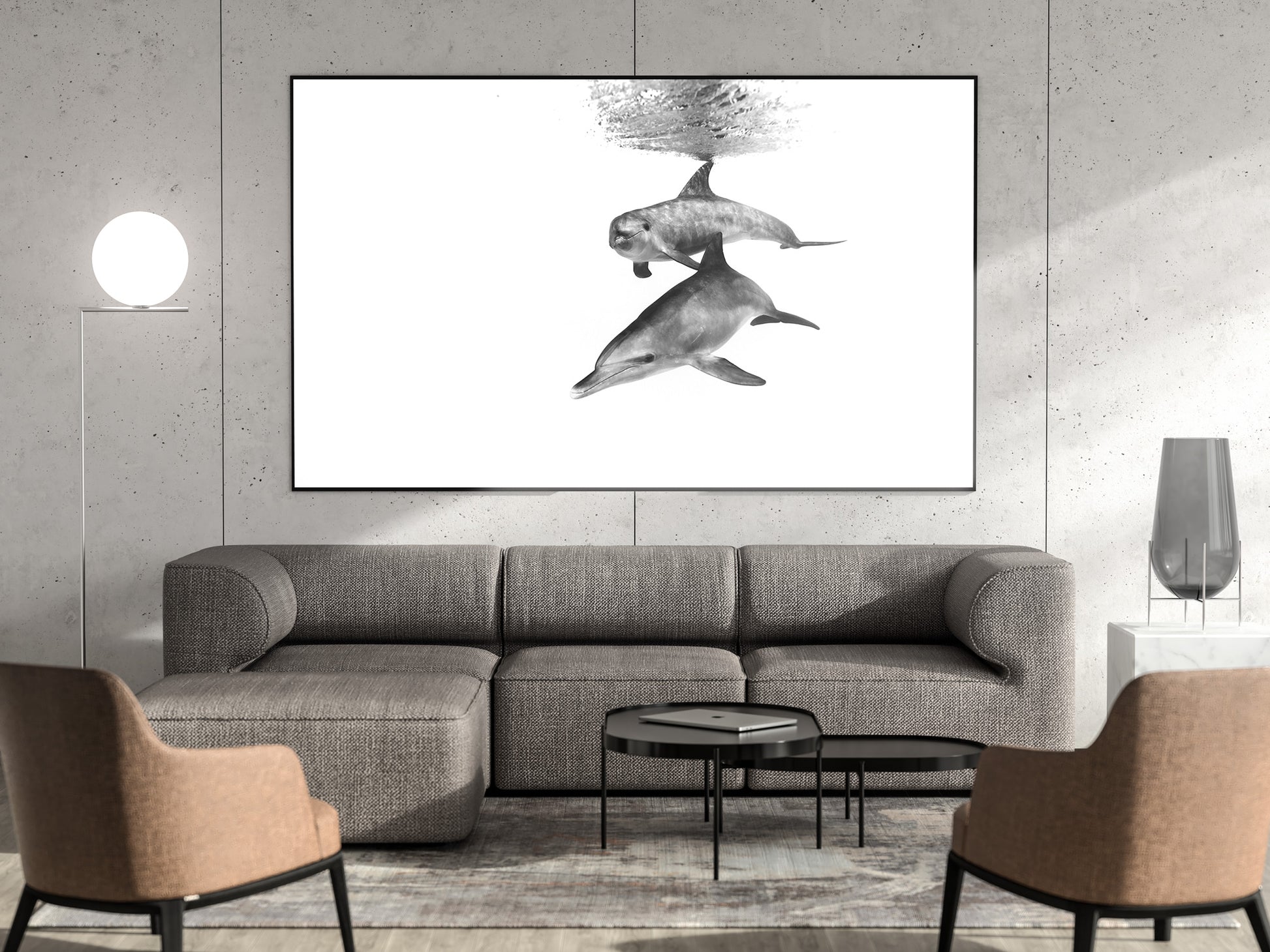 This elegant underwater photograph captures two bottlenose dolphins swimming side by side in the clear waters of the Red Sea. The dolphins, illuminated by soft natural light, exude a sense of harmony and companionship. Their streamlined bodies are beautifully detailed, with subtle textures and reflections revealing their sleek form. Above them, the shimmering surface of the water creates an abstract interplay of light and ripples, adding depth to the composition. This image, taken during a freedive, portrays the serene beauty and intelligence of these marine creatures, set against the minimalism of the surrounding aquatic environment.