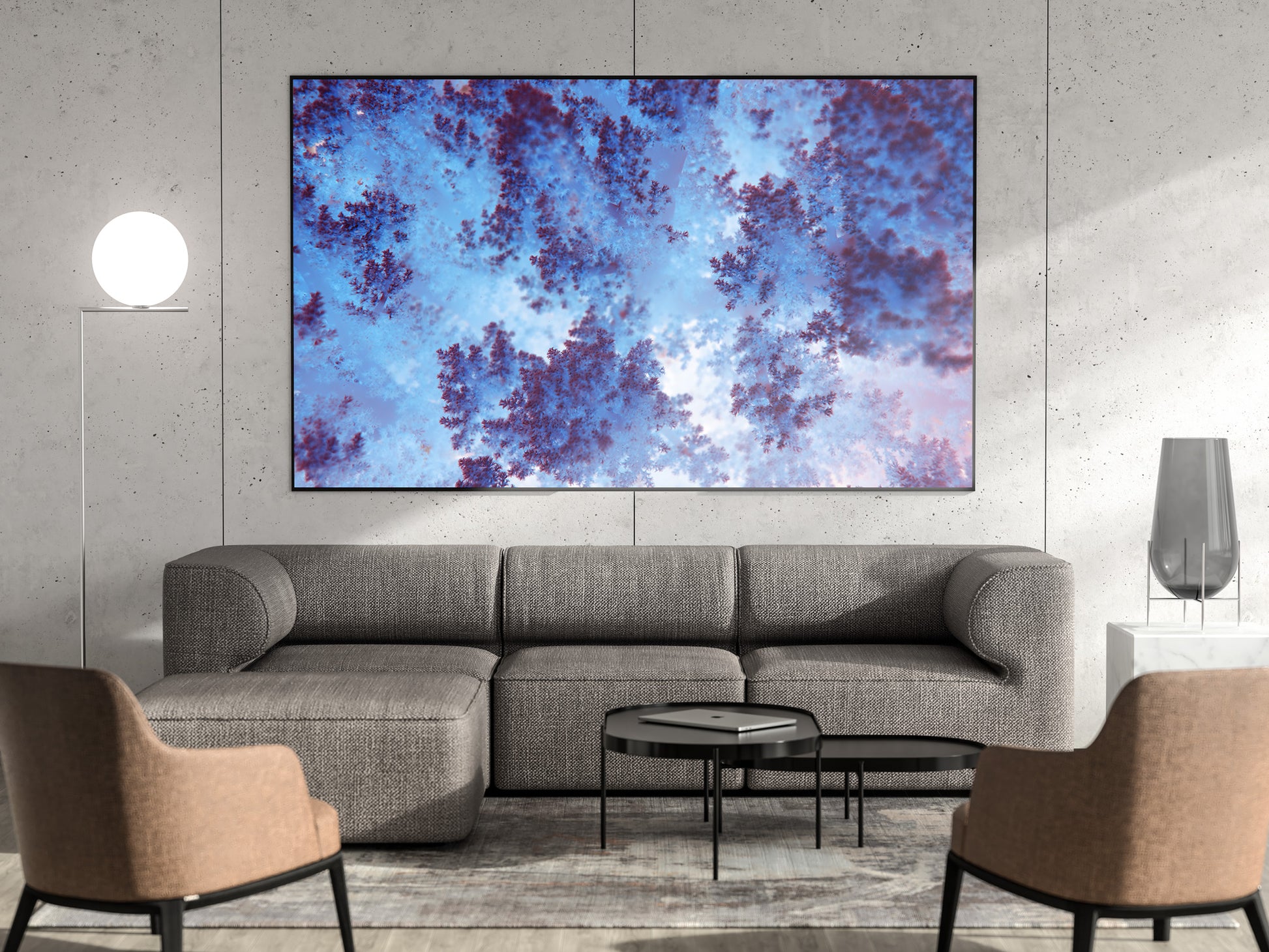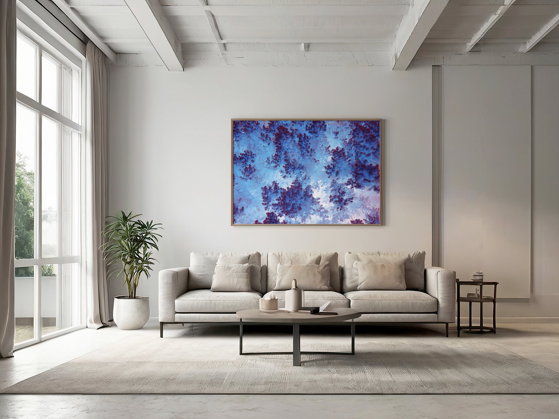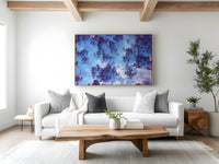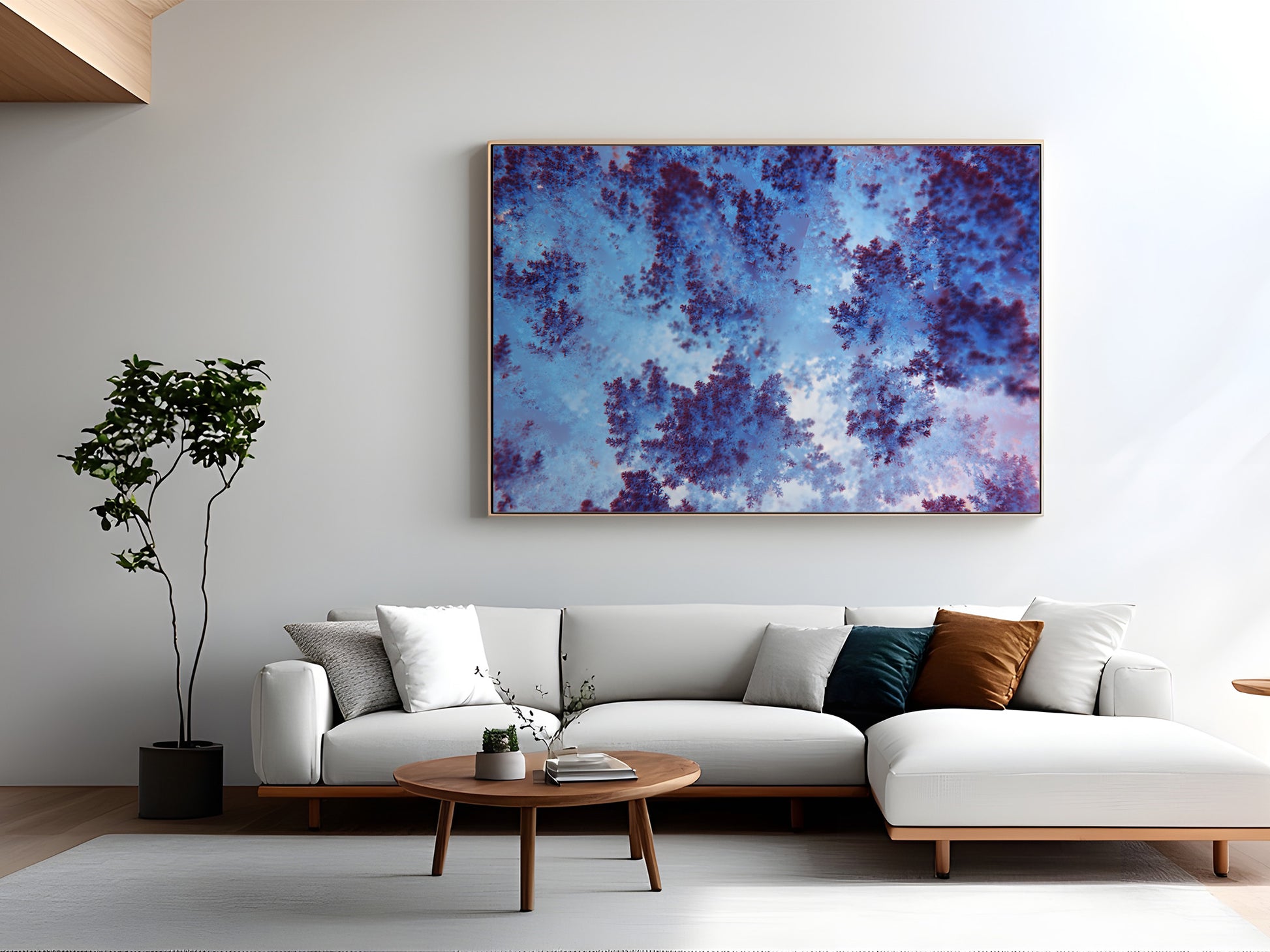 This stunning macro photograph captures the intricate beauty of soft coral in the Red Sea, offering a mesmerizing view of its fractal-like structure. The coral's delicate branches, appearing almost like natural lace, exhibit a vivid interplay of deep red and vibrant blue tones. These hues are enhanced by the soft underwater lighting, creating an ethereal ambiance that draws the viewer into the fine details of this underwater marvel. The composition highlights the coral's organic complexity, resembling a living piece of art that showcases the natural wonders hidden beneath the ocean's surface.