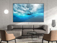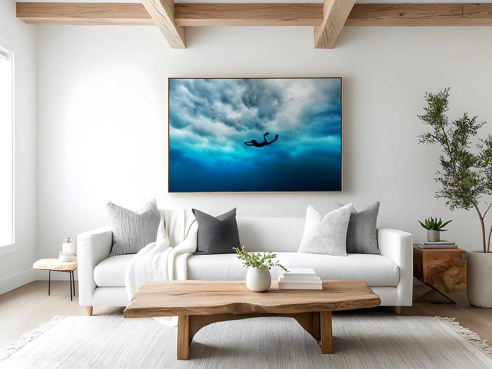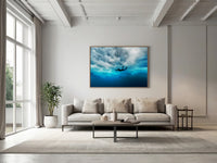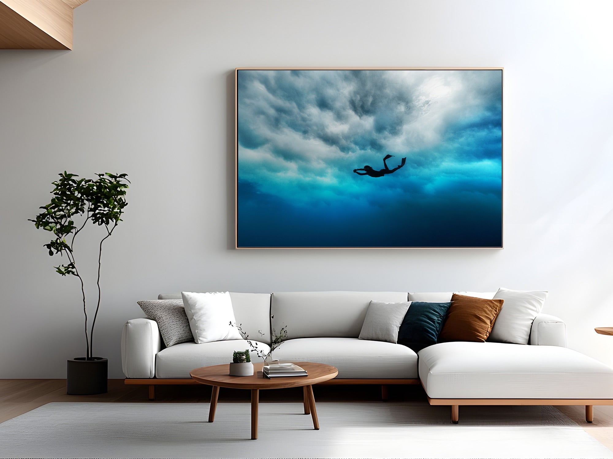 This stunning underwater photograph reveals a freediver gliding gracefully beneath turbulent waves, captured near the north shore of Menorca in the Mediterranean Sea. The image showcases the dynamic interplay of light filtering through the water, transitioning from vibrant cyan hues near the surface to deep blues as depth increases. Above, the ominous clouds and churning waves amplify the scene's drama, creating a striking contrast with the diver’s calm and poised silhouette. The diver, equipped with fins, stretches forward as if in unison with the ocean’s movement, embodying the harmony between human and nature. The vibrant tones and atmospheric elements vividly evoke the wild beauty of Menorca’s coastal waters.