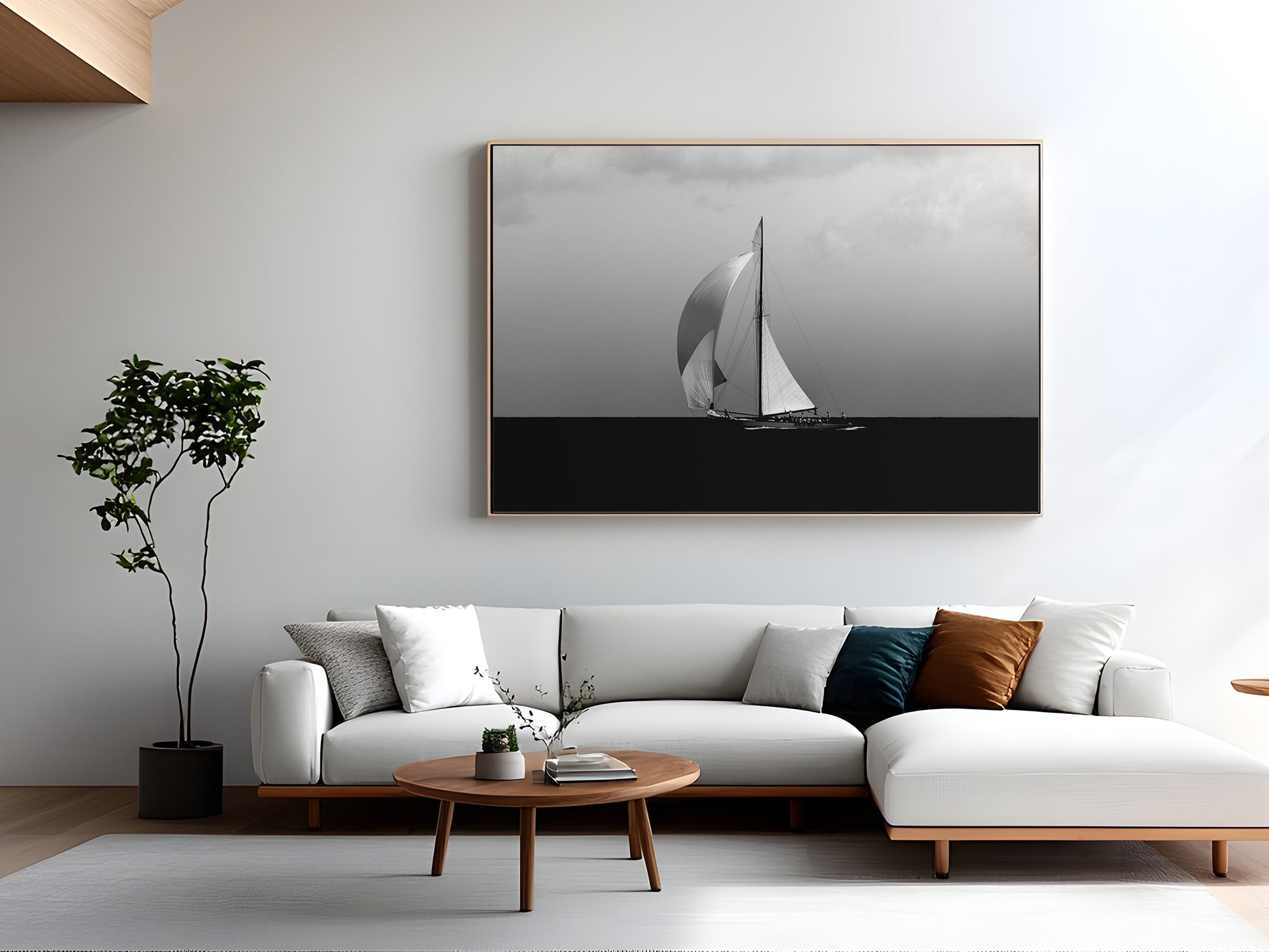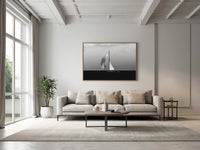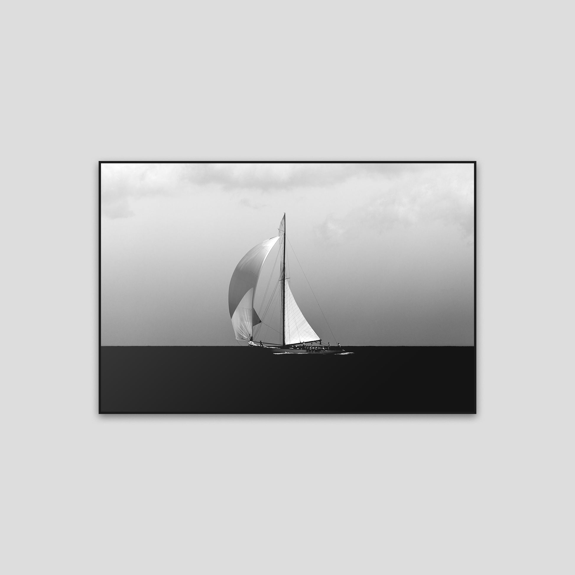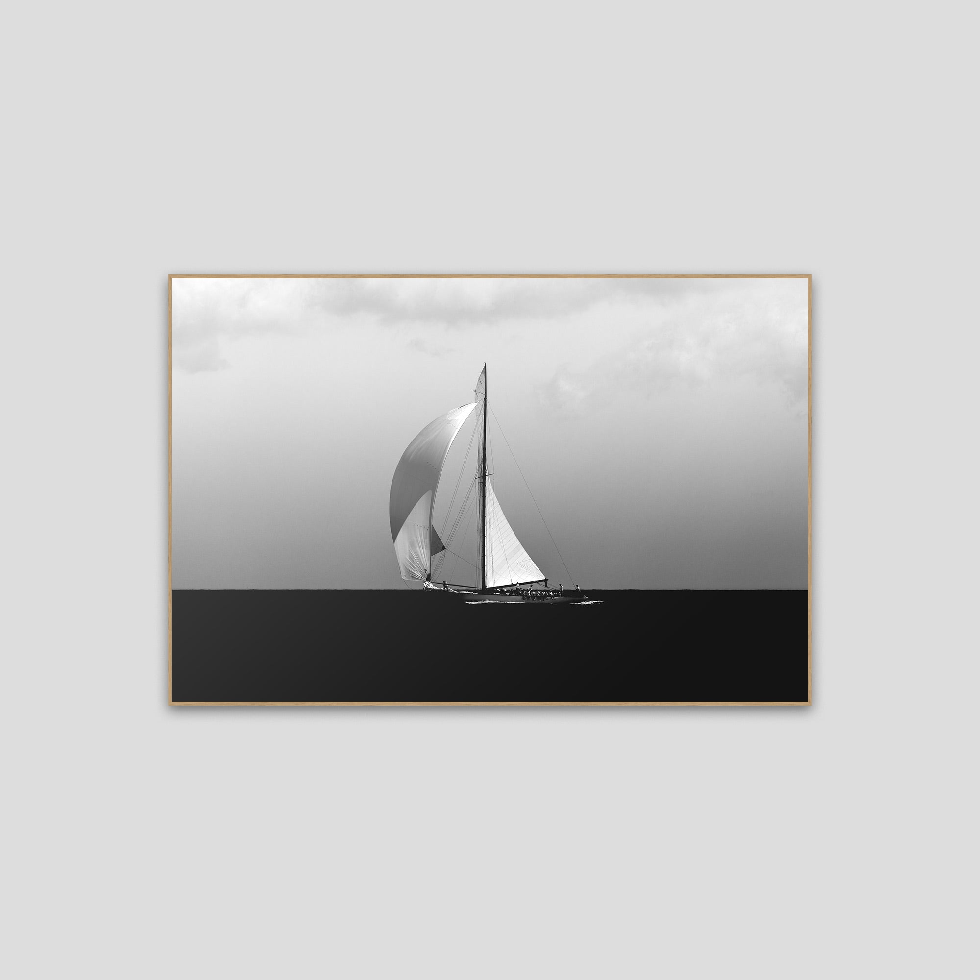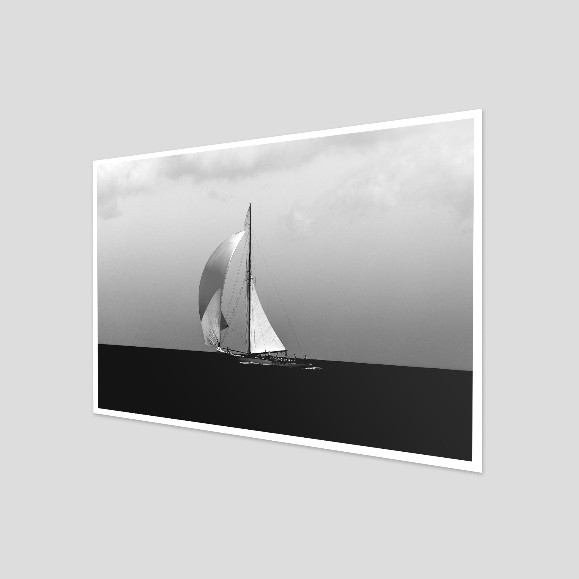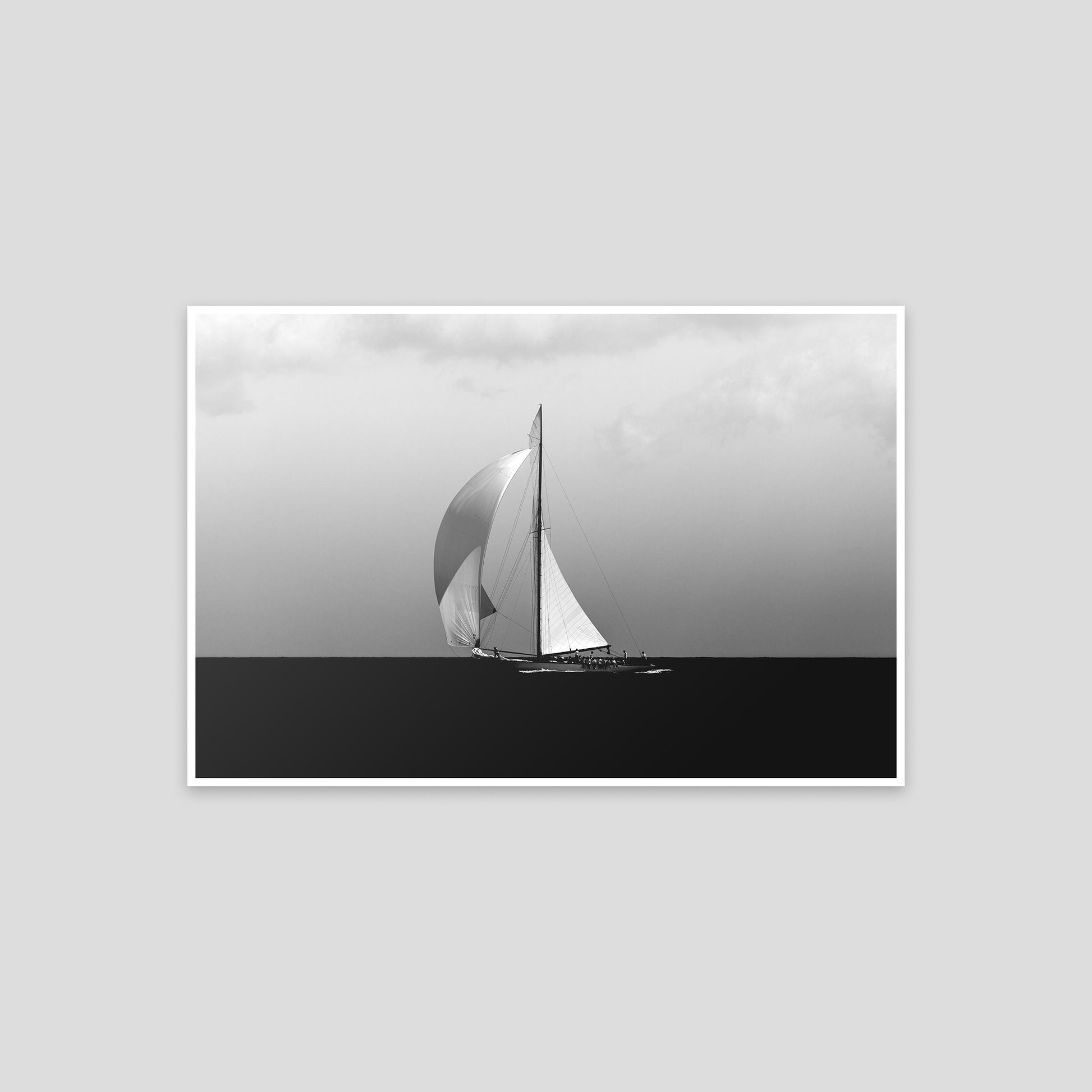 Black and white photograph captured during a classic sailing regatta off the coast of Menorca. Elegant vintage yachts glide across a calm sea, their tall sails catching the light against a softly clouded sky. The composition is minimal and balanced, with a strong horizon dividing the dark sea and the luminous sails. The absence of color enhances the timeless atmosphere, evoking grace, tradition, and the quiet power of wind and craftsmanship.