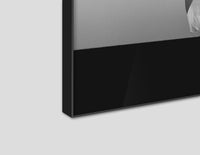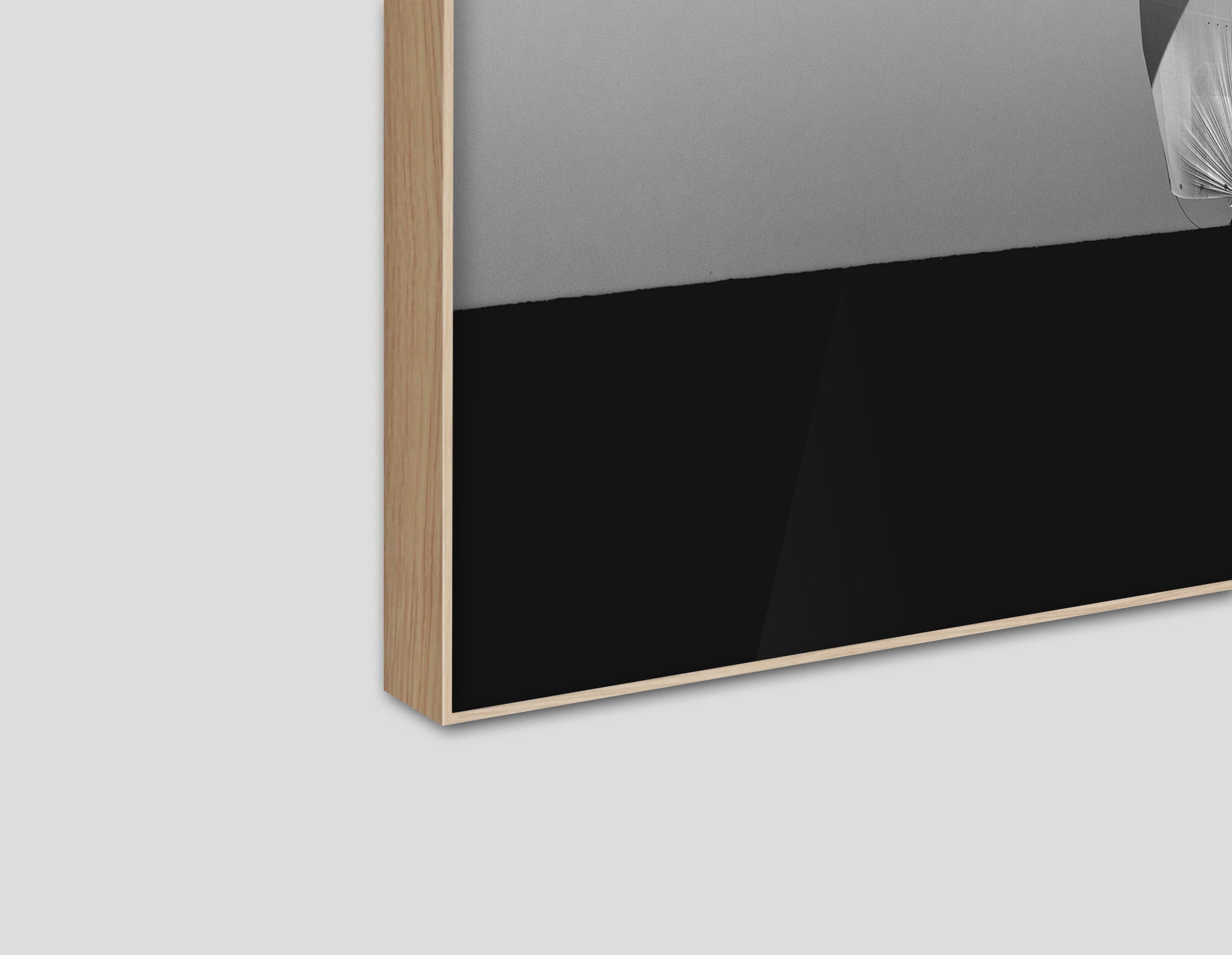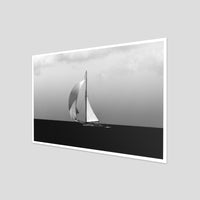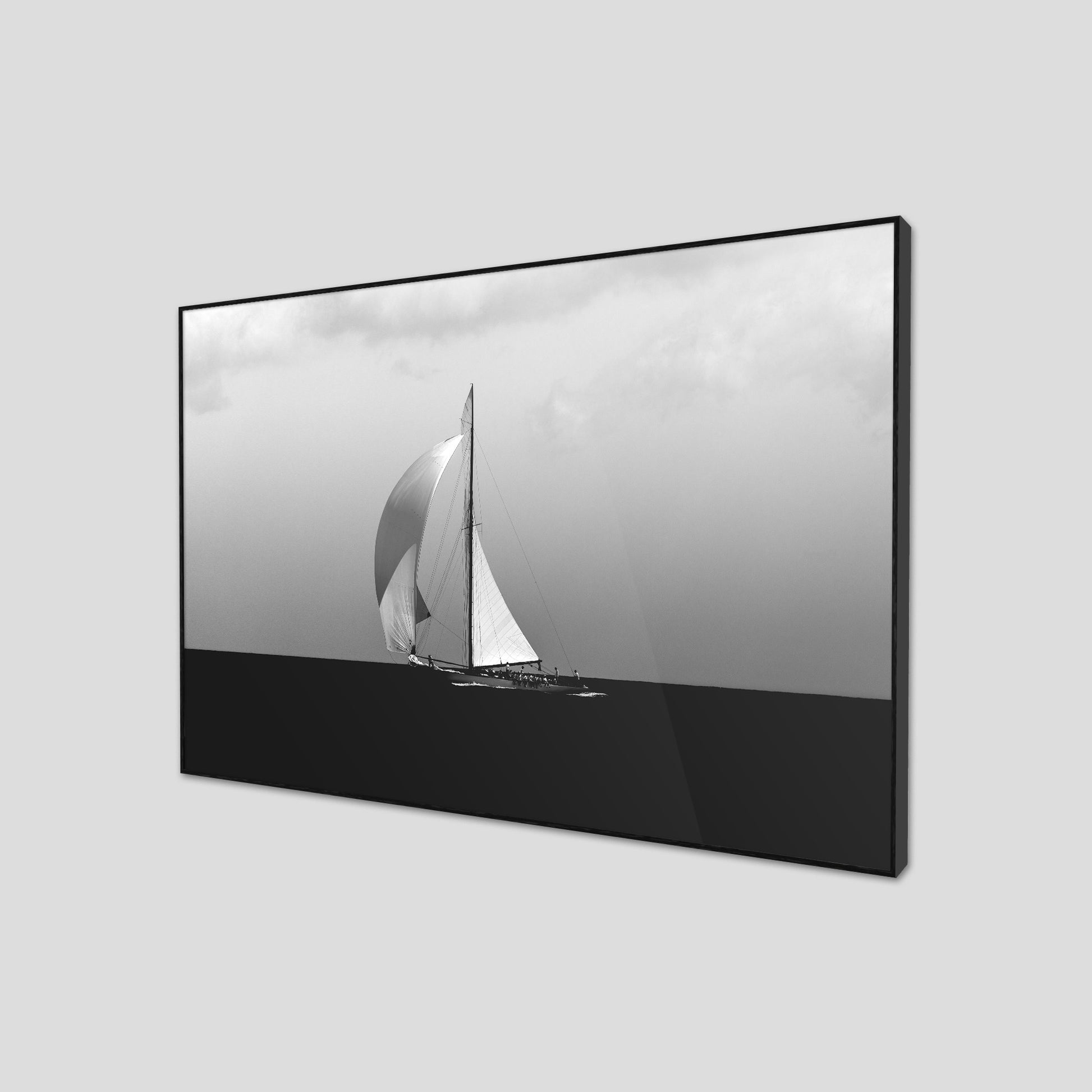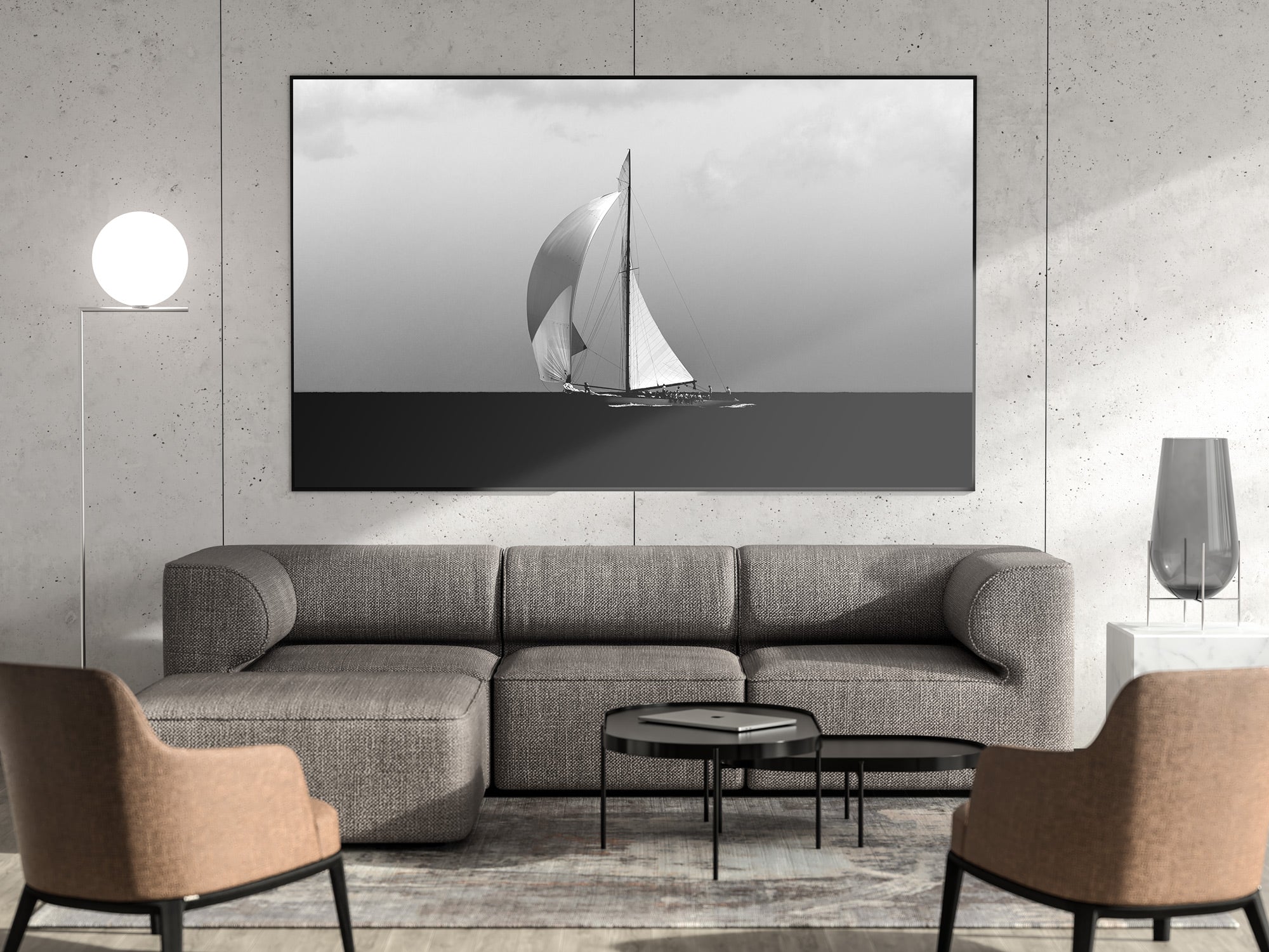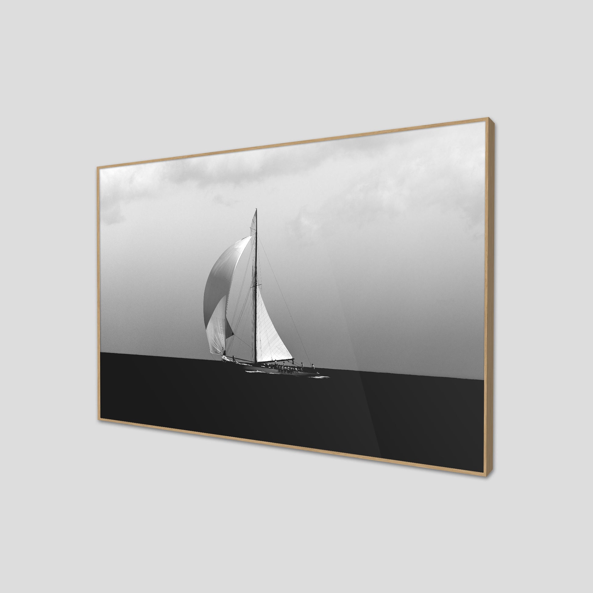 Black and white photograph captured during a classic sailing regatta off the coast of Menorca. Elegant vintage yachts glide across a calm sea, their tall sails catching the light against a softly clouded sky. The composition is minimal and balanced, with a strong horizon dividing the dark sea and the luminous sails. The absence of color enhances the timeless atmosphere, evoking grace, tradition, and the quiet power of wind and craftsmanship.