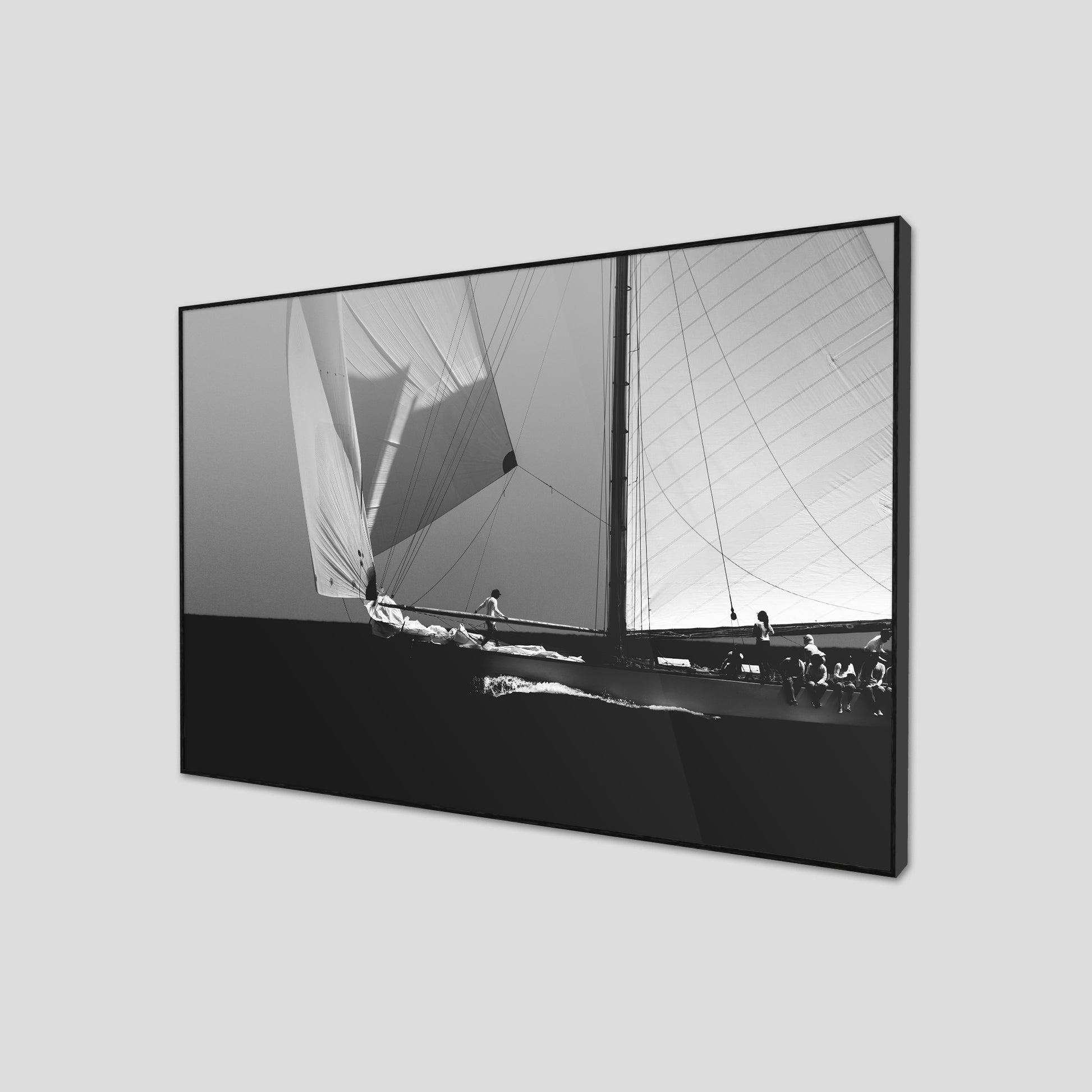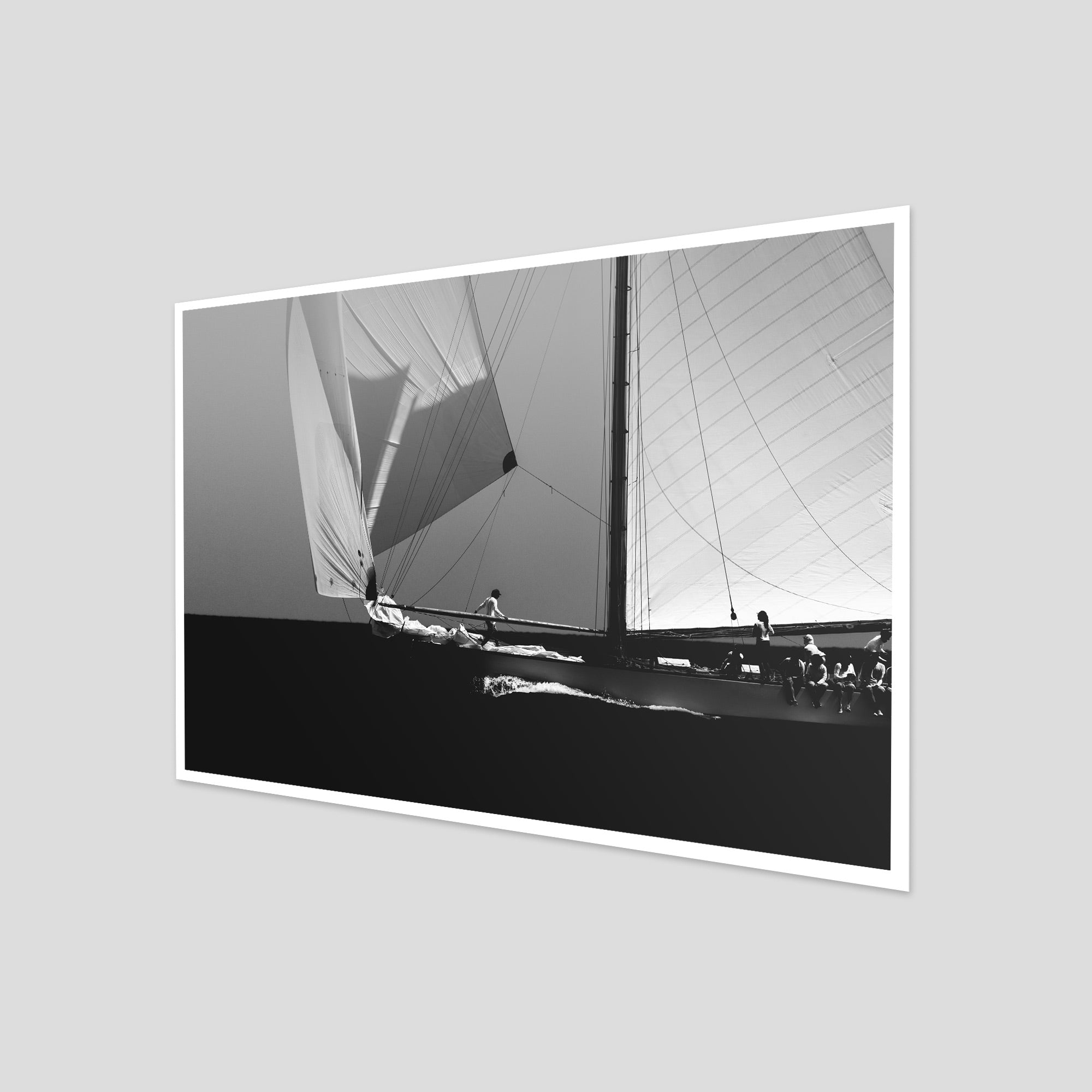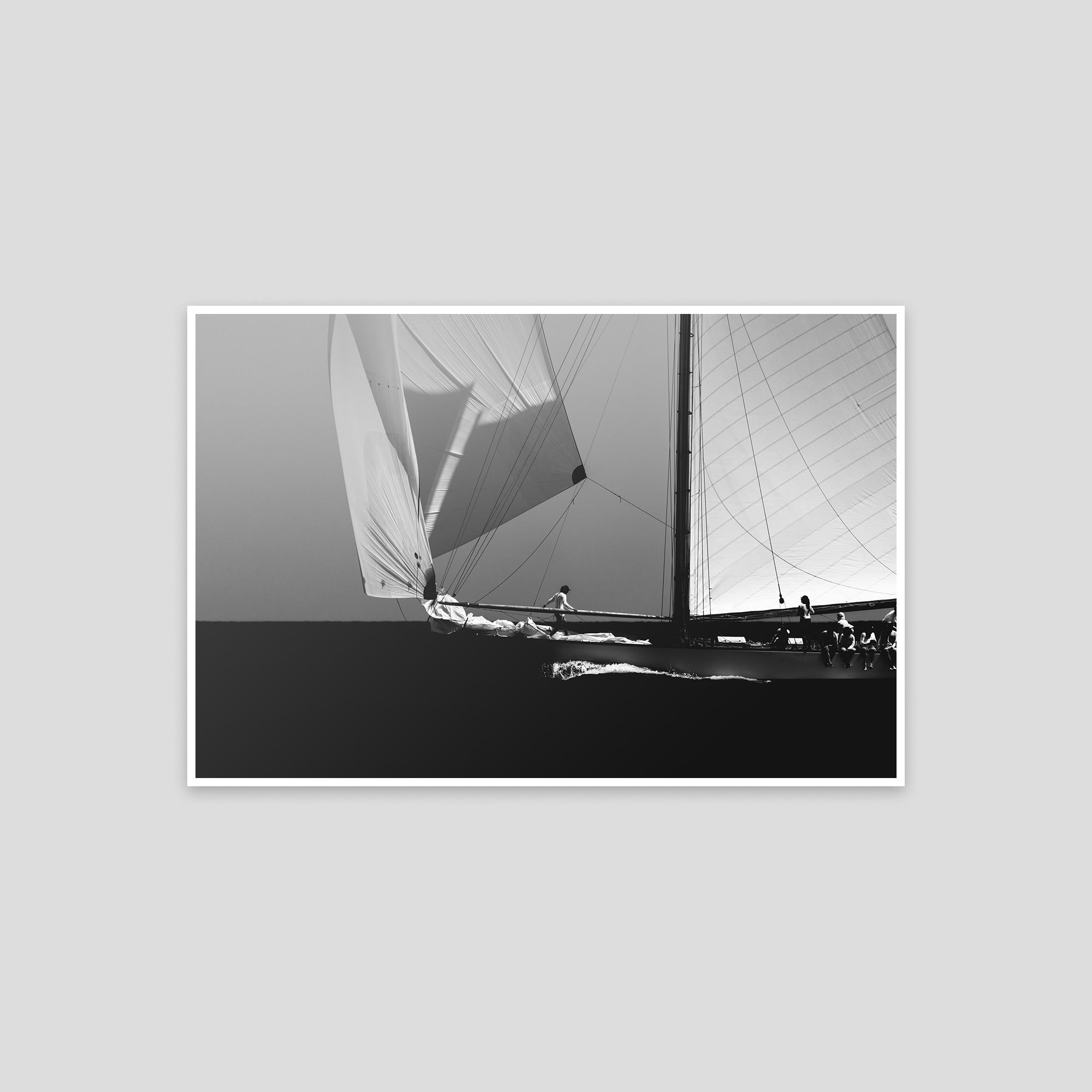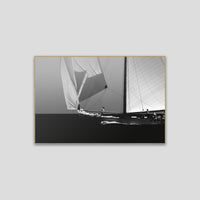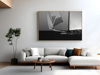 Black and white photograph captured during a classic sailing regatta off the coast of Menorca. Elegant vintage yachts glide across a calm sea, their tall sails catching the light against a softly clouded sky. The composition is minimal and balanced, with a strong horizon dividing the dark sea and the luminous sails. The absence of color enhances the timeless atmosphere, evoking grace, tradition, and the quiet power of wind and craftsmanship.