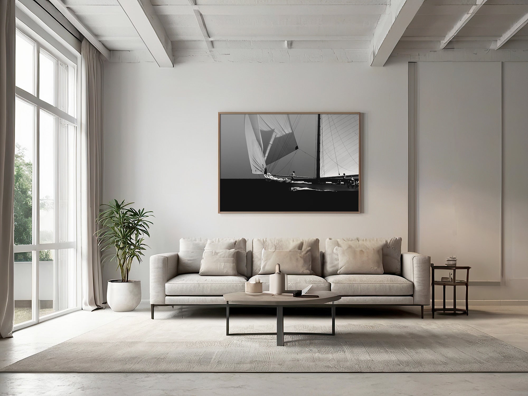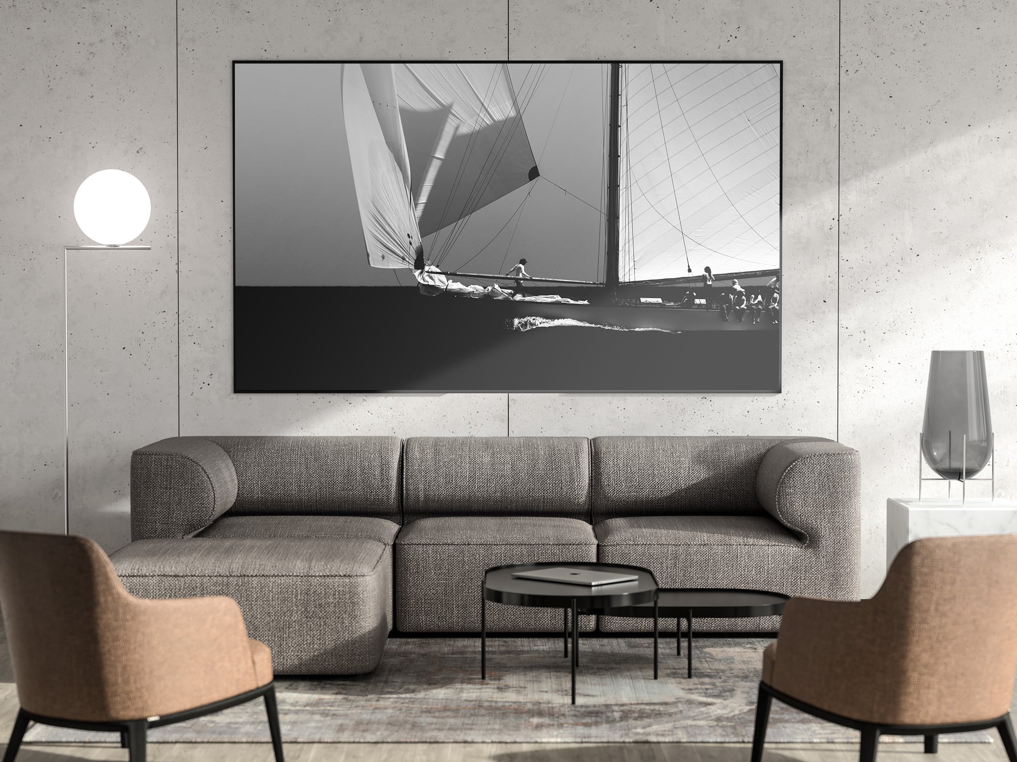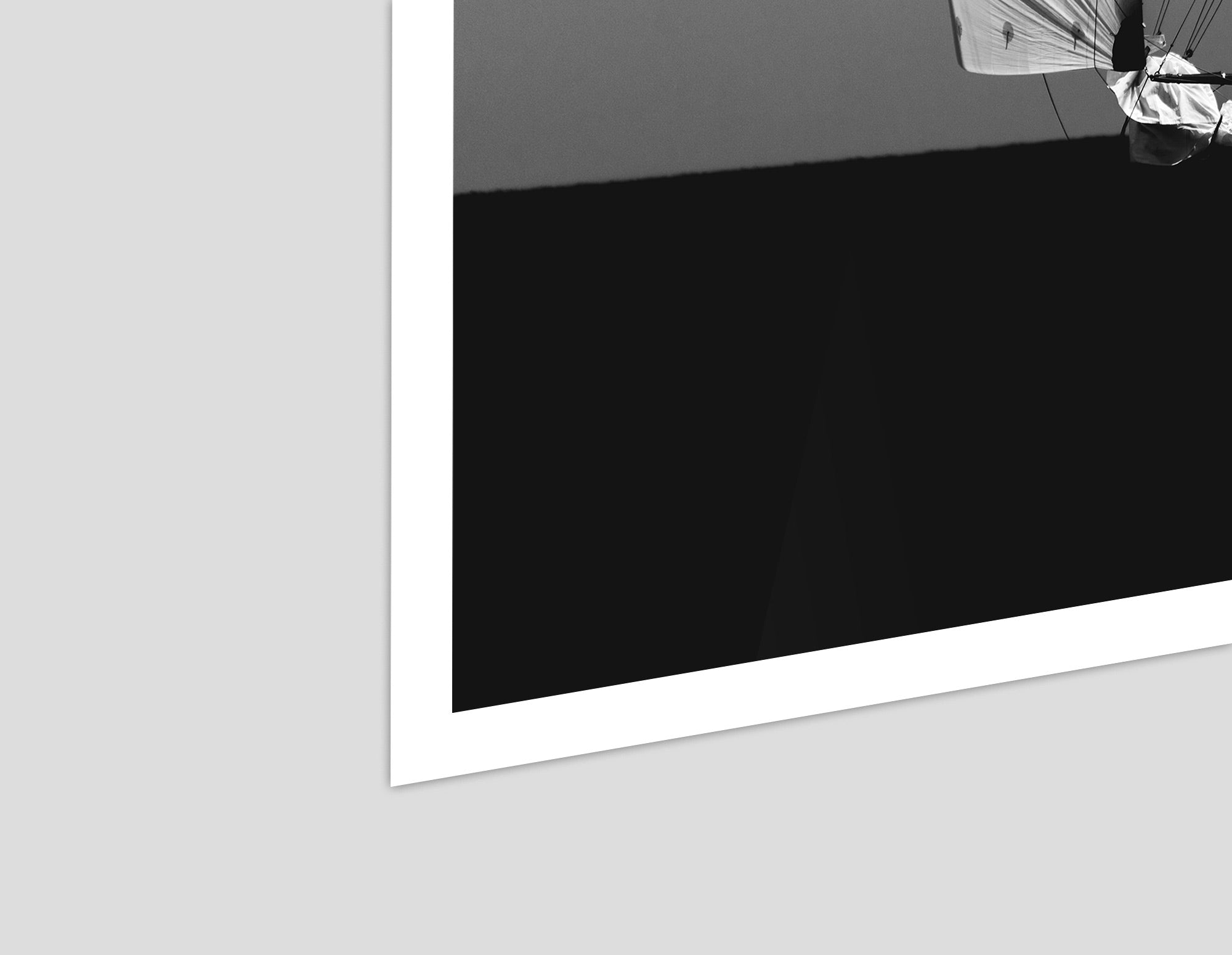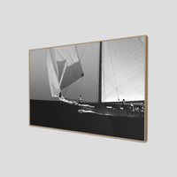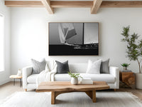 Black and white photograph captured during a classic sailing regatta off the coast of Menorca. Elegant vintage yachts glide across a calm sea, their tall sails catching the light against a softly clouded sky. The composition is minimal and balanced, with a strong horizon dividing the dark sea and the luminous sails. The absence of color enhances the timeless atmosphere, evoking grace, tradition, and the quiet power of wind and craftsmanship.