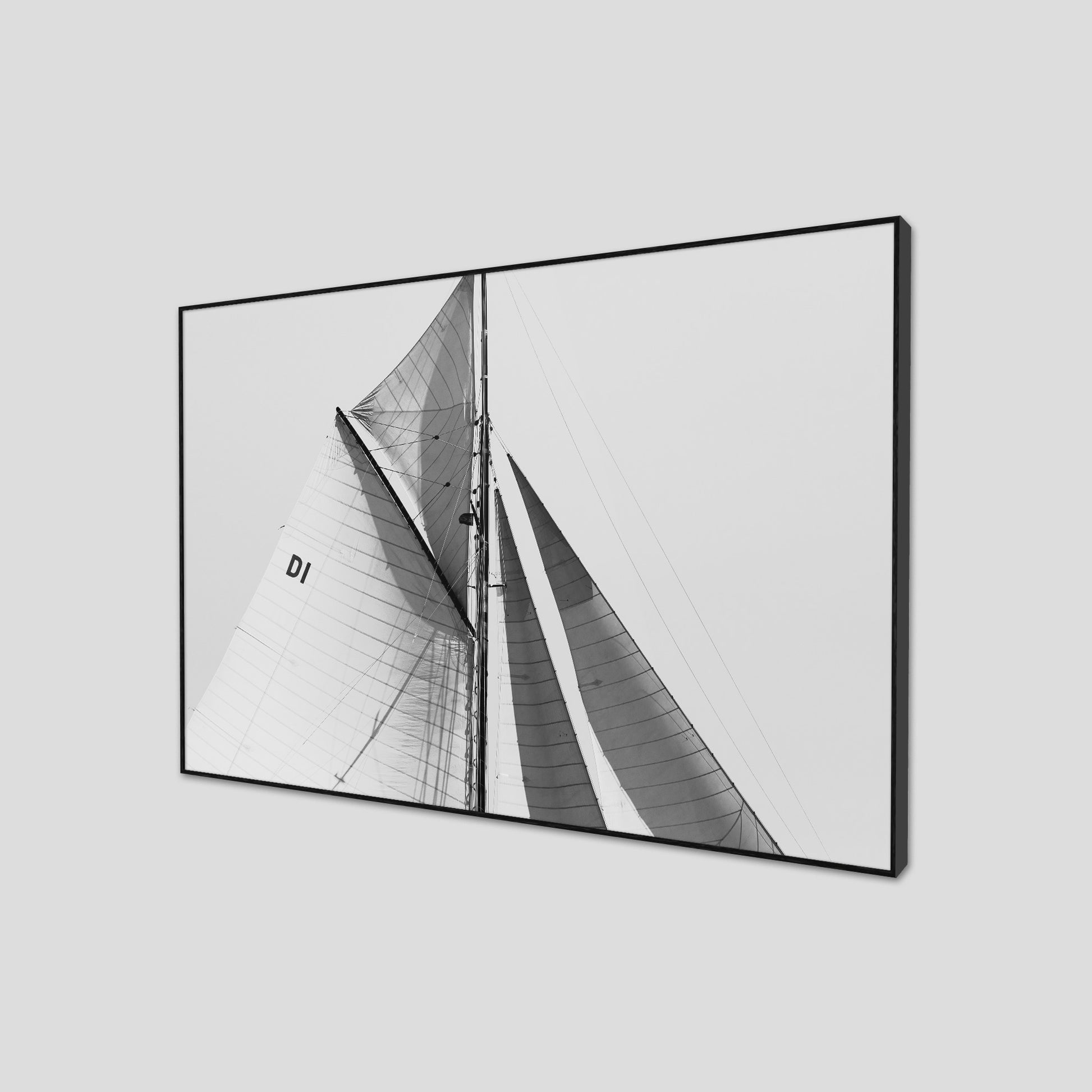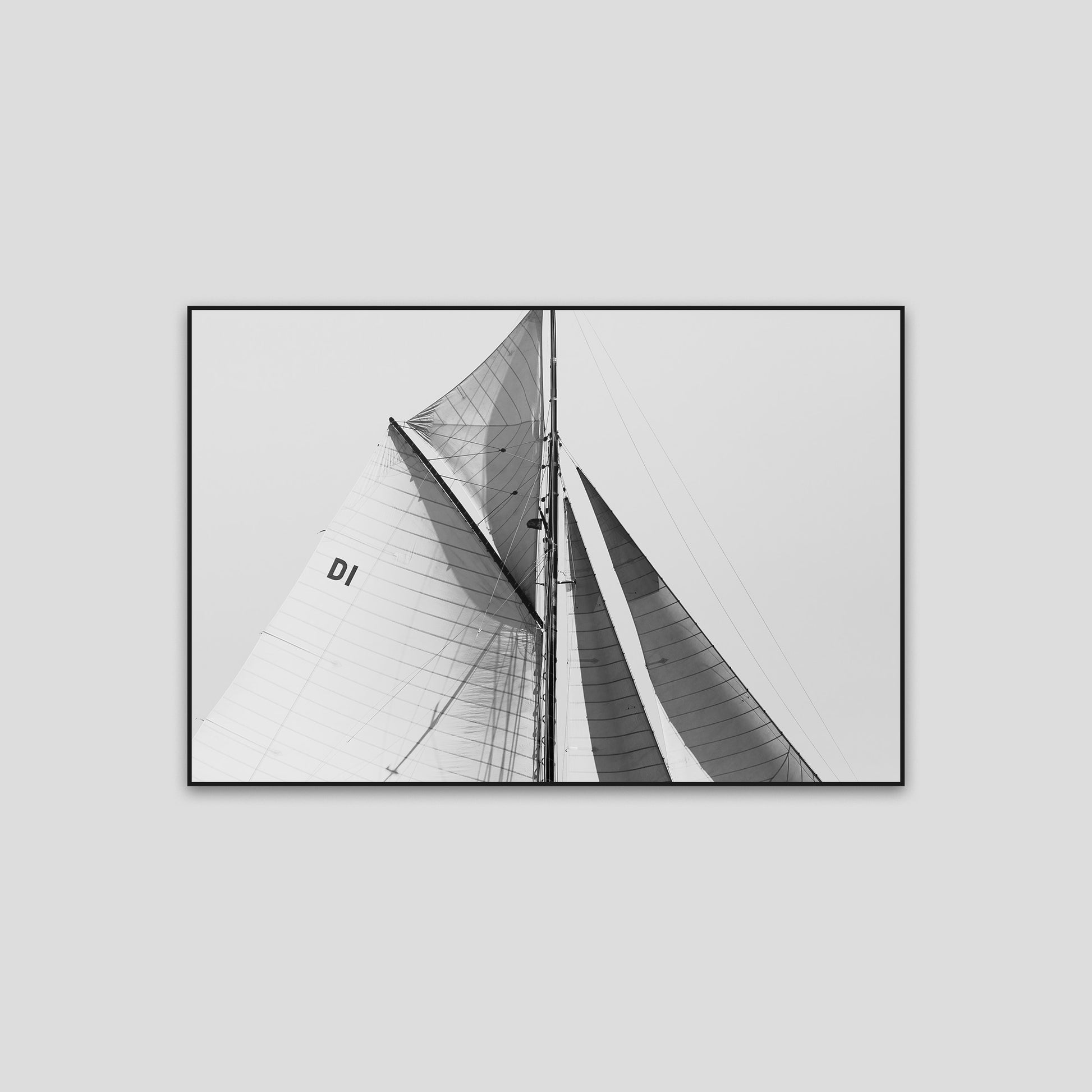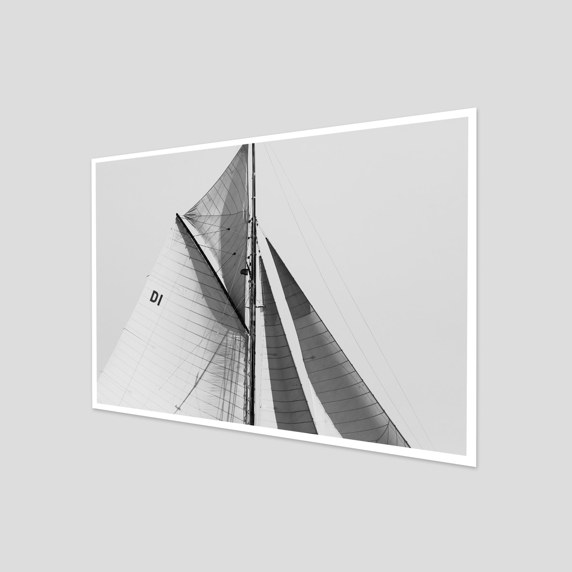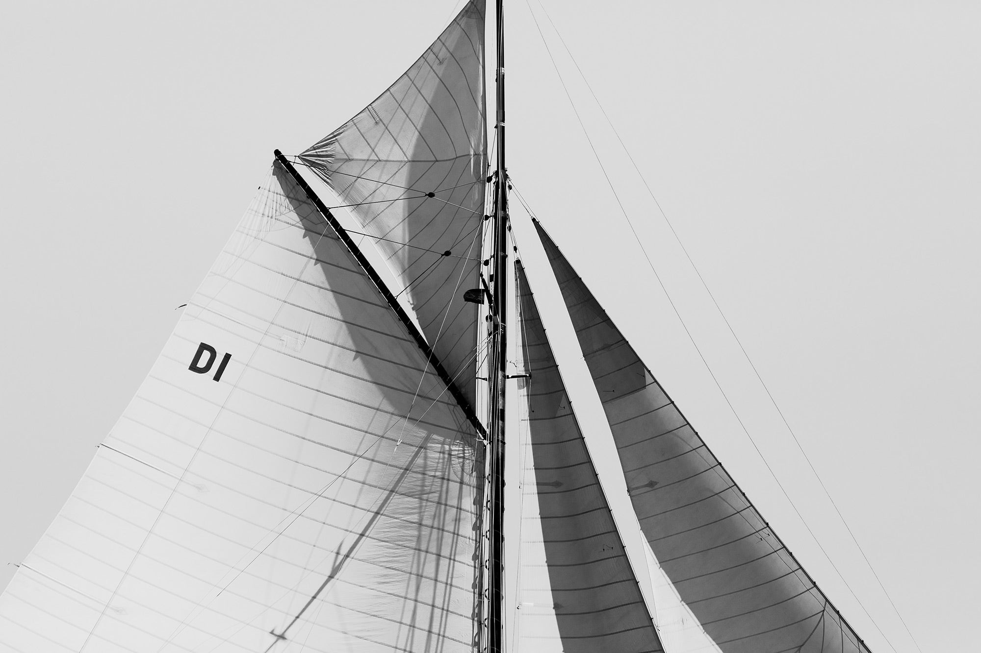 Black and white photograph captured during a classic sailing regatta off the coast of Menorca. Elegant vintage yachts glide across a calm sea, their tall sails catching the light against a softly clouded sky. The composition is minimal and balanced, with a strong horizon dividing the dark sea and the luminous sails. The absence of color enhances the timeless atmosphere, evoking grace, tradition, and the quiet power of wind and craftsmanship.