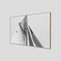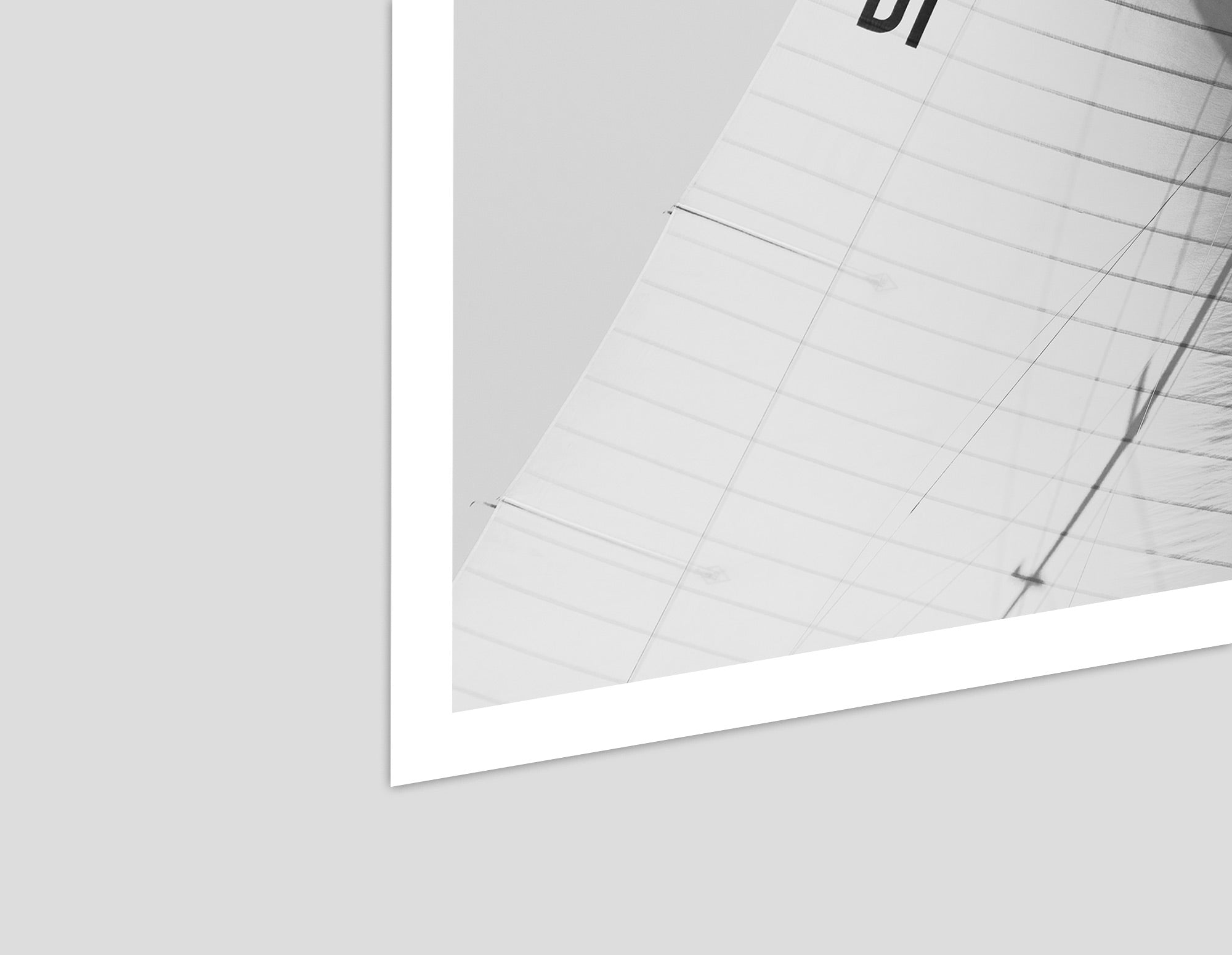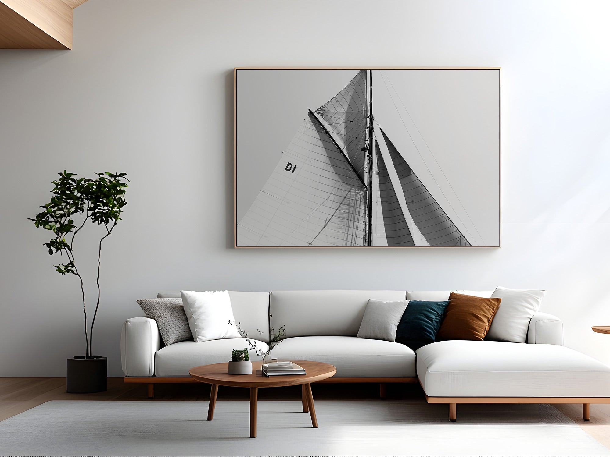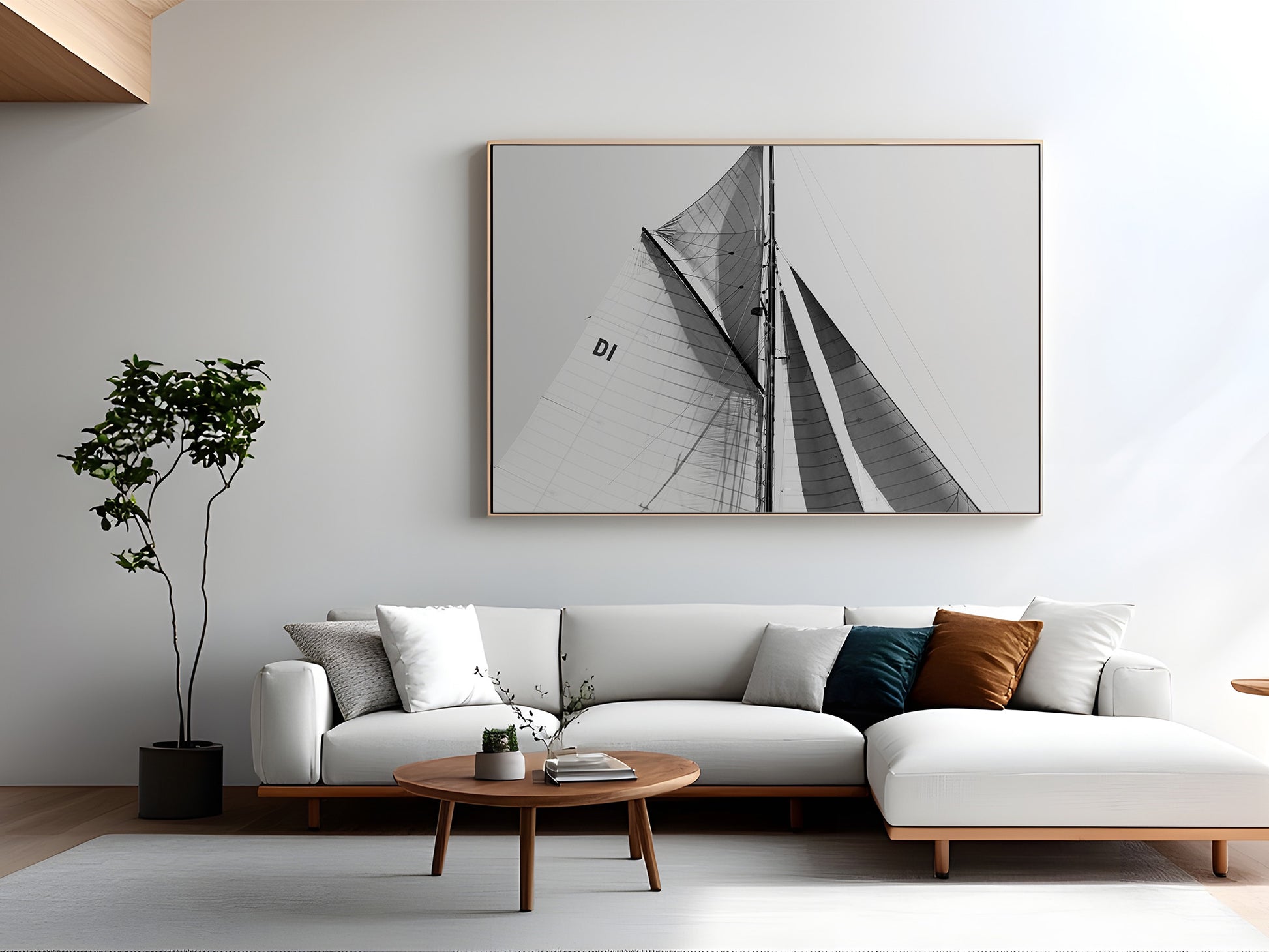 Black and white photograph captured during a classic sailing regatta off the coast of Menorca. Elegant vintage yachts glide across a calm sea, their tall sails catching the light against a softly clouded sky. The composition is minimal and balanced, with a strong horizon dividing the dark sea and the luminous sails. The absence of color enhances the timeless atmosphere, evoking grace, tradition, and the quiet power of wind and craftsmanship.