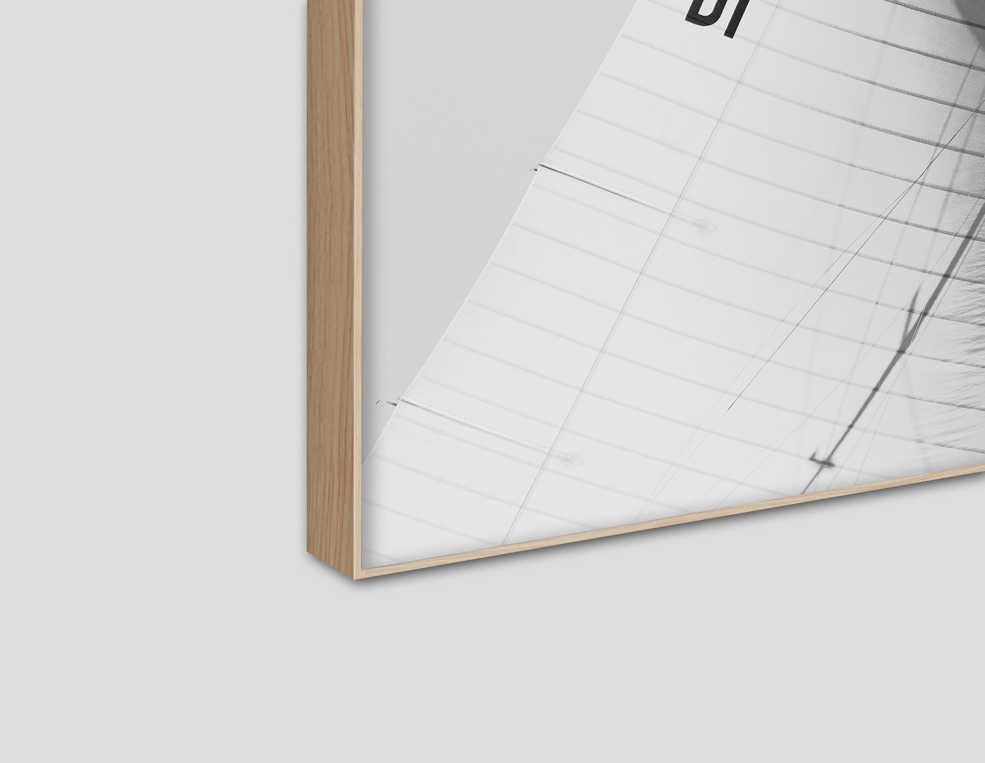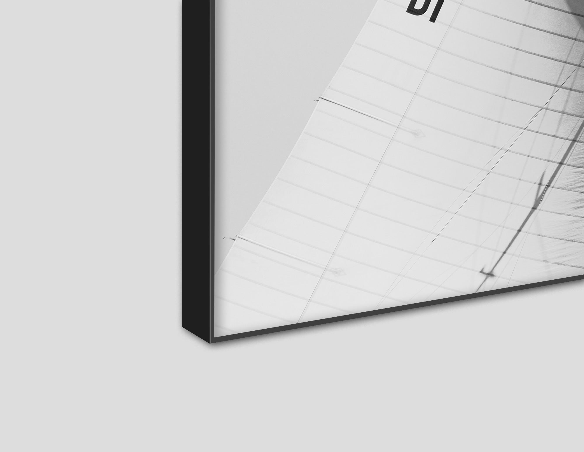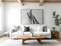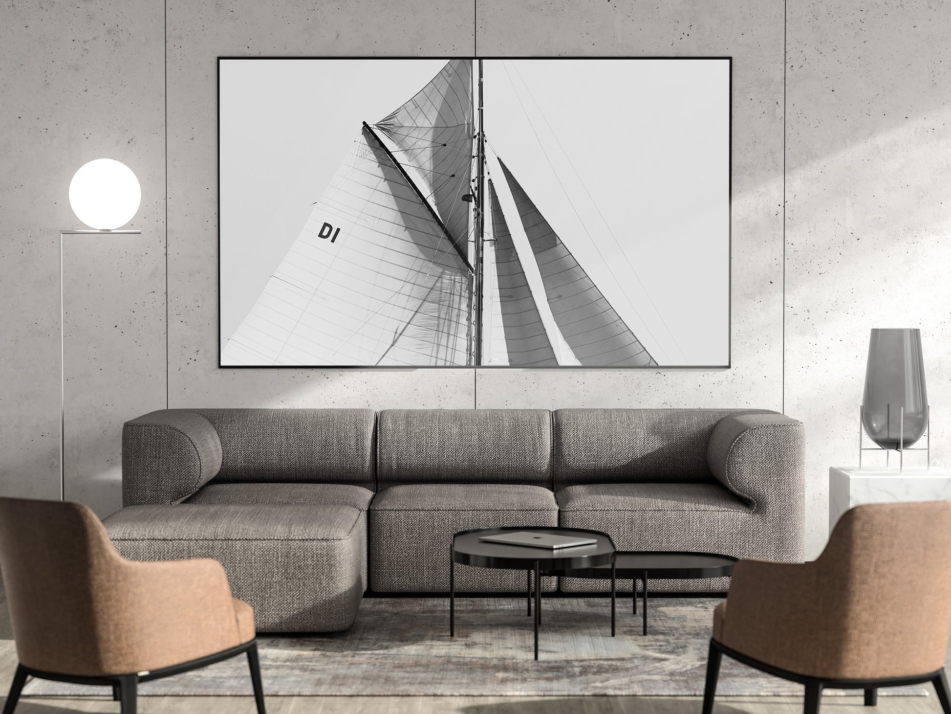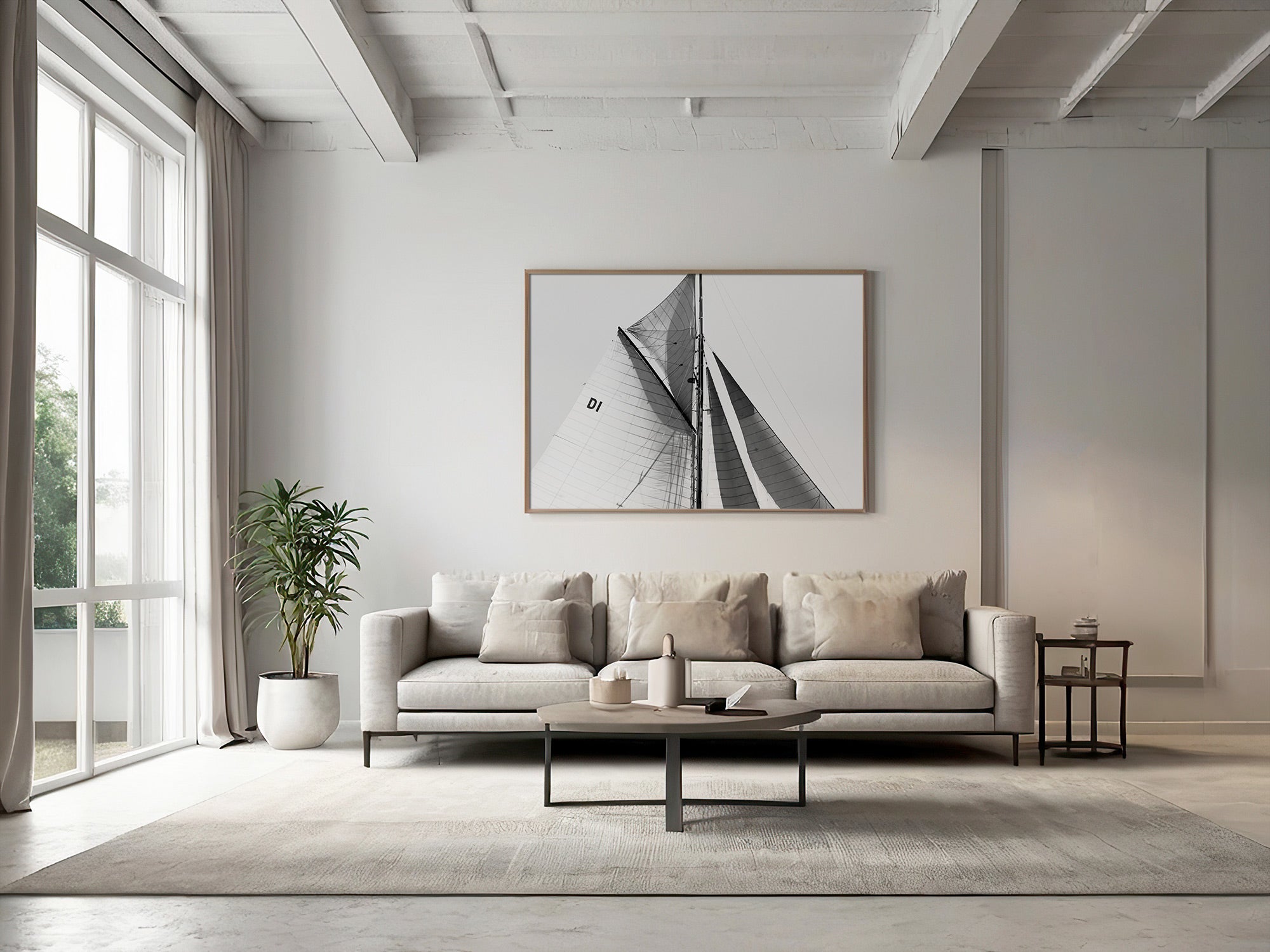 Black and white photograph captured during a classic sailing regatta off the coast of Menorca. Elegant vintage yachts glide across a calm sea, their tall sails catching the light against a softly clouded sky. The composition is minimal and balanced, with a strong horizon dividing the dark sea and the luminous sails. The absence of color enhances the timeless atmosphere, evoking grace, tradition, and the quiet power of wind and craftsmanship.