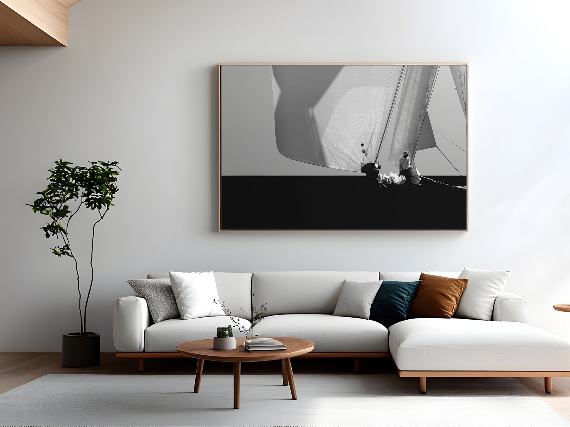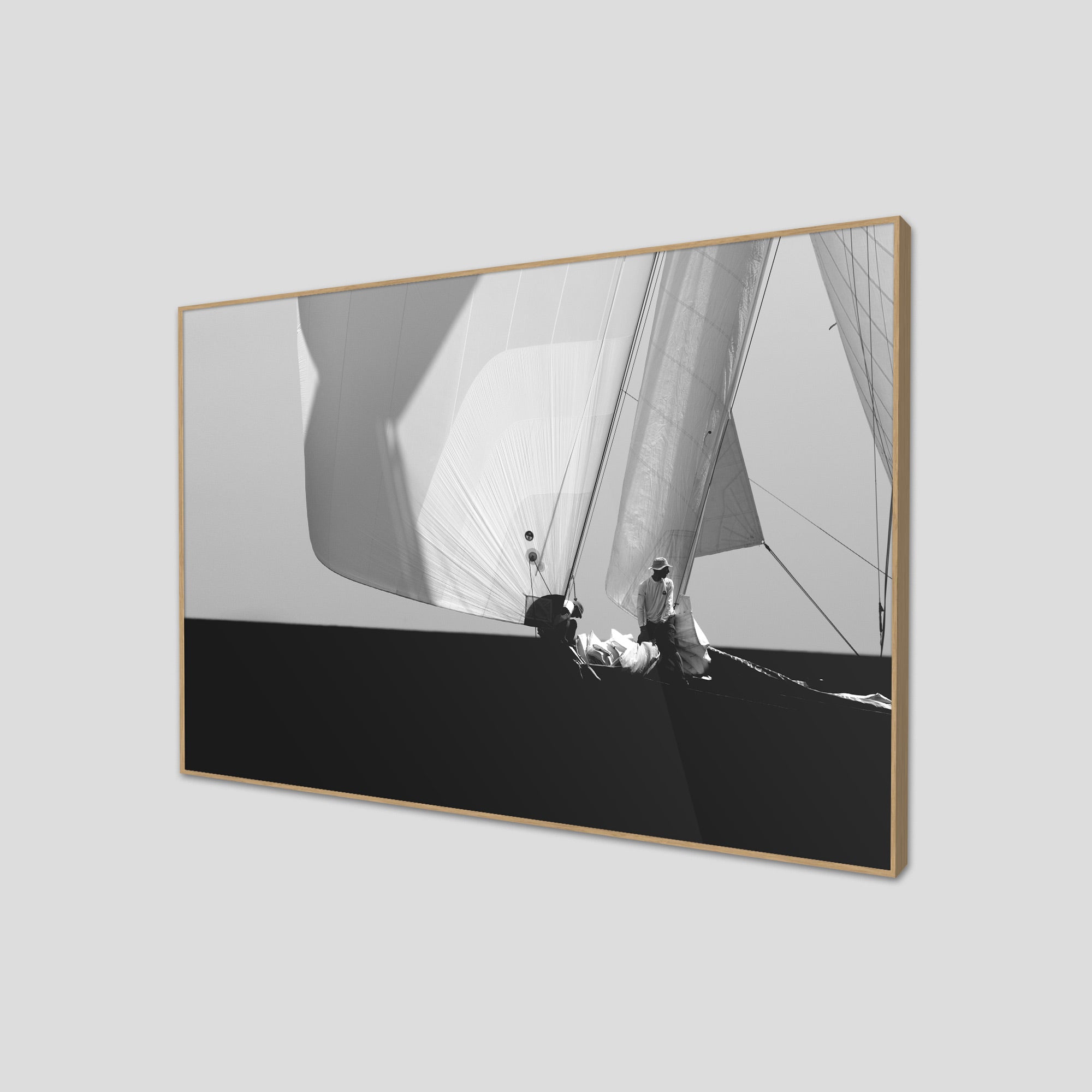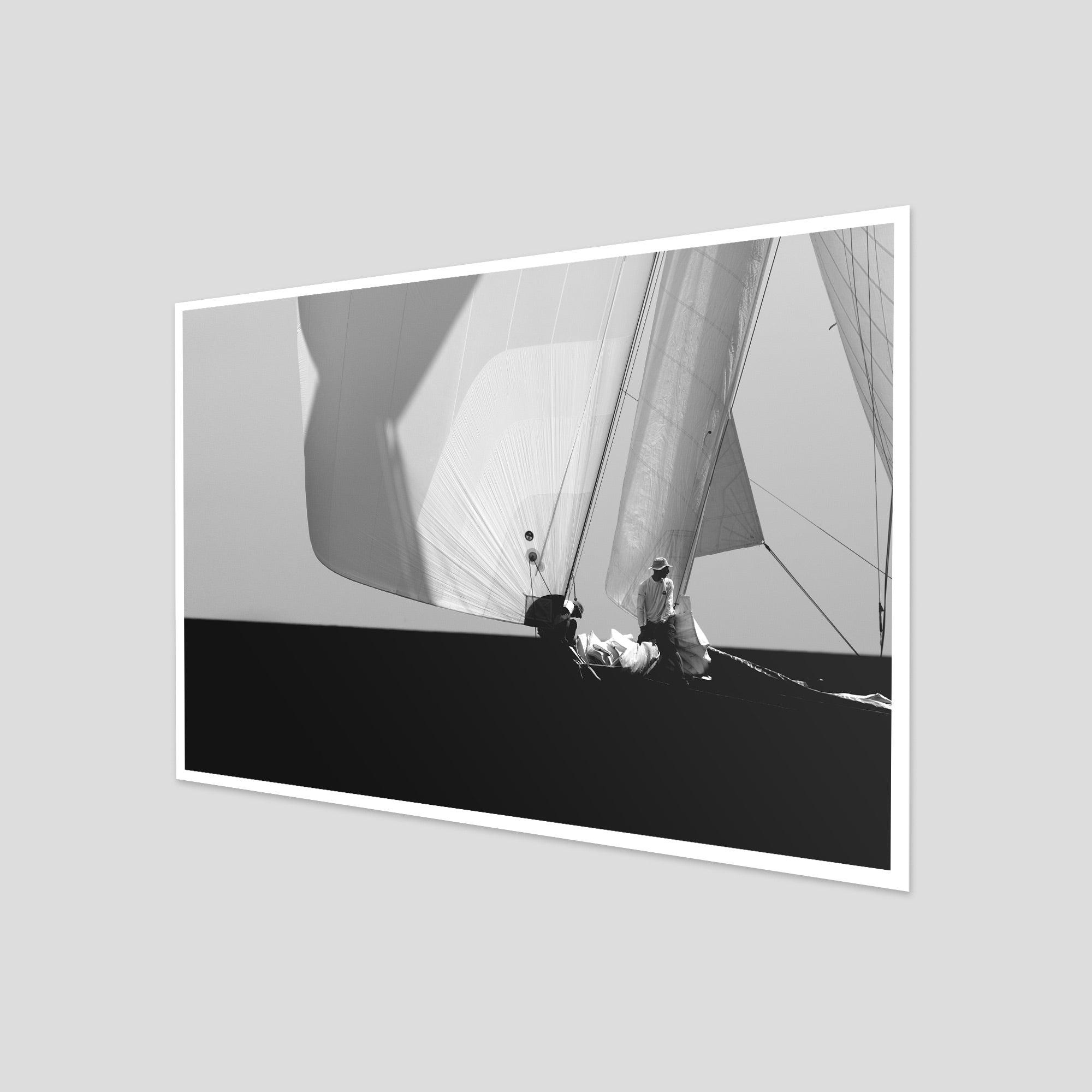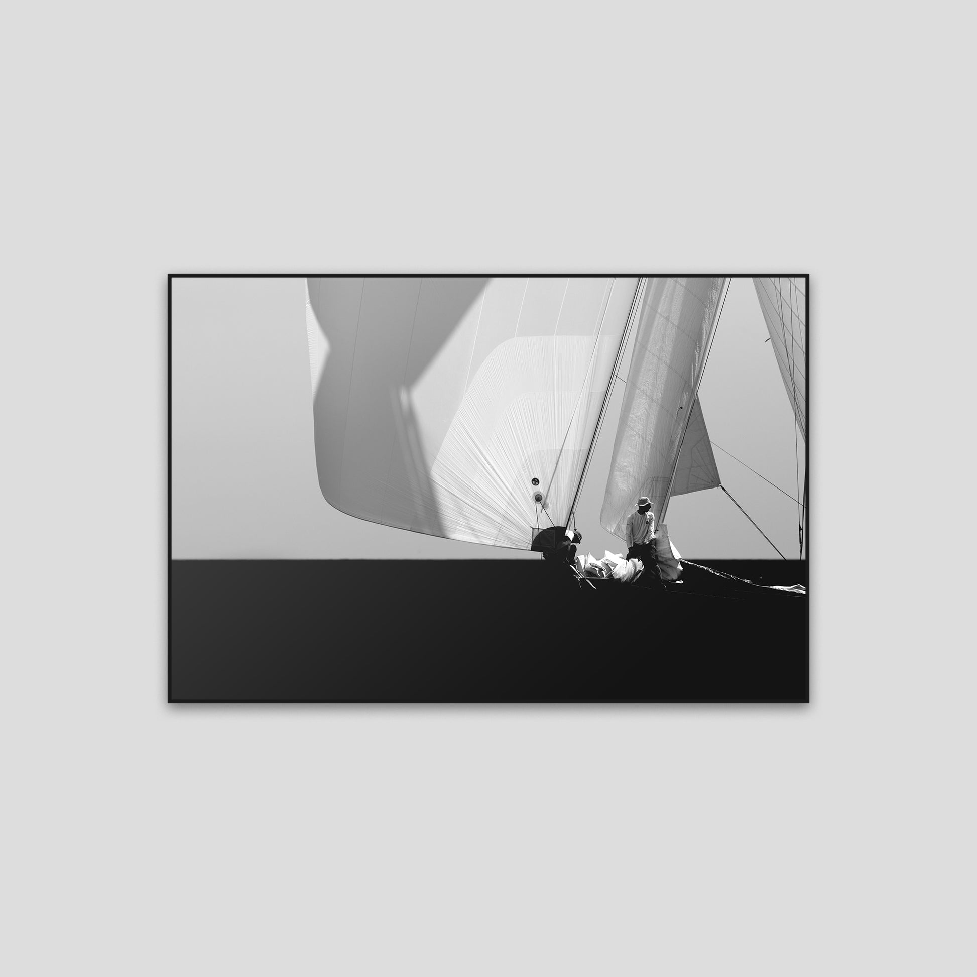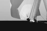 Black and white photograph captured during a classic sailing regatta off the coast of Menorca. Elegant vintage yachts glide across a calm sea, their tall sails catching the light against a softly clouded sky. The composition is minimal and balanced, with a strong horizon dividing the dark sea and the luminous sails. The absence of color enhances the timeless atmosphere, evoking grace, tradition, and the quiet power of wind and craftsmanship.