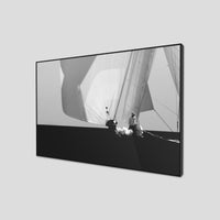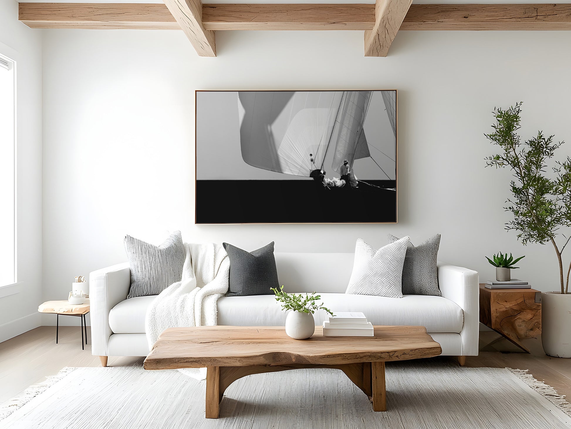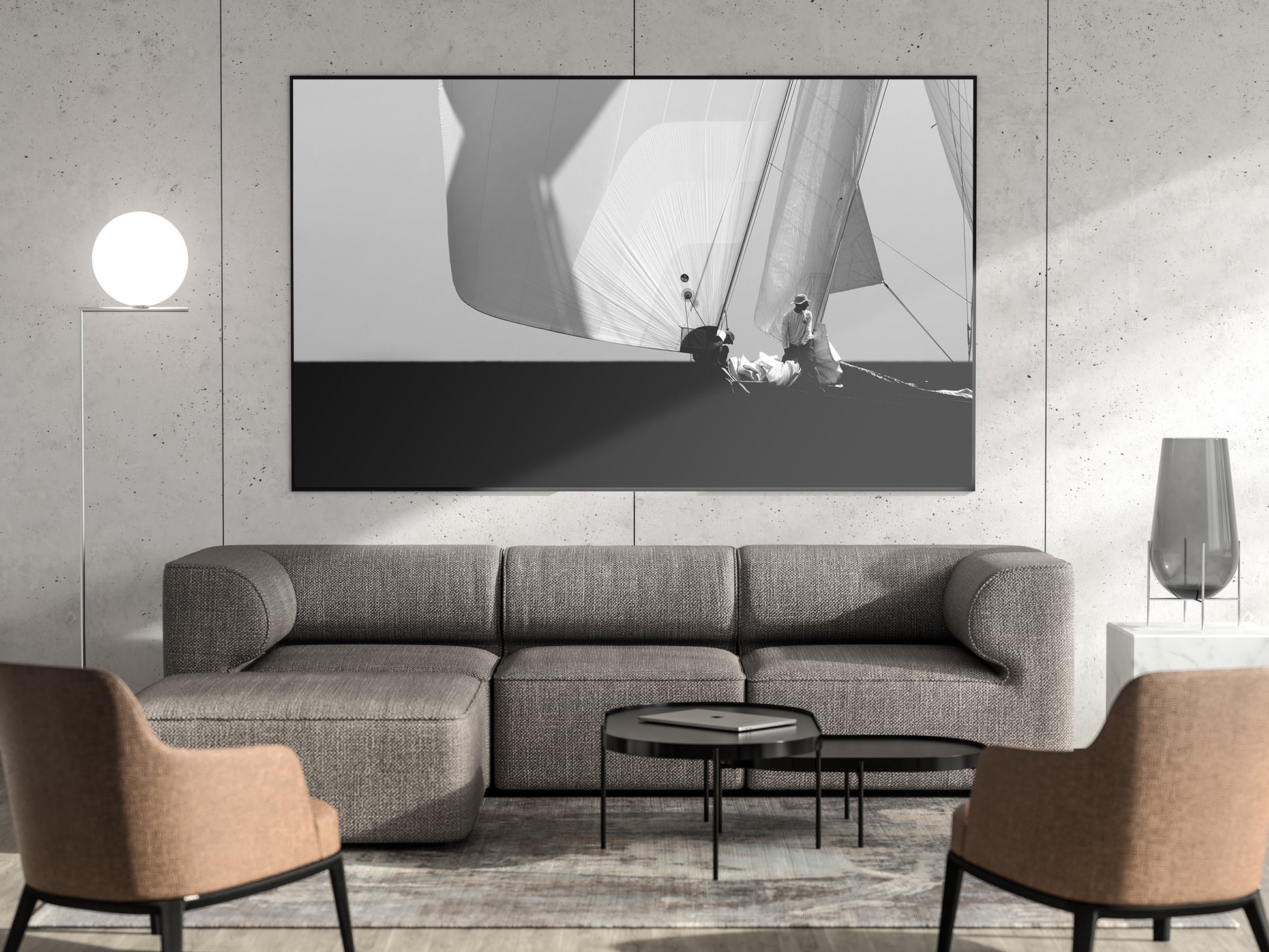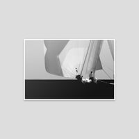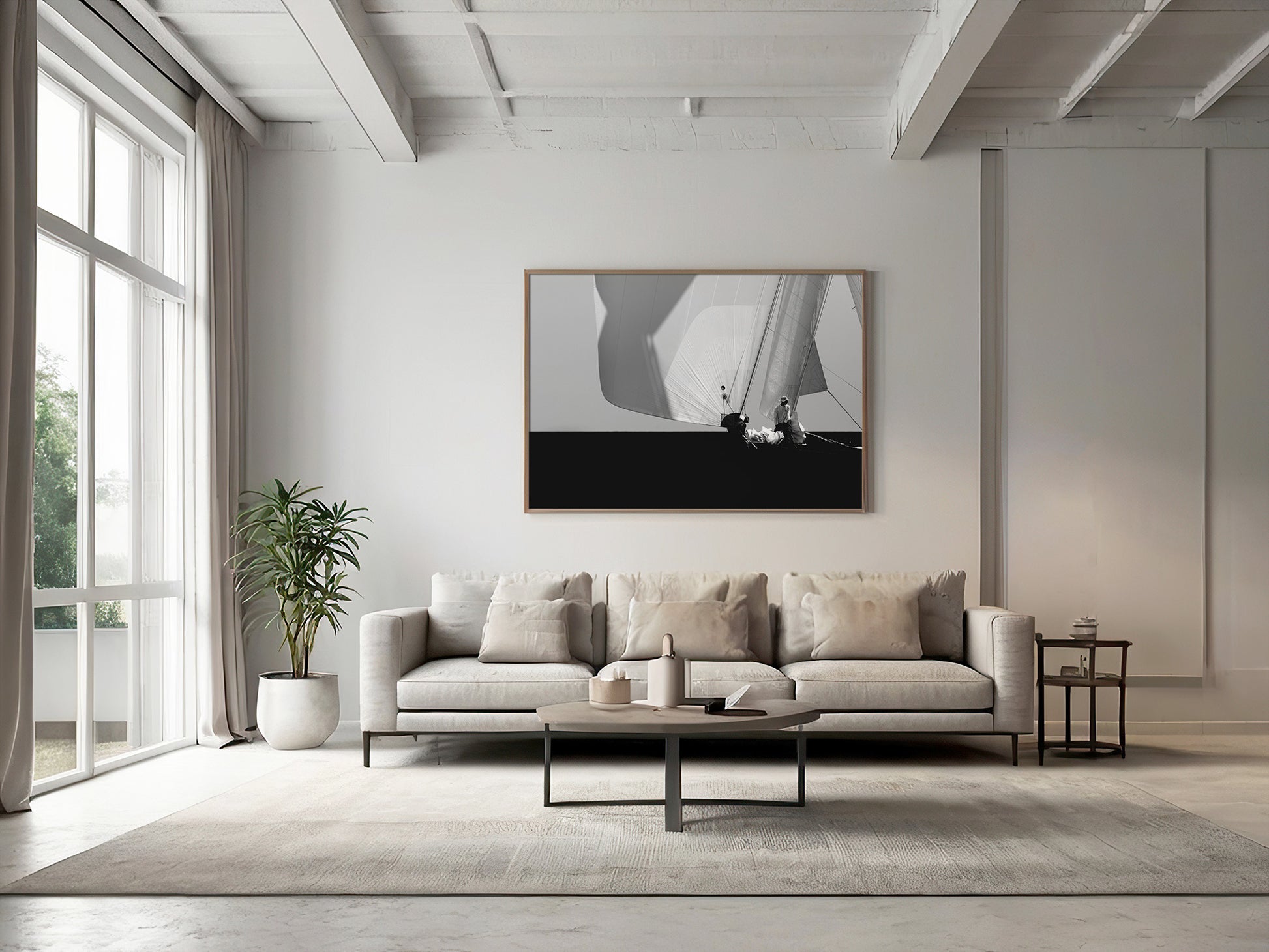 Black and white photograph captured during a classic sailing regatta off the coast of Menorca. Elegant vintage yachts glide across a calm sea, their tall sails catching the light against a softly clouded sky. The composition is minimal and balanced, with a strong horizon dividing the dark sea and the luminous sails. The absence of color enhances the timeless atmosphere, evoking grace, tradition, and the quiet power of wind and craftsmanship.