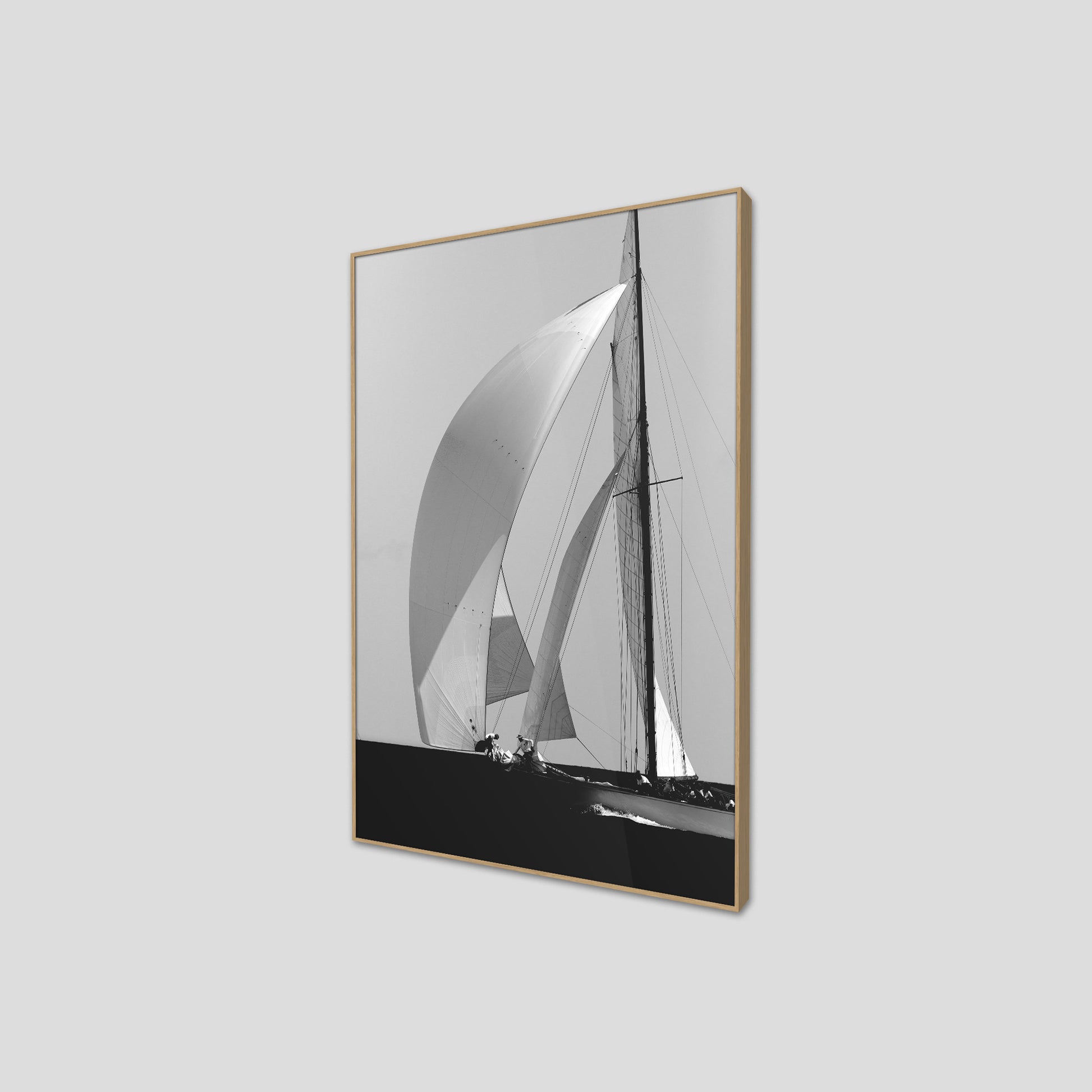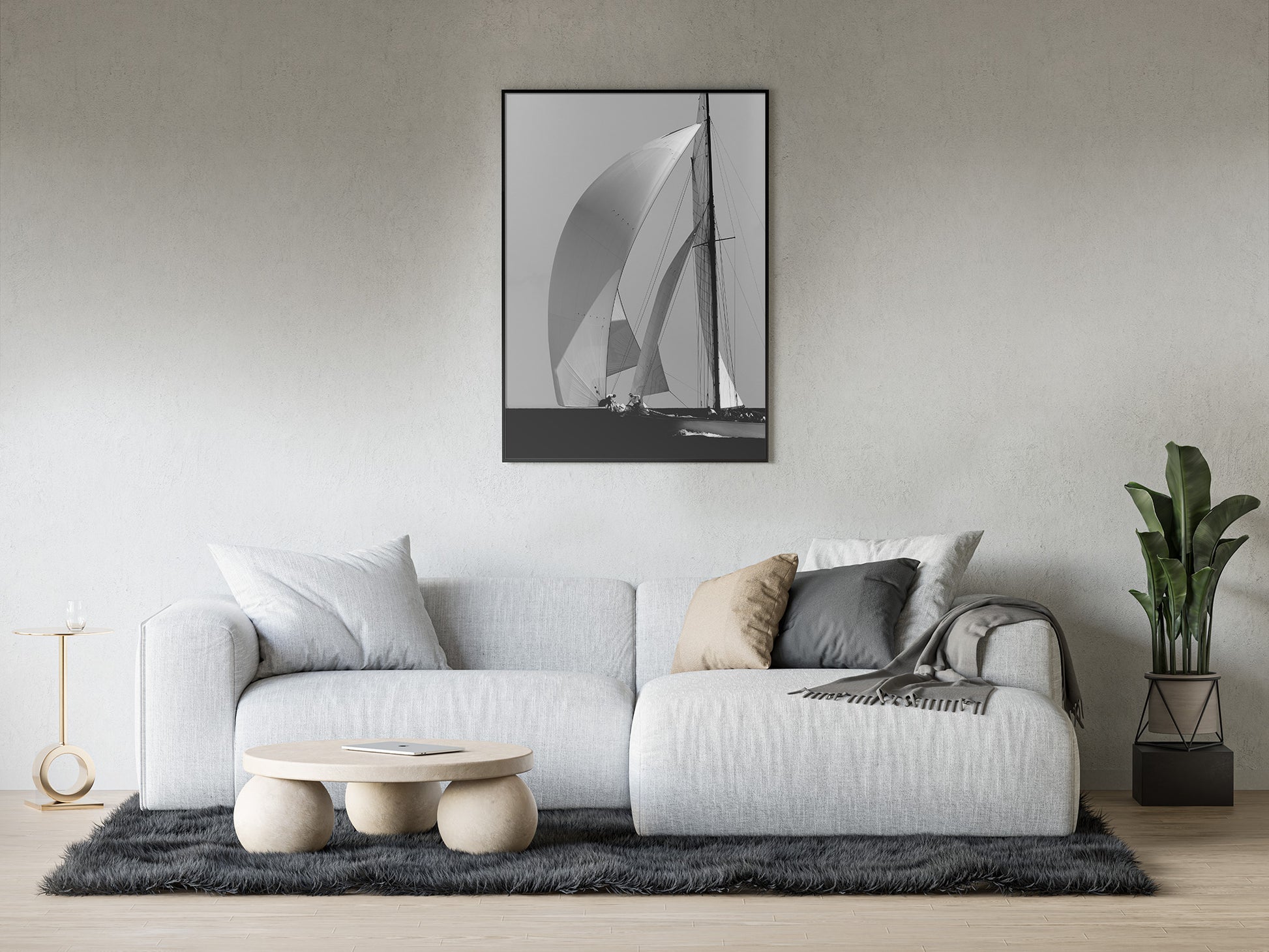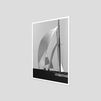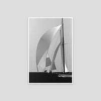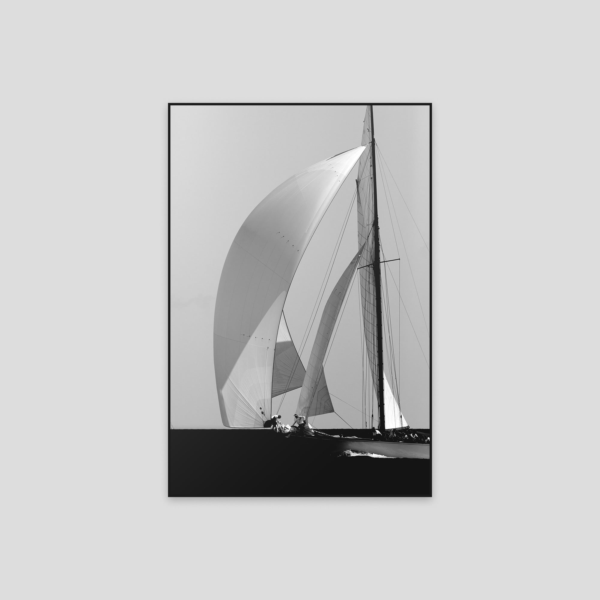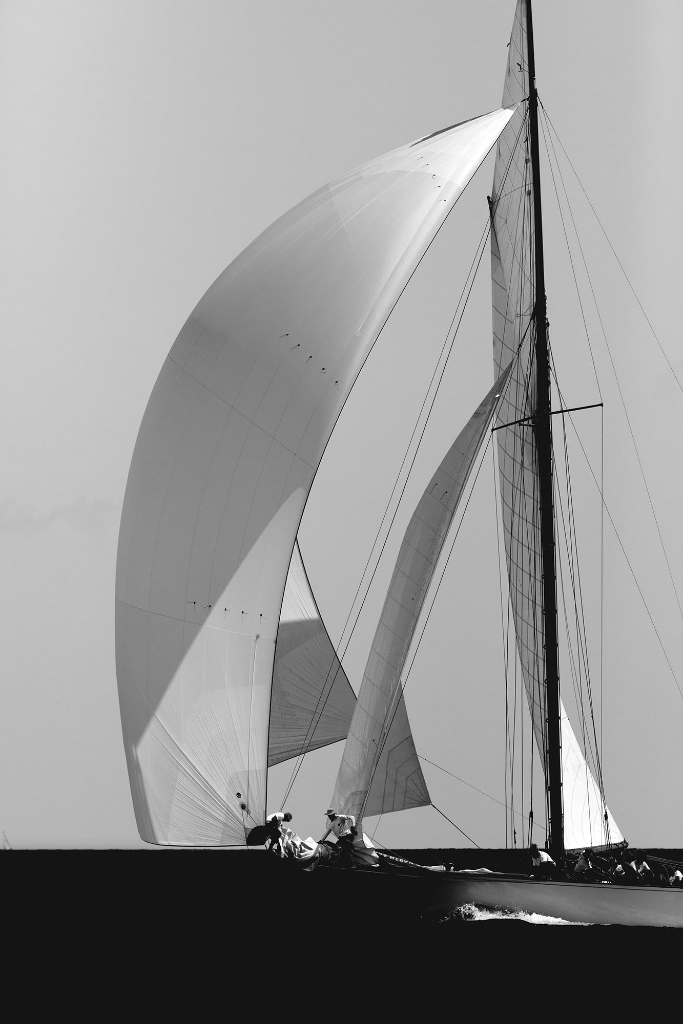 Black and white photograph captured during a classic sailing regatta off the coast of Menorca. Elegant vintage yachts glide across a calm sea, their tall sails catching the light against a softly clouded sky. The composition is minimal and balanced, with a strong horizon dividing the dark sea and the luminous sails. The absence of color enhances the timeless atmosphere, evoking grace, tradition, and the quiet power of wind and craftsmanship.