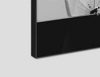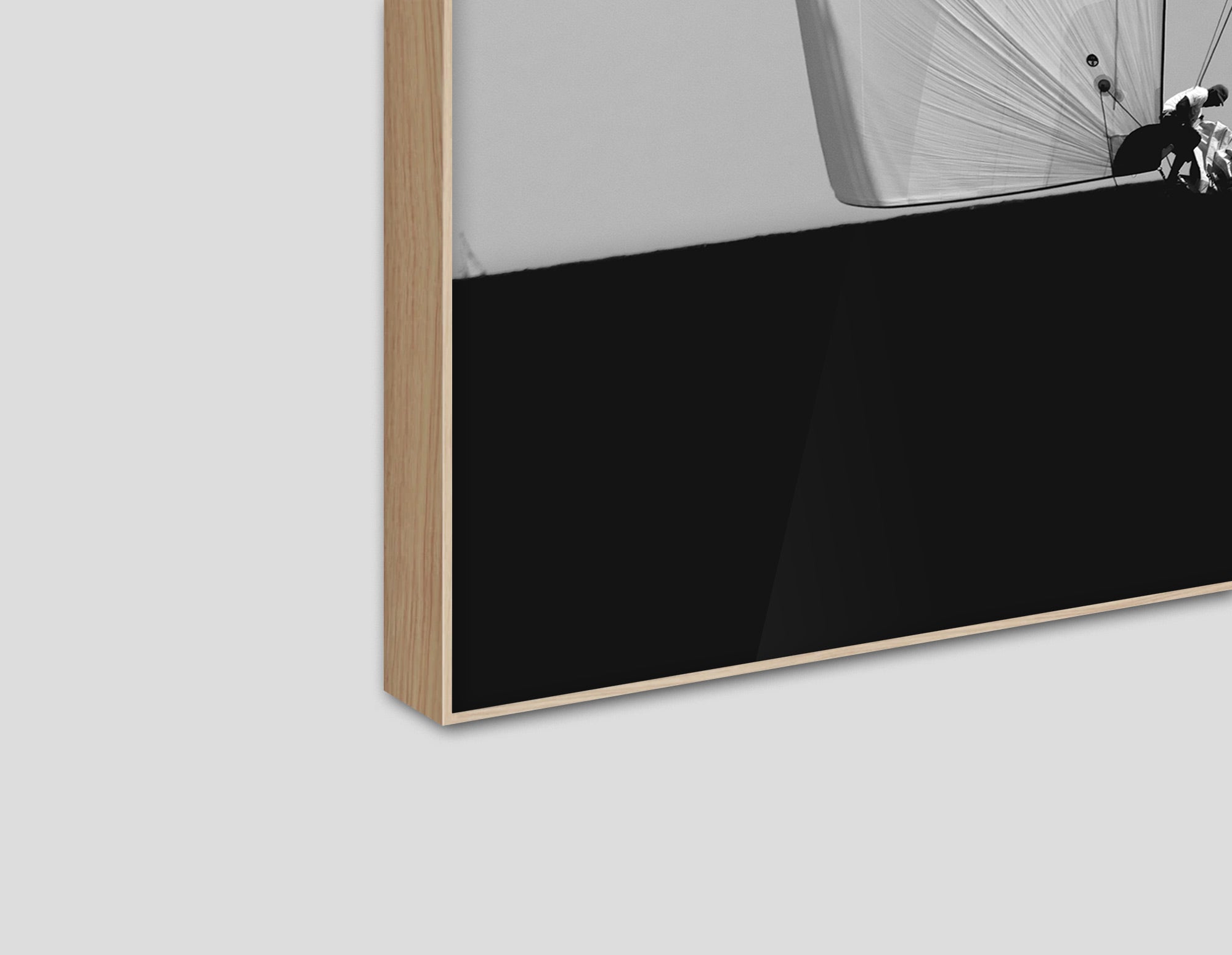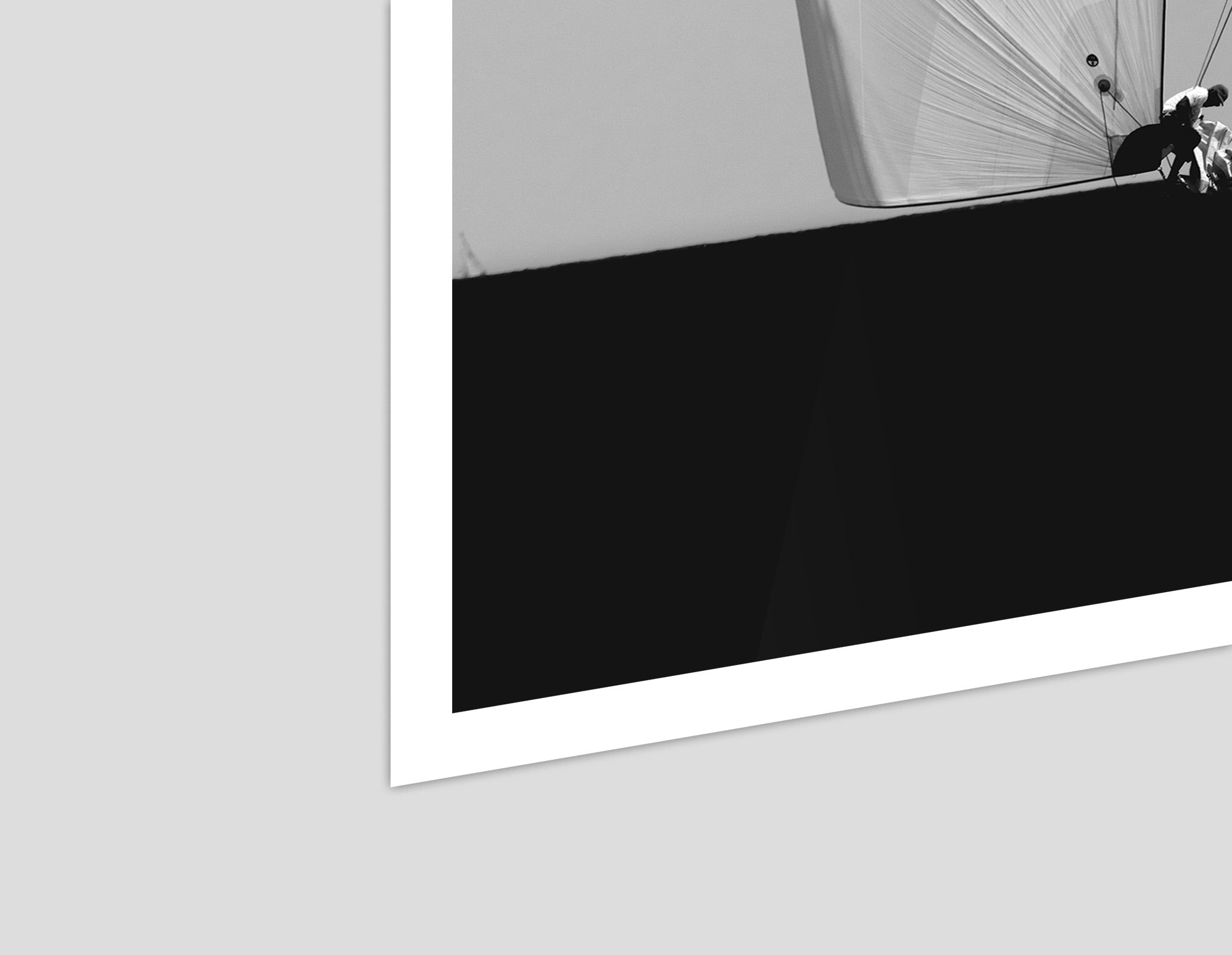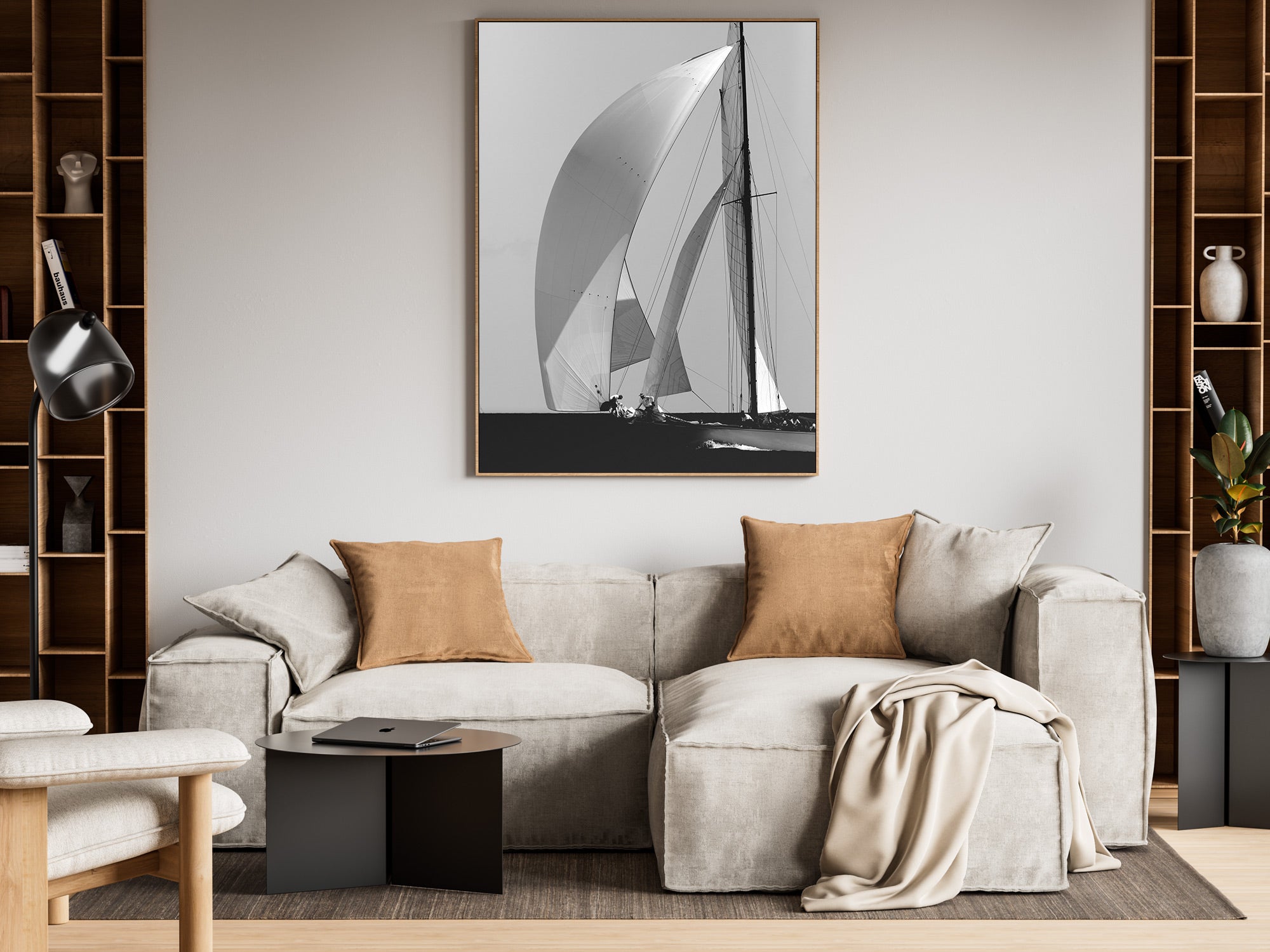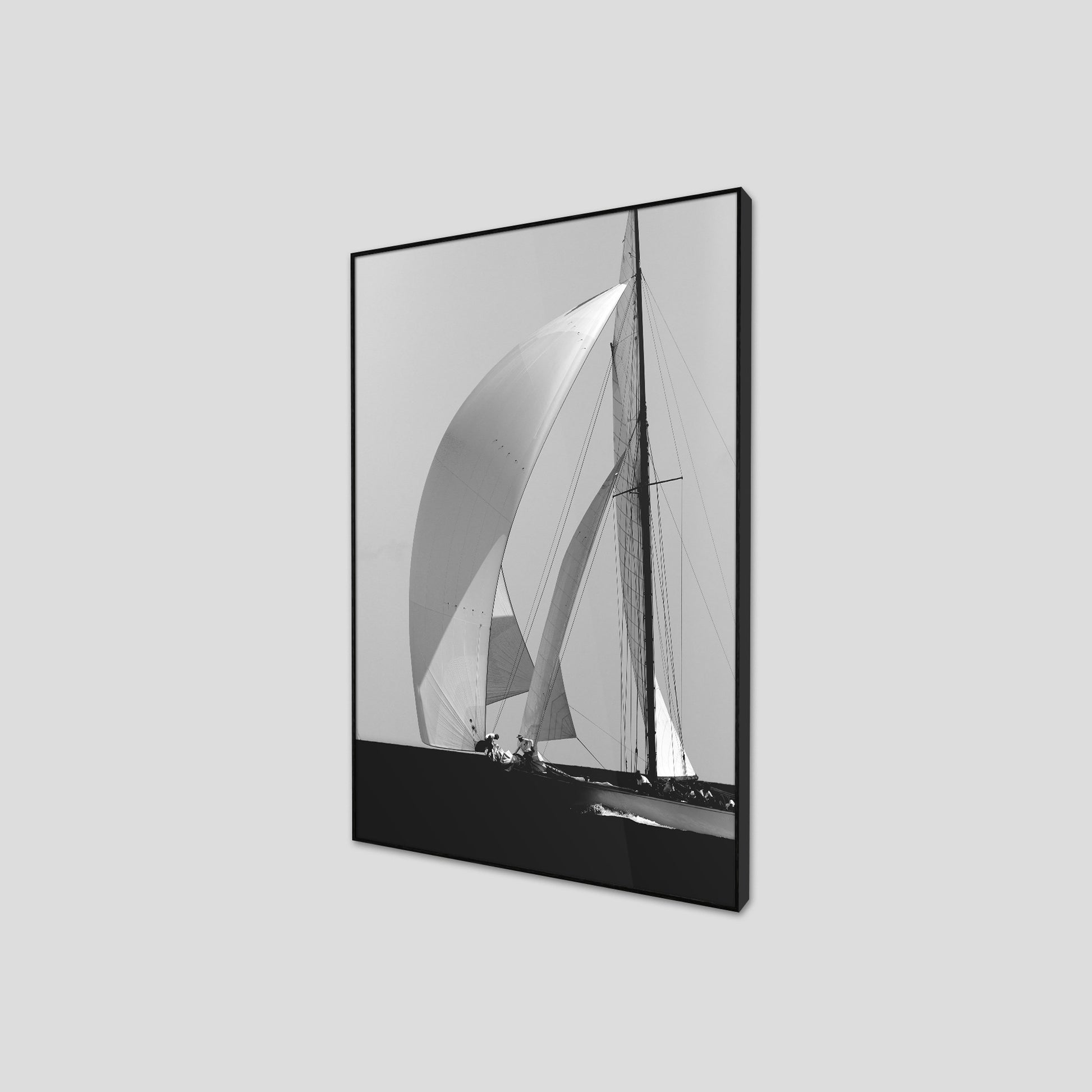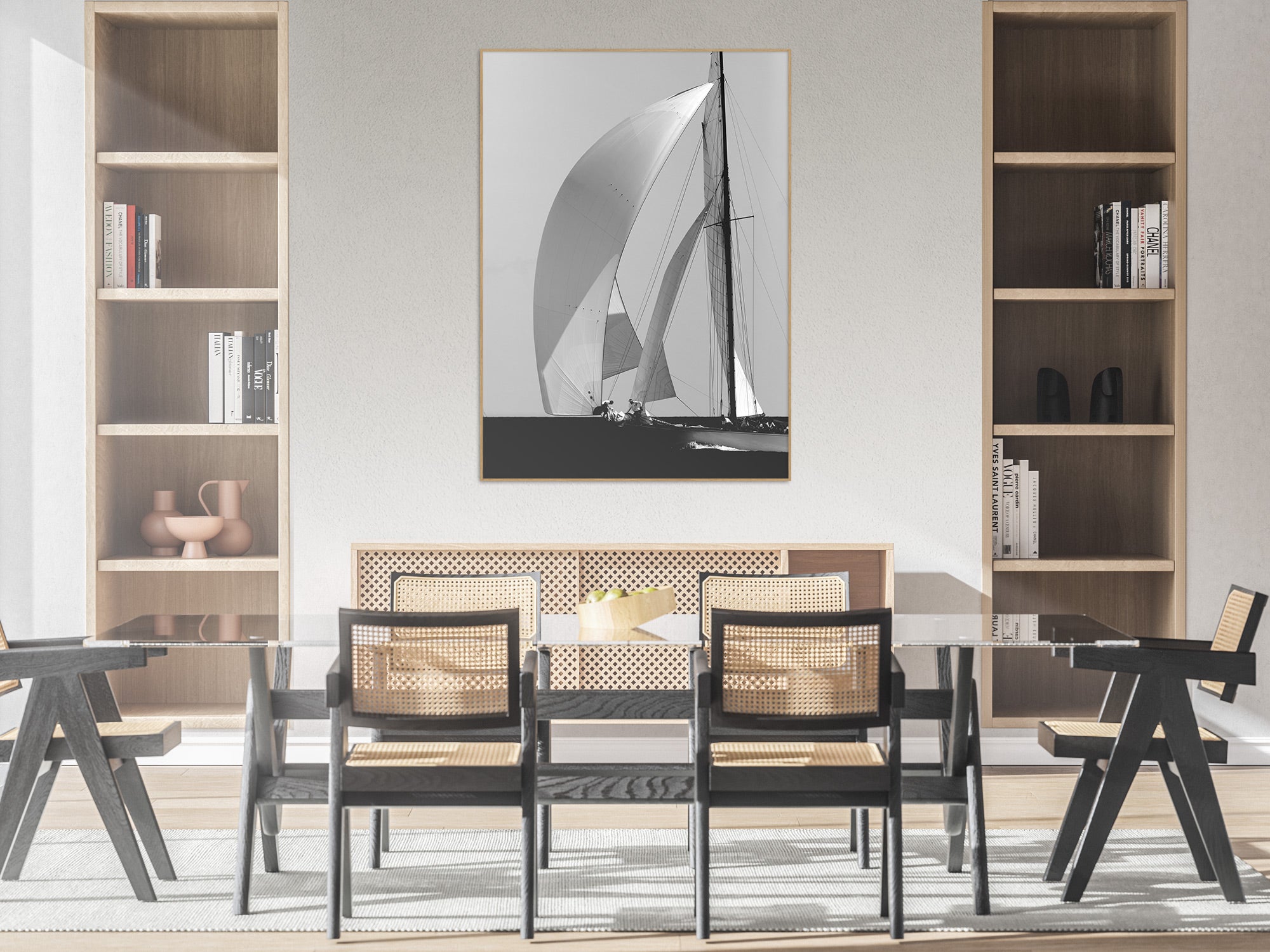 Black and white photograph captured during a classic sailing regatta off the coast of Menorca. Elegant vintage yachts glide across a calm sea, their tall sails catching the light against a softly clouded sky. The composition is minimal and balanced, with a strong horizon dividing the dark sea and the luminous sails. The absence of color enhances the timeless atmosphere, evoking grace, tradition, and the quiet power of wind and craftsmanship.