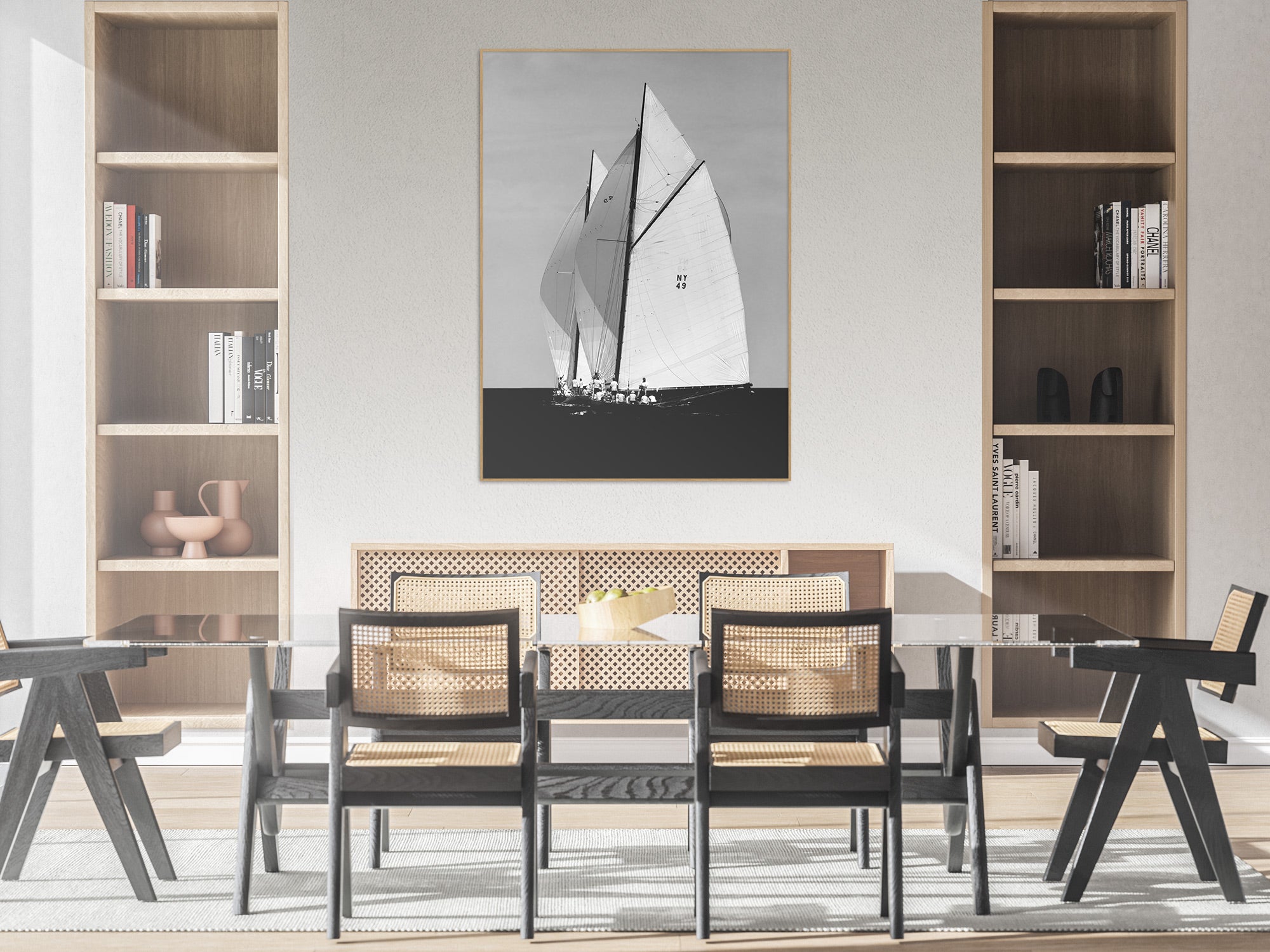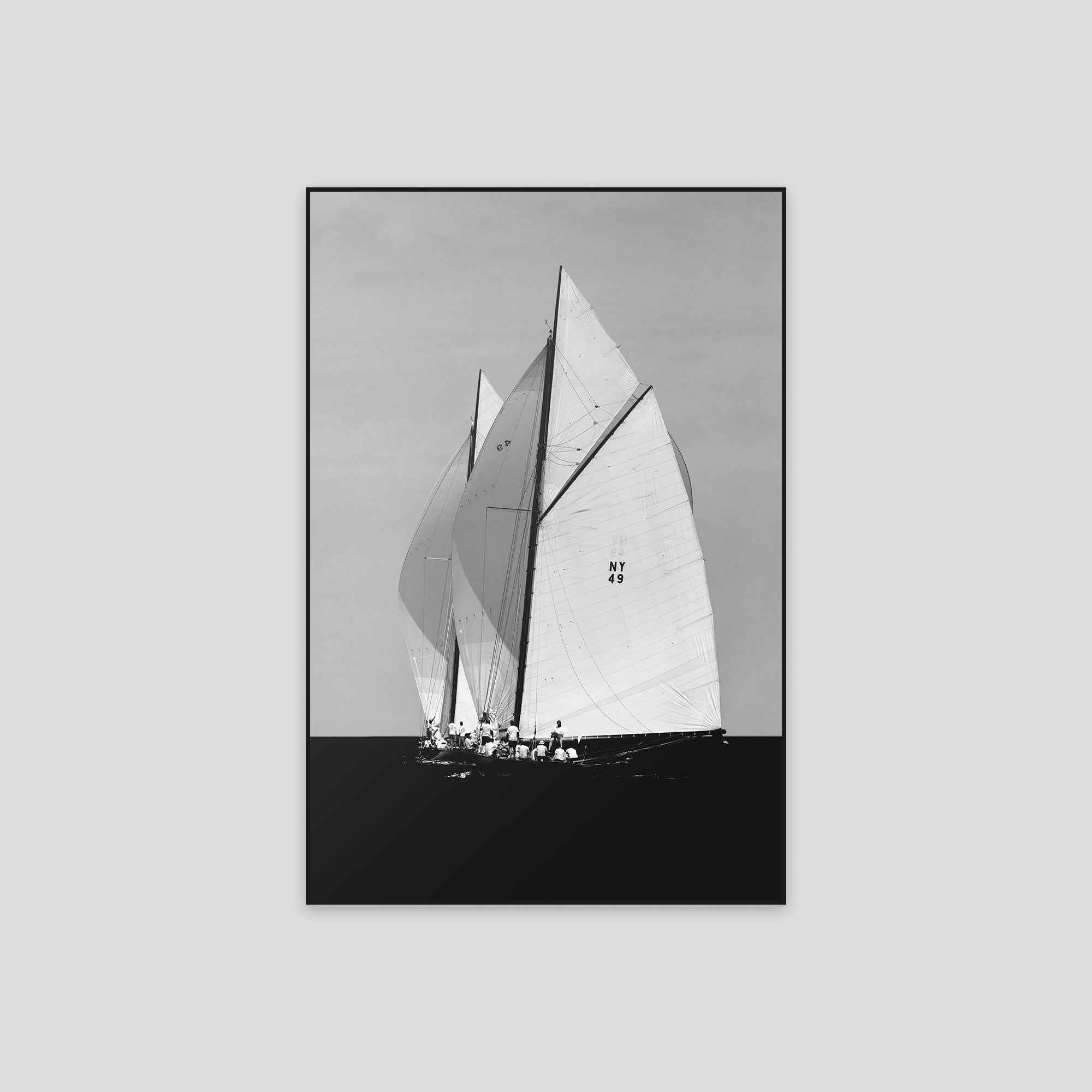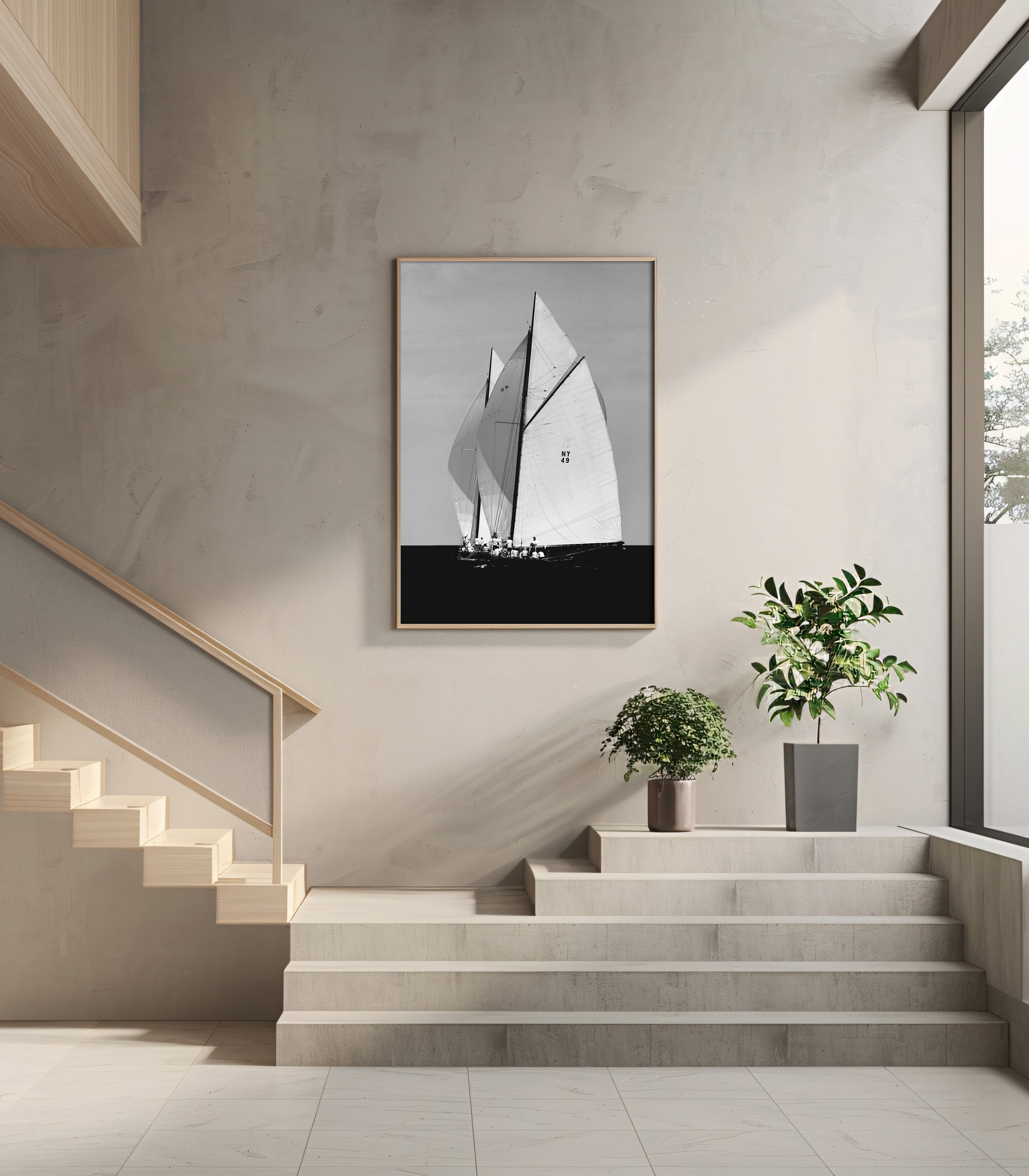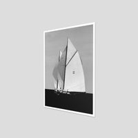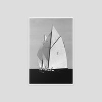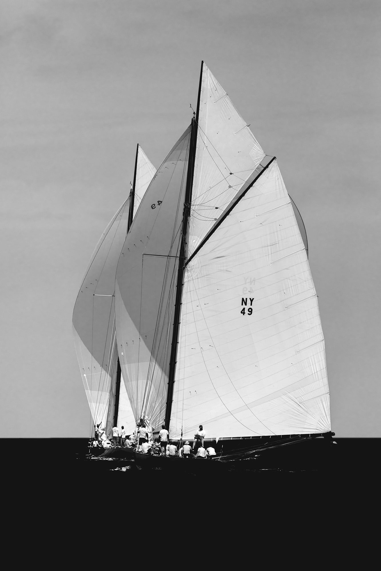 Black and white photograph captured during a classic sailing regatta off the coast of Menorca. Elegant vintage yachts glide across a calm sea, their tall sails catching the light against a softly clouded sky. The composition is minimal and balanced, with a strong horizon dividing the dark sea and the luminous sails. The absence of color enhances the timeless atmosphere, evoking grace, tradition, and the quiet power of wind and craftsmanship.