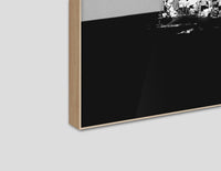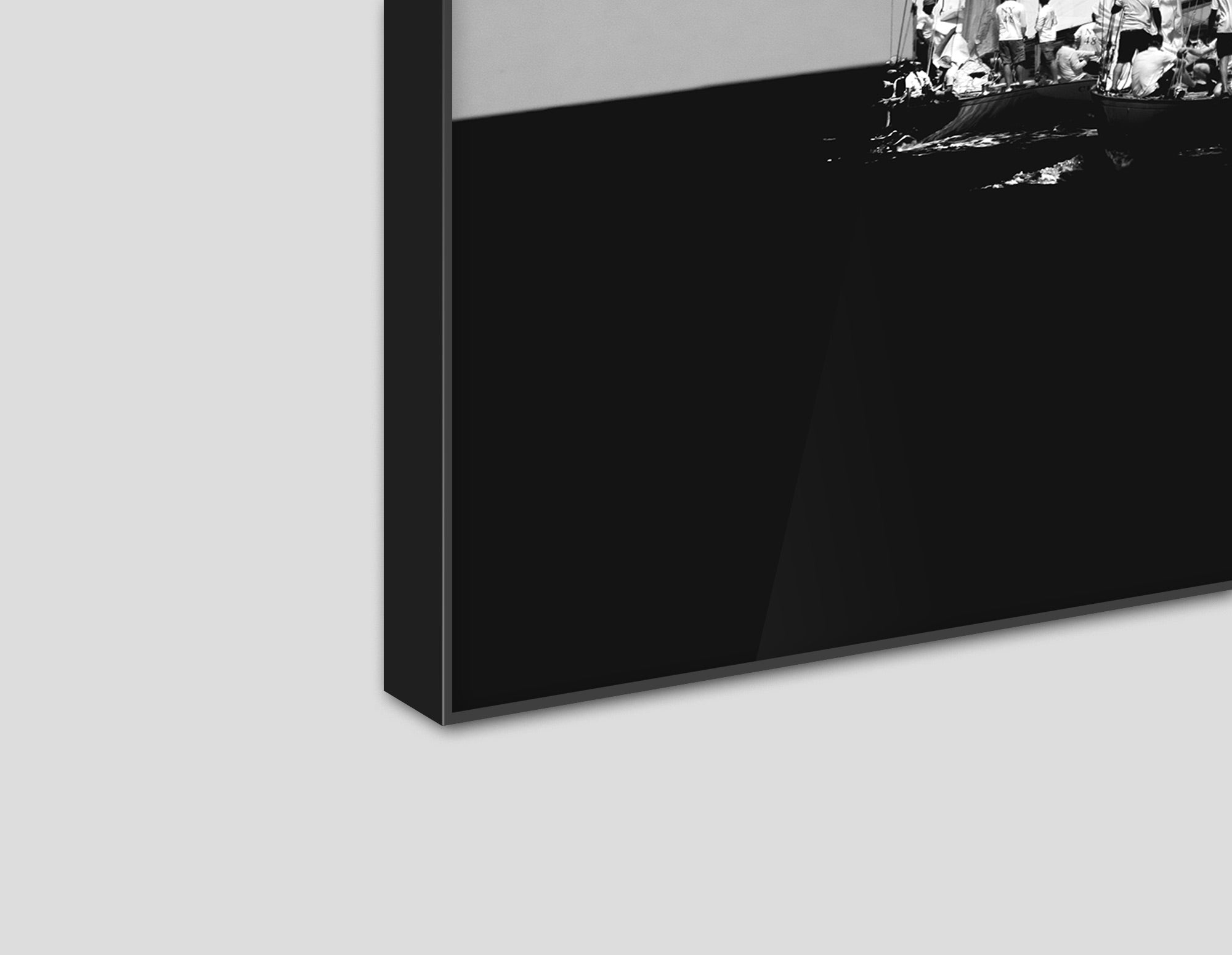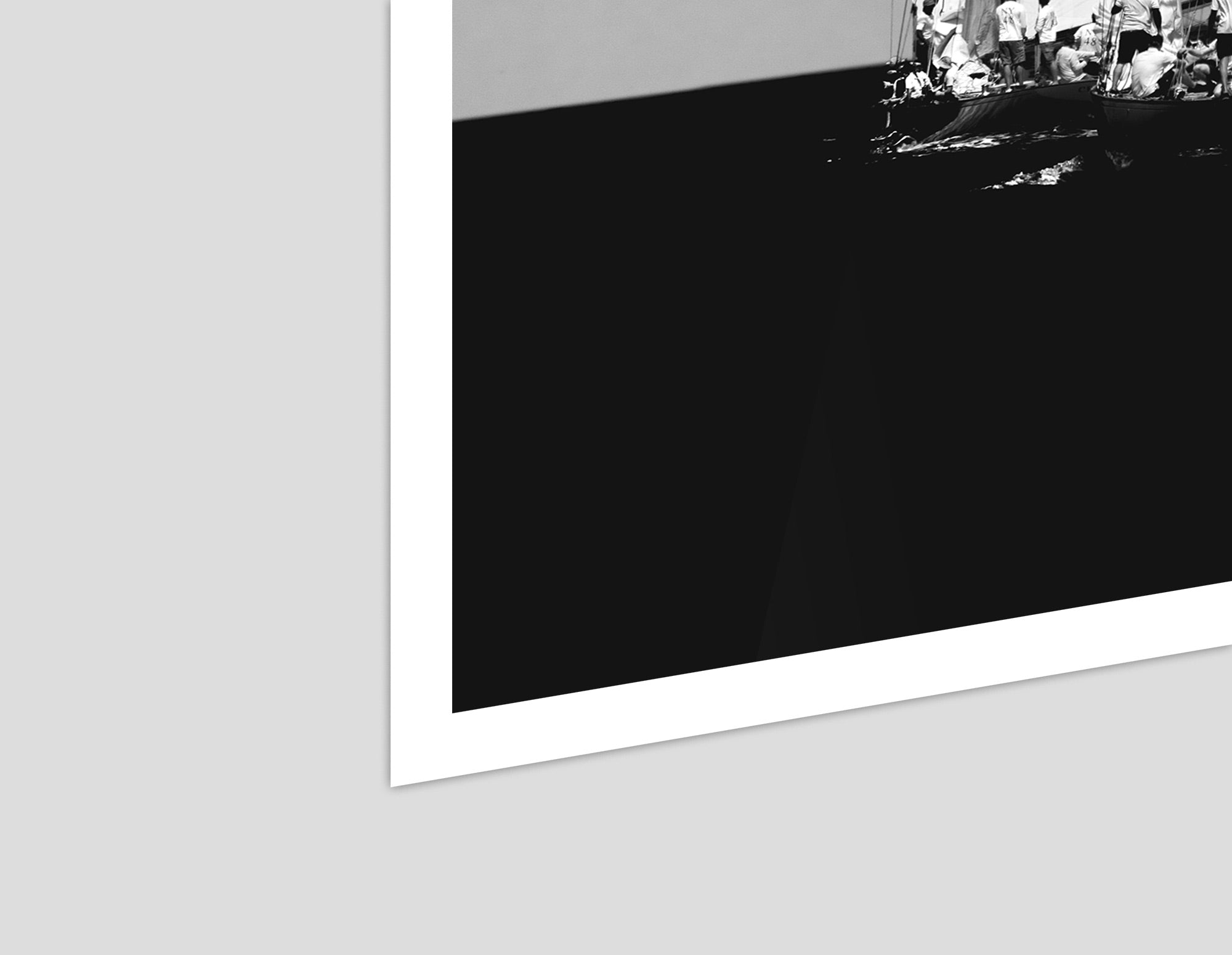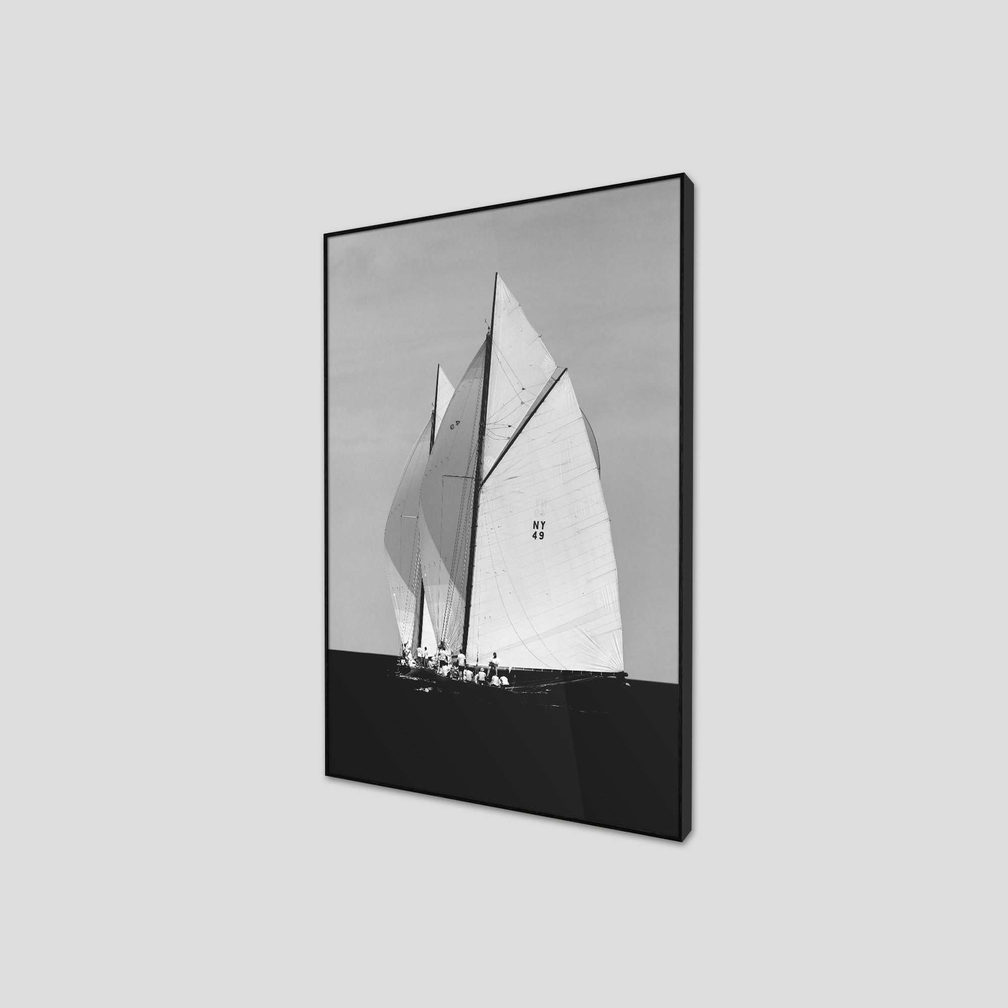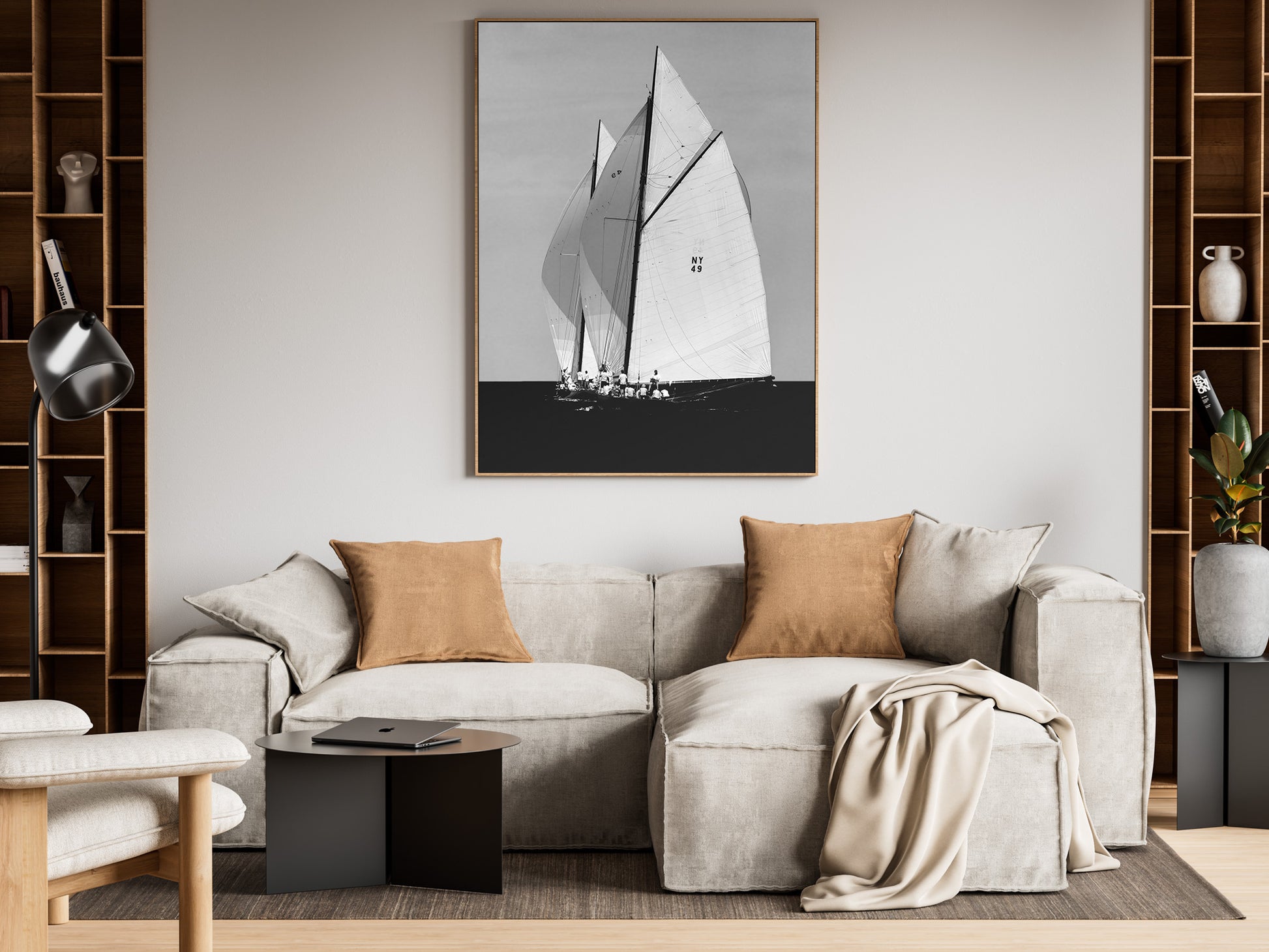 Black and white photograph captured during a classic sailing regatta off the coast of Menorca. Elegant vintage yachts glide across a calm sea, their tall sails catching the light against a softly clouded sky. The composition is minimal and balanced, with a strong horizon dividing the dark sea and the luminous sails. The absence of color enhances the timeless atmosphere, evoking grace, tradition, and the quiet power of wind and craftsmanship.