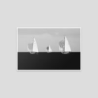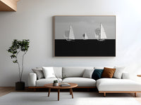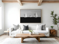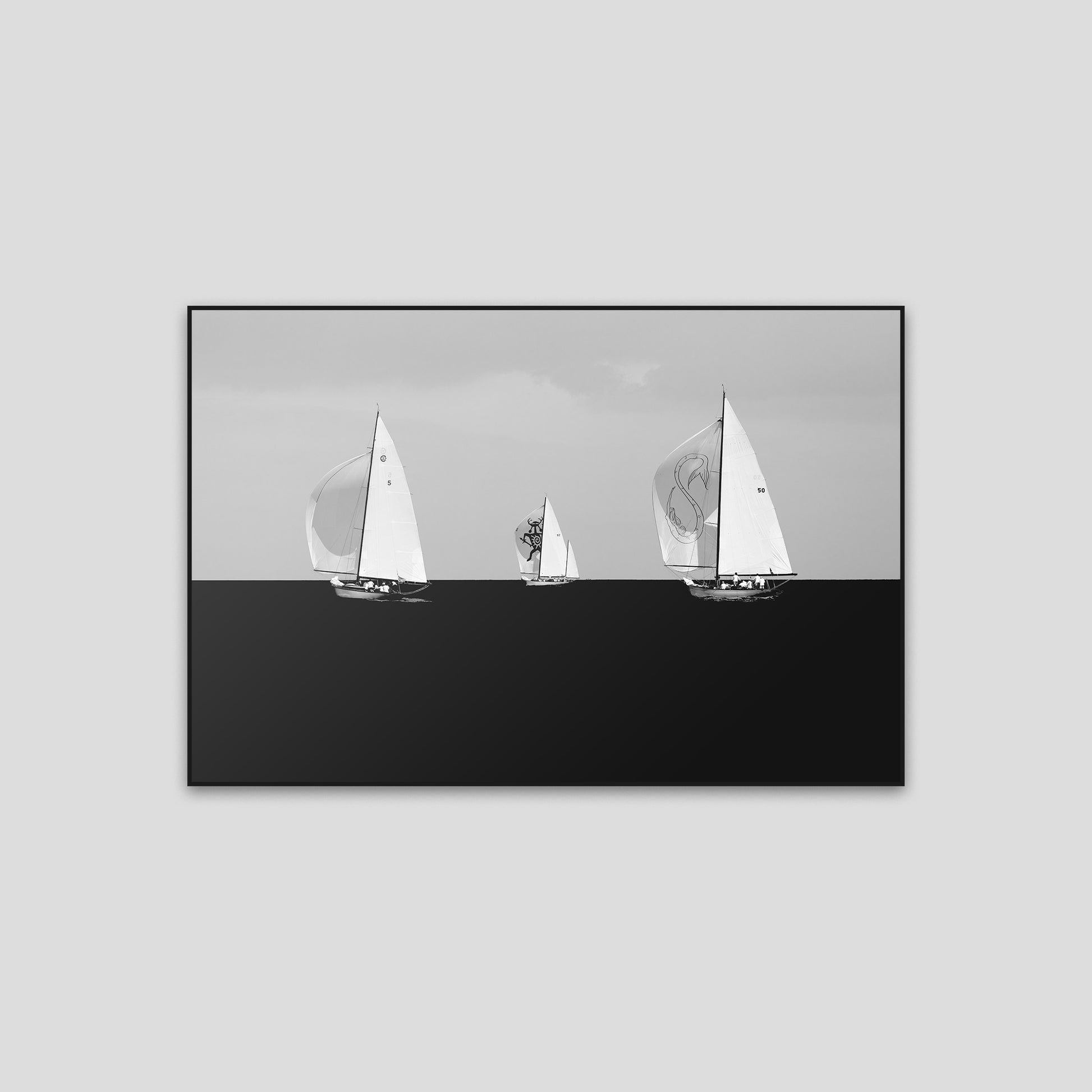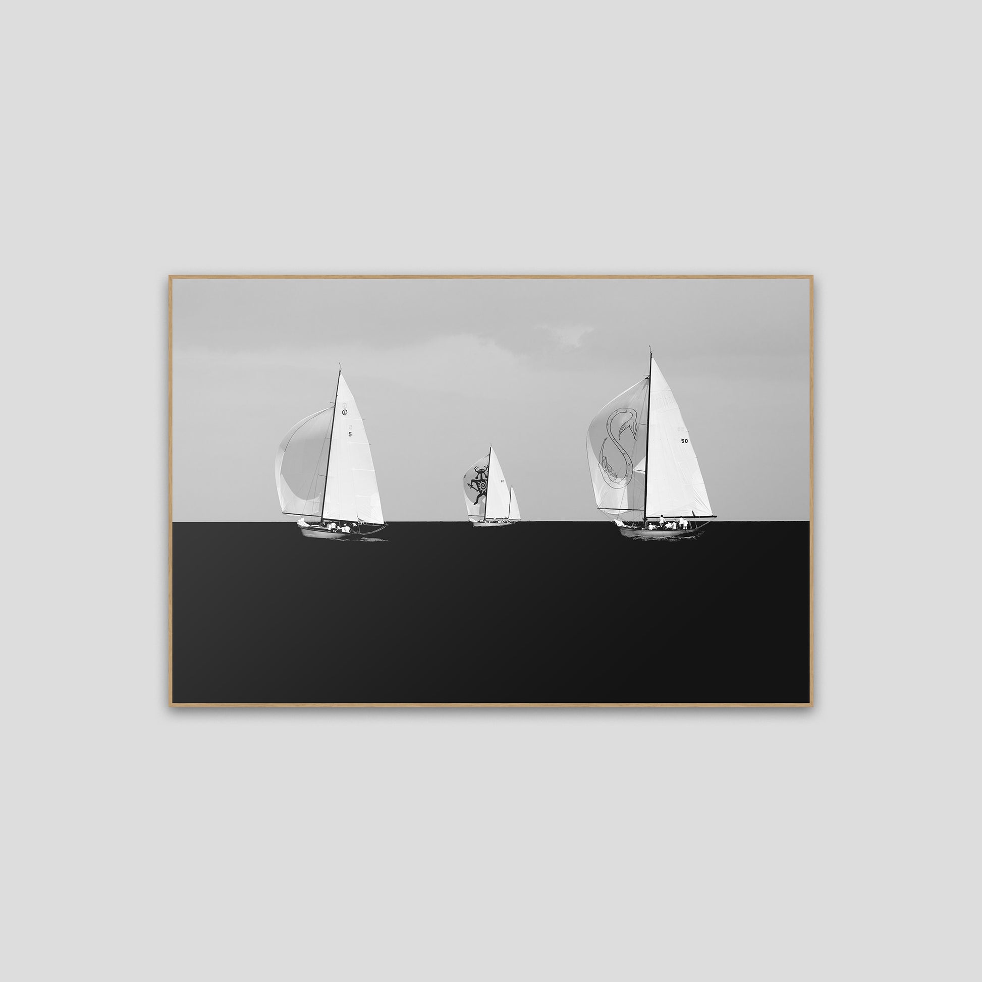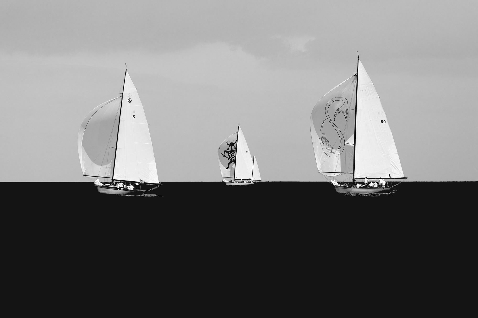Black and white photograph captured during a classic sailing regatta off the coast of Menorca. Elegant vintage yachts glide across a calm sea, their tall sails catching the light against a softly clouded sky. The composition is minimal and balanced, with a strong horizon dividing the dark sea and the luminous sails. The absence of color enhances the timeless atmosphere, evoking grace, tradition, and the quiet power of wind and craftsmanship.