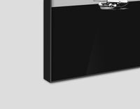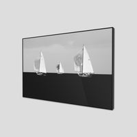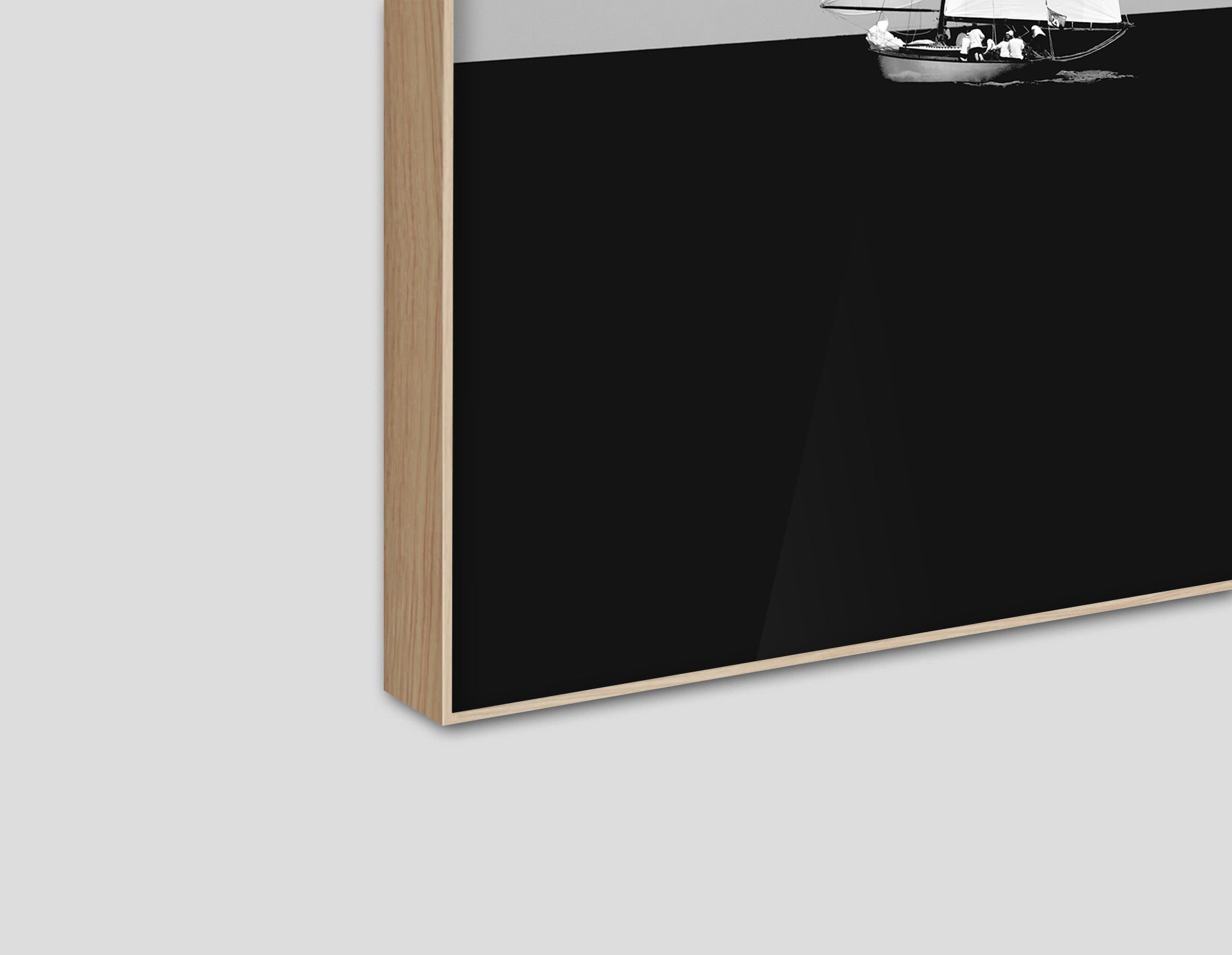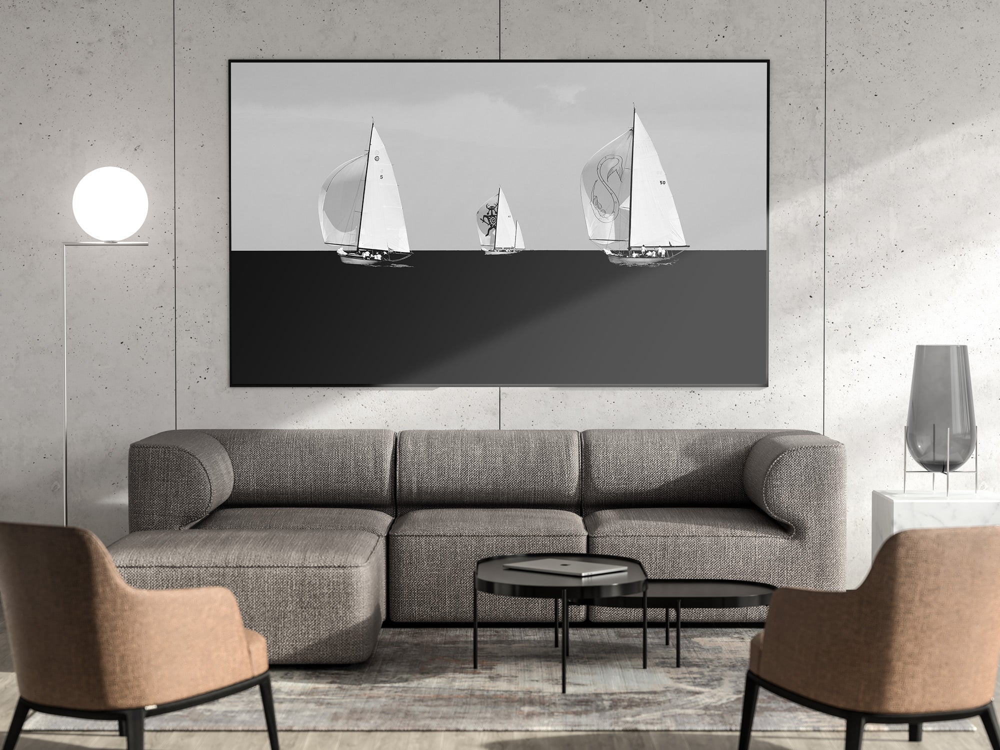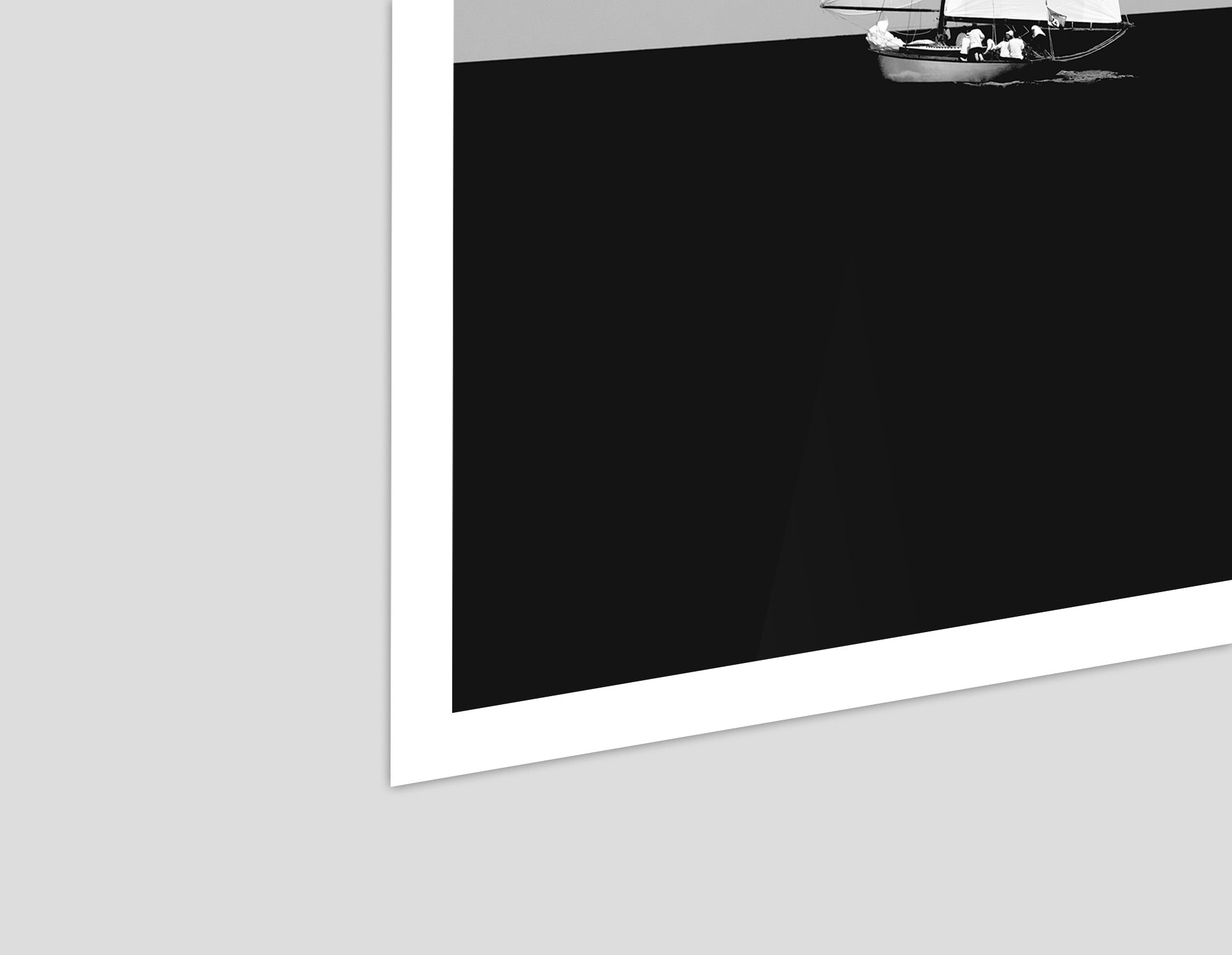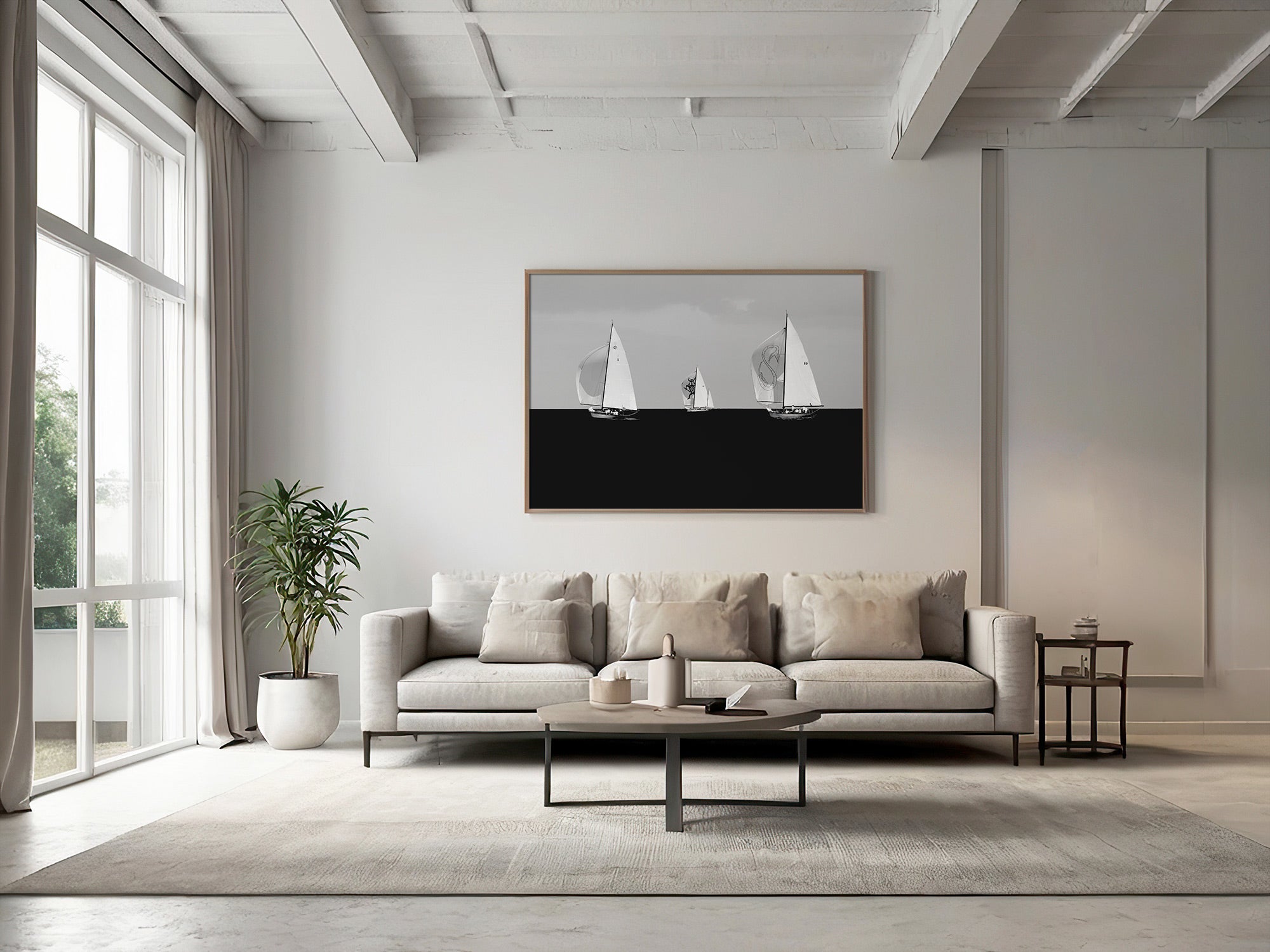 Black and white photograph captured during a classic sailing regatta off the coast of Menorca. Elegant vintage yachts glide across a calm sea, their tall sails catching the light against a softly clouded sky. The composition is minimal and balanced, with a strong horizon dividing the dark sea and the luminous sails. The absence of color enhances the timeless atmosphere, evoking grace, tradition, and the quiet power of wind and craftsmanship.