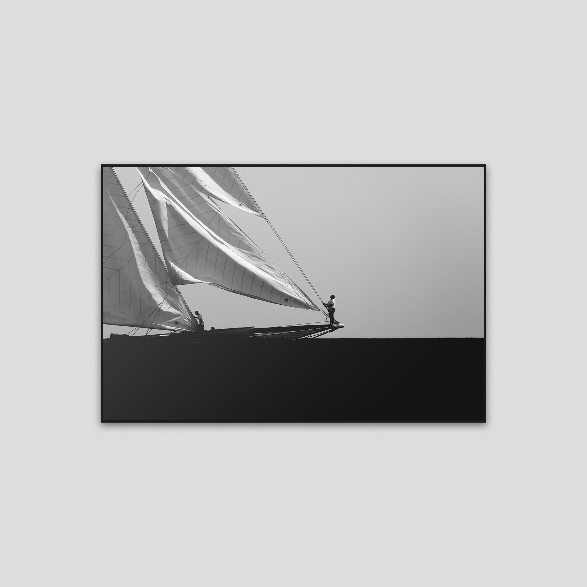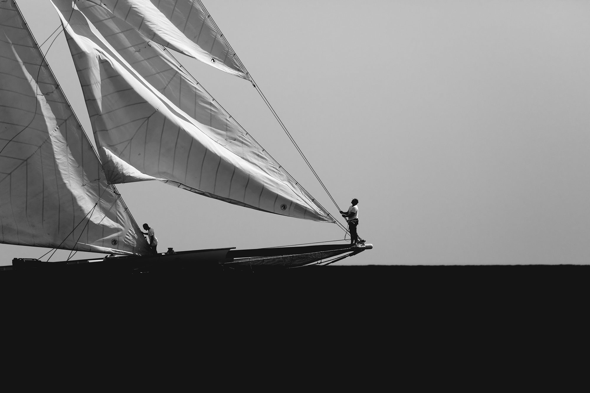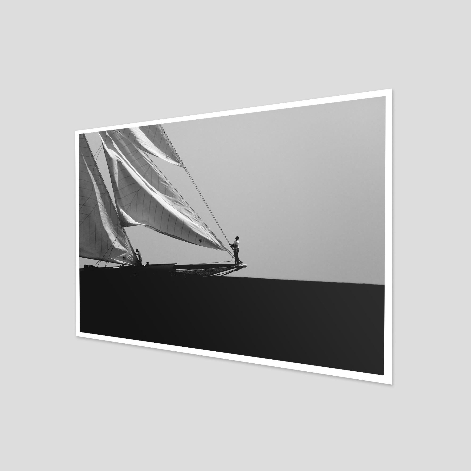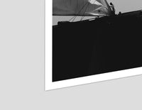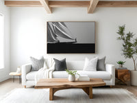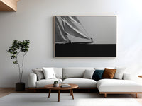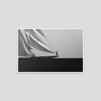 Black and white photograph captured during a classic sailing regatta off the coast of Menorca. Elegant vintage yachts glide across a calm sea, their tall sails catching the light against a softly clouded sky. The composition is minimal and balanced, with a strong horizon dividing the dark sea and the luminous sails. The absence of color enhances the timeless atmosphere, evoking grace, tradition, and the quiet power of wind and craftsmanship.