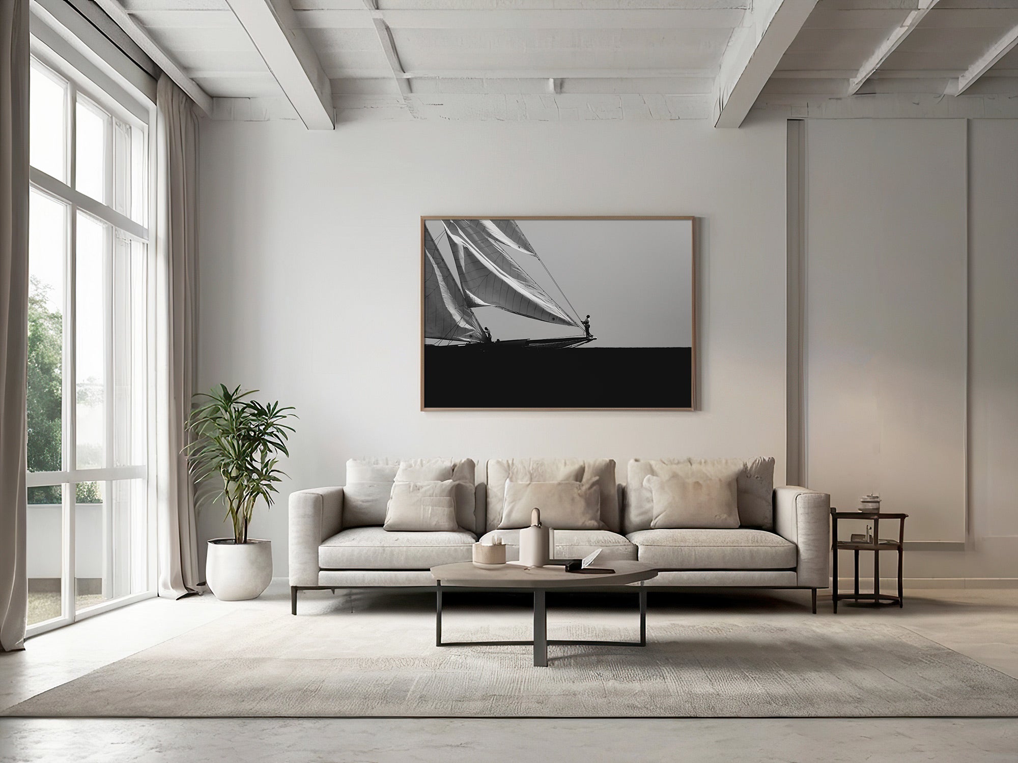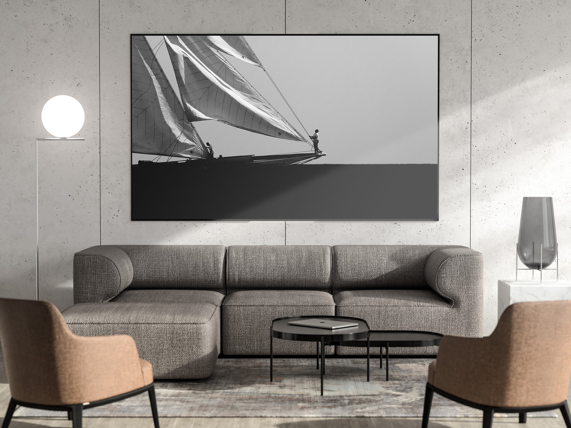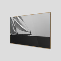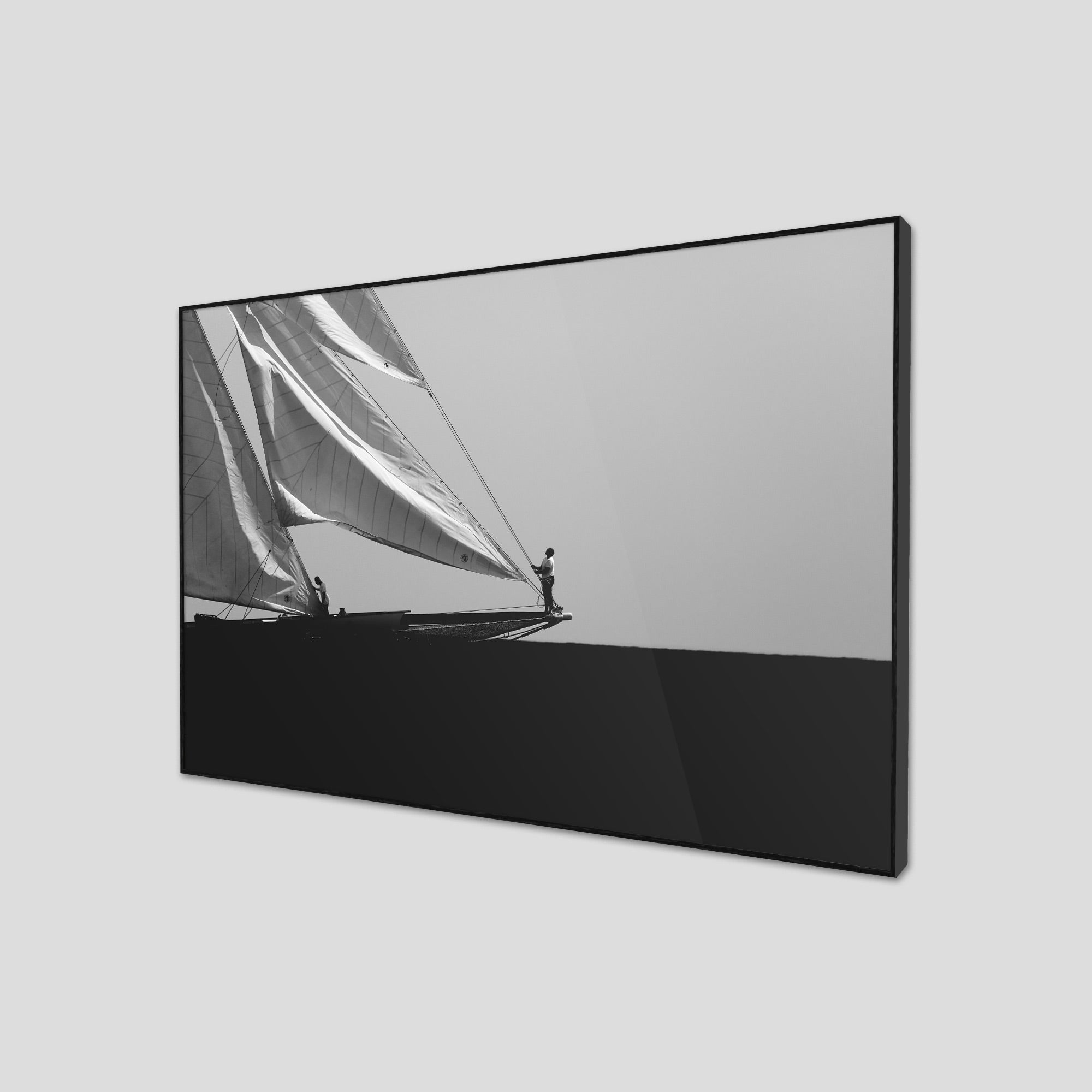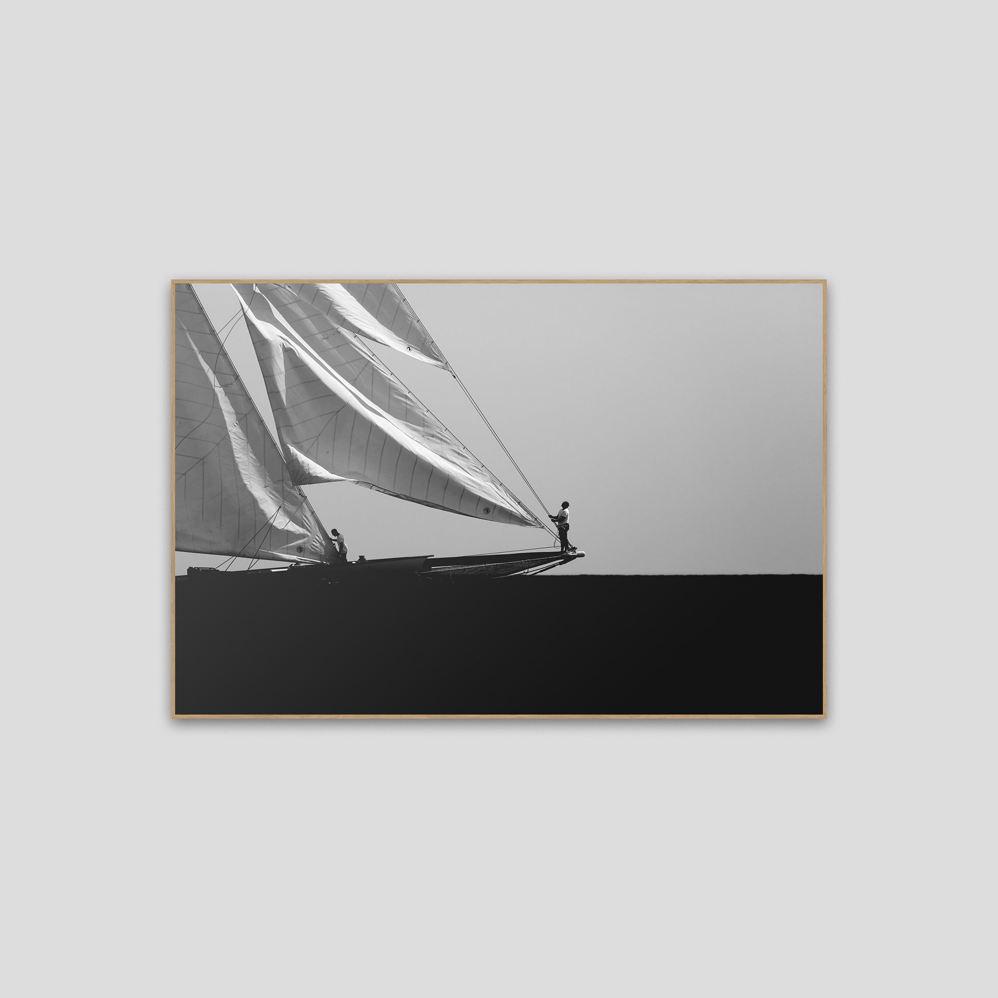 Black and white photograph captured during a classic sailing regatta off the coast of Menorca. Elegant vintage yachts glide across a calm sea, their tall sails catching the light against a softly clouded sky. The composition is minimal and balanced, with a strong horizon dividing the dark sea and the luminous sails. The absence of color enhances the timeless atmosphere, evoking grace, tradition, and the quiet power of wind and craftsmanship.