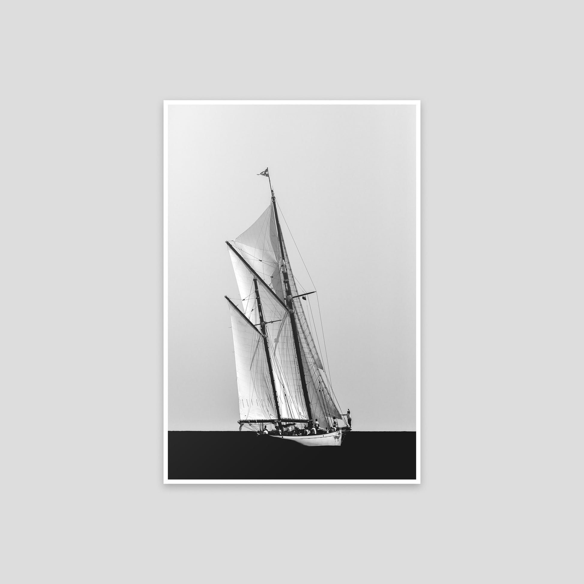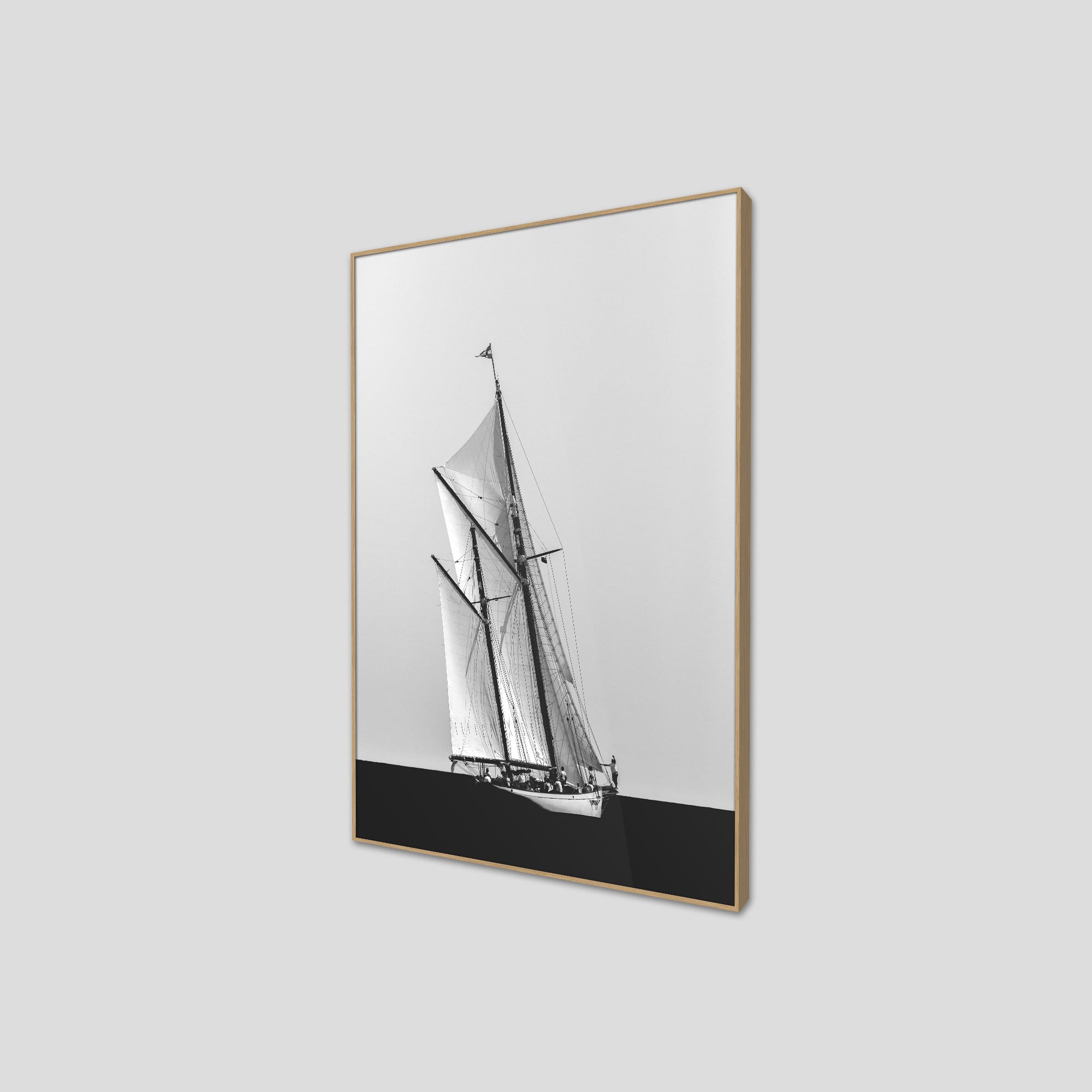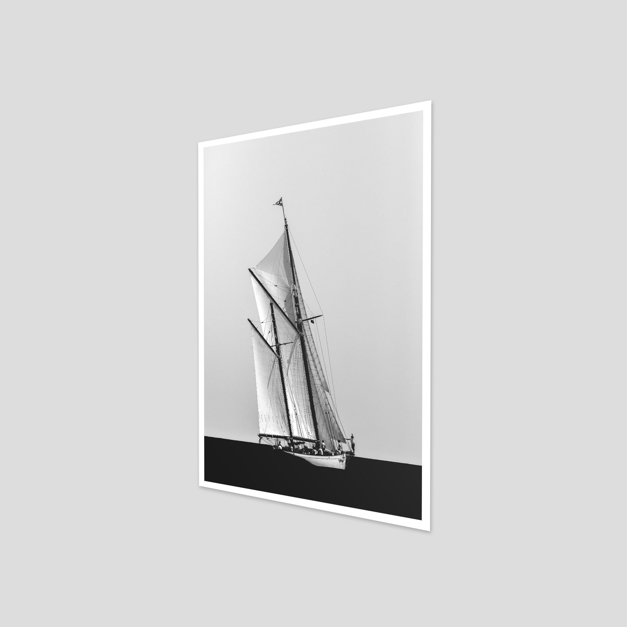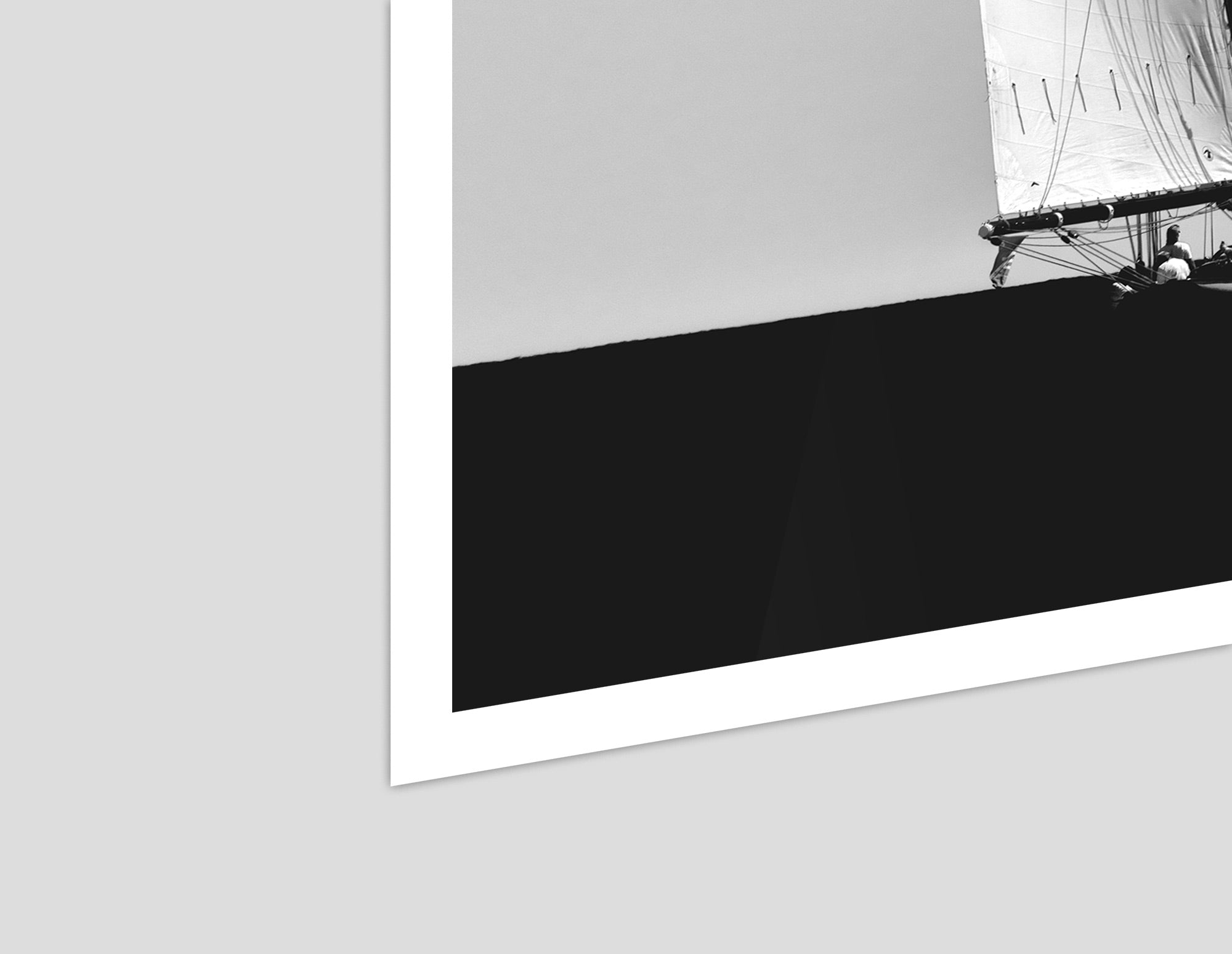 Black and white photograph captured during a classic sailing regatta off the coast of Menorca. Elegant vintage yachts glide across a calm sea, their tall sails catching the light against a softly clouded sky. The composition is minimal and balanced, with a strong horizon dividing the dark sea and the luminous sails. The absence of color enhances the timeless atmosphere, evoking grace, tradition, and the quiet power of wind and craftsmanship.