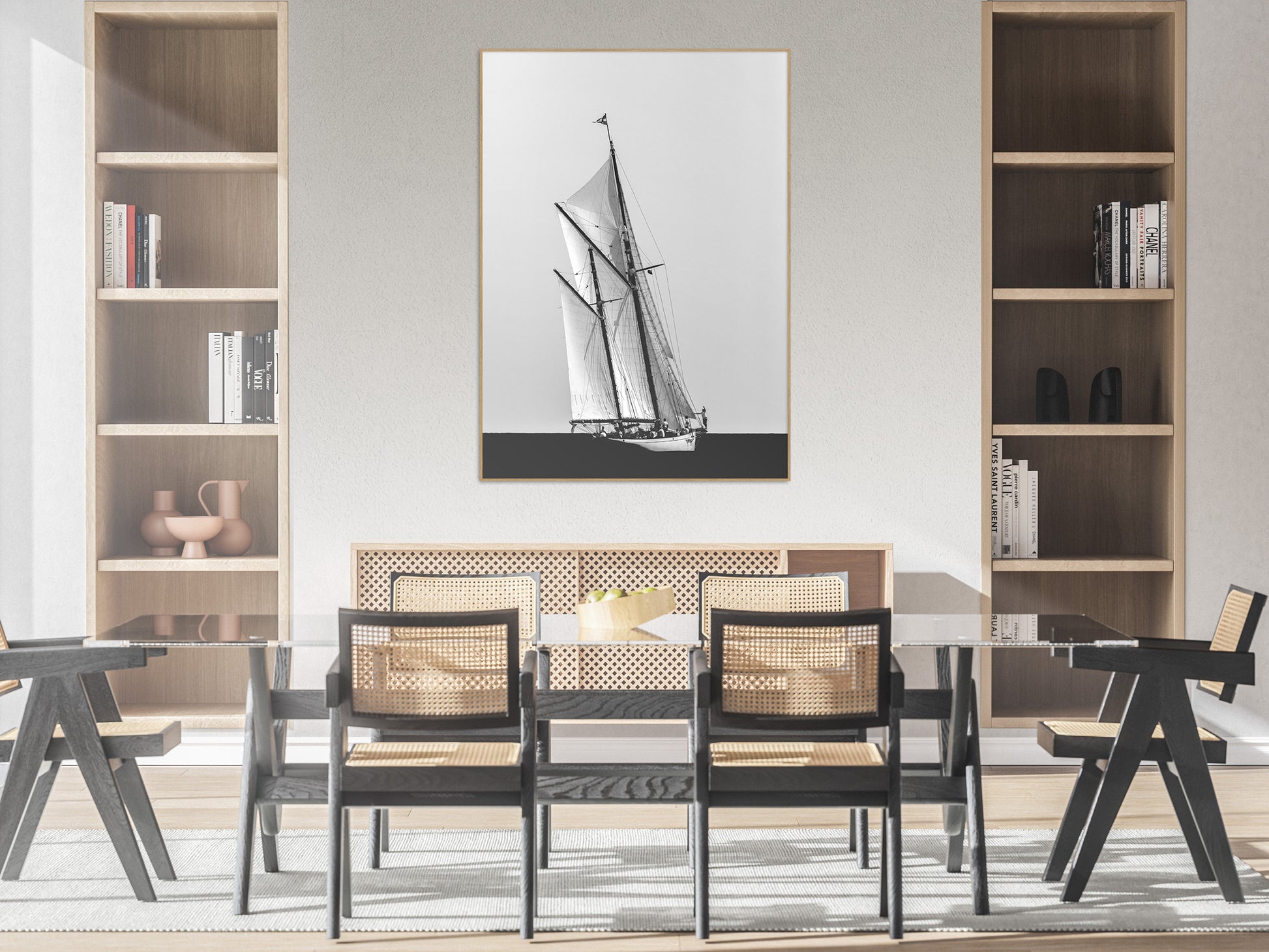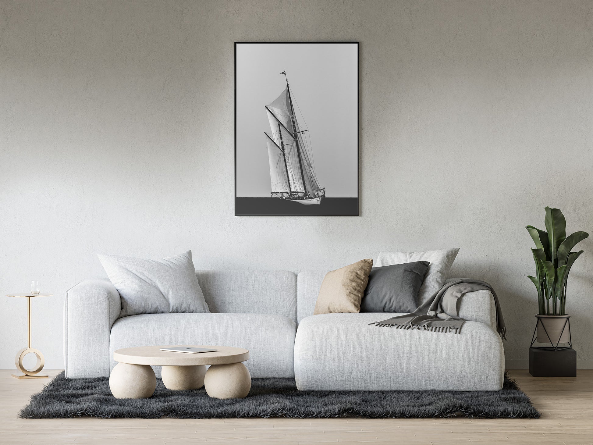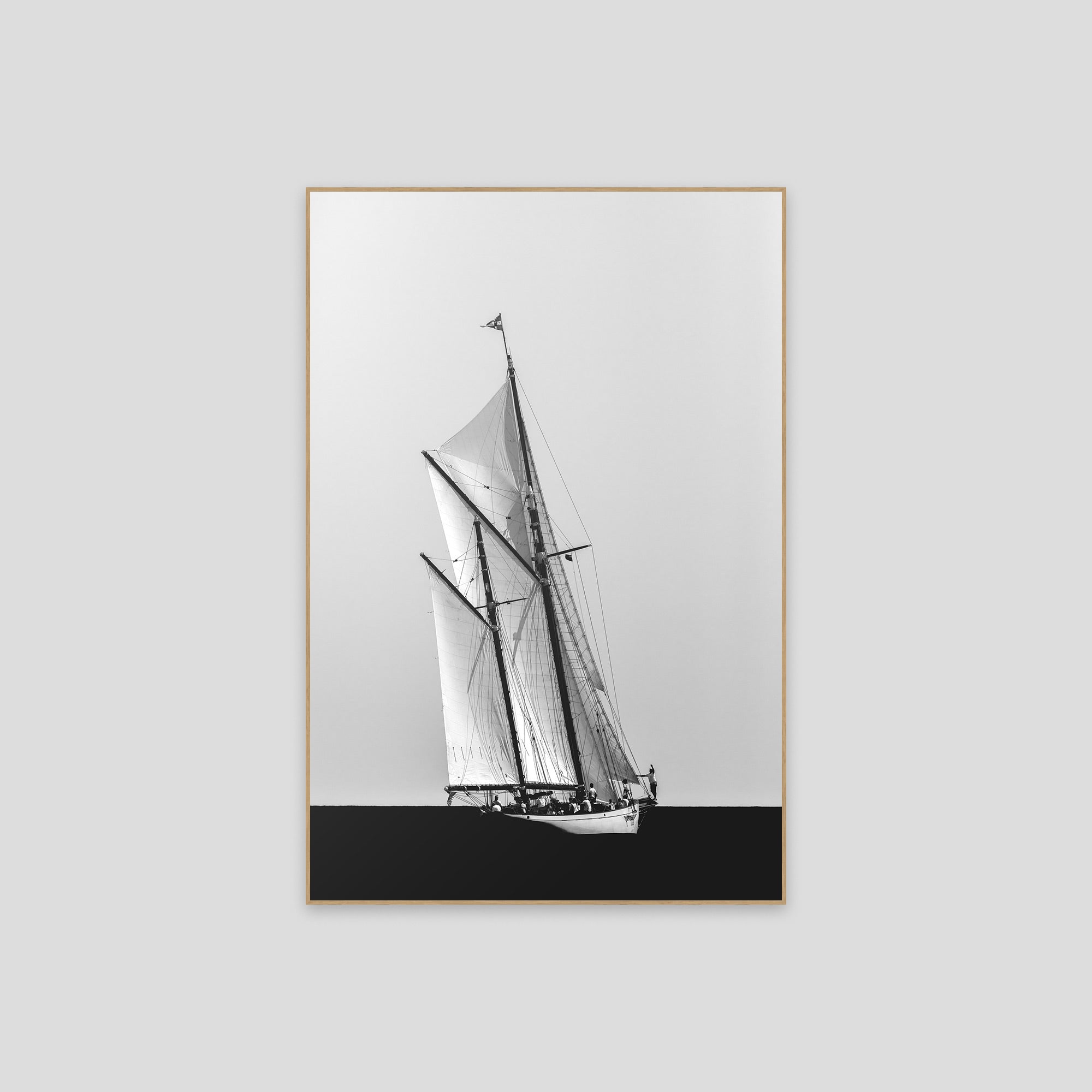 Black and white photograph captured during a classic sailing regatta off the coast of Menorca. Elegant vintage yachts glide across a calm sea, their tall sails catching the light against a softly clouded sky. The composition is minimal and balanced, with a strong horizon dividing the dark sea and the luminous sails. The absence of color enhances the timeless atmosphere, evoking grace, tradition, and the quiet power of wind and craftsmanship.