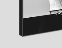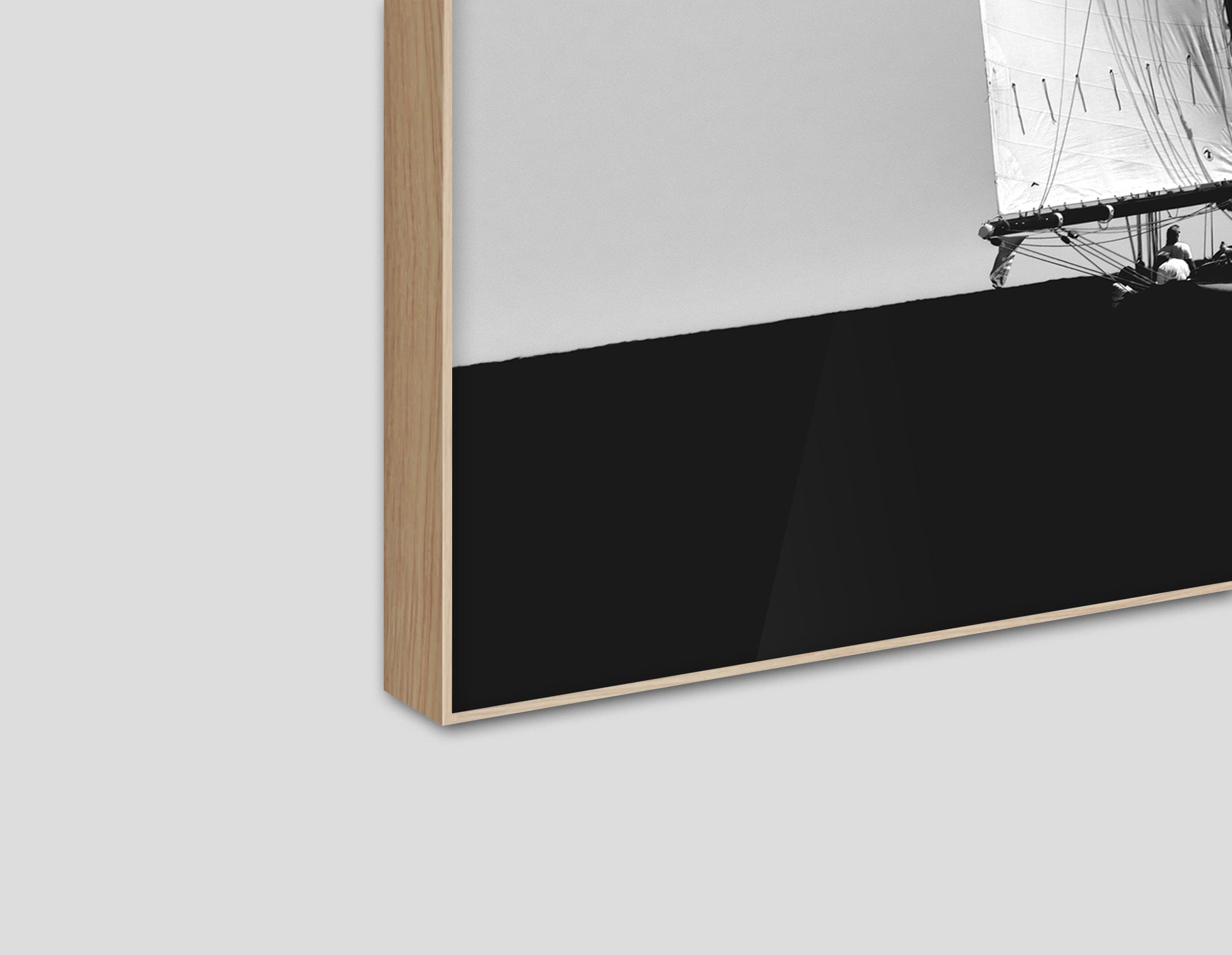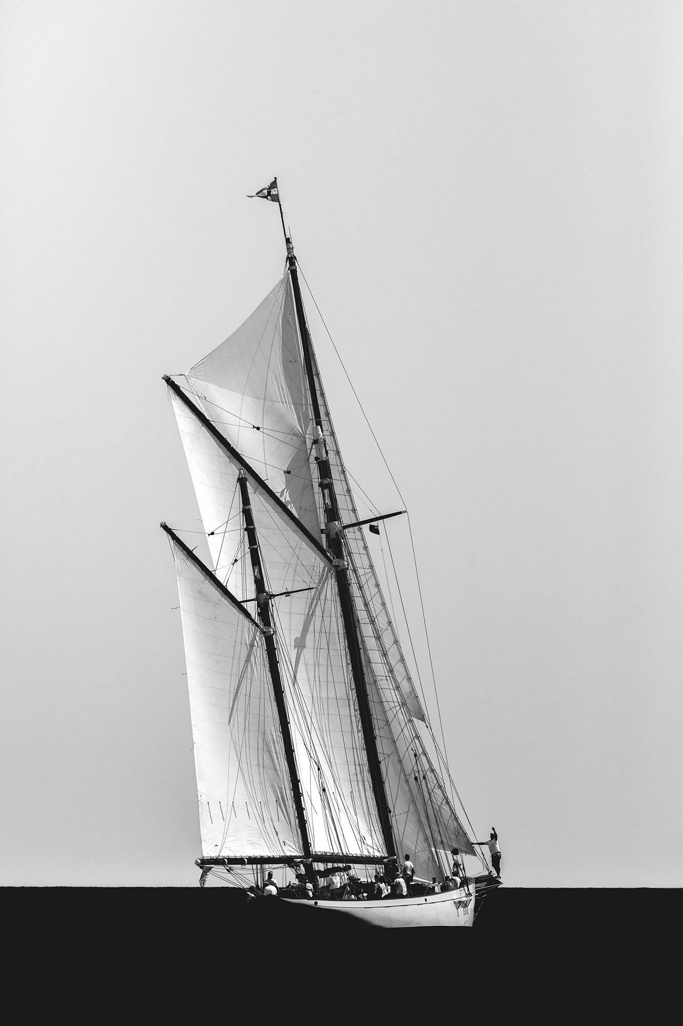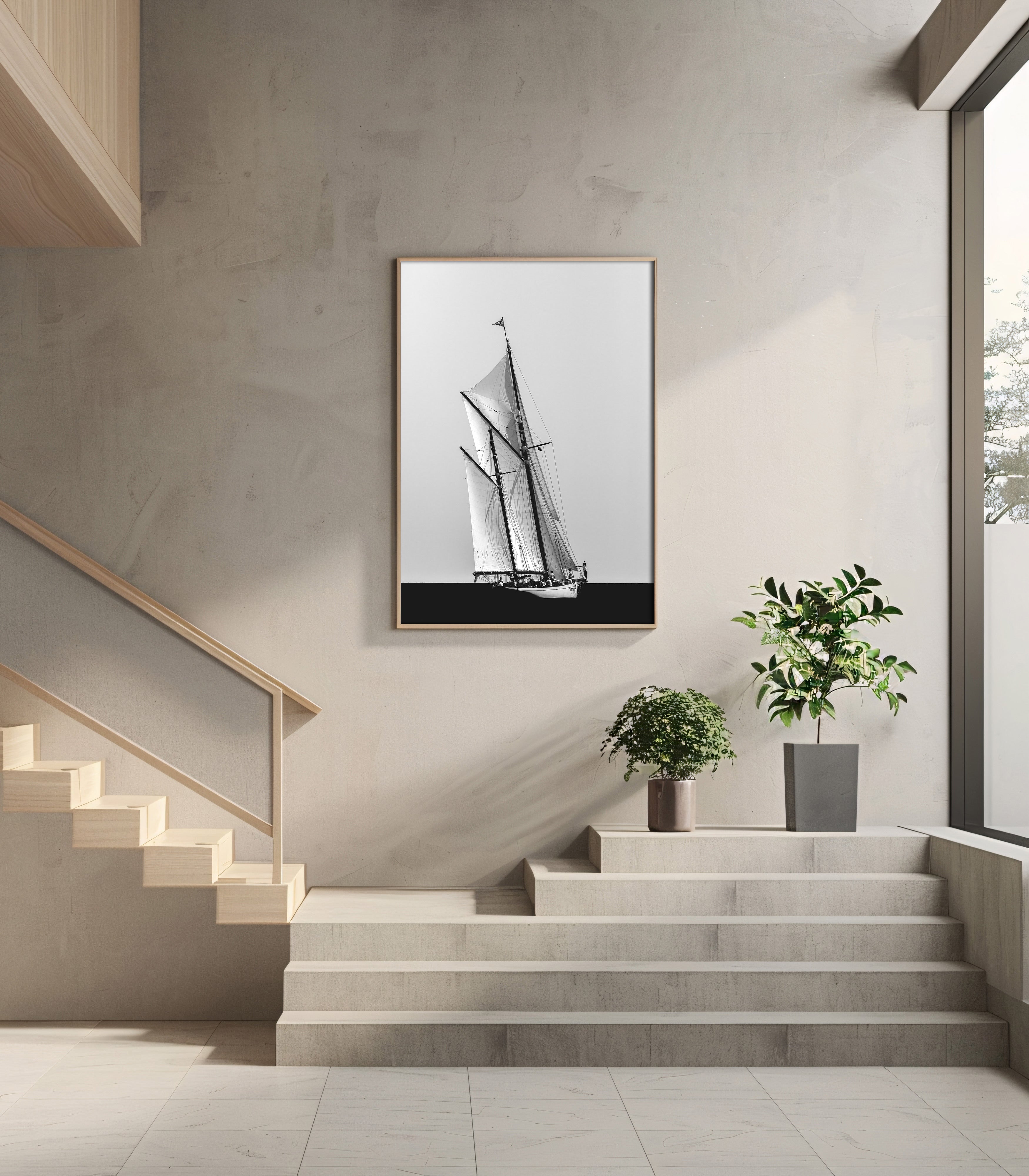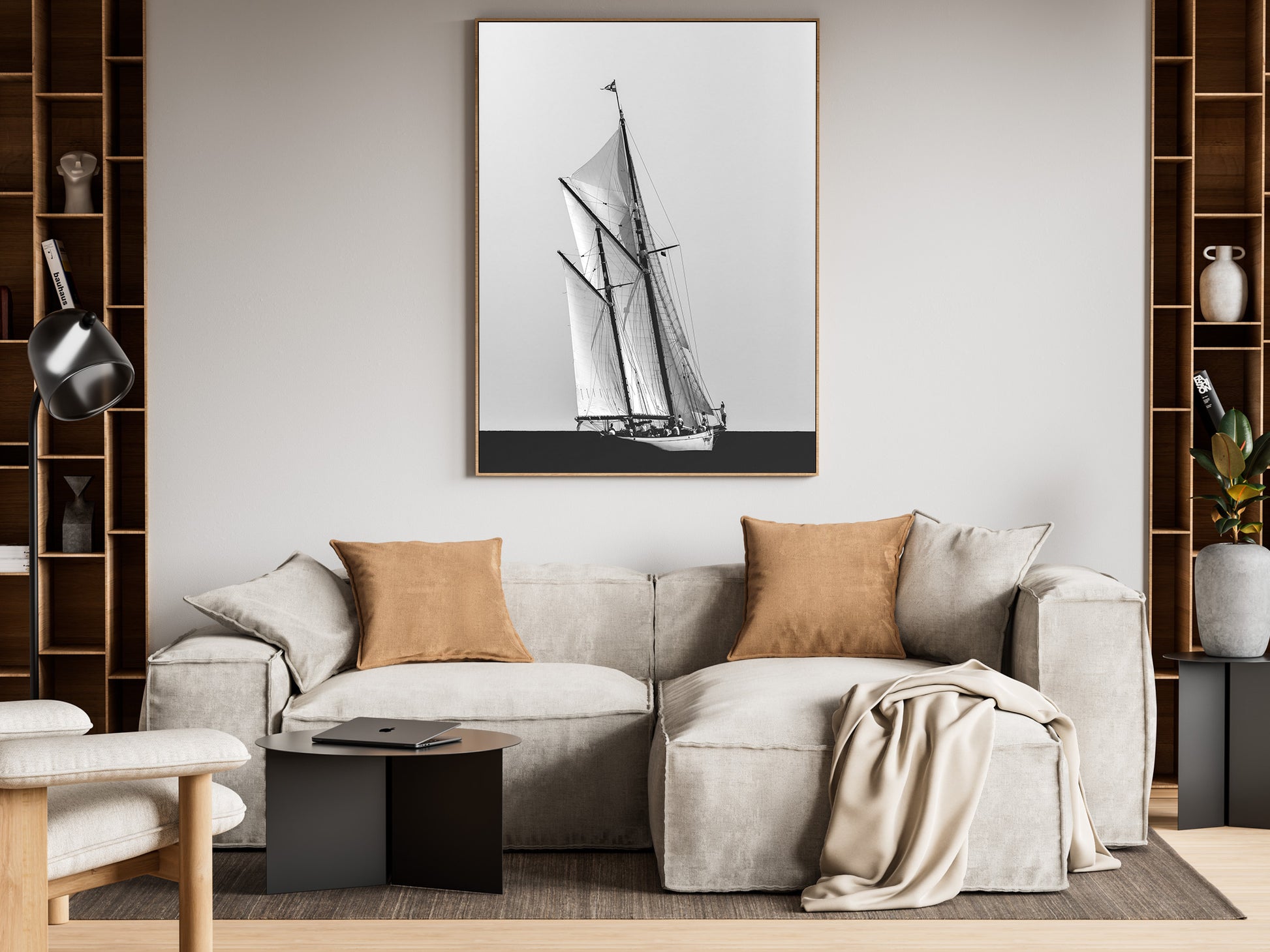 Black and white photograph captured during a classic sailing regatta off the coast of Menorca. Elegant vintage yachts glide across a calm sea, their tall sails catching the light against a softly clouded sky. The composition is minimal and balanced, with a strong horizon dividing the dark sea and the luminous sails. The absence of color enhances the timeless atmosphere, evoking grace, tradition, and the quiet power of wind and craftsmanship.