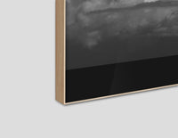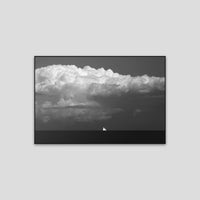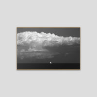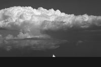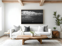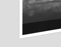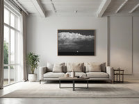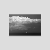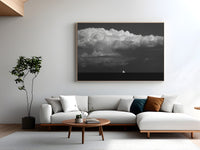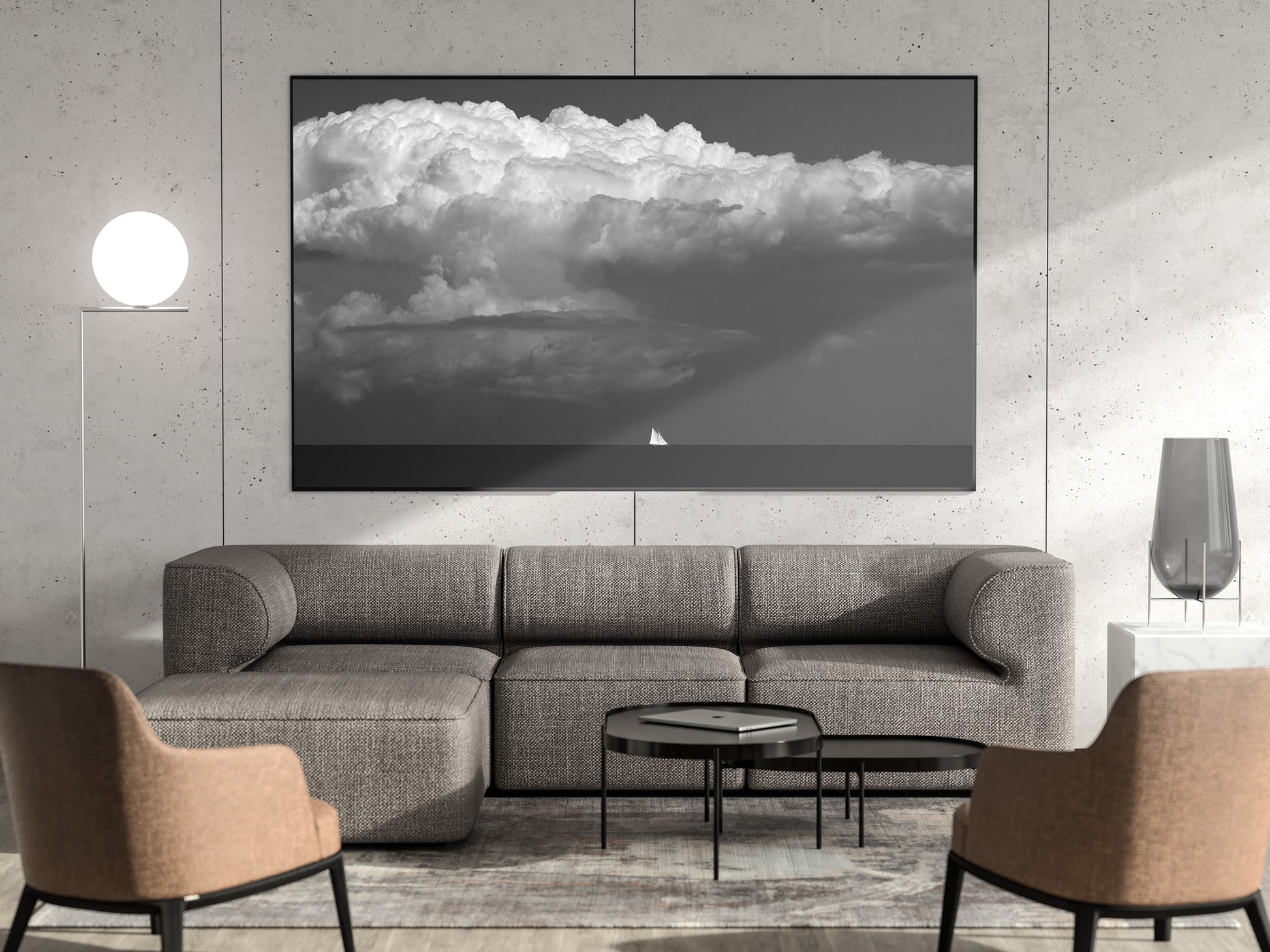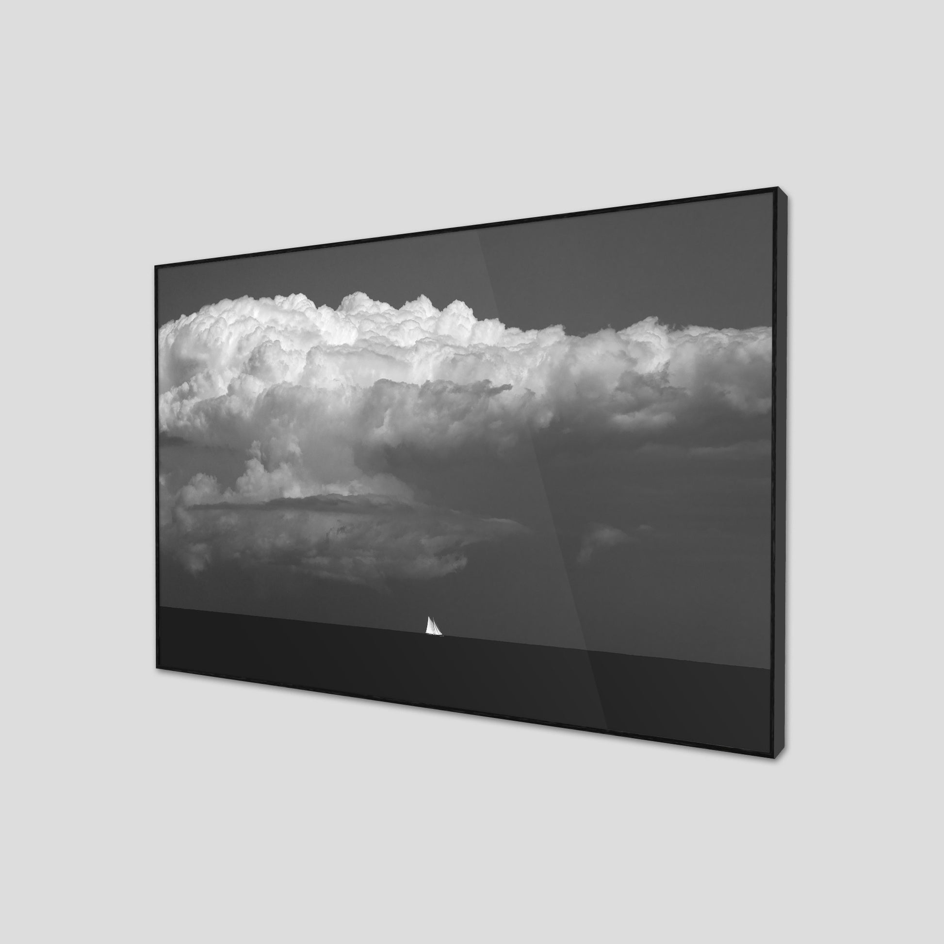 Black and white photograph captured during a classic sailing regatta off the coast of Menorca. Elegant vintage yachts glide across a calm sea, their tall sails catching the light against a softly clouded sky. The composition is minimal and balanced, with a strong horizon dividing the dark sea and the luminous sails. The absence of color enhances the timeless atmosphere, evoking grace, tradition, and the quiet power of wind and craftsmanship.