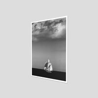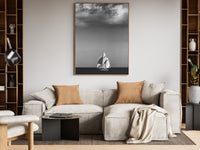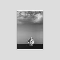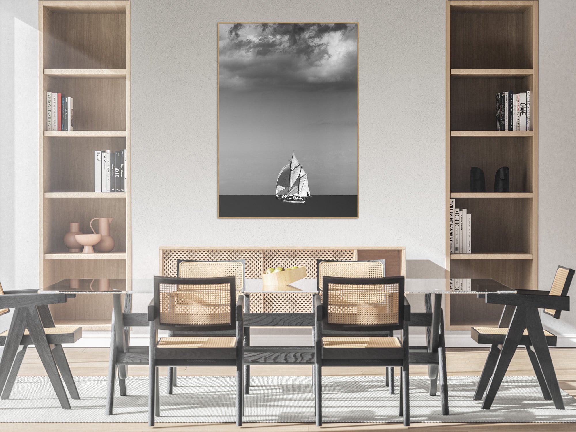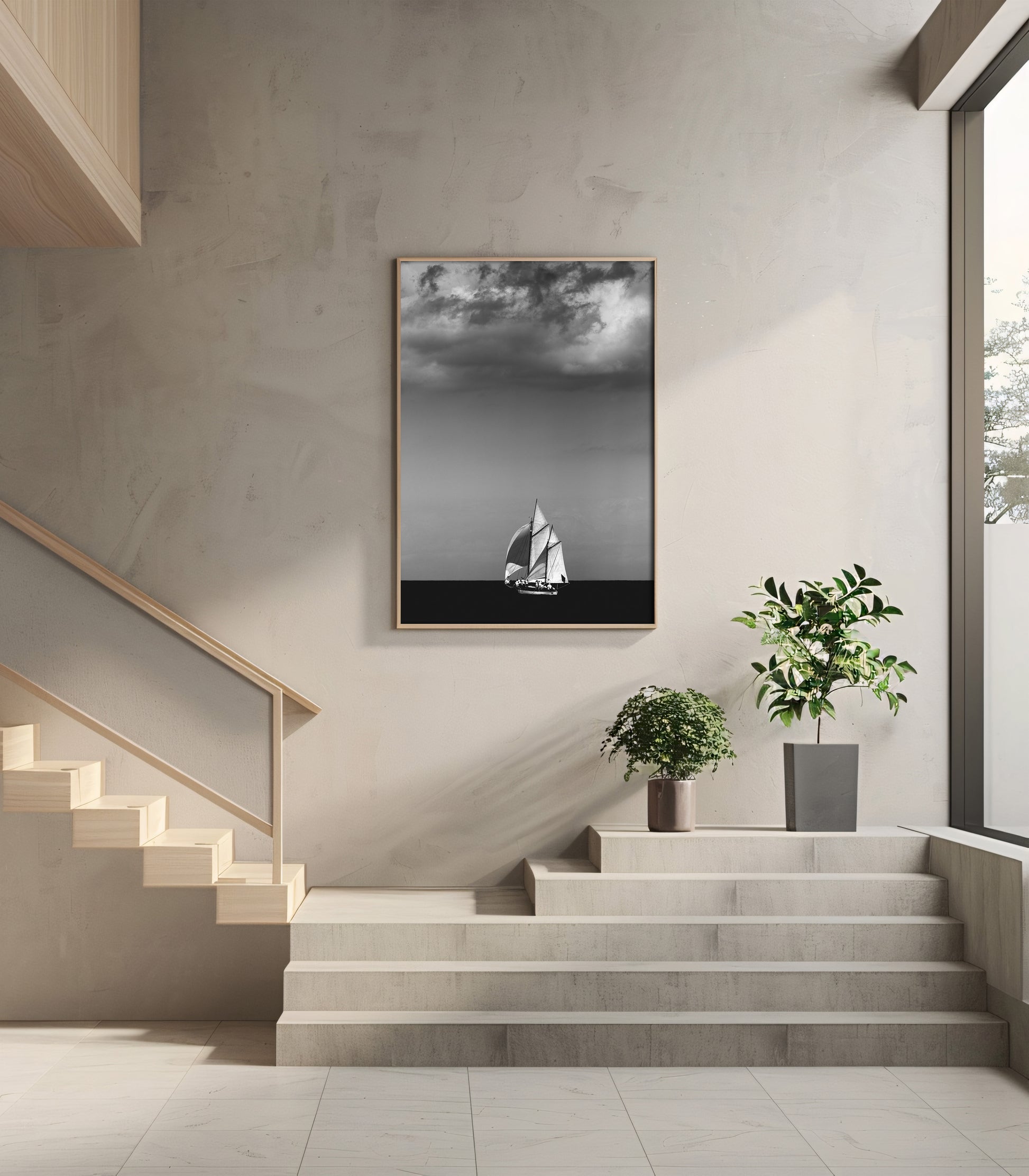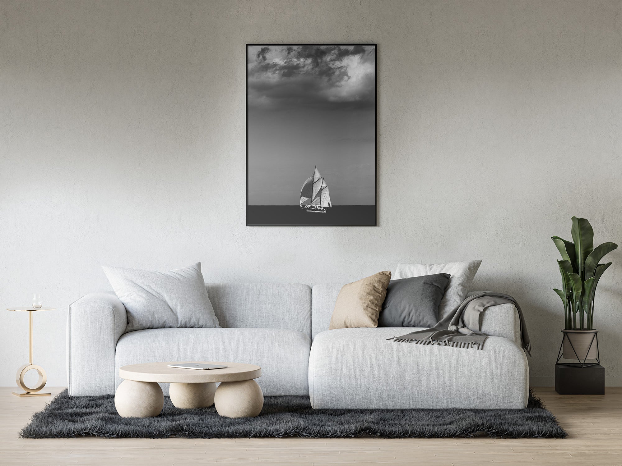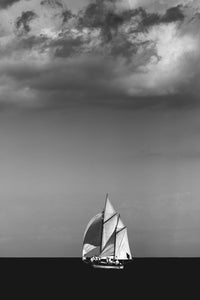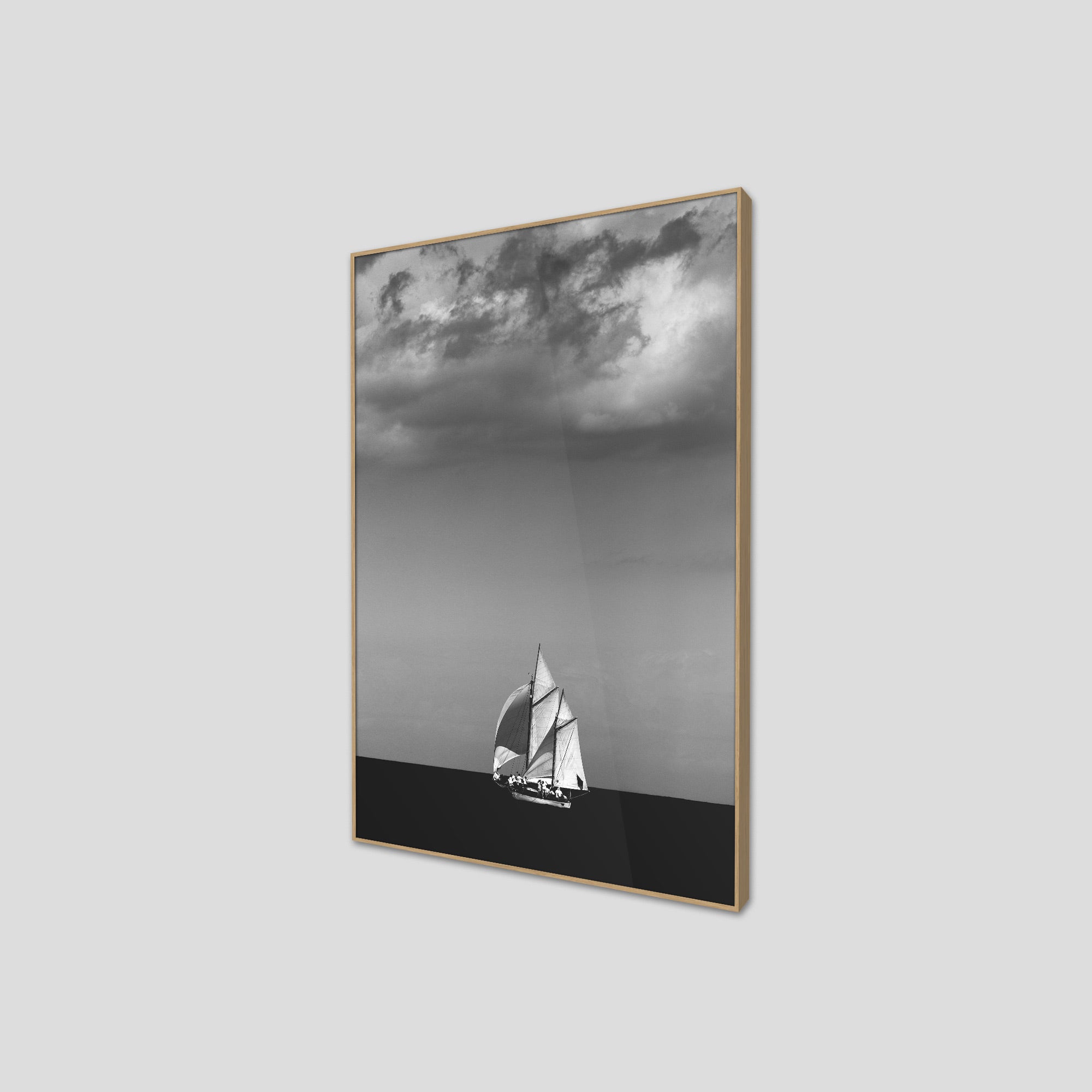 Black and white photograph captured during a classic sailing regatta off the coast of Menorca. Elegant vintage yachts glide across a calm sea, their tall sails catching the light against a softly clouded sky. The composition is minimal and balanced, with a strong horizon dividing the dark sea and the luminous sails. The absence of color enhances the timeless atmosphere, evoking grace, tradition, and the quiet power of wind and craftsmanship.