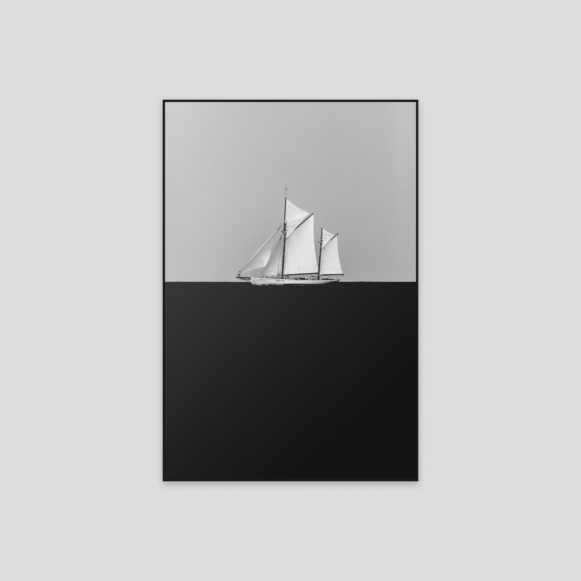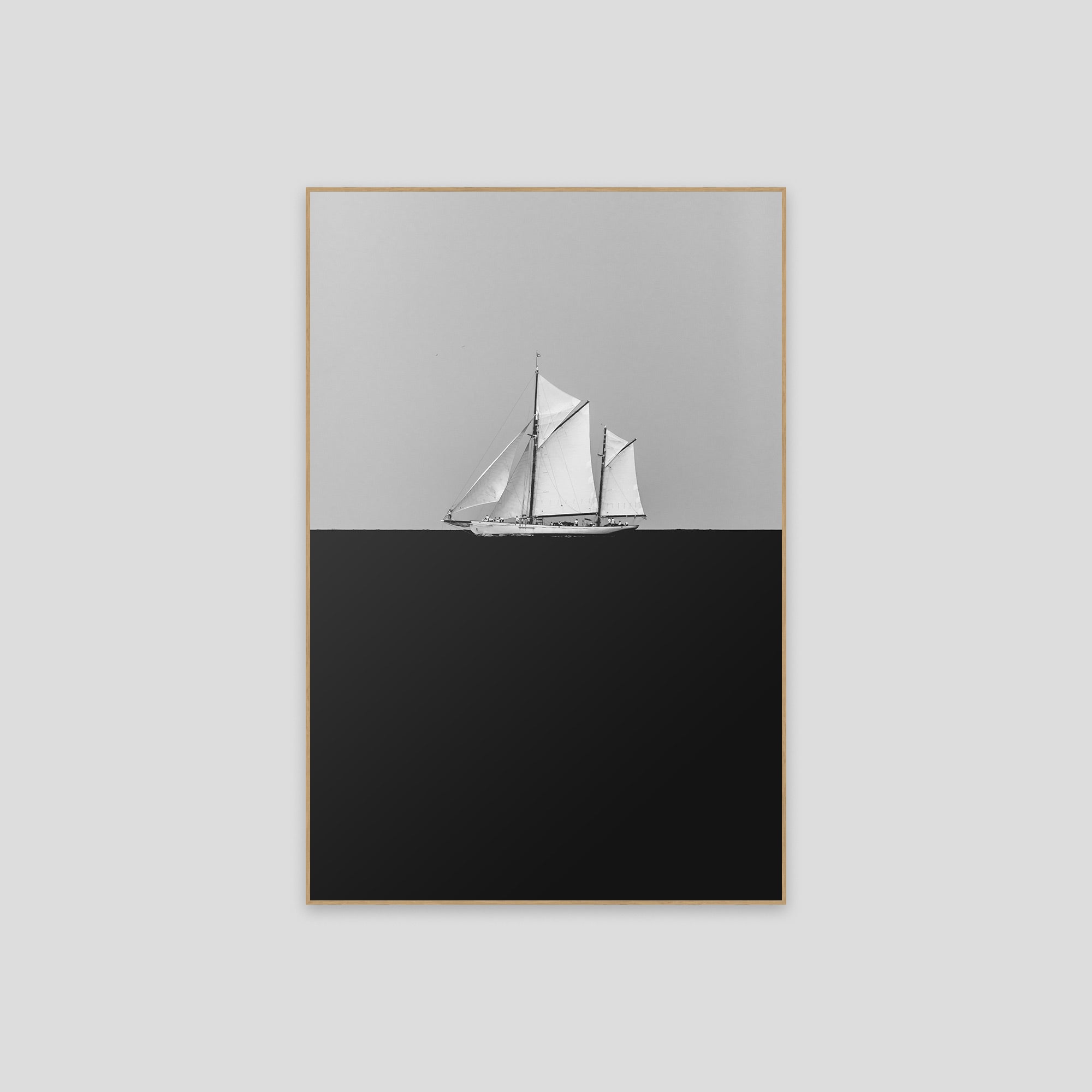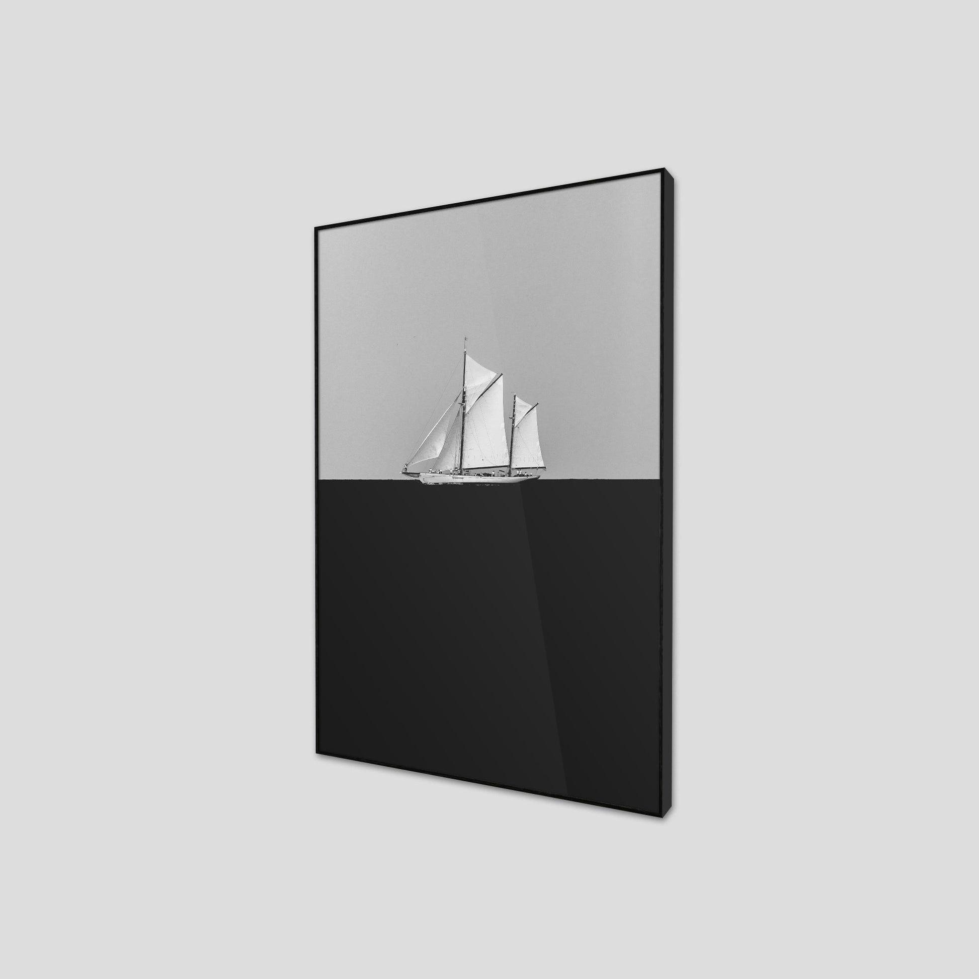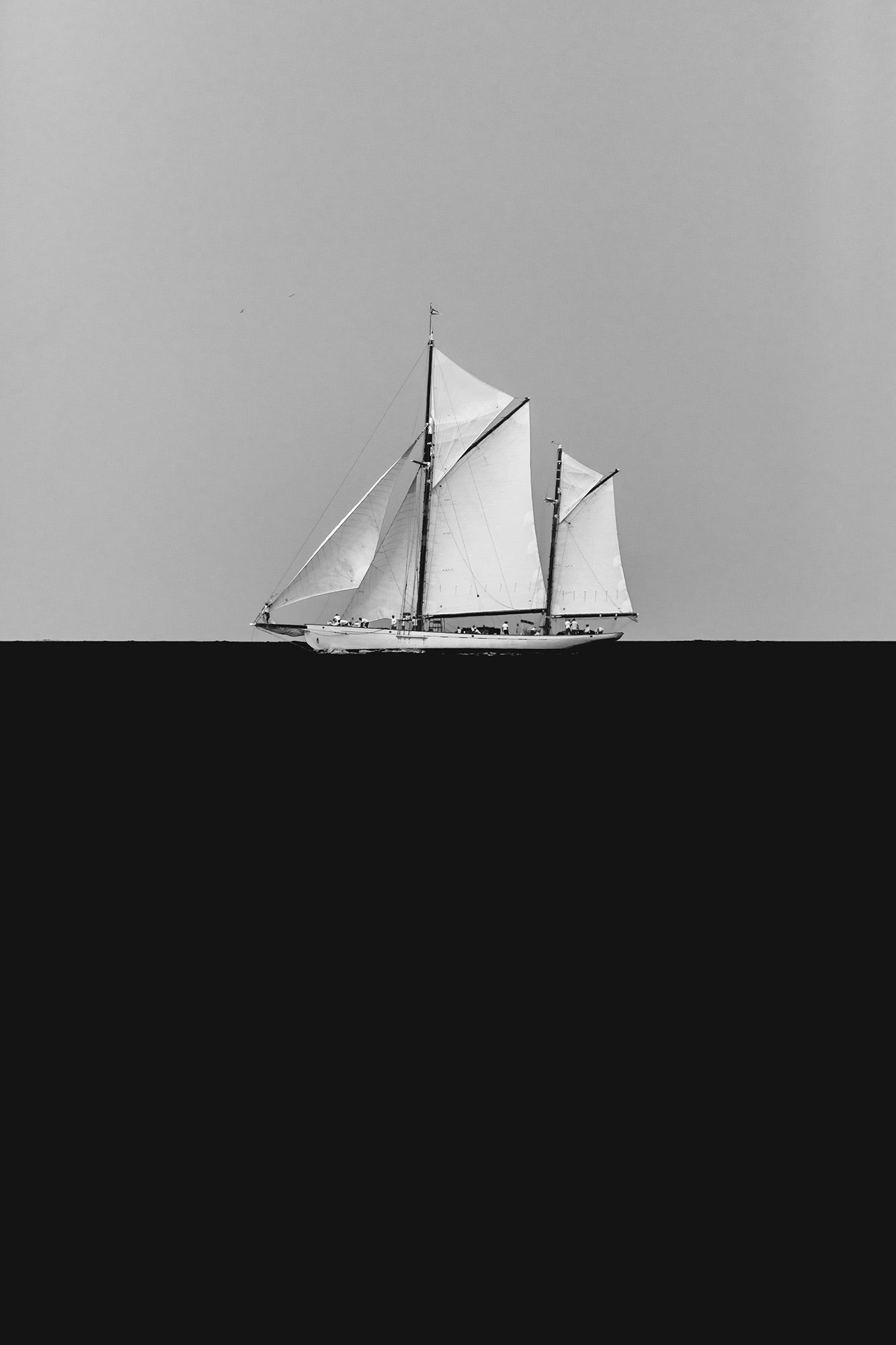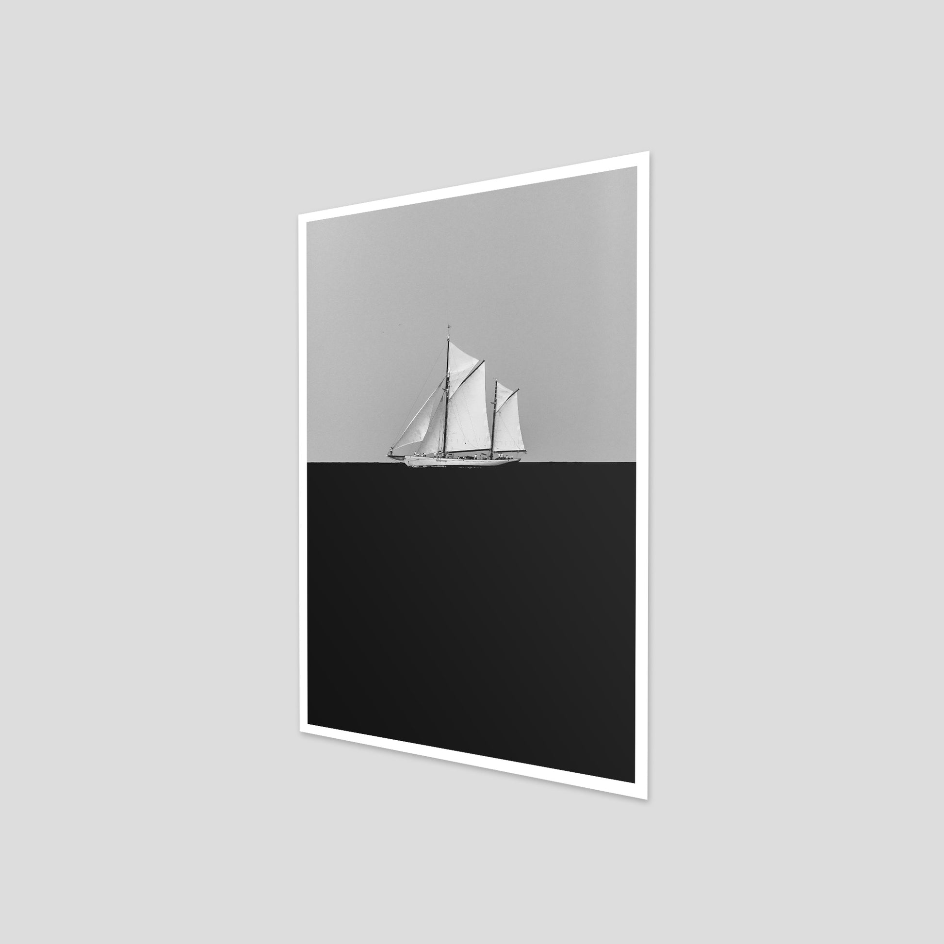 Black and white photograph captured during a classic sailing regatta off the coast of Menorca. Elegant vintage yachts glide across a calm sea, their tall sails catching the light against a softly clouded sky. The composition is minimal and balanced, with a strong horizon dividing the dark sea and the luminous sails. The absence of color enhances the timeless atmosphere, evoking grace, tradition, and the quiet power of wind and craftsmanship.