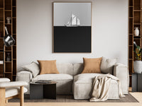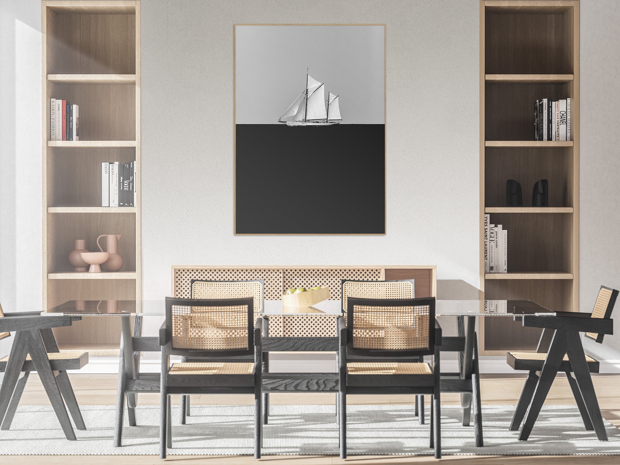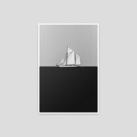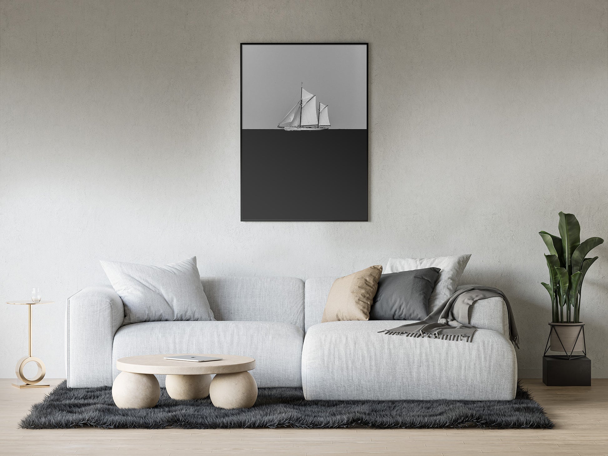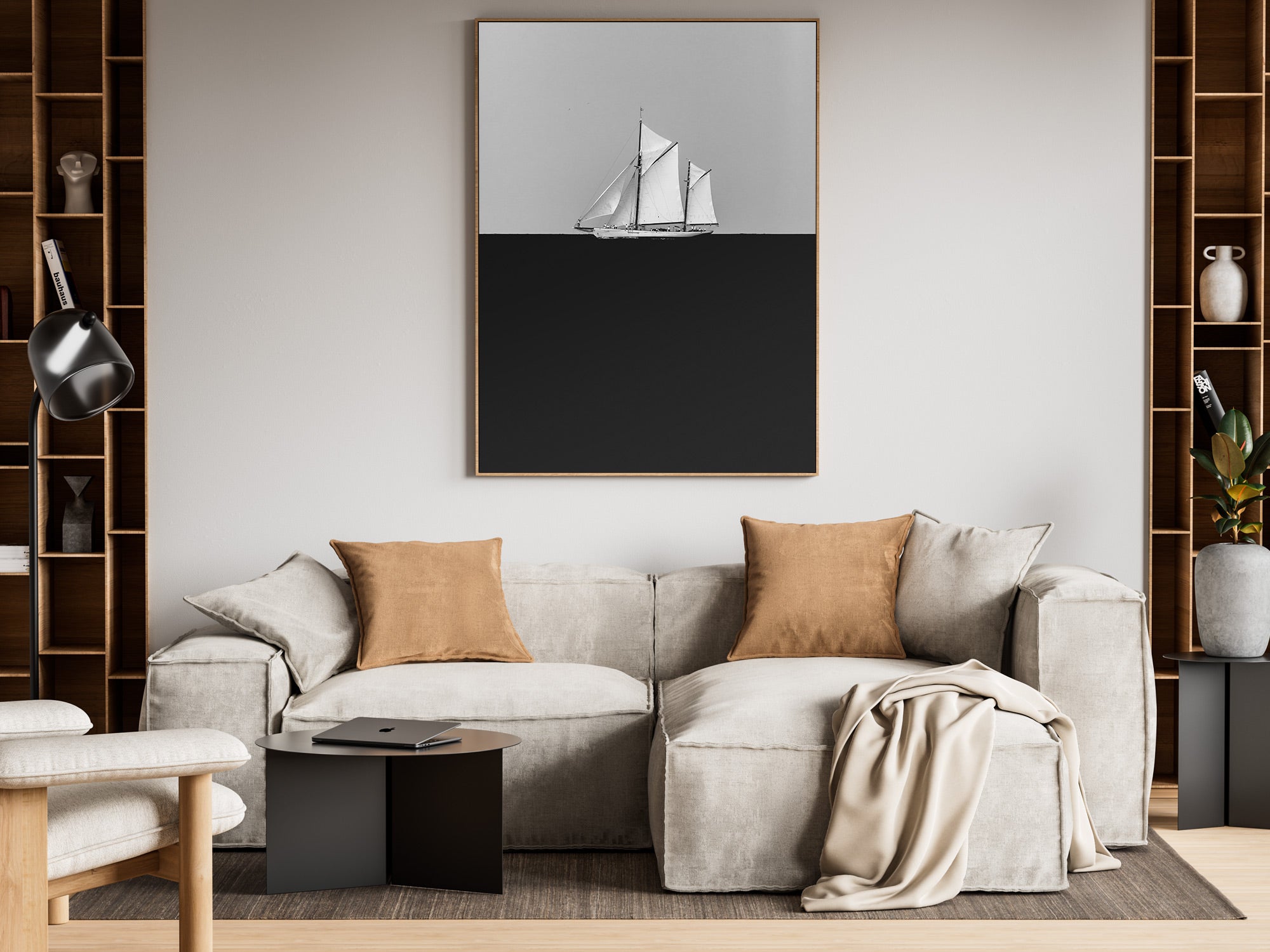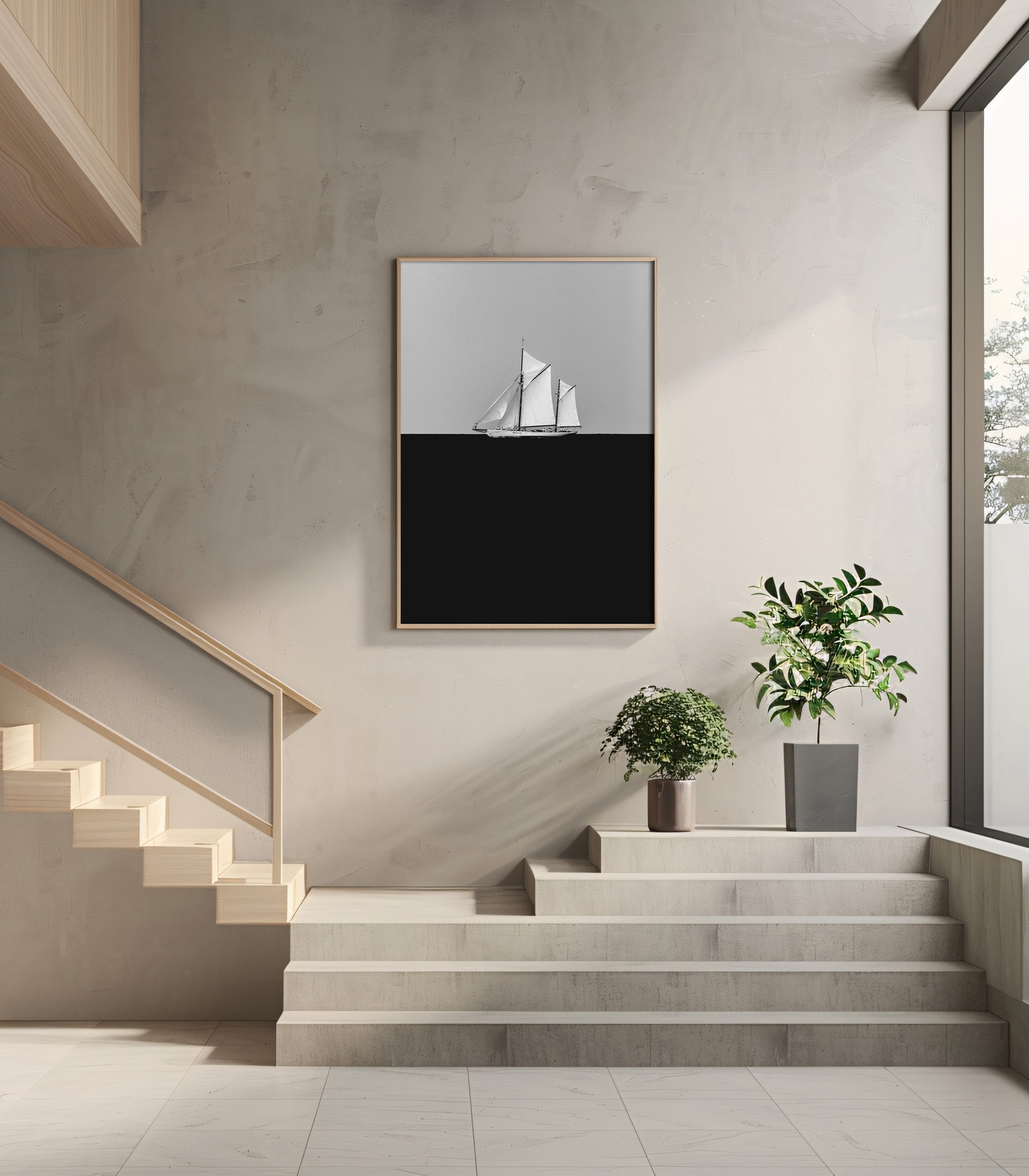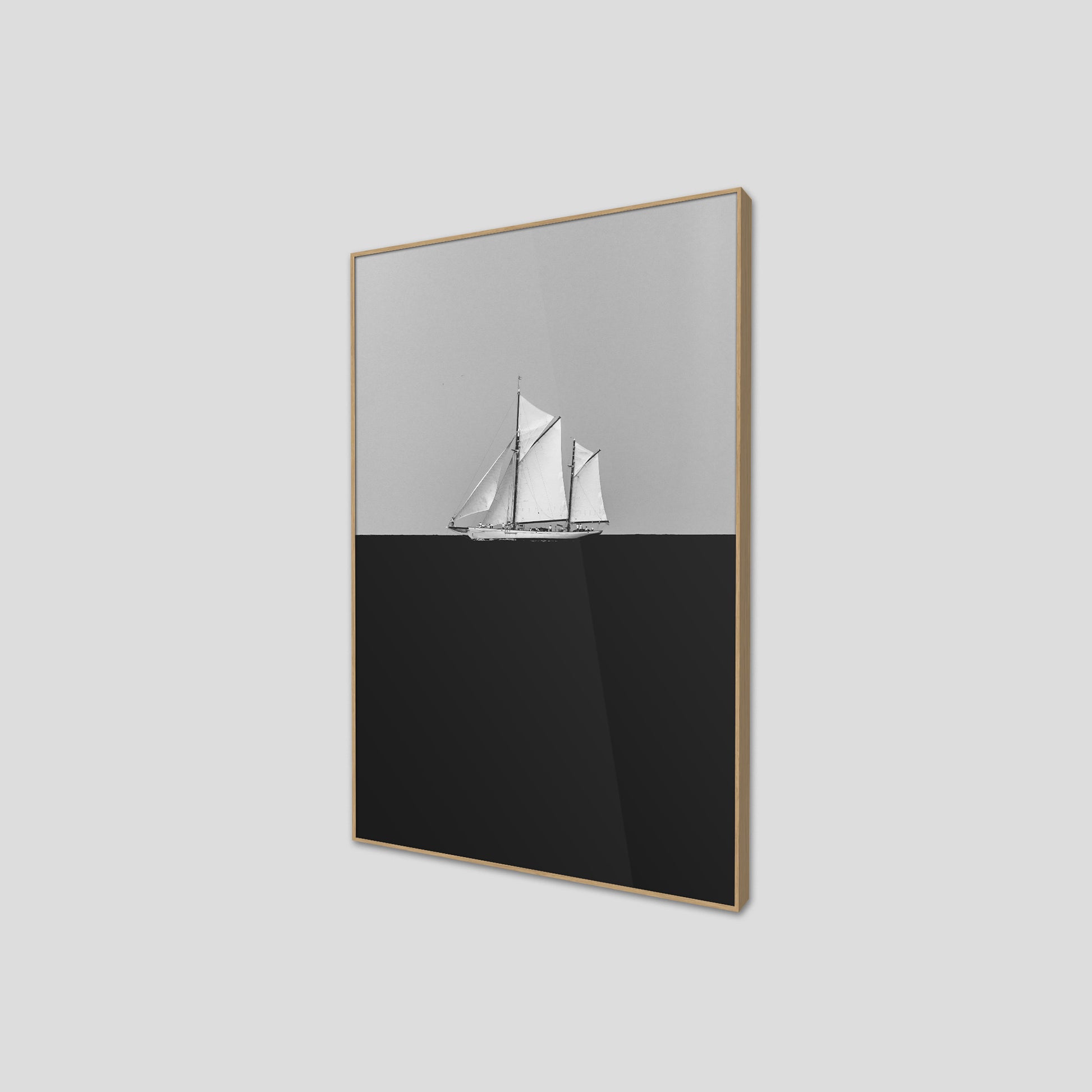 Black and white photograph captured during a classic sailing regatta off the coast of Menorca. Elegant vintage yachts glide across a calm sea, their tall sails catching the light against a softly clouded sky. The composition is minimal and balanced, with a strong horizon dividing the dark sea and the luminous sails. The absence of color enhances the timeless atmosphere, evoking grace, tradition, and the quiet power of wind and craftsmanship.